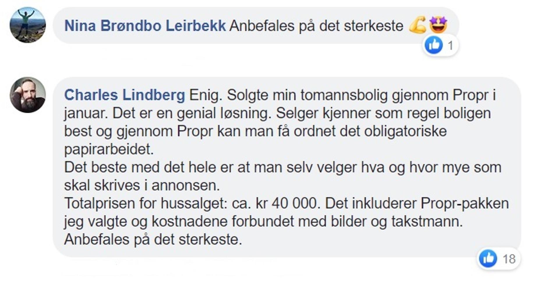 Selger du via Propr, vet både du og kjøper at salget gjennomføres på en skikkelig måte. Ved hjelp av Proprs verktøy lager du enkelt en boligannonse som inneholder det du mener er viktig å få fram om boligen din. Verktøyet hjelper deg også med å få med alt av relevant og lovpålagt informasjon som skal være med i et salgsprospekt, og lager også et digitalt salgsprospekt for deg. Propr ordner med takstmann, boligfotograf, nødvendige dokumenter og oppgjør.