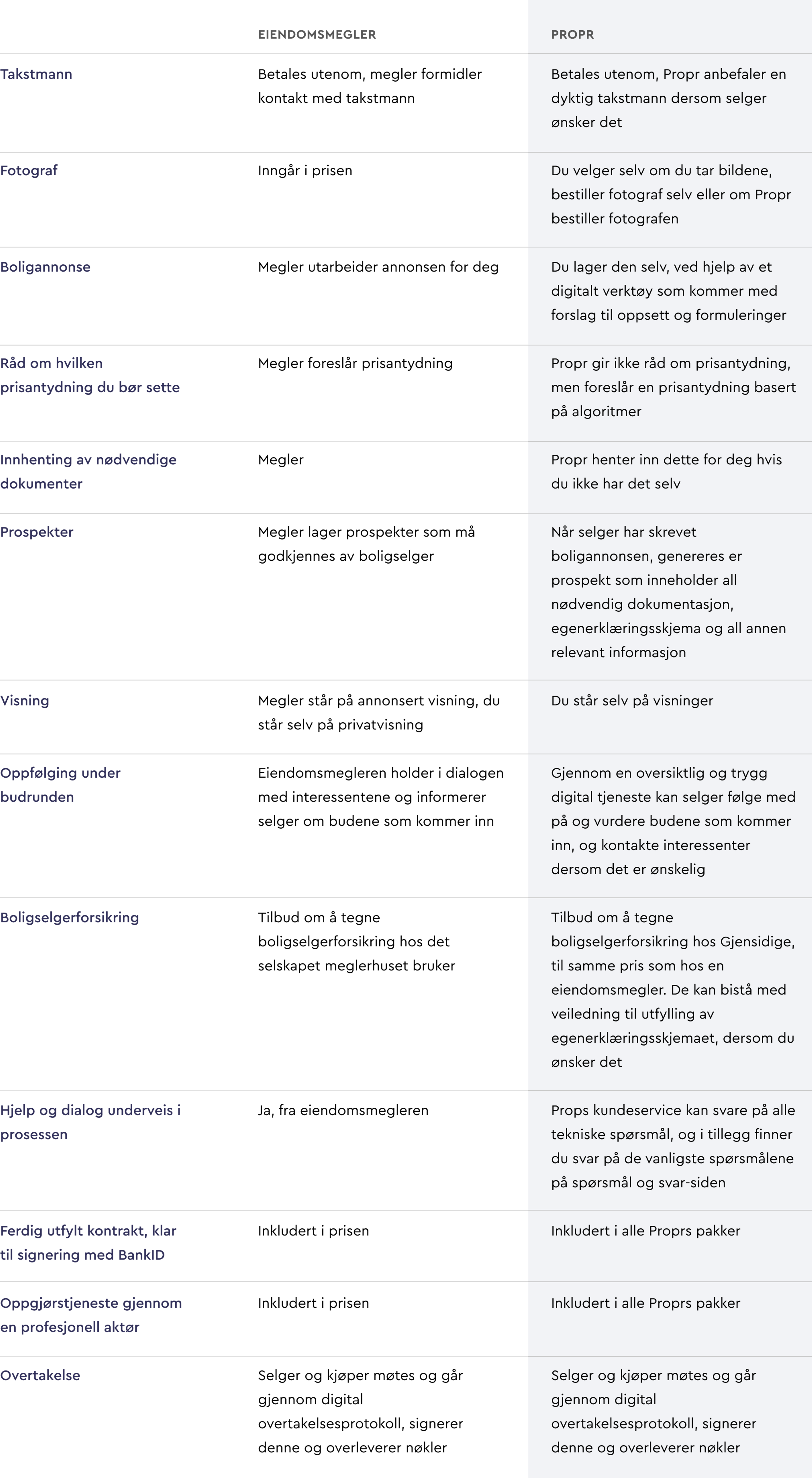 I denne tabellen har vi satt opp en oversikt over hvordan de ulike delene av boligsalget foregår, med både megler og Propr, slik at du kan sammenligne direkte. Under tabellen finner du litt mer informasjon om de ulike temaene. Sitter du igjen med ubesvarte spørsmål om tjenesten etter å ha lest gjennom, kan du sjekke Spørsmål og svar-siden vår, hvor de spørsmålene vi får oftest er besvart. Du er også velkommen til å ta kontakt med kundeservice, som er tilgjengelig både på chat, e-post og telefon.
