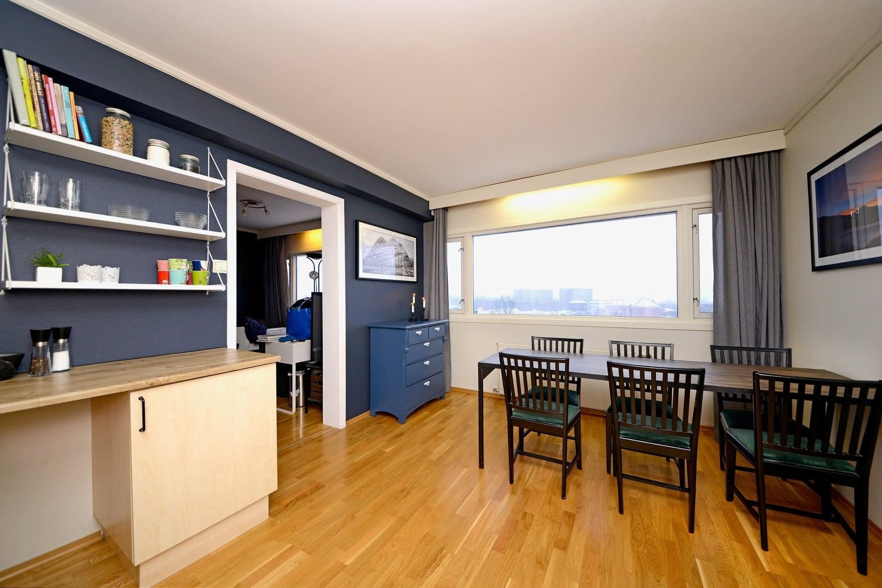 PÅMELDINGSVISNING Lys og praktisk leilighet med upåklagelig utsikt! Leiligheten ligger i 6. etasje, som er blokkas høyeste. Fellesutgiftene dekker fellesgjeld med renter og avdrag, samt det meste av faste utgifter ved bolig; strøm, internett, kabel-tv, varme, kommunale avgifter, parkering, renhold og løpende vedlikehold! Leiligheten disponerer bod i kjelleren med hyllesystem. Blokka har heis fra kjeller til 6.etasje, fellesarealer i form av balkong i hver etasje, badstue i kjeller, felles vaskeri, sittegruppe ved heis, parkering. GANG Boligen består av gang med 3 doble høyskap. BAD Fra gangen er det inngang til bad (oppusset i 2017) med toalett, dusjkabinett med mekanisk avtrekk over og servant med over-/underskap. Badet har fliser på gulv og vegger, gulvvarme og plass til vaskemaskin om dette skulle være ønskelig. (Vannpåkobling bak dusjkabinett og servant) KJØKKEN Med store vindusflater og radiator. Lys og velholdt innredning med oppvaskkum, benke-oppvaskmaskin, mekanisk avtrekk, integrert stekeovn og keramisk koketopp. Kjøkkenbenk er foliert men benkeplaten under er fortsatt i god stand. God plass til spisestue. STUE Med samme vindusflater som kjøkken og radiator montert under. Her er det god plass til sovesofa, stubord, godstol, tv-benk etc. Herifra har du kjempefin utsikt utover Trondheim Øst og solnedgang året rundt! SOVEALKOVE Med "plassbygd" klessystem og praktisk bokhylle oppunder tak. Her er det plass til 180cm seng og nattbord. Mekanisk avtrekk i tak og ventilert inn til stue.