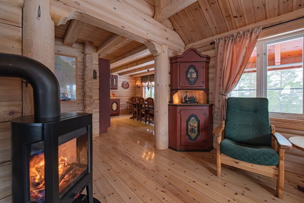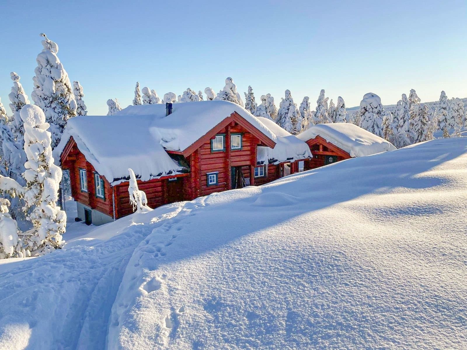 Storslått tømmerhytte selges. Frittliggende familiehytte med store terrasser rett ved ski/tur-løyper. Se video.