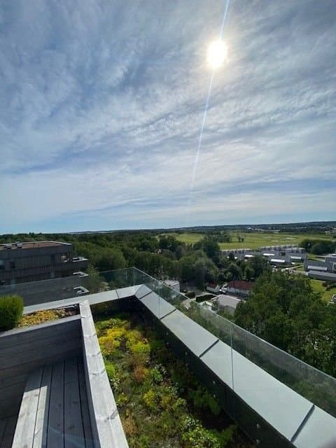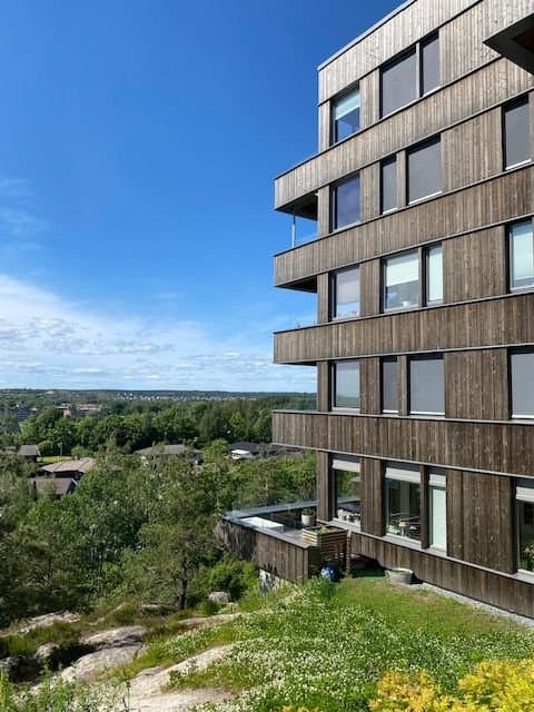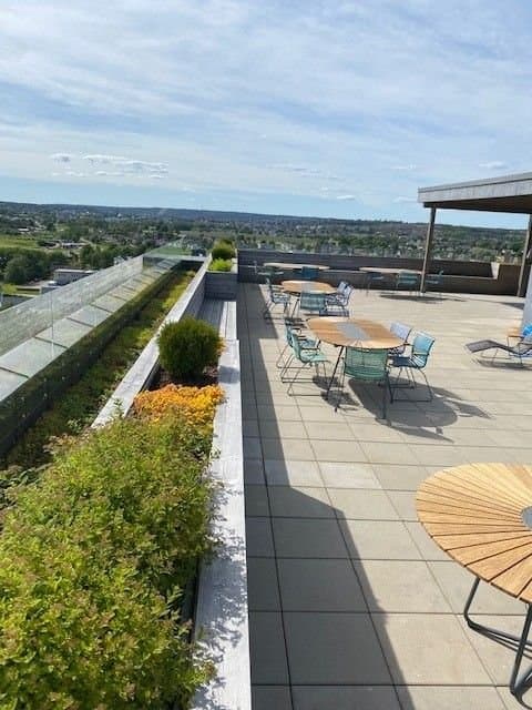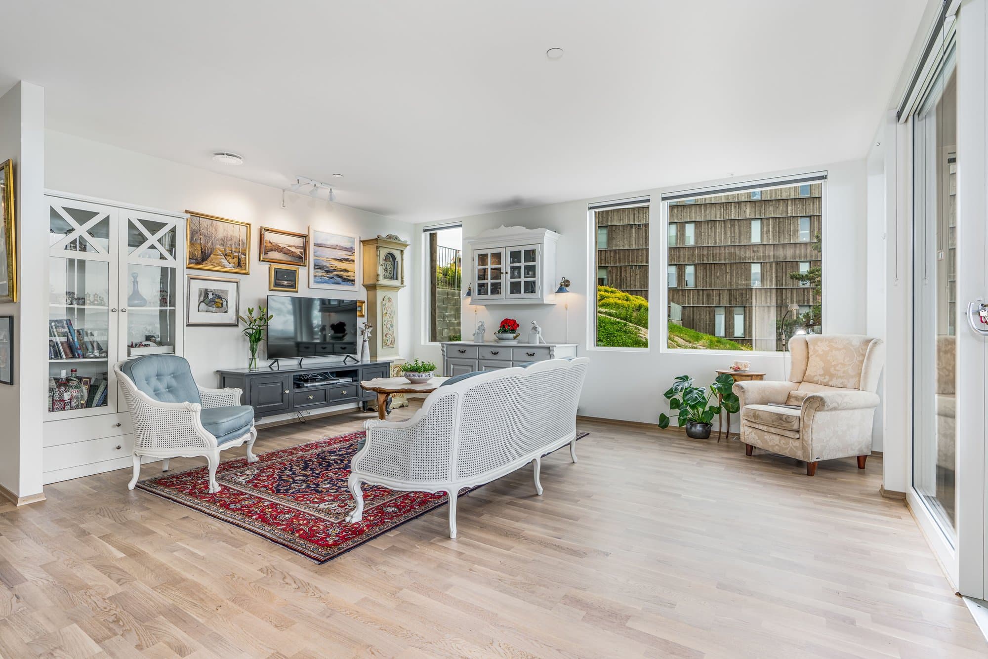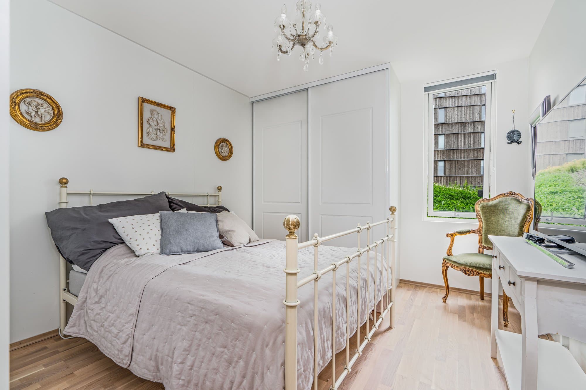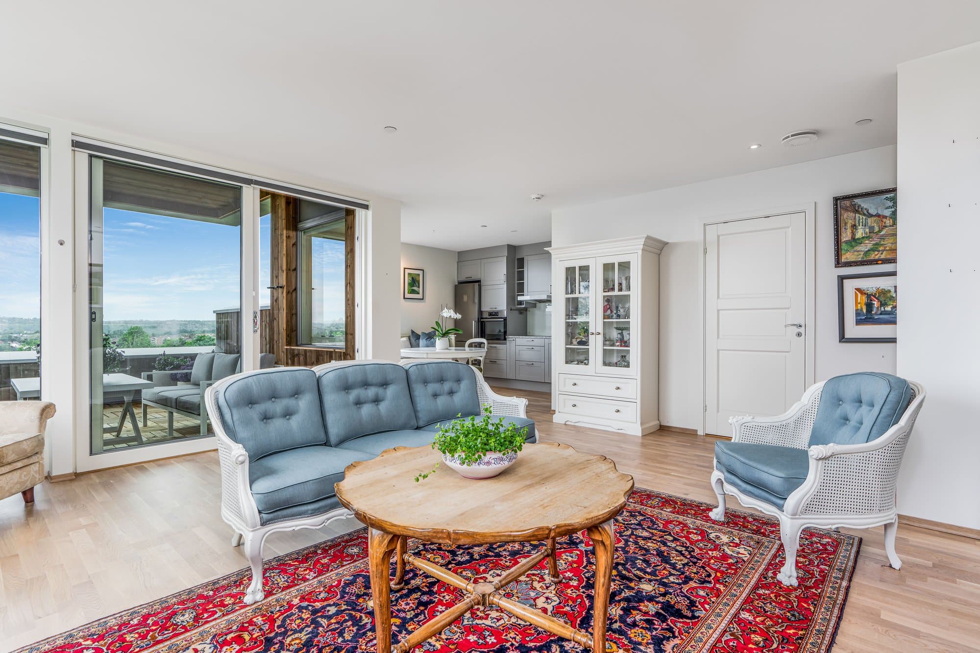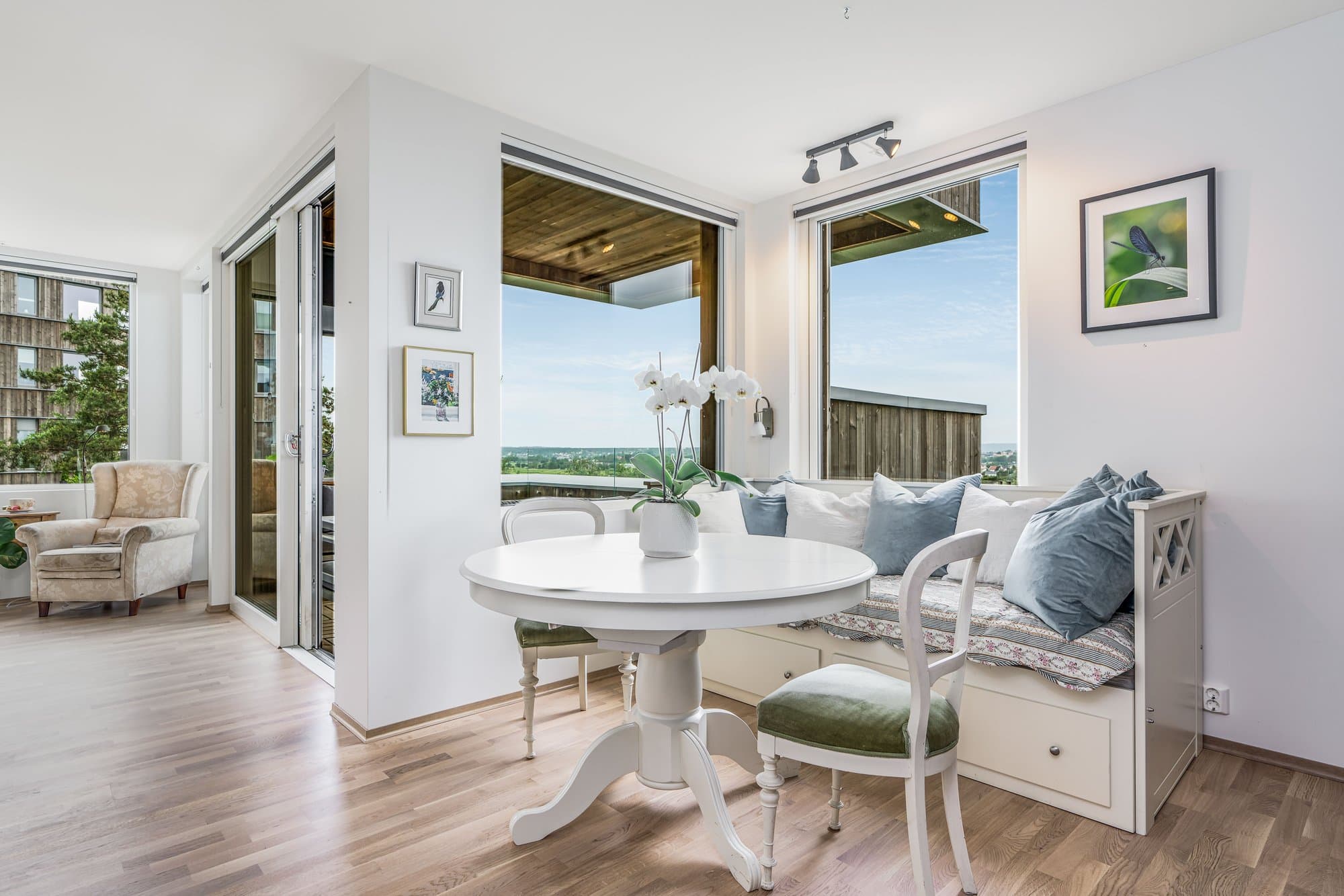 Smakfull 2 (3)-roms, moderne leilighet fra november 2019. Leiligheten fikk flere tilvalg før innflytting, har gjennomgående høy standard og består av: Gang, bod, bad, stue, kjøkken, ett (to) soverom. Parkett og fliser på gulv og ellers malte, slette vegger i alle rom. God takhøyde og store vindusflater. Vestvendt balkong på 27 kvm med sol fra formiddag til solnedgang. Her har du fantastisk 180 graders utsikt fra byens tak, i første rekke. Hyggelig nabolag og kort vei til kollektivtransport, matbutikker, lysløype, skole og barnehage. Leiligheten har 2-veis porttelefon, vannbåren gulvvarme og tilgang til liten hageflekk. Eier disponerer en parkeringsplass med el-lader og to boder (13 kvm) i parkeringskjeller. Beboere har tilgang til en felles takterrasse, sykkelparkering og leie av el-sykler, og det gjøres bruk av nedgravde brønner for restavfall og papir. Gjesteparkering og lekeplasser i umiddelbar nærhet. Leiligheten har IN-ordning og eier har innfridd hele fellesgjelden. Med denne leiligheten har du dermed lavere husleie pr måned.