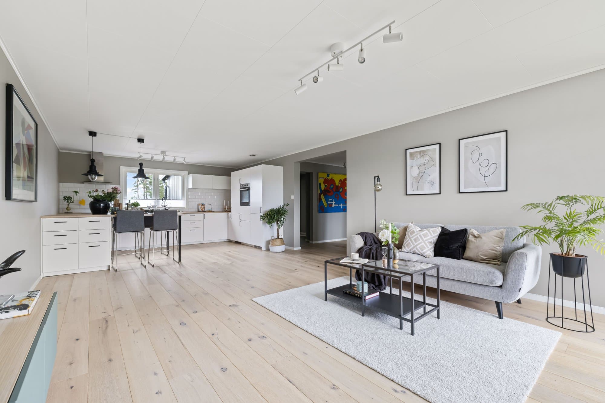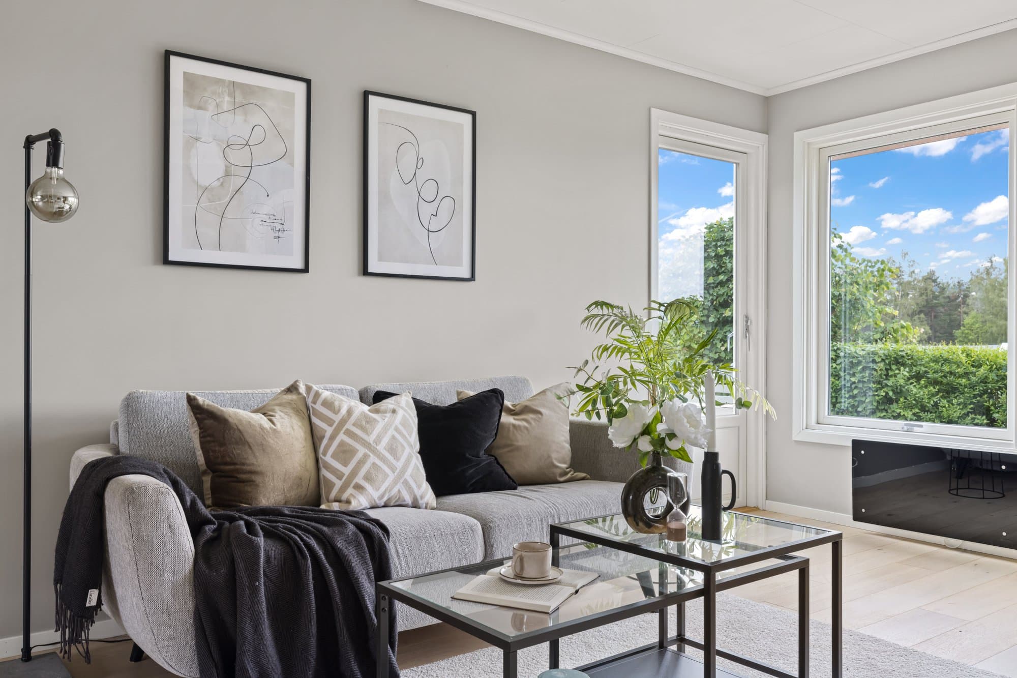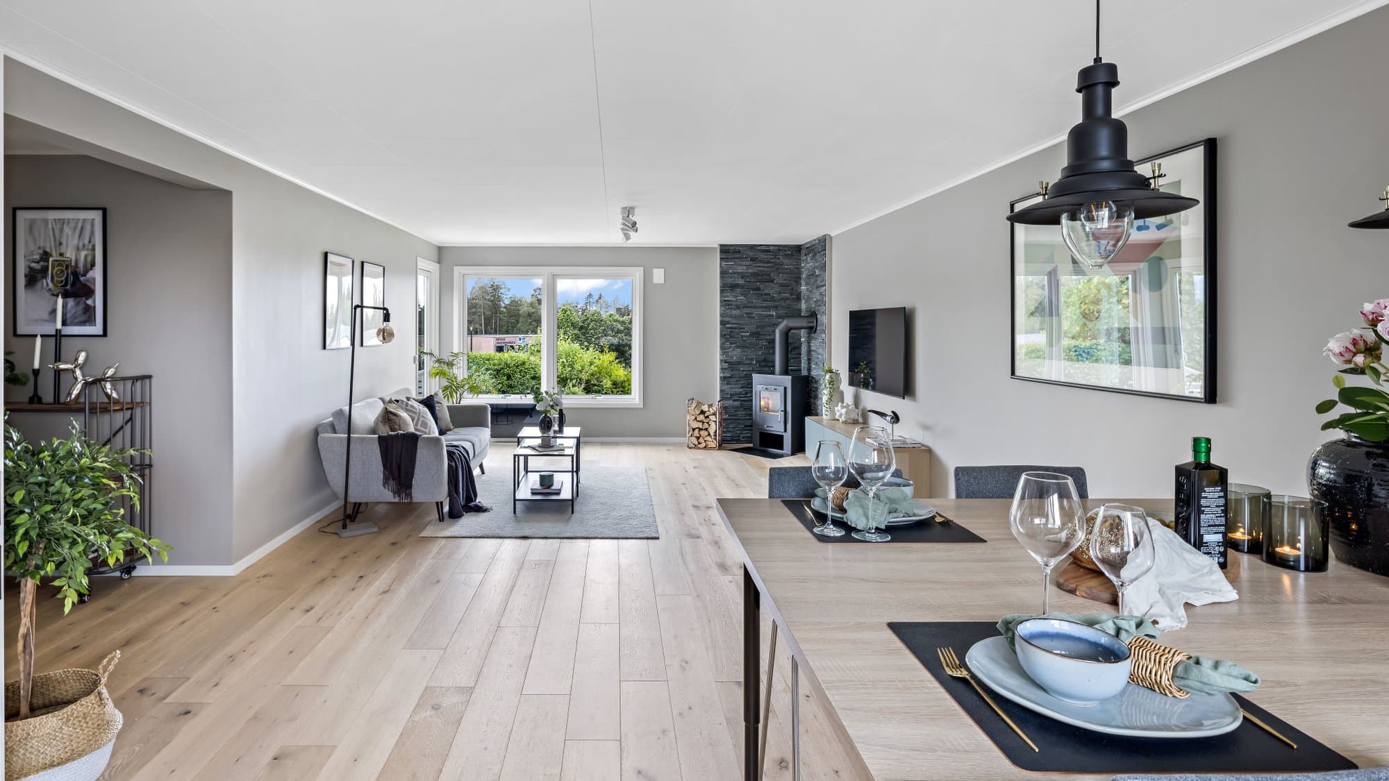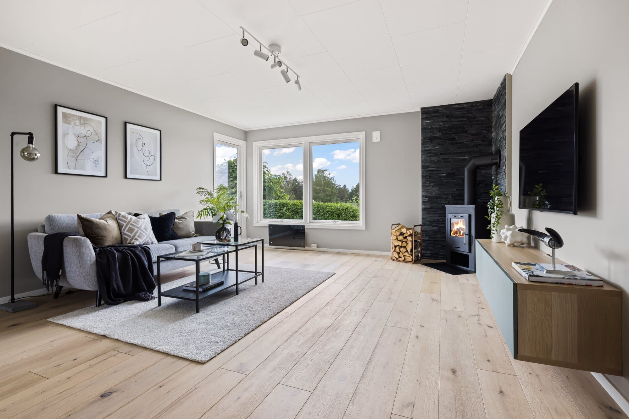 Stuen er romslig og lekker, med et stort vindu som slipper inn godt med dagslys. En glassdør fører ut til den solrike terrassen, en vidunderlig romforlengelse i sommerhalvåret. Videre er stuen stilfullt pusset opp med flott 1-stavs parkettgulv og veggflater malt i en dus gråtone. Lune kvelder sikres av en peisovn, og veggen bak ildstedet er kledd i mørk pyntestein. Det er åpen kjøkkenløsning i stuen – sosialt og arealeffektivt.