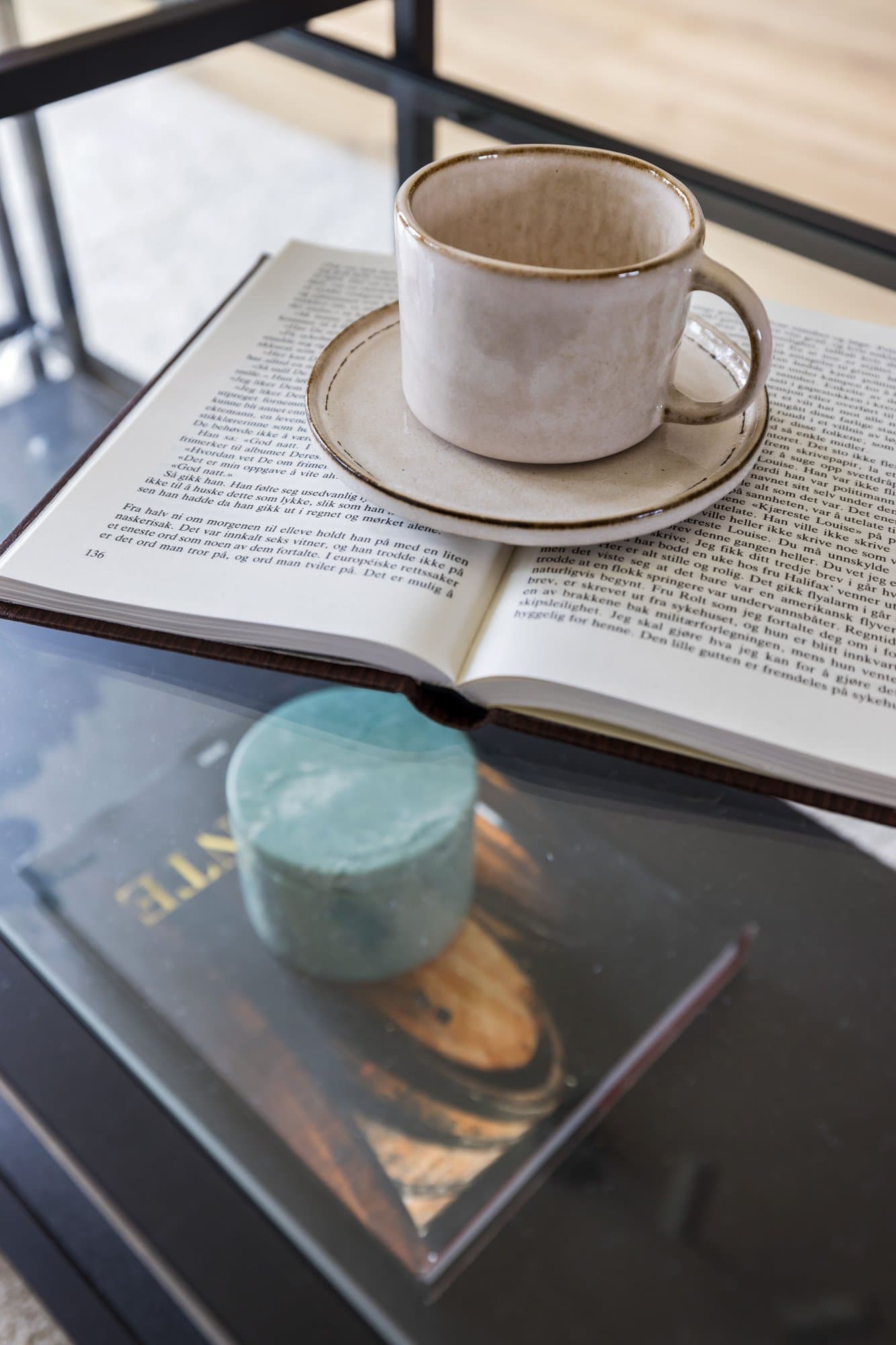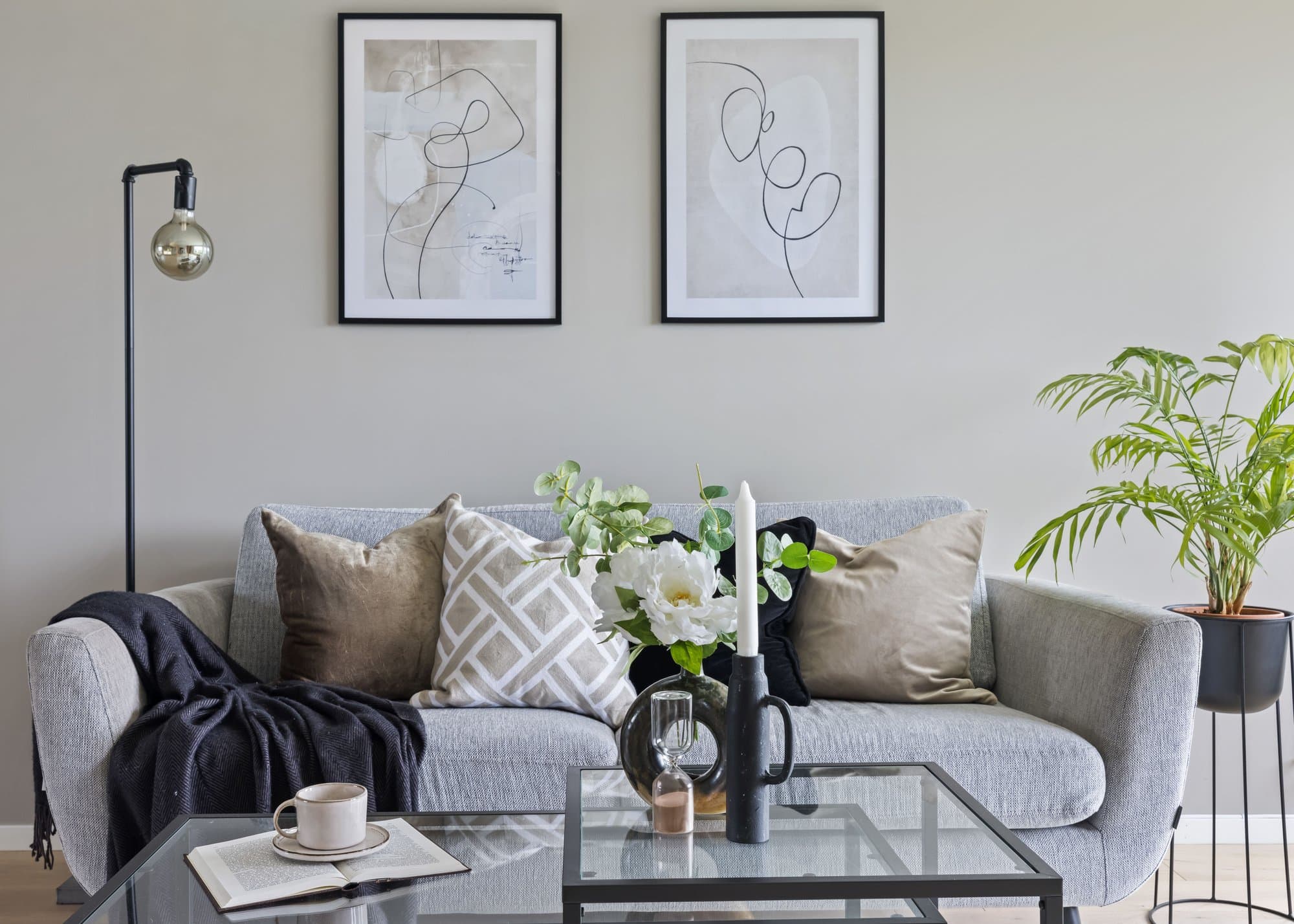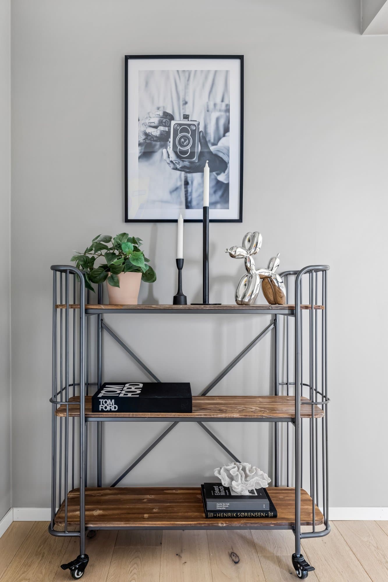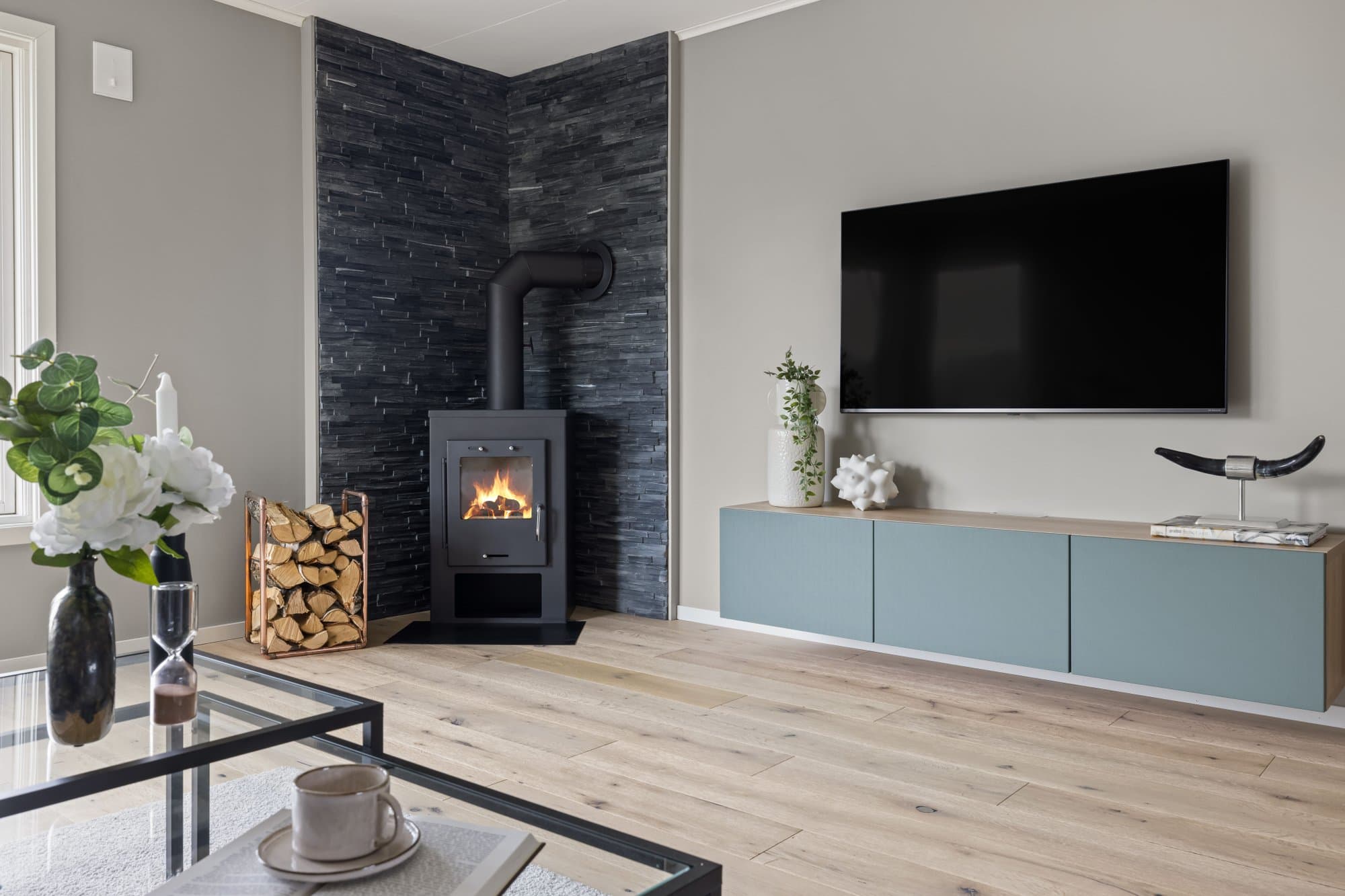 Stuen er romslig og lekker, med et stort vindu som slipper inn godt med dagslys. En glassdør fører ut til den solrike terrassen, en vidunderlig romforlengelse i sommerhalvåret. Videre er stuen stilfullt pusset opp med flott 1-stavs parkettgulv og veggflater malt i en dus gråtone. Lune kvelder sikres av en peisovn, og veggen bak ildstedet er kledd i mørk pyntestein. Det er åpen kjøkkenløsning i stuen – sosialt og arealeffektivt.