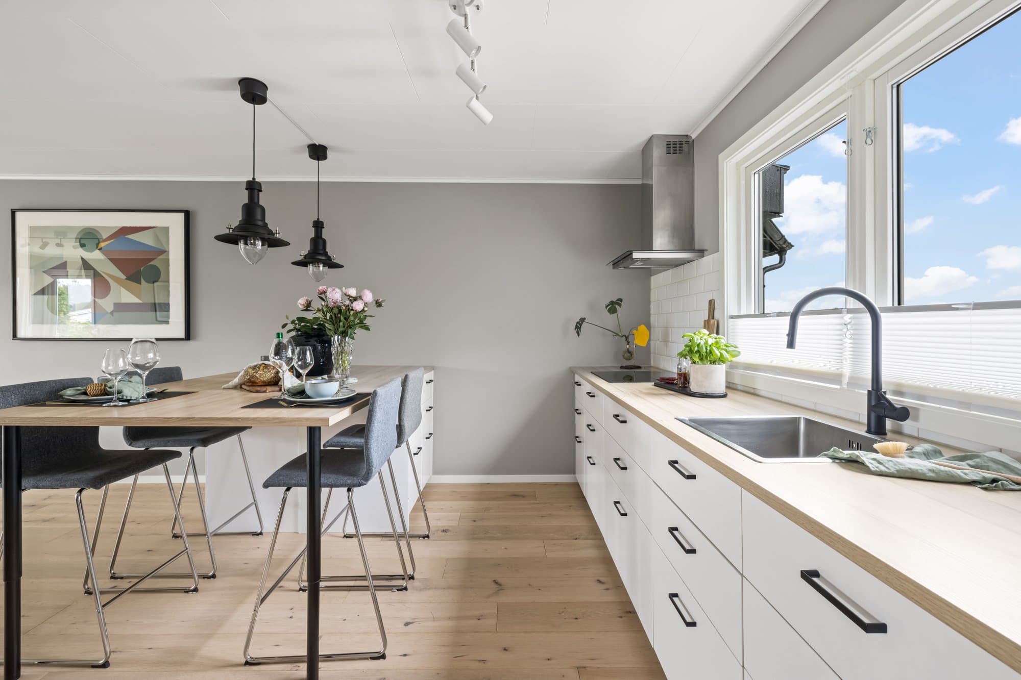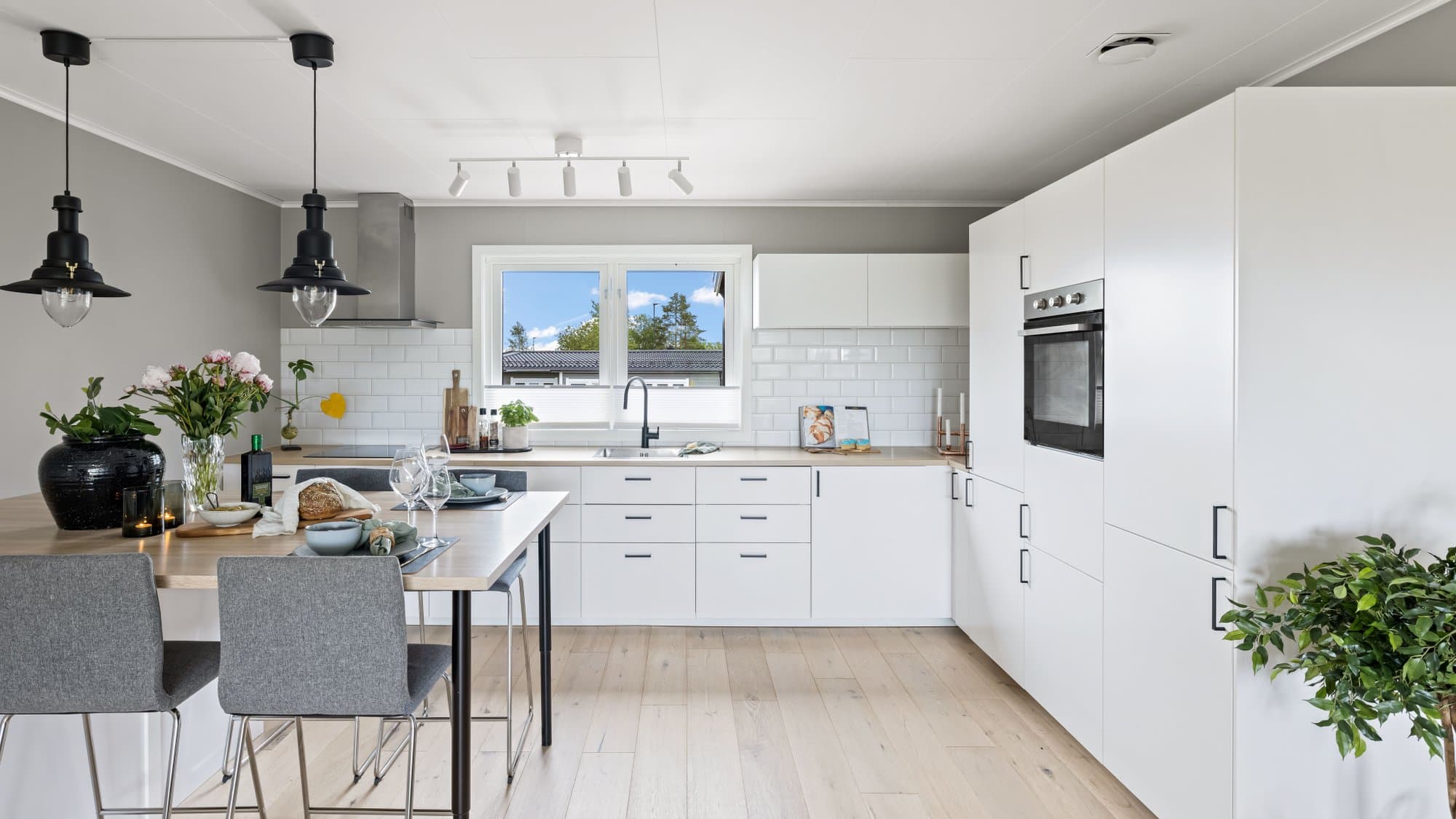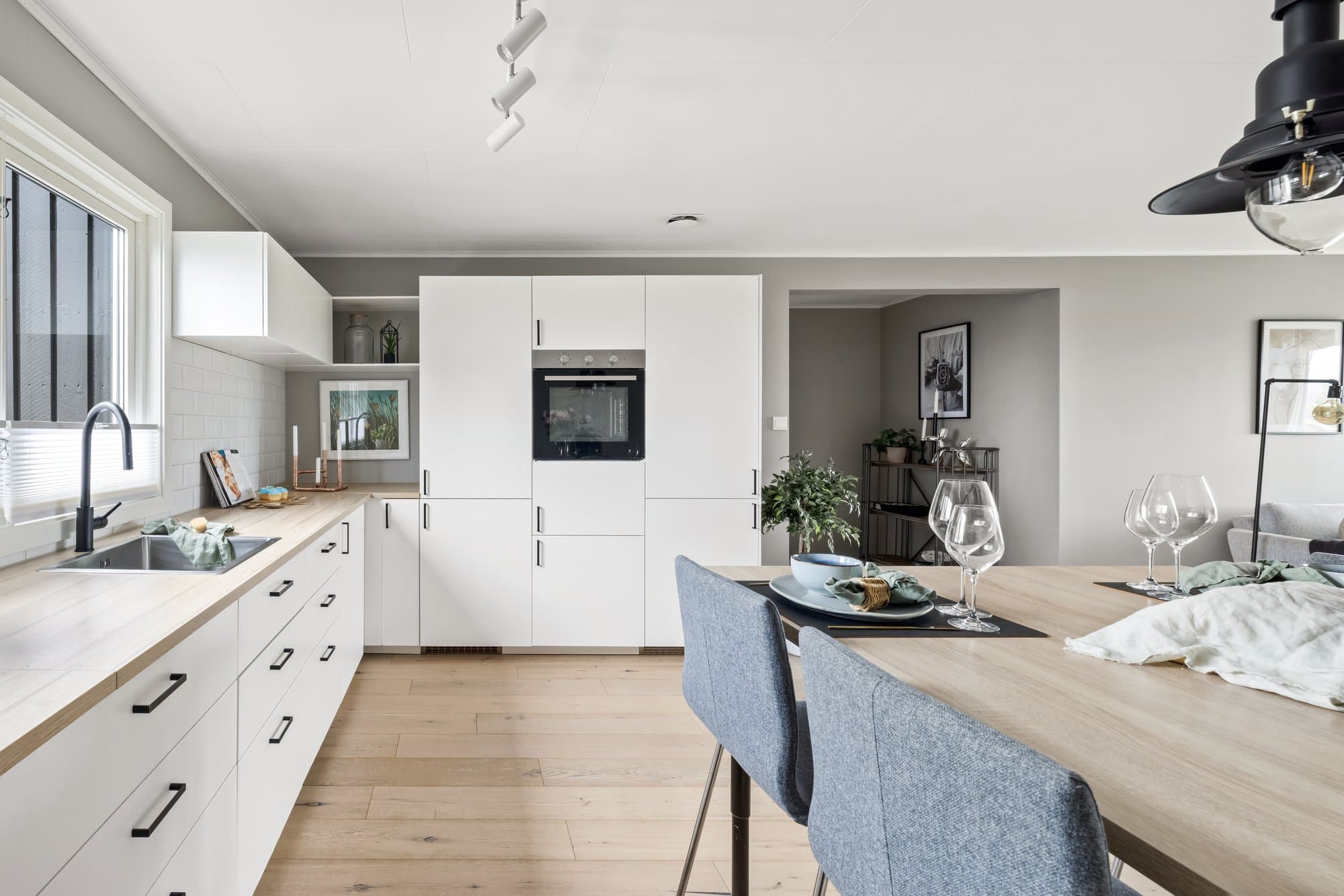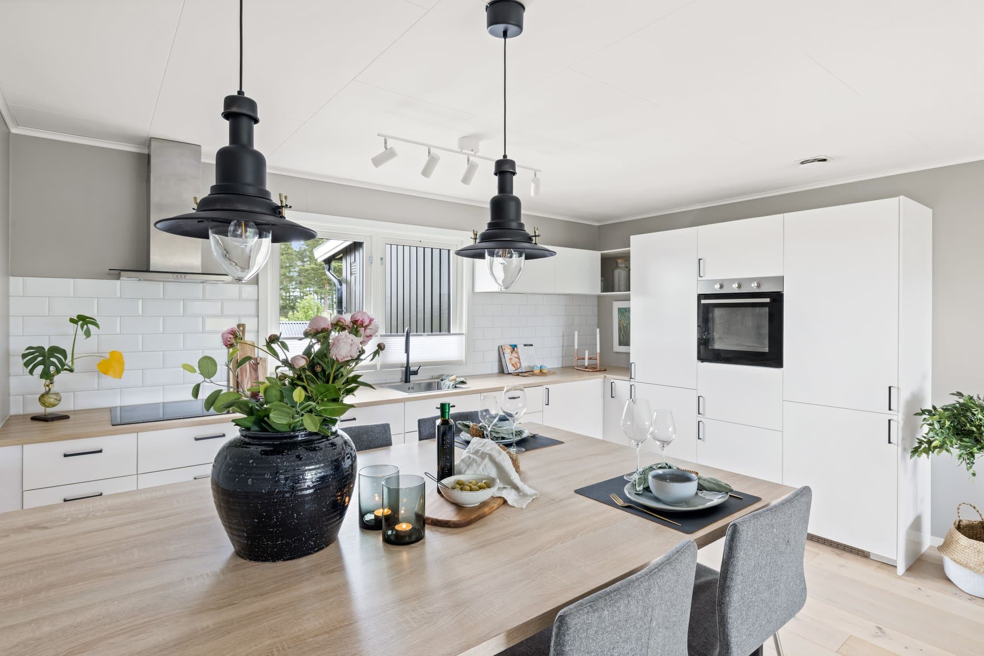 Et nyere, moderne kjøkken har åpen løsning mot stuen, og sammen skaper de et sosialt allrom for hele familien. Innredningen fra Ikea har hvite, slette fronter og laminert benkeplate med oppvaskkum av stål. Ut mot stuen er det en stor, smart barløsning med skuffer og rom for flere sitteplasser. Det er godt med skap- og benkeplass på kjøkkenet. Over benken er det hvite metrofliser, og over kokesonen er det montert en stilren ventilator med belysning. Av hvitevarer har kjøkkenet integrert platetopp, stekeovn, oppvaskmaskin og en kombinert kjøl/frys.