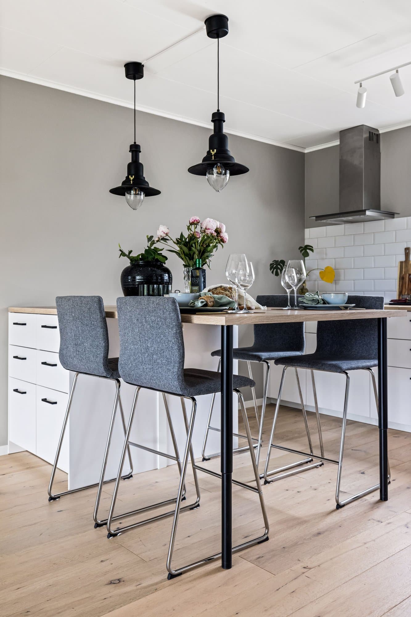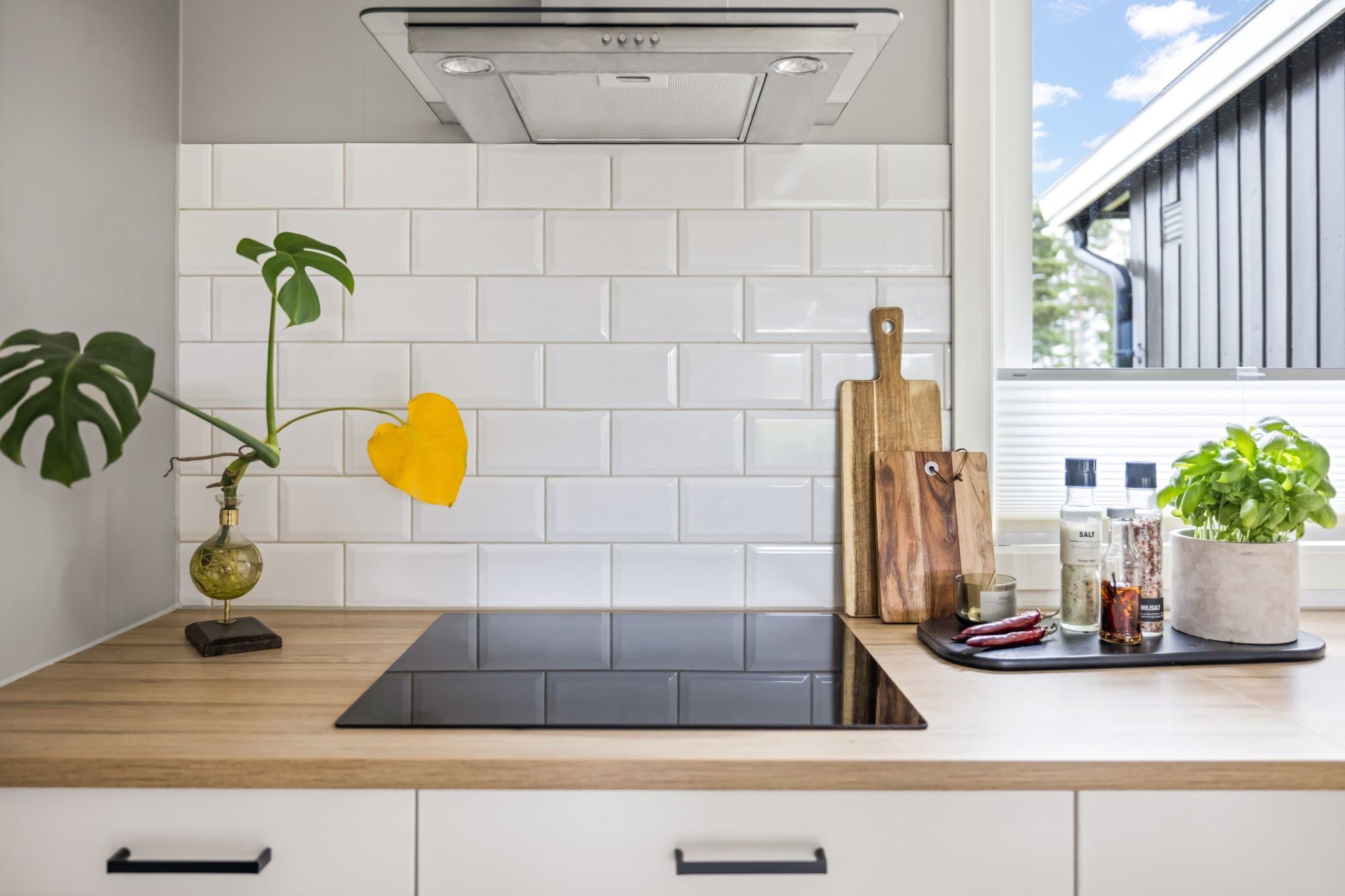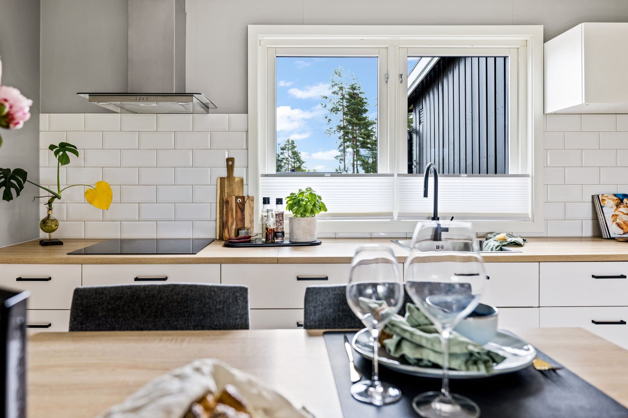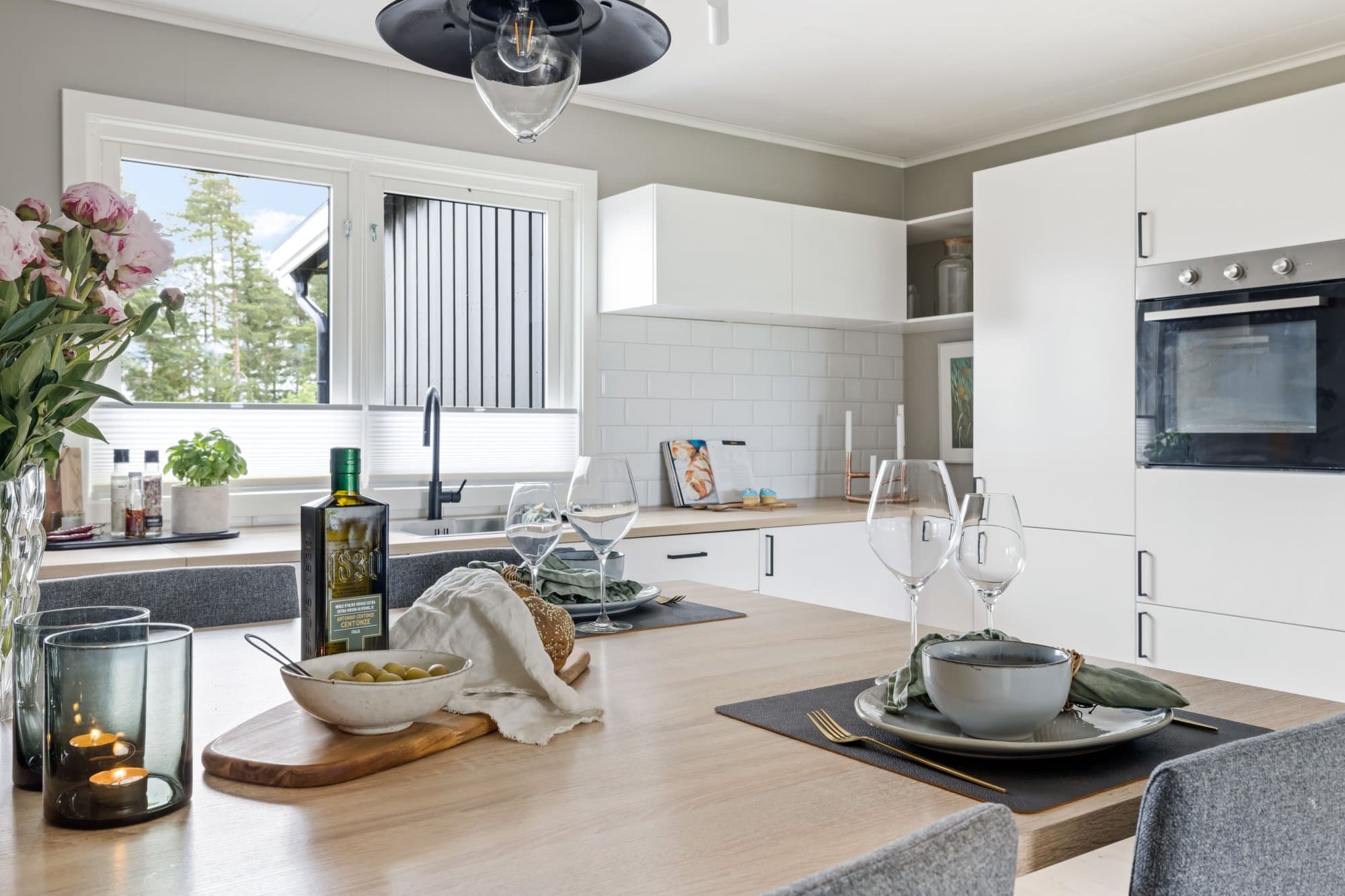 Et nyere, moderne kjøkken har åpen løsning mot stuen, og sammen skaper de et sosialt allrom for hele familien. Innredningen fra Ikea har hvite, slette fronter og laminert benkeplate med oppvaskkum av stål. Ut mot stuen er det en stor, smart barløsning med skuffer og rom for flere sitteplasser. Det er godt med skap- og benkeplass på kjøkkenet. Over benken er det hvite metrofliser, og over kokesonen er det montert en stilren ventilator med belysning. Av hvitevarer har kjøkkenet integrert platetopp, stekeovn, oppvaskmaskin og en kombinert kjøl/frys.