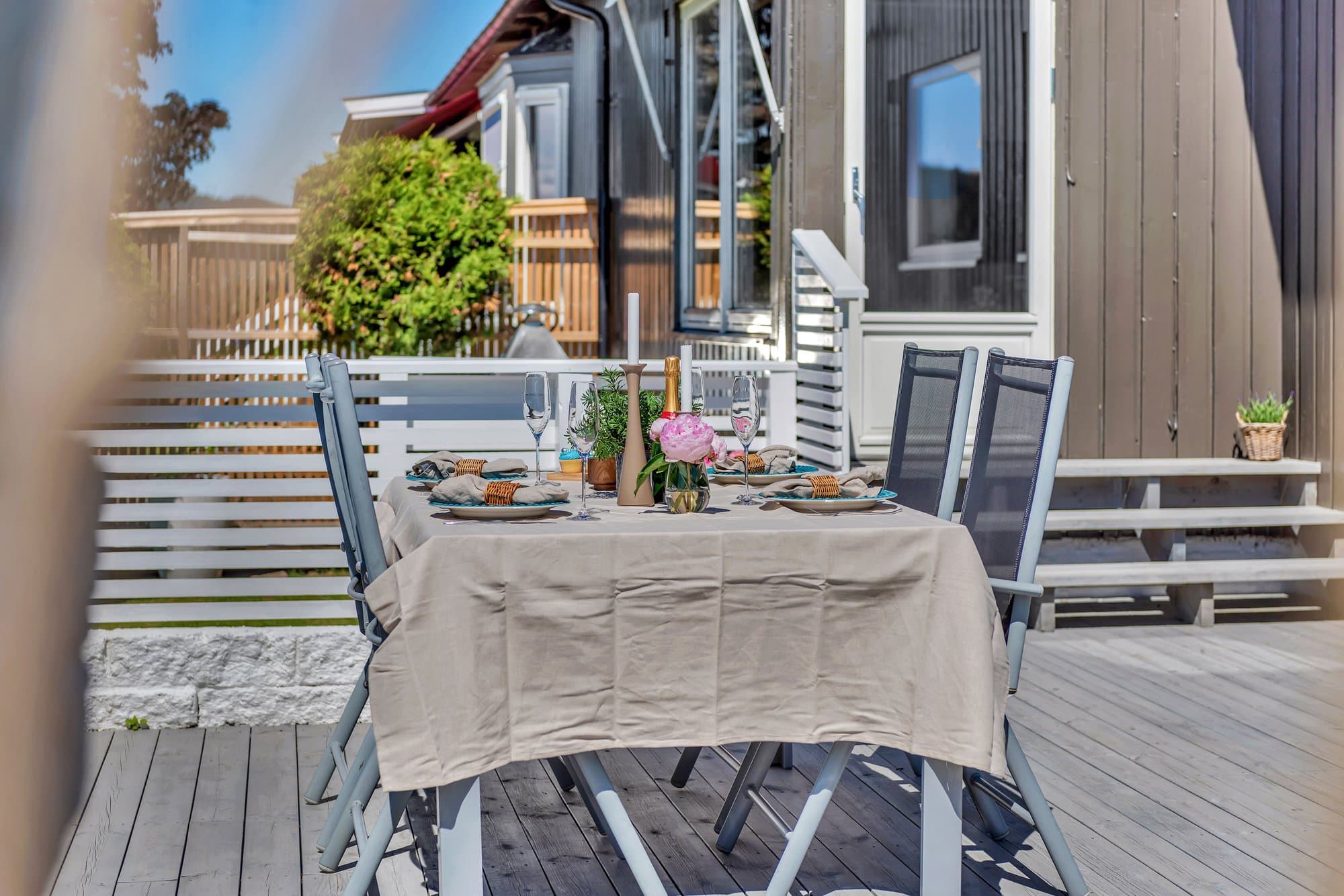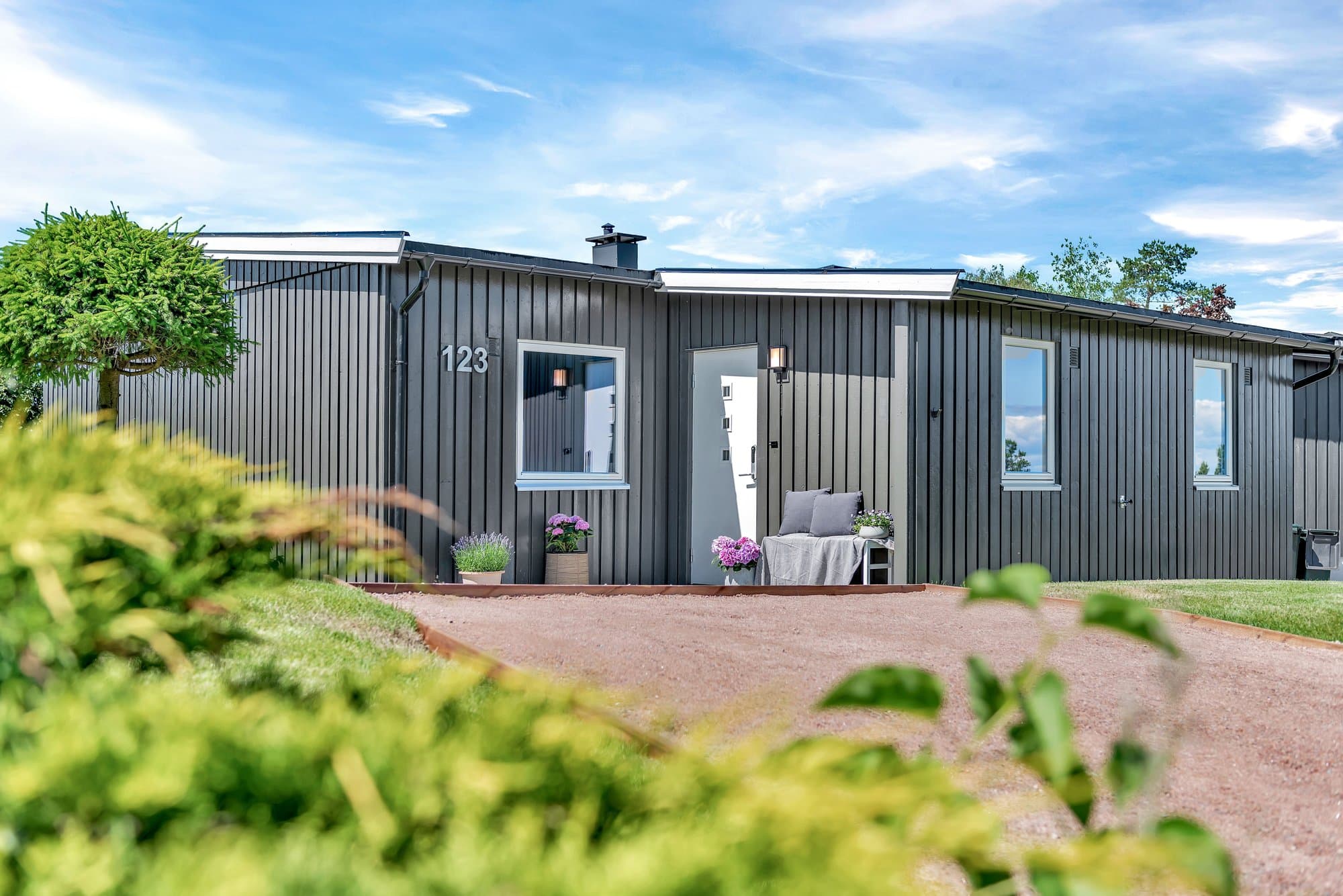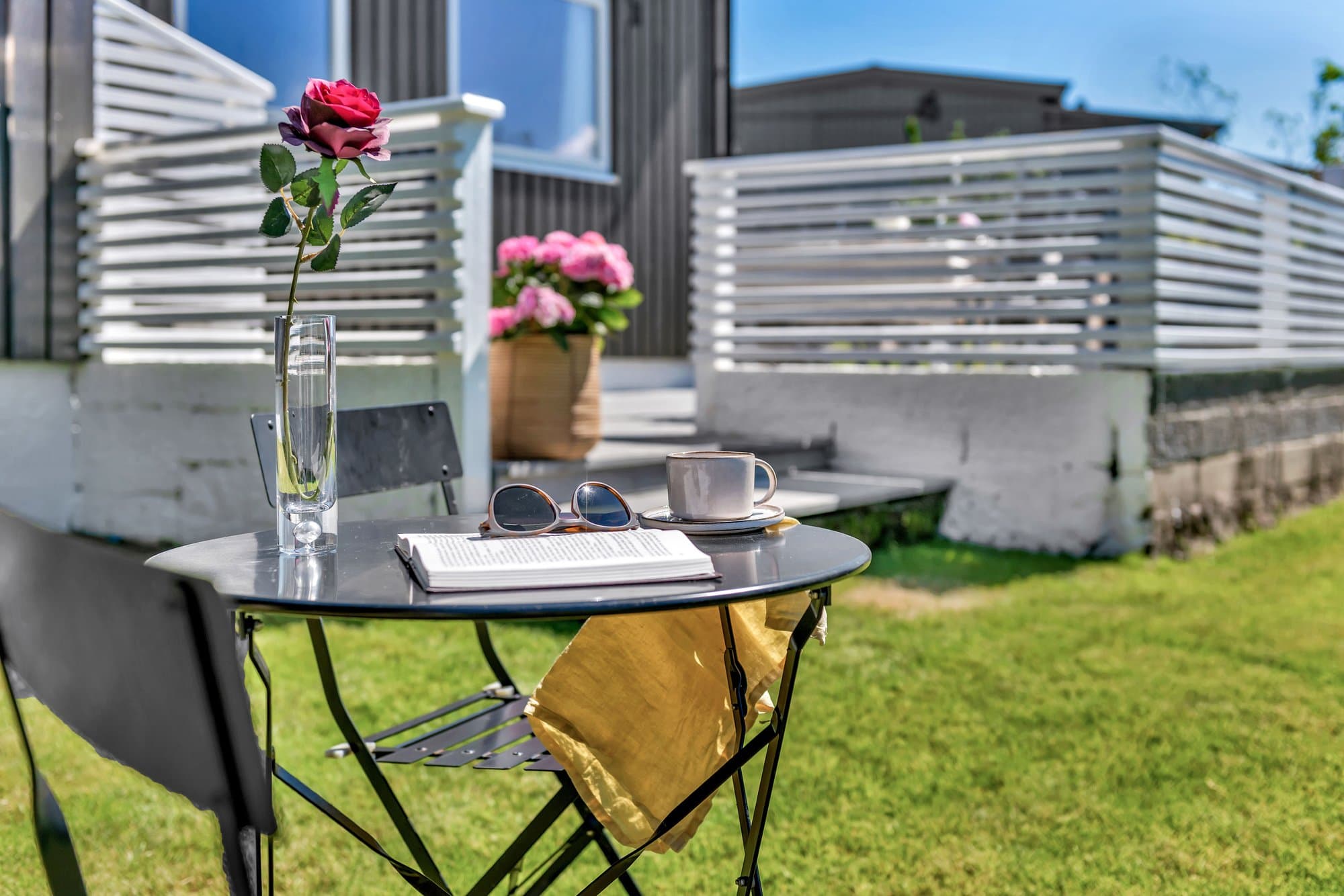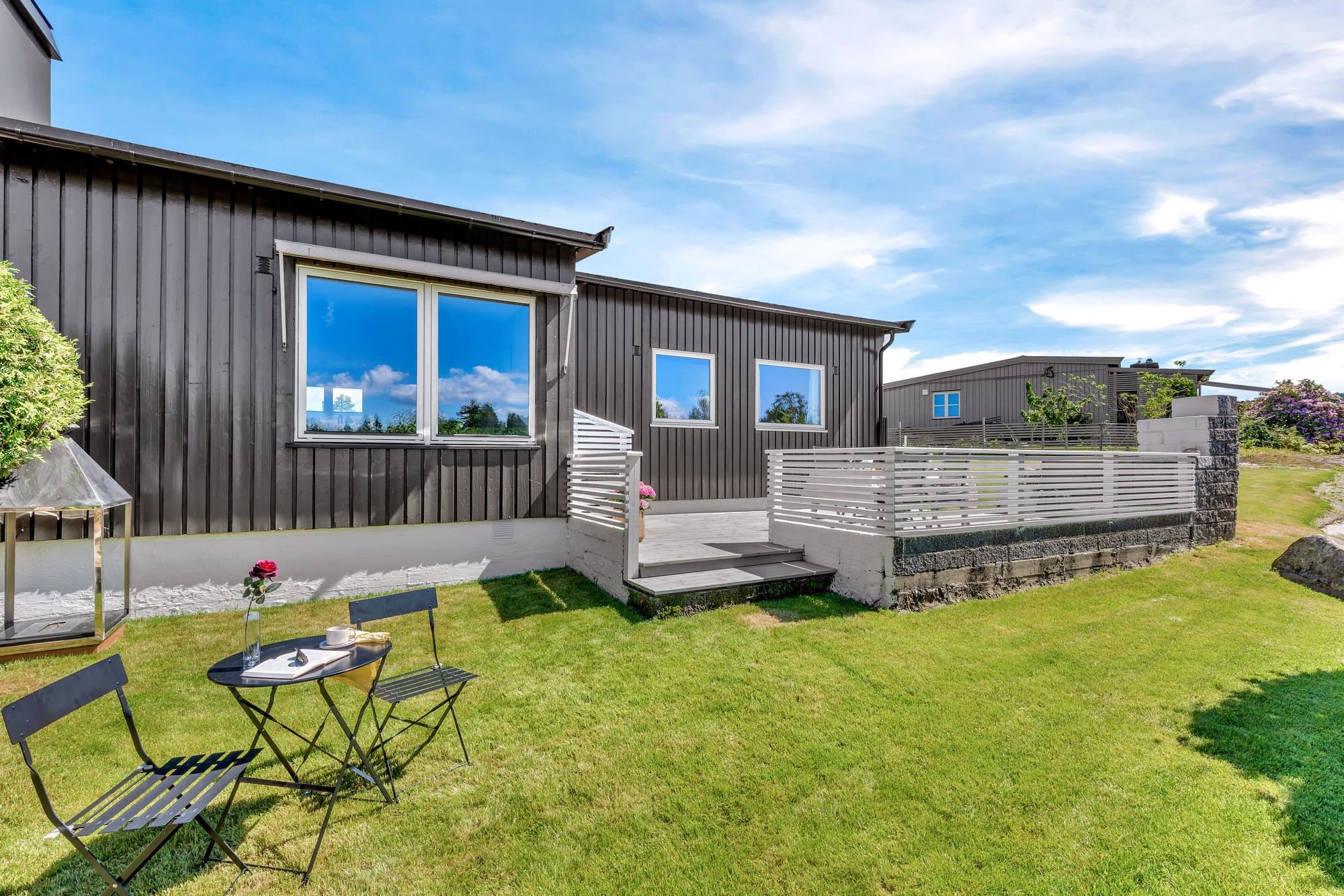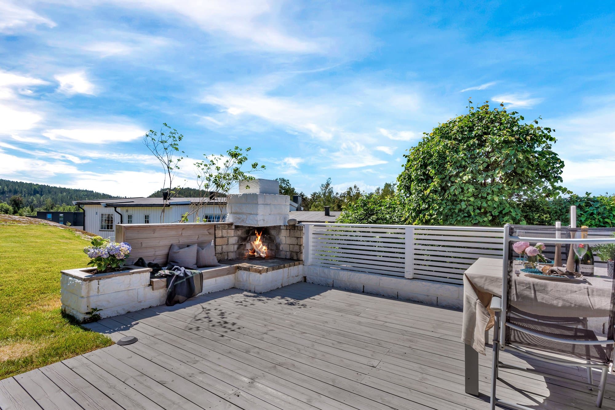 Omgivelsene er barnevennlige, like ved turmuligheter og oppkjørte skispor i marka. Til barnas store glede er det en flott lekeplass i nabolaget. Boligen ligger sørvest-vendt til på en romslig tomt, og bedre solforhold får man ikke. Tomten er pent opparbeidet med gressplen, gjerde, bed, hekk og diverse beplantning. Hagen byr på mye boltreplass, og her er det rom for en rekke aktiviteter året rundt. Deler av eiendommen er naturtomt med fjell i dagen. Enkelte bordkledninger er skiftet i senere tid, og foran huset er det en gruset gårdsplass med gode muligheter for parkering. Ved inngangen finner man en koselig terrasse med belysning og rom for kafésett eller benker. Fra stuen er det utgang til en vidunderlig terrasse på ca. 30 kvm, med direkte adkomst til den store hagen. Terrassen har rekkverk med liggende spiler og fint utsyn over nærliggende natur. På terrassen er det en lun, liten krok med integrert blomsterkasse, plassbygget sittebenk og en murt utepeis som forlenger sommerkveldene. Uteplassen passer perfekt til både rolige stunder i solveggen og sosiale grillmiddager. Det er sol fra morgen til kveld, så på terrassene kan man virkelig nyte varme dager til fulle.