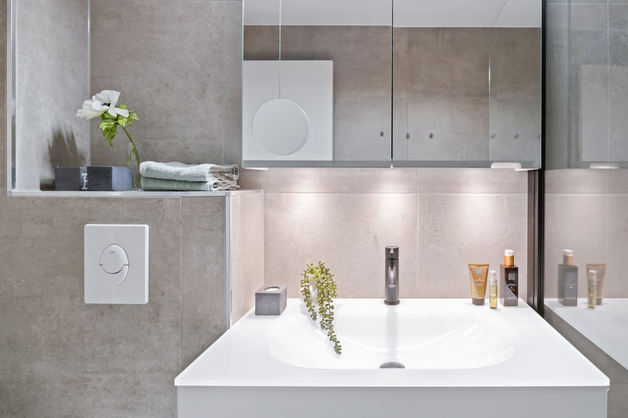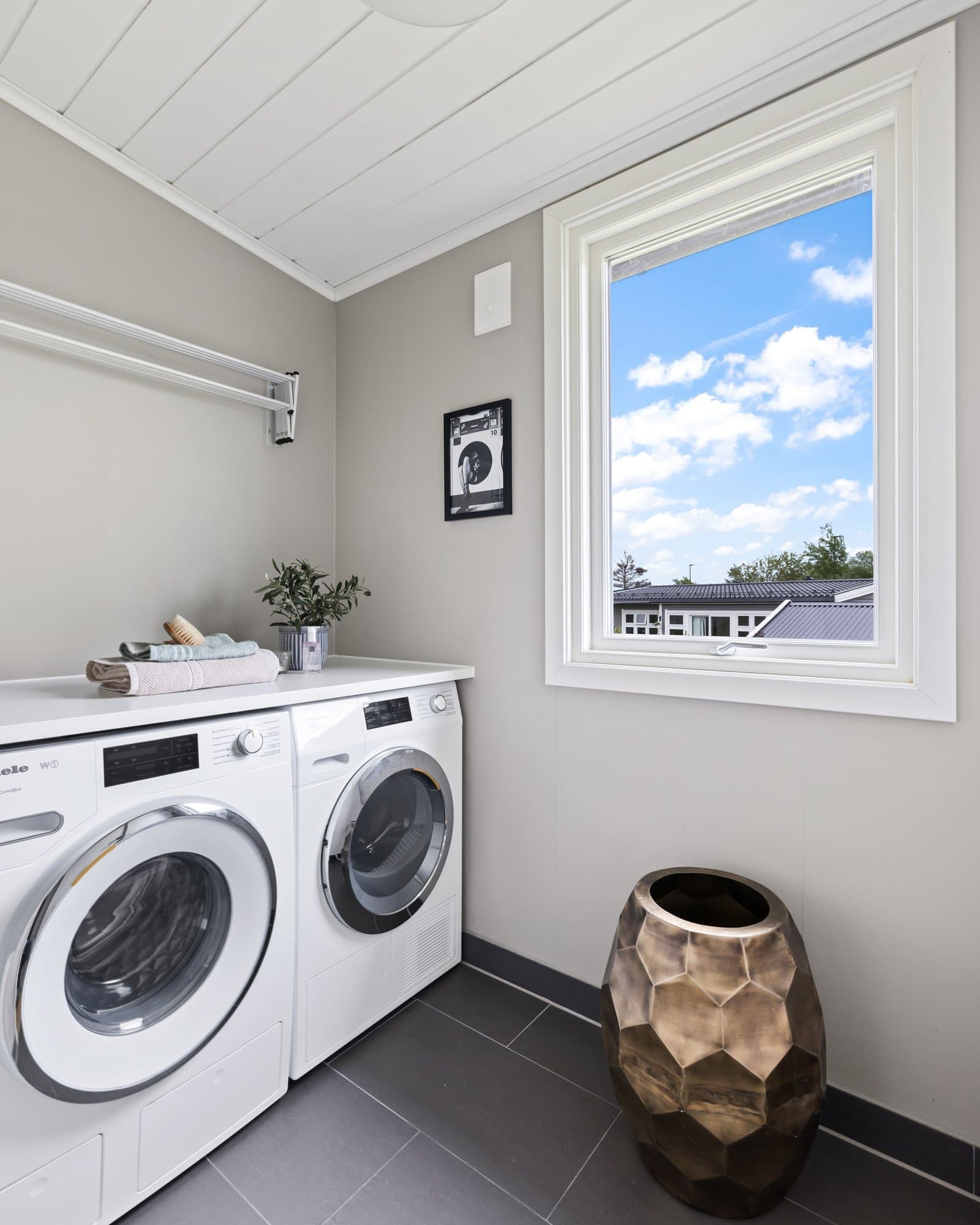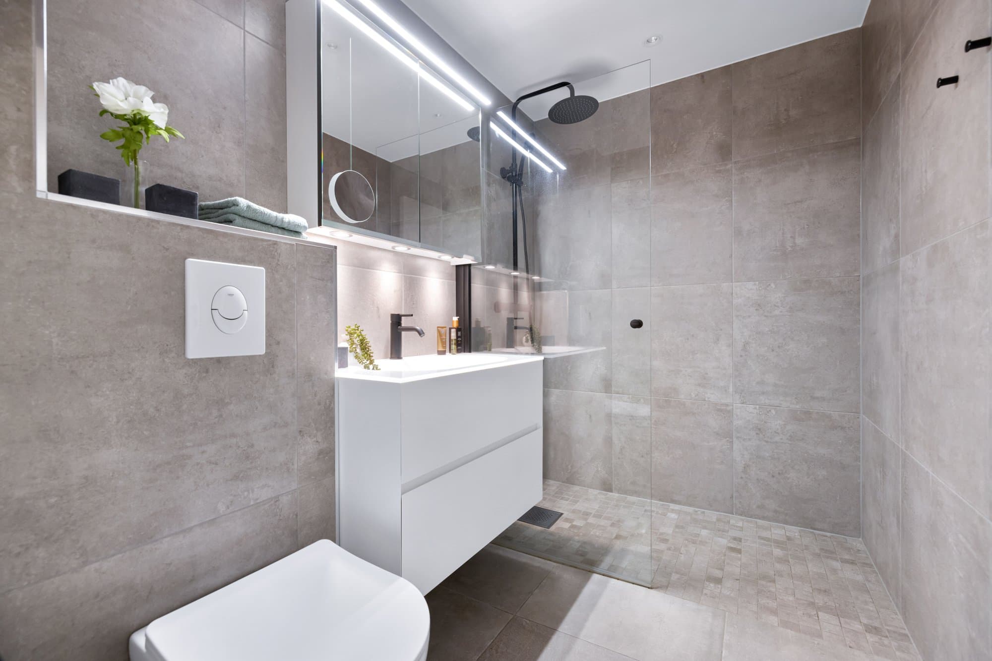 Badet, som ble pusset opp i 2018/19, er virkelig lekkert med store, grå vegg- og gulvfliser. Det er gulvvarme, vegghengt toalett og downlights i himlingen. Et dusjhjørne er utstyrt med svingbar glassdør, sort regnfallsdusj og grå mosaikkfliser på dekke. Den øvrige innredningen består av servant med hvite skuffer og et speilskap med belysning. På badet er detaljene holdt i sort, noe som bidrar til et stilrent og gjennomført uttrykk. Tilliggende entreen er det en bod med sorte gulvfliser, gråmalte veggflater og en hvit arbeidsbenk. Under benken er det opplegg for vaskemaskin og plass til tørketrommel.