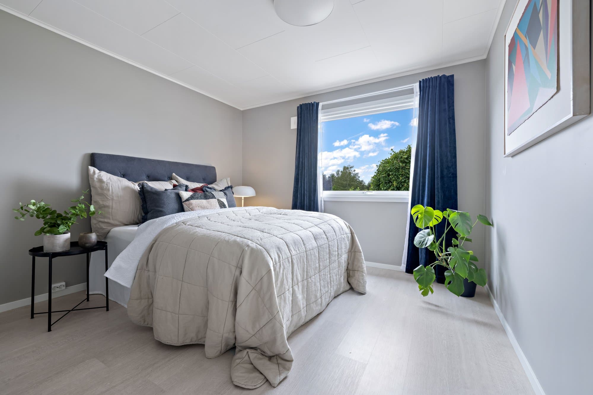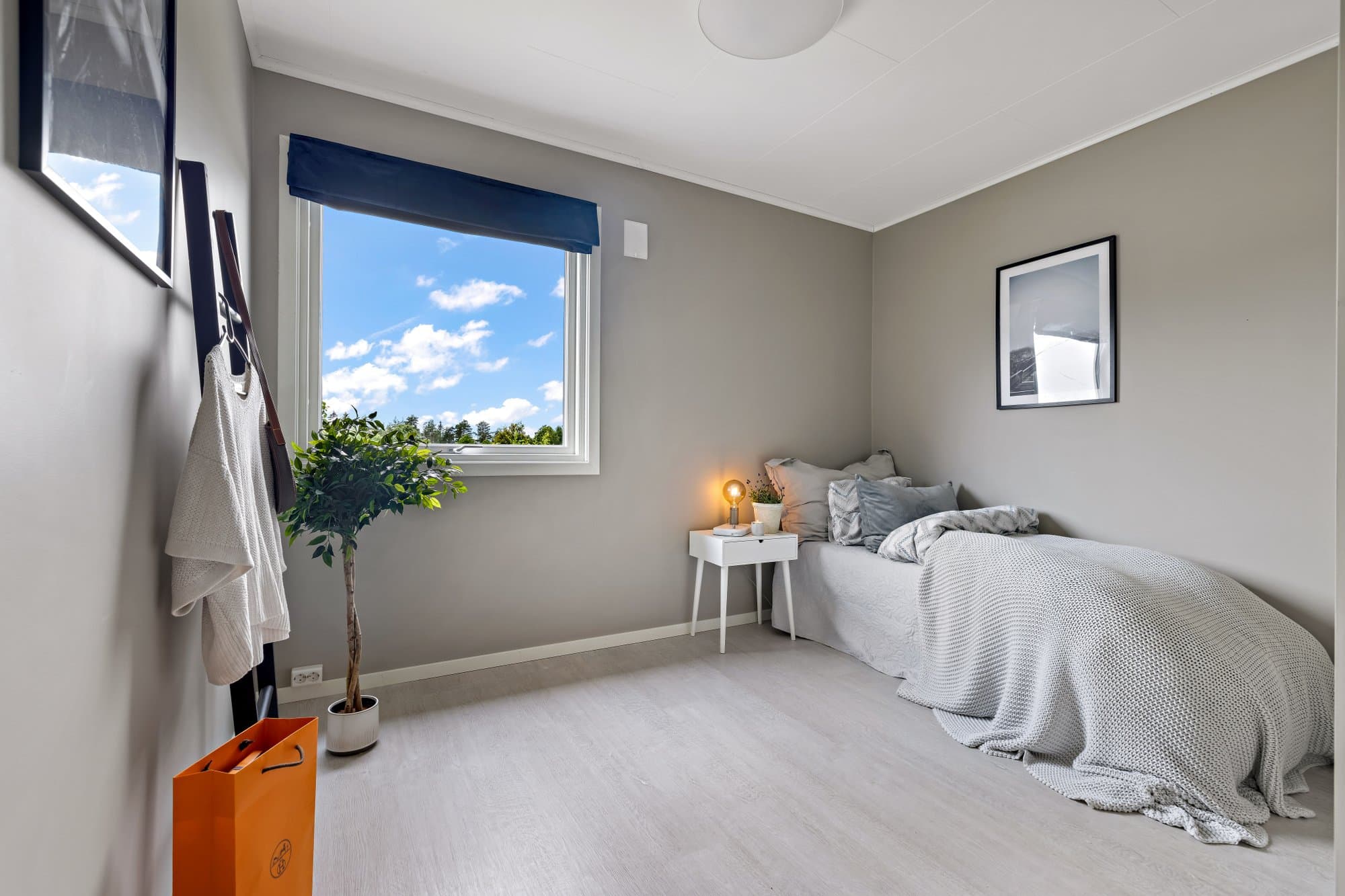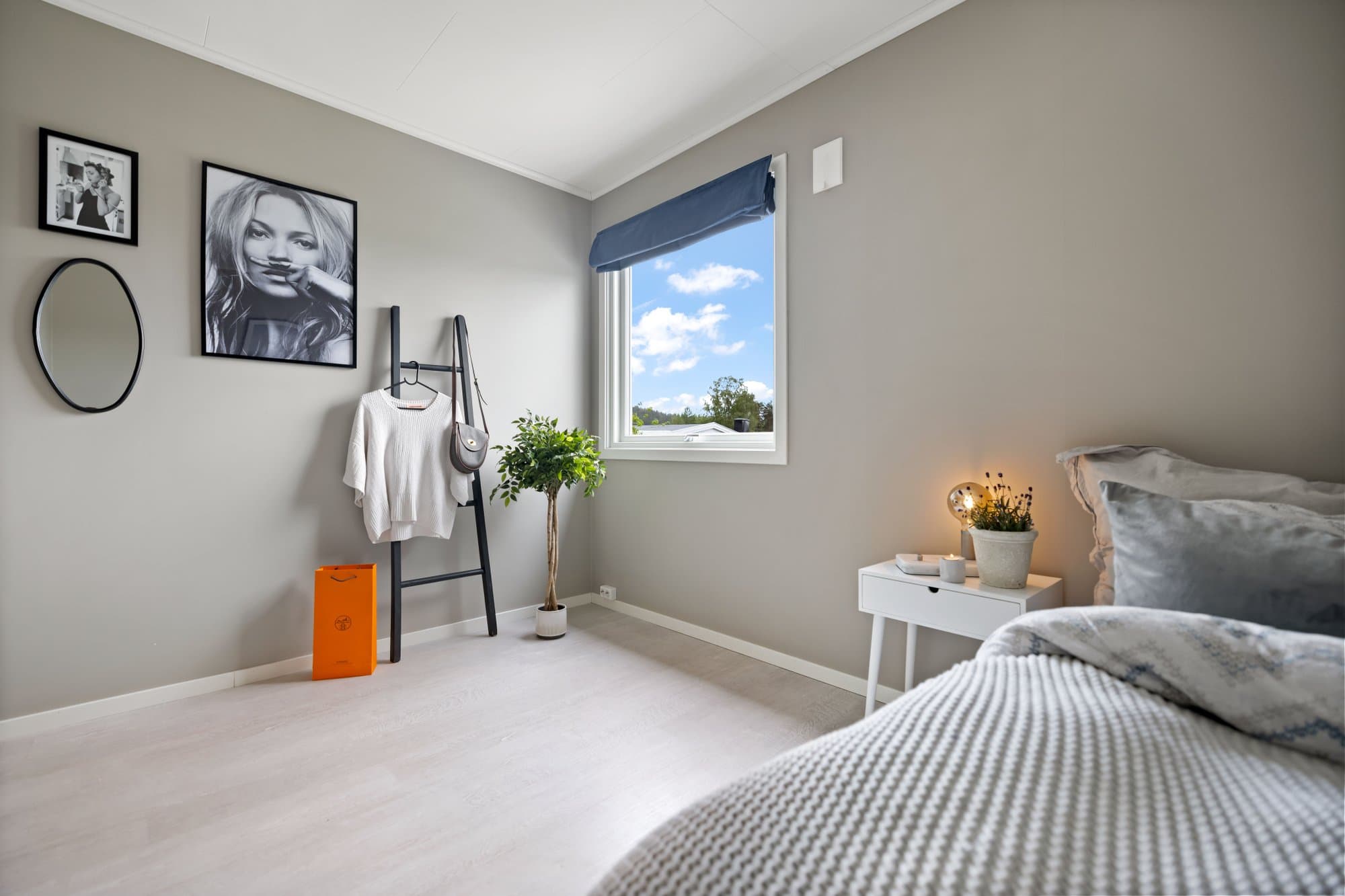 Boligen har hele fire stilfulle og delikate soverom. Veggflatene er malt i ulike duse og tidsriktige gråtoner. Hovedsoverommet har plass til dobbeltseng, og her er det fin utsikt over nærliggende natur. Det er plass til skap eller andre garderobeløsninger på alle soverommene, og hallen er innredet med en stor skyvedørsgarderobe. Ekstra lagringsplass finnes i krypkjelleren og i en bod ved entreen.