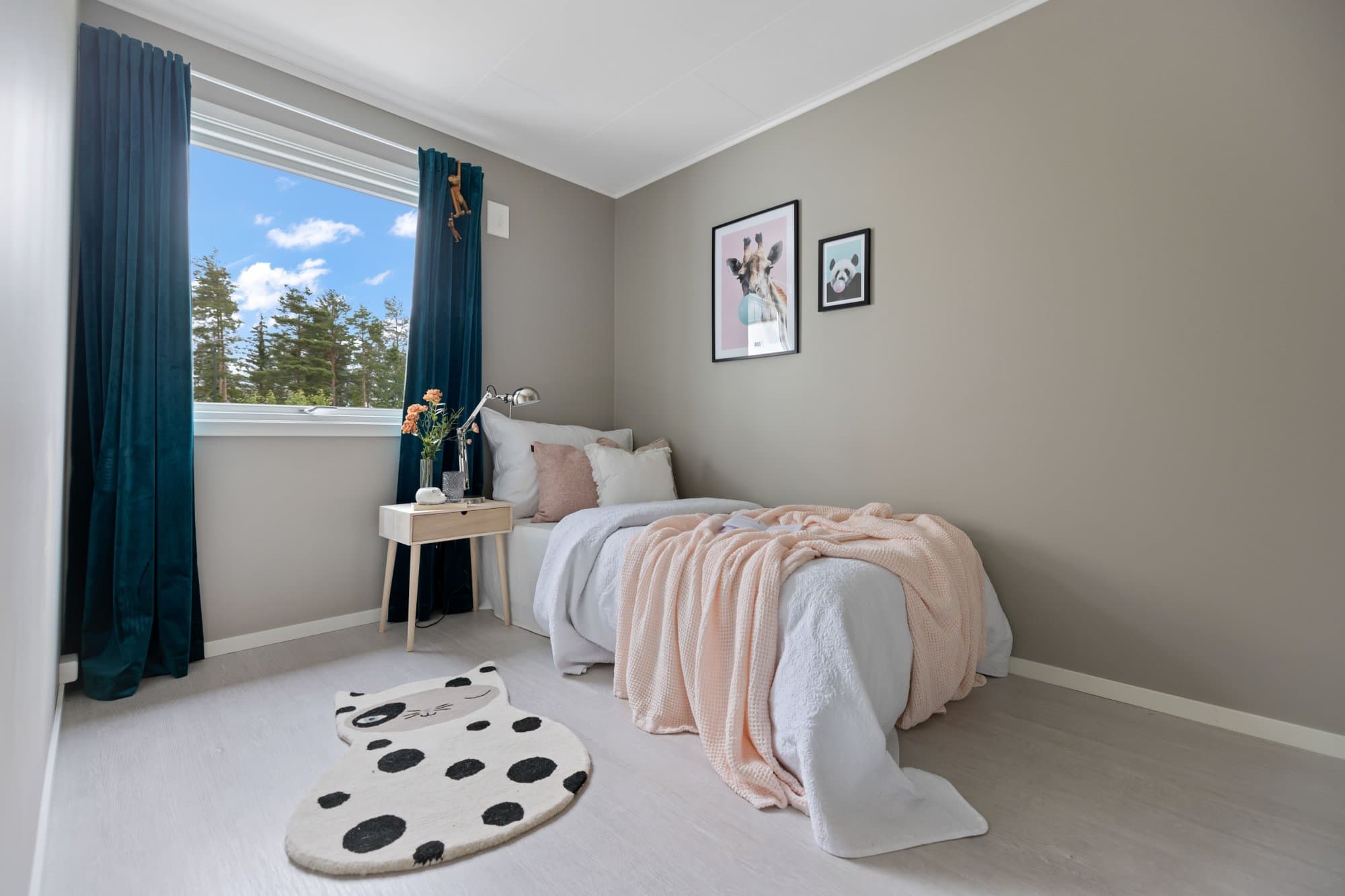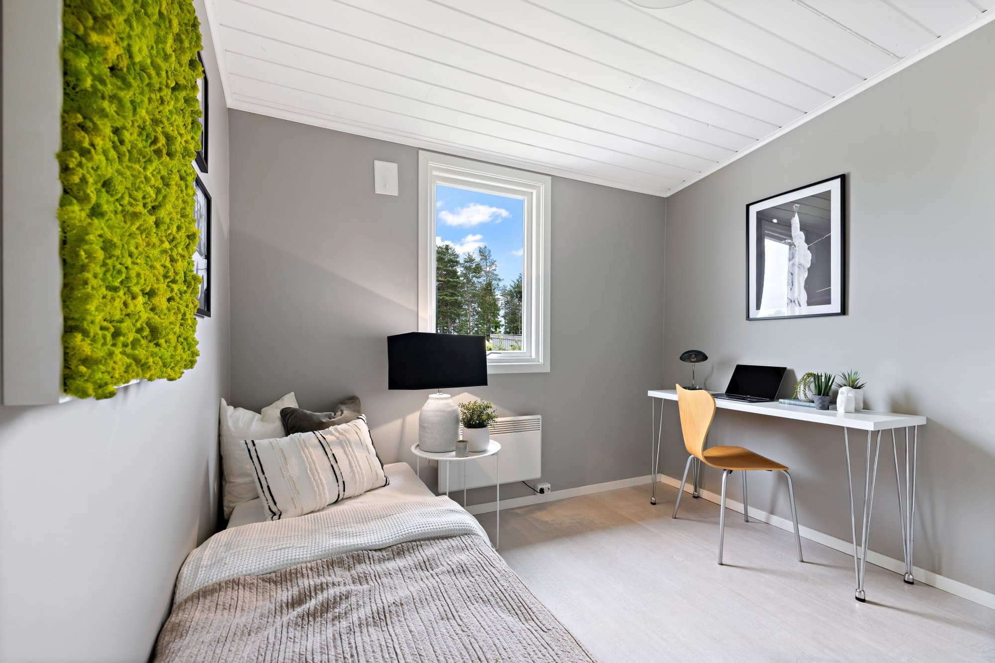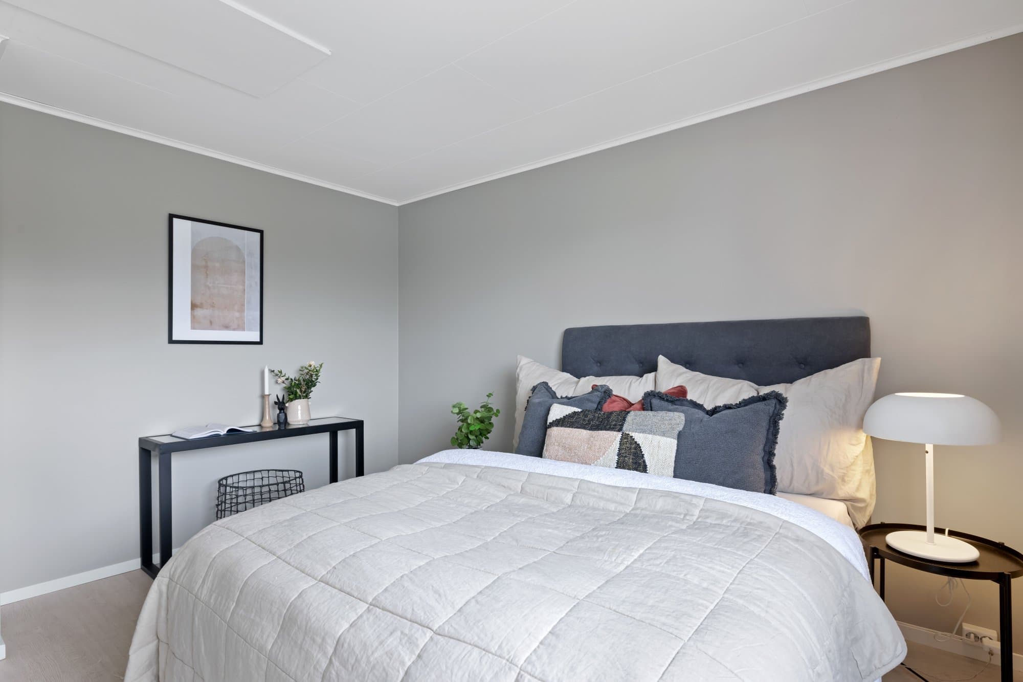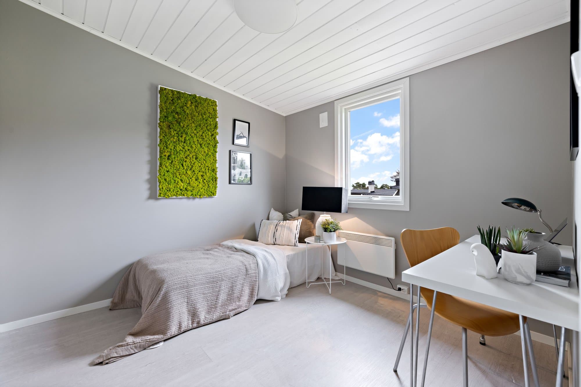 Boligen har hele fire stilfulle og delikate soverom. Veggflatene er malt i ulike duse og tidsriktige gråtoner. Hovedsoverommet har plass til dobbeltseng, og her er det fin utsikt over nærliggende natur. Det er plass til skap eller andre garderobeløsninger på alle soverommene, og hallen er innredet med en stor skyvedørsgarderobe. Ekstra lagringsplass finnes i krypkjelleren og i en bod ved entreen.