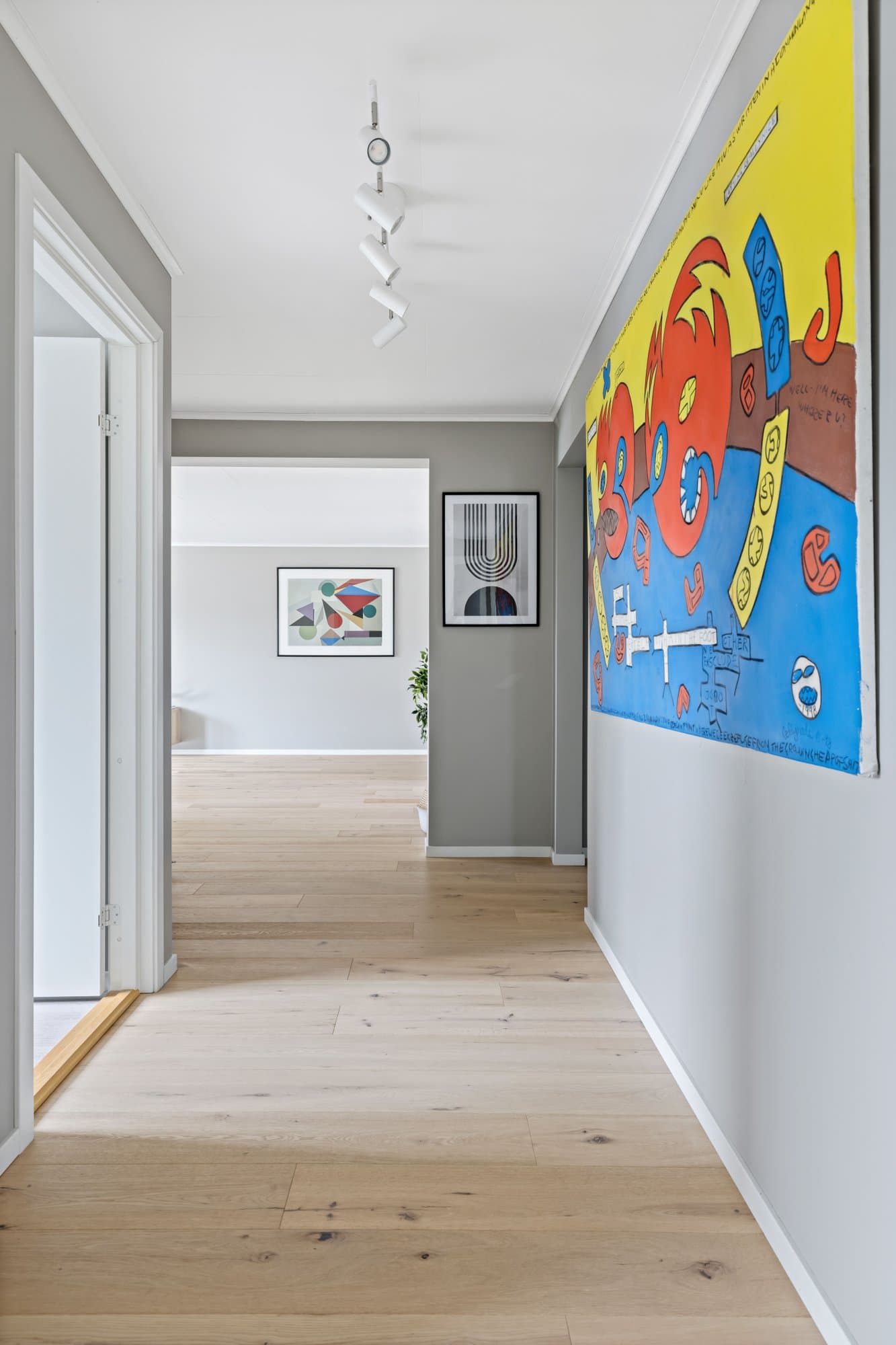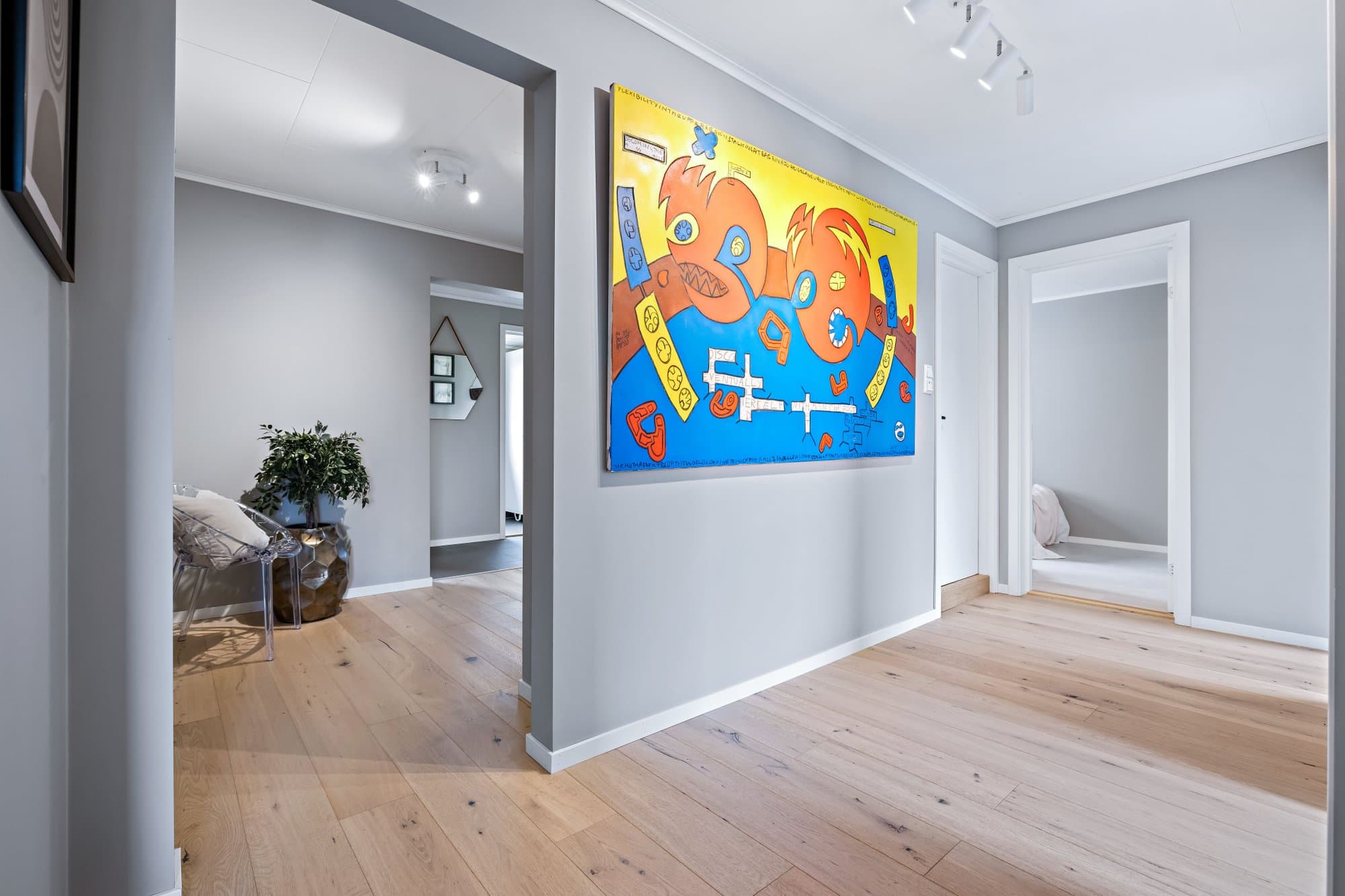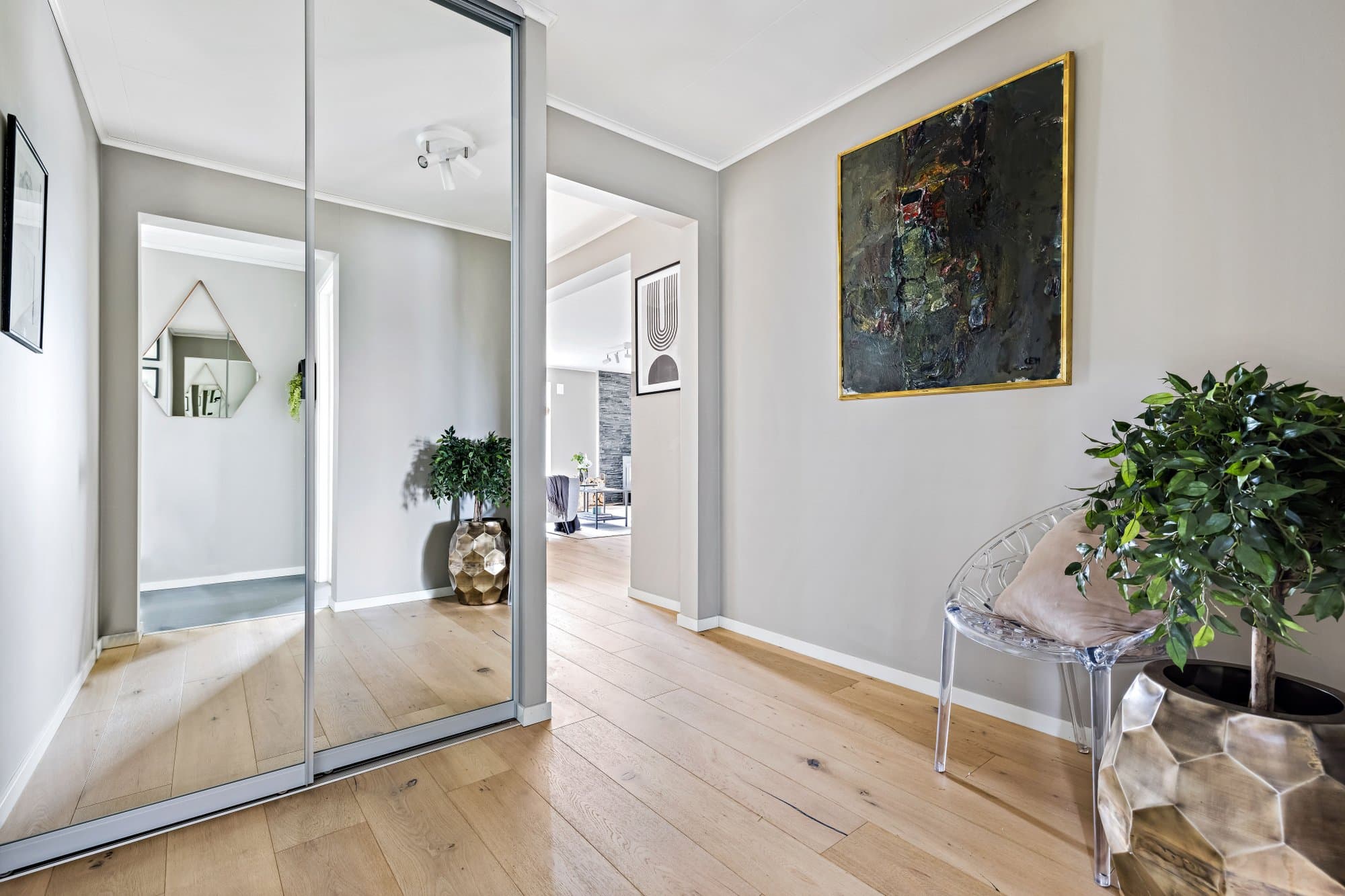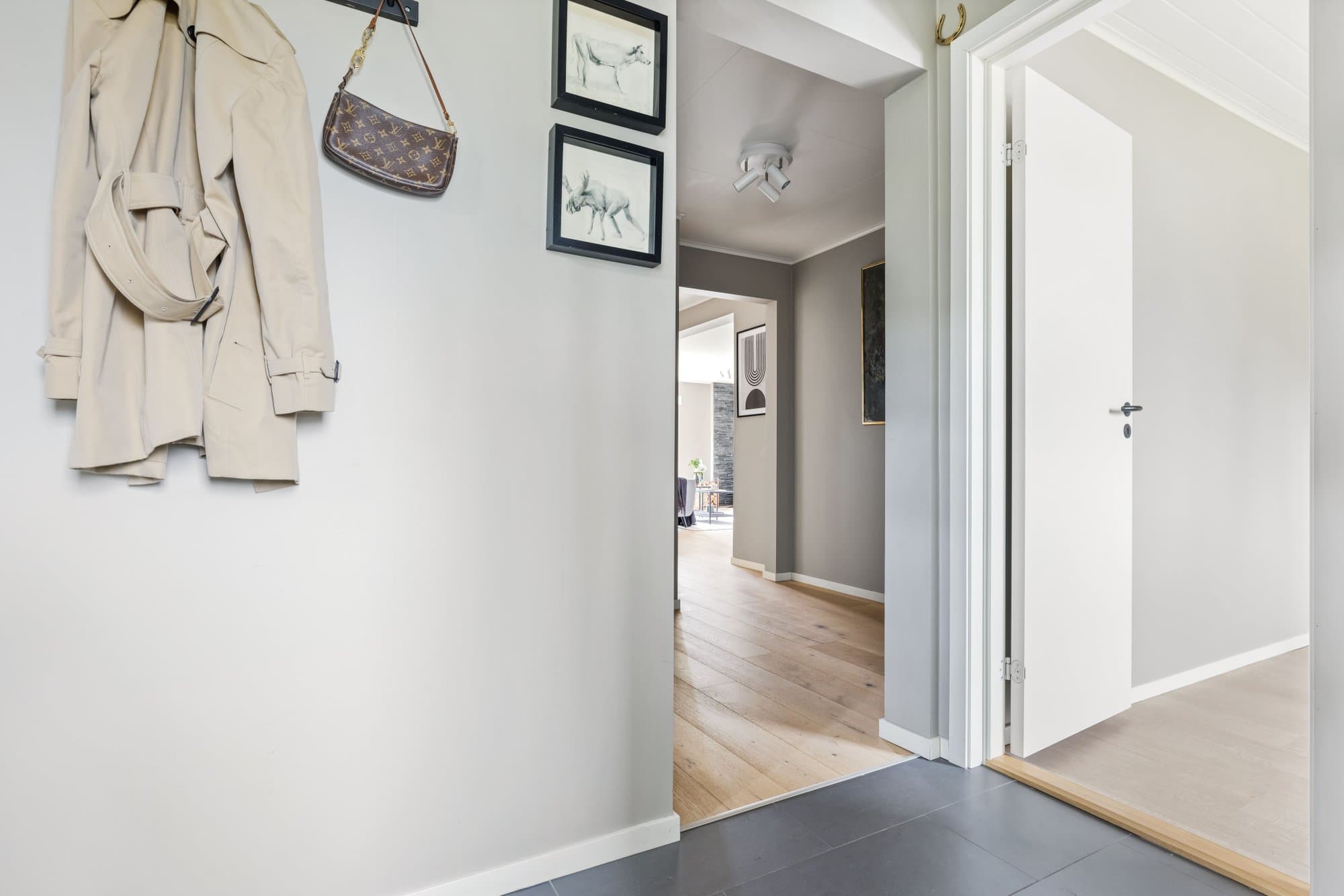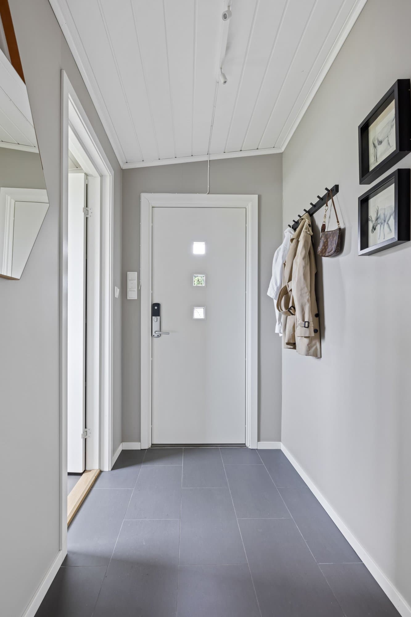 Boligen har adkomst via en koselig terrasse med ringeklokke og en overbygget ytterdør fra 2017. Entreen er innbydende med store gulvfliser og veggflater malt i en sober gråtone. Det er montert en knaggrekke i entreen, og tilliggende rommet finner man en hendig bod med opplegg for vaskemaskin. Entreen ligger i tilknytning til en flott hall med 1-stavs parkettgulv og gråmalte veggflater. I hallen er det en stor, plassbygget skyvedørsgarderobe med speilfronter, og om ønskelig er det god plass til ytterligere garderobeløsninger.