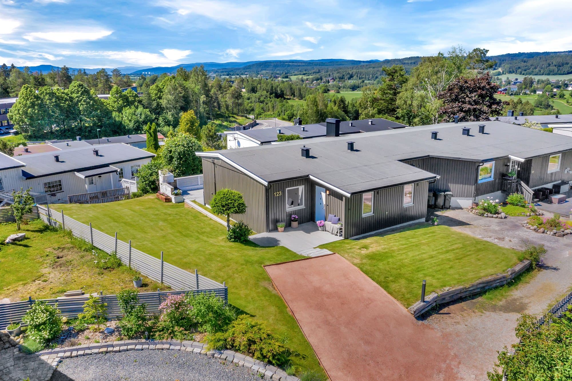Furutoppveien 123 er en lekker, familievennlig halvpart av en vertikaldelt tomannsbolig over ett plan. Rolig og barnevennlig boområde med nærhet til skole, barnehage. Kort vei til buss og tog. Boligen er totaloppusset i perioden 2018-21, og her får man et stilrent uttrykk med duse fargetoner. Området er rolig og barnevennlig, like ved skoler, barnehager og turveier i marka. Boligen ligger Sørvest-vendt til, og bedre solforhold får man ikke. Hagen byr på mye boltreplass, og utenfor stuen er det en herlig terrasse på ca. 30 kvm. Det er parkering i en garasje og gode parkeringsmuligheter på fellesparkeringsplass . Stuen er stilfull med peisovn og flott 1-stavs parkettgulv, mens kjøkkenet har moderne innredning, barløsning og integrerte hvitevarer. Videre er det et flott bad med gulvvarme og en bod med opplegg for vaskemaskin. Med hele fire soverom er det god plass til familier med flere barn.