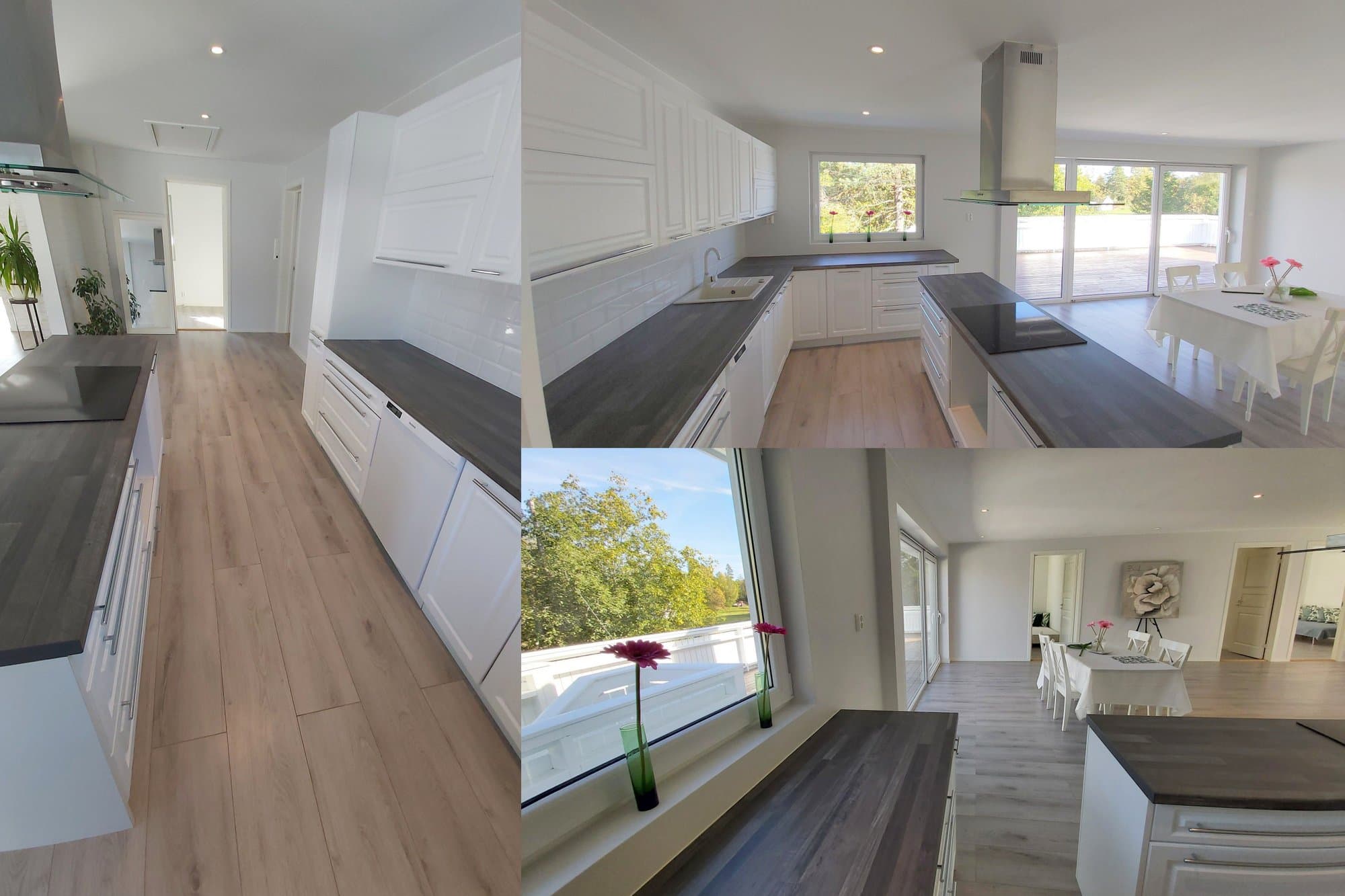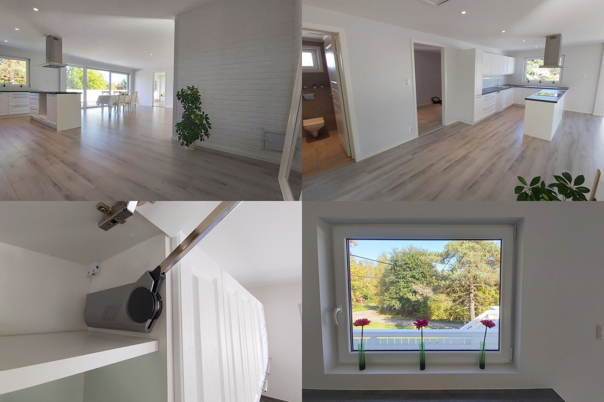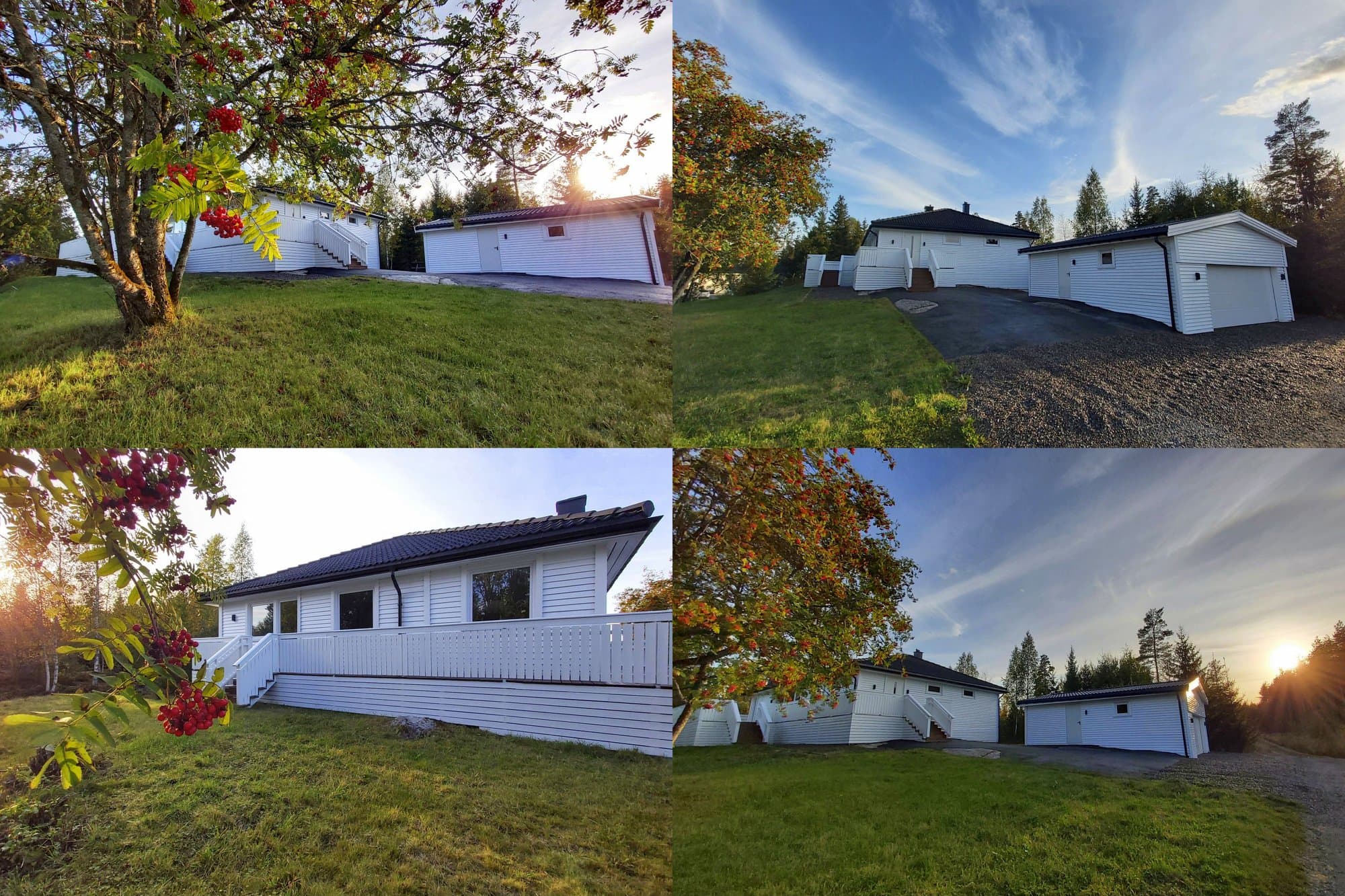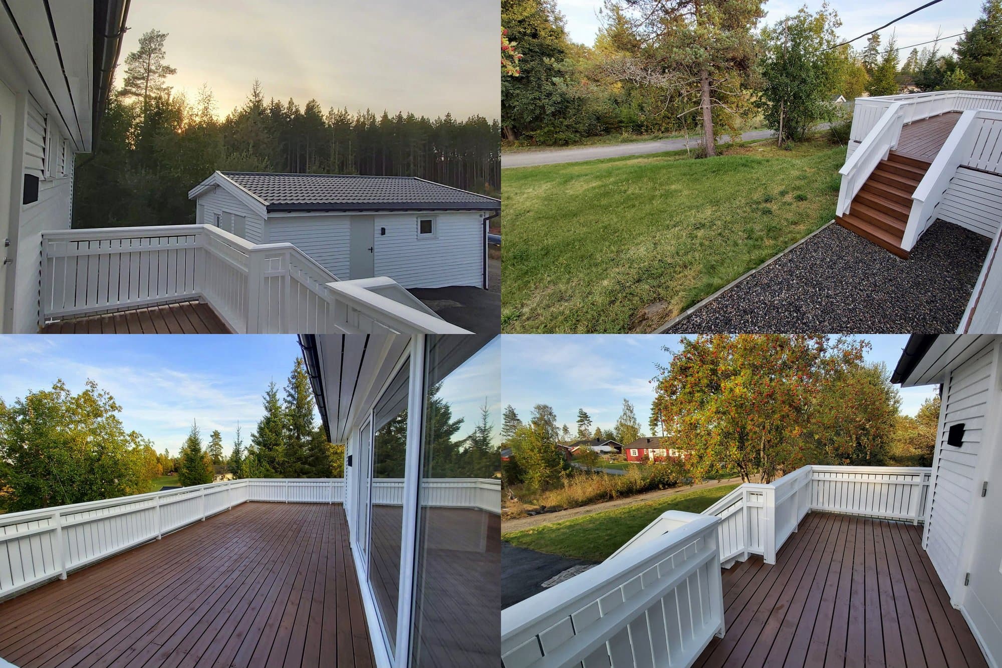 Hvis Du vil se dette fantastiske huset - Vennligst send meg en tekstmelding Tlf. 40585292 Huset ligger på en stor tomt på en høyde, hvorfra du kan se naboens hus litt lavere. Tomten er avgrenset av vakker skog og mange turområder. Sittende på terrassen kan du lukte den vakre duften av skogen, det er veldig stille her, men likevel nær asfaltveien og landsbyen hvor du kan handle. Huset er en renovert villa, med et fantastisk panorama, innglassede områder som slipper inn mye lys. Fra morgenen skinner solen på vinduene i rommene, og den forskyver seg videre og lyser opp stuen.Det er en hovedterrasse og to mindre rundt huset. Standarden på huset er GK plater og vaskbare flugger maling. 4 soverom lar familien din bo her. Moderne kjøkken med øy. Garasje for 2 biler, 3 celler for rullestol eller sykler. i kjelleren et treningsstudio, eller et rom for hobbyen din. I dette huset vil du bo komfortabelt og du vil ha nær kontakt med naturen. Garasje på ca. 35m2 og 3 boder på ca. 2,8m2, 5m2 og 6m2. bnr 41 Areal: 376,9 m² Arealkilde: Kartverket. Gnr 33: Bnr 35 Areal: 761 m² Arealkilde: Kartverket. Balkonger og terrasser: Terrasse med adkomst fra stuen på ca. 57m2 som strekker seg rundt nesten 3 vegger. Terrassen er belagt med impregnerte terrassebord og malt rekkverk. Rekkverkshøyden ble målt til ca. 100cm. ,