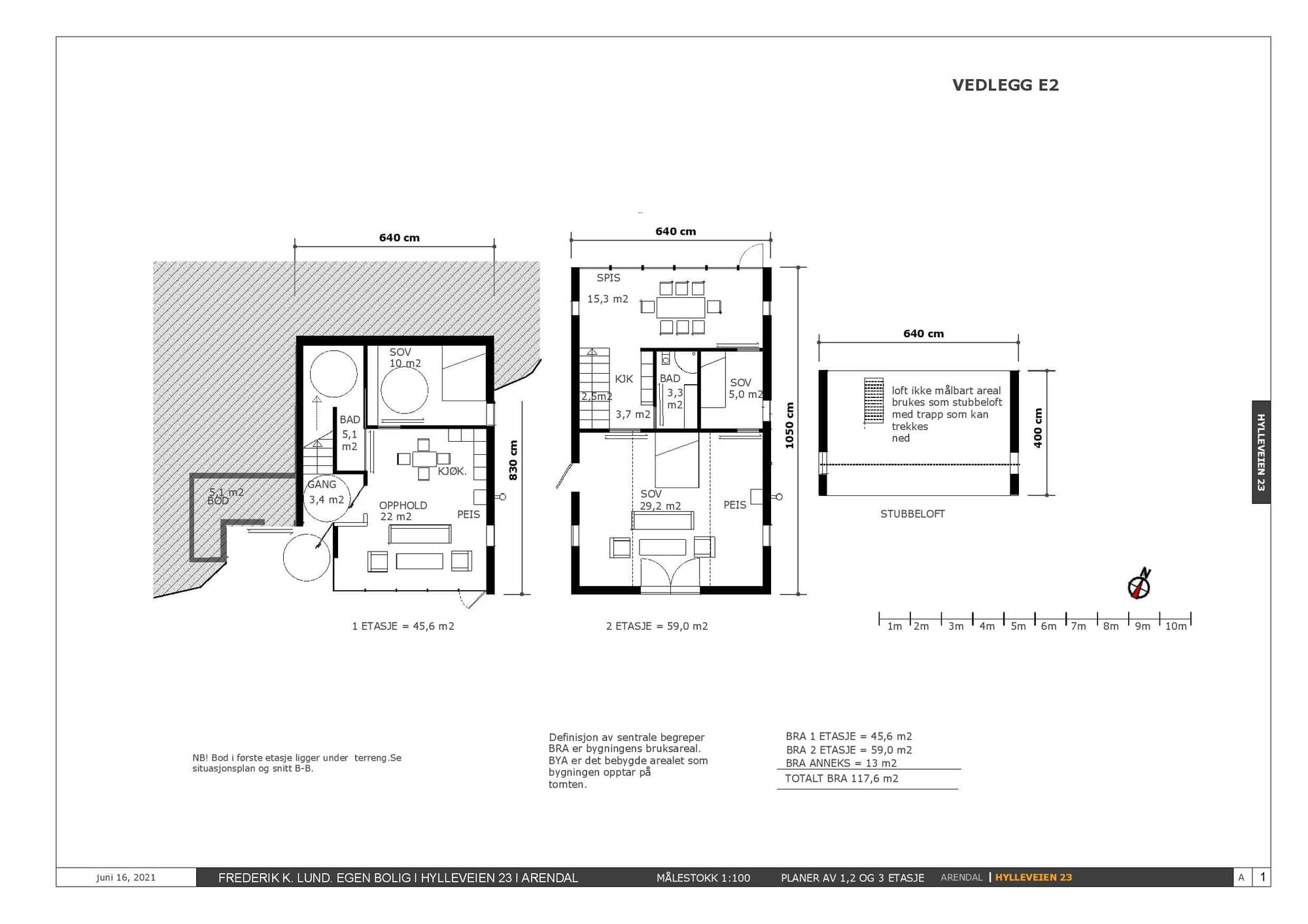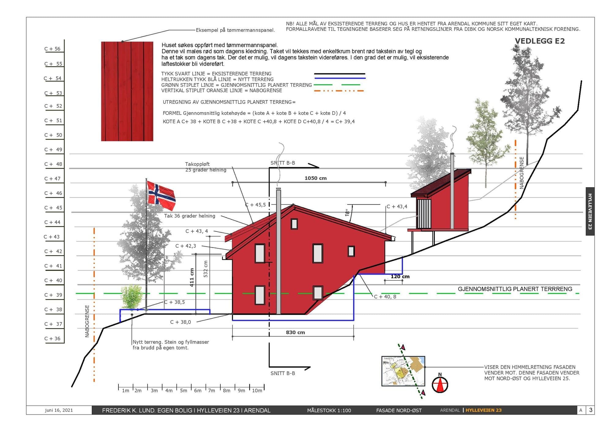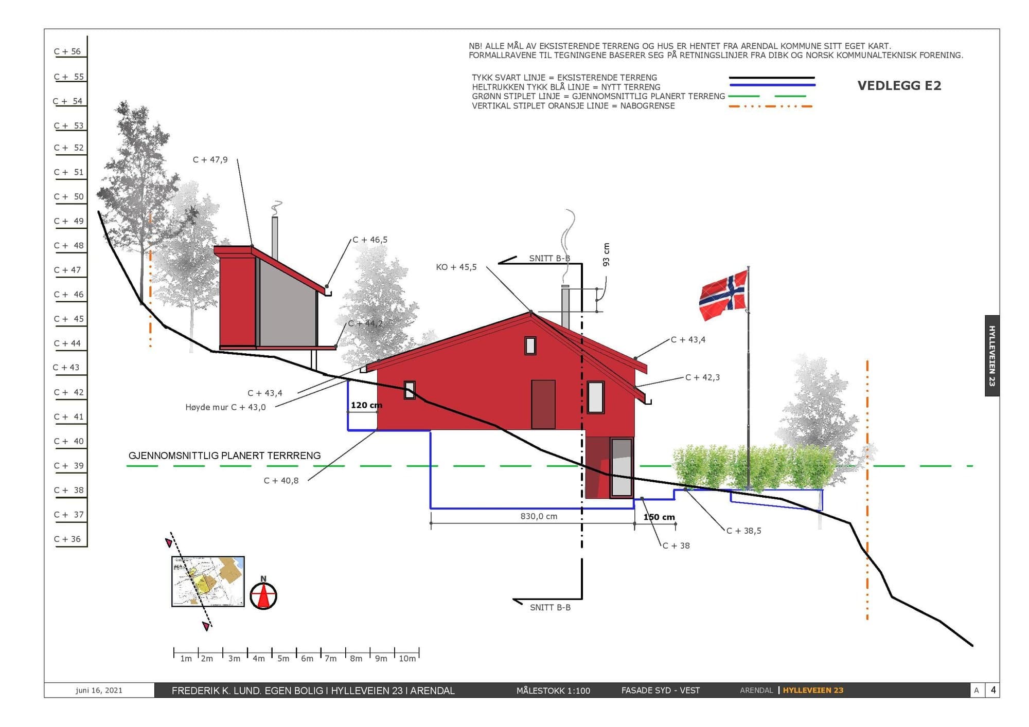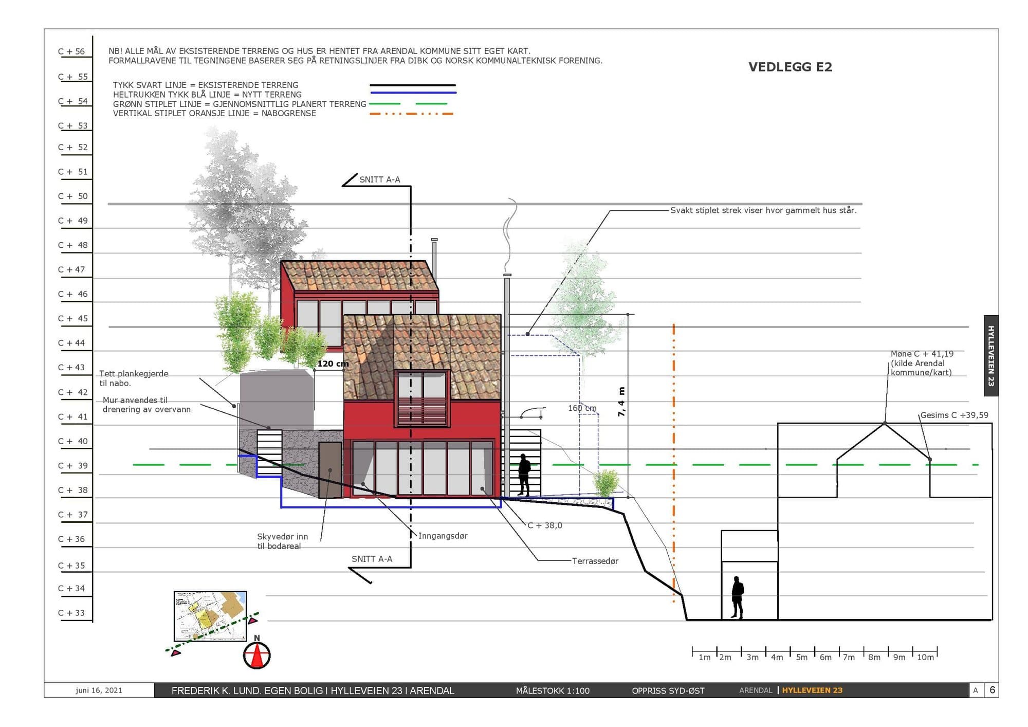 Visning avholdes 03.07.22. Eksisterende situasjon. Hylleveien 23 ligger sentralt, usjenert og vakkert til med storslagen utsikt over Arendal. På tomten står det i dag et kondemnabelt hus. Takstrapport fra 2013 (se vedlegg) beskriver dette huset og det mindre uthuset i bakkant som et rivningsobjekt Rammetillatelse. Arendal kommune har den 27.10.21 gitt tillatelse til en flott arkitekttegnet enebolig over to etasjer med utleiedel og anneks med et bruksareal på 117,6 m2. Den nye boligen er tegnet slik at hver etasje får en intim privatisert utesone og hagerael. I tillegg er det lagt til rette for et anneks på 15 m2 bebygd areal. Annekset ligger nærmest skjult inn i terrenget og er omgitt av en lun hage med nydelig utsikt. Boligen er tegnet med 3 soverom mens annekset har 1 soverom. Det er nydelig utsikt fra alle tre etasjer. I første etasje av av den prosjekterte boligen er det kjøkken, bad og oppholdsrom med direkte utgang til usjenert en hage uten mye innsyn. Denne etasjen er tegnet med peis. Denne utleiedelen er tegnet med eget inngangsparti via felles gang og kan derfor leies ut skattefritt om den som eier boligen bor i andre etasjen. Badet i første etasjen bør fint kunne benyttes av to personer. Ved hovedinngangen er det tilrettelagt for en egnet bodareal innfelt i terreng. Andre etasjen er boligens hovedetasje med fransk balkong fra soverommet og en arealeffektiv planløsning med et helt usjenert stue og kjøkkenareal. I soverommet er det tegnet inn peis. I tillegg er det i denne etasjen tilrettelagt for et mindre soverom. Annekset er tegnet med et soverom og et oppholdsrom med peis og utsikt fra trapp som er tegnet inn. Hage og utearealer av tegnet bolig. Hage og utearealer er tegnet slik at det muliggjør intime usjenerte rom på hver flate. I første etasjen er det tilrettelagt for et større hageareal mens det for annen etasje og annekset er muliggjort tilsvarende arealer. Kledning er tegnet med tradisjonelt tømmermannspanel og en taktekking av tradisjonell uglassert rød teglstein.
