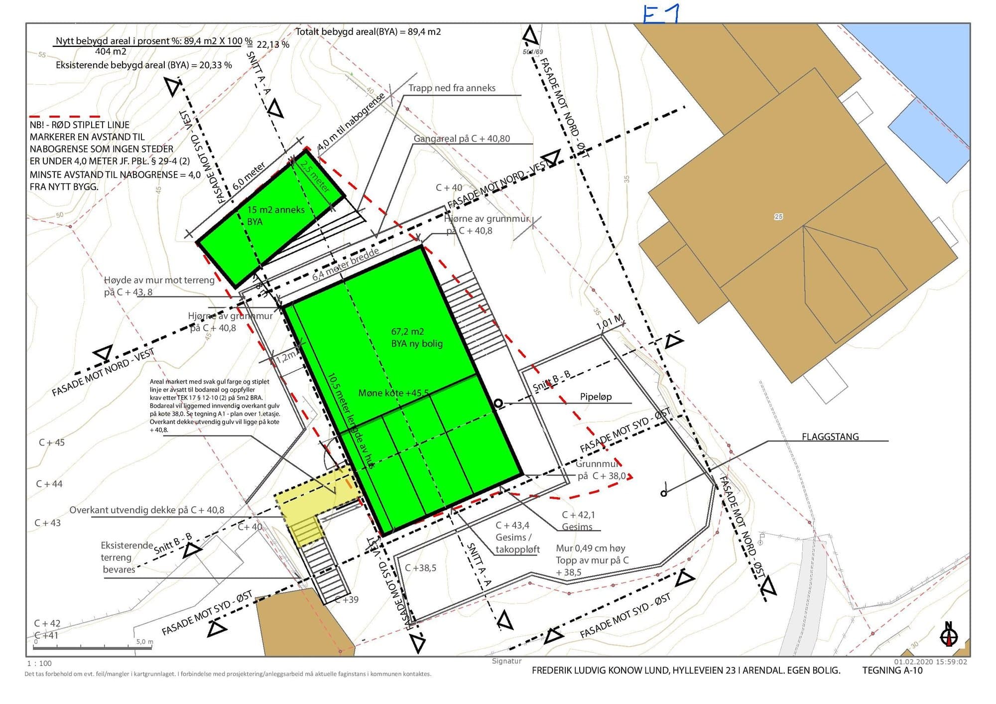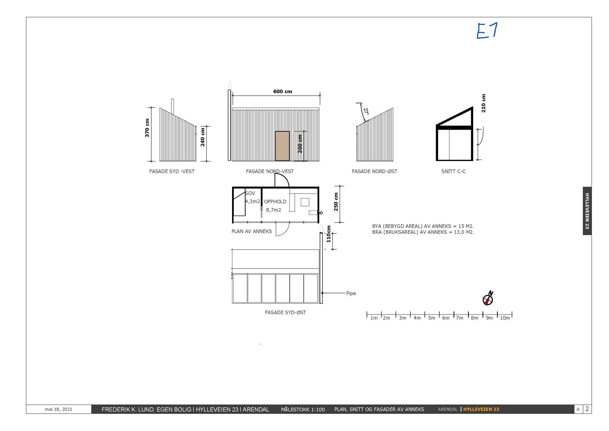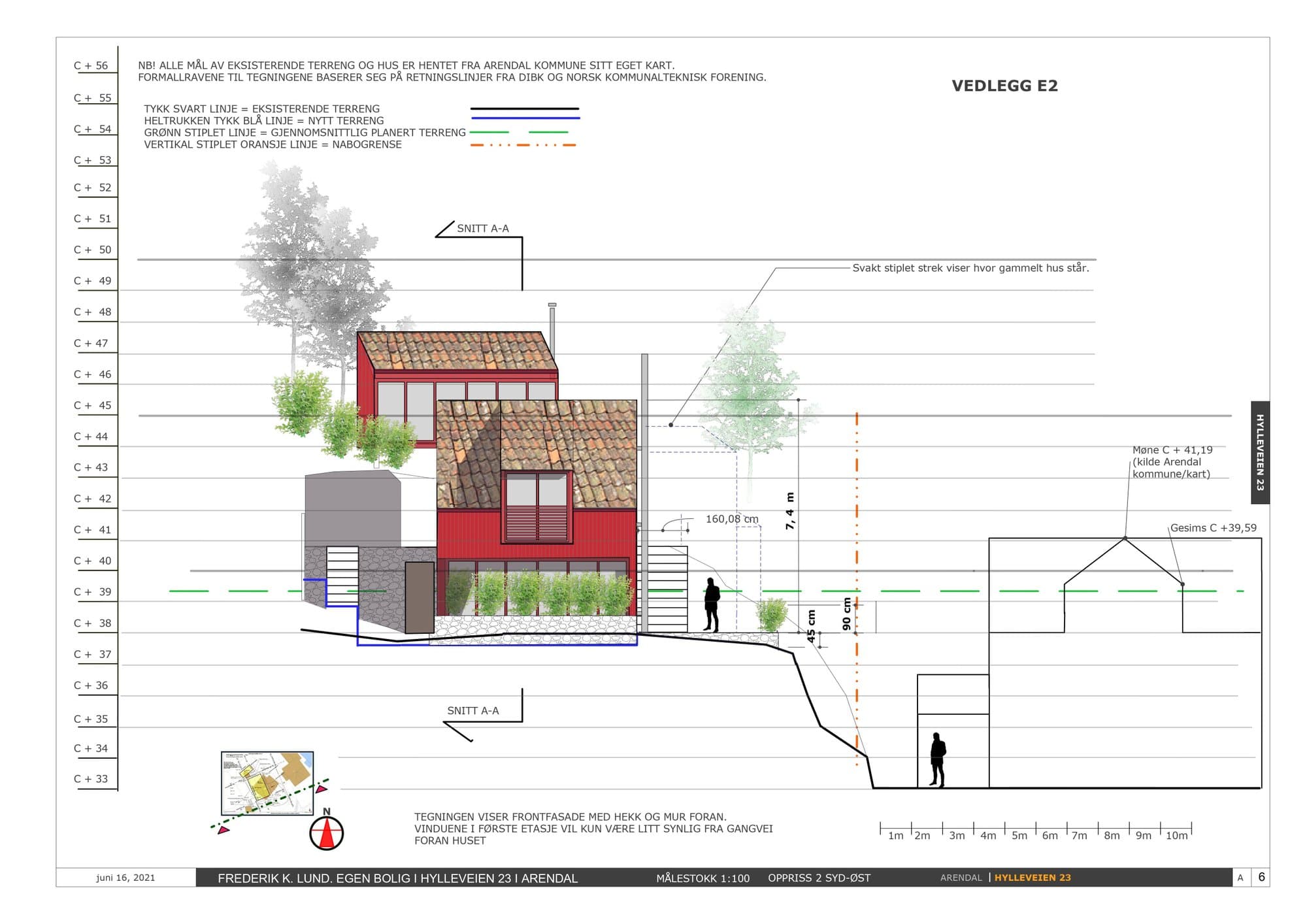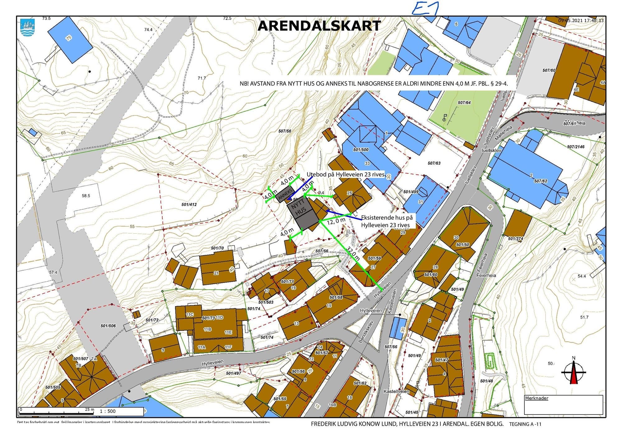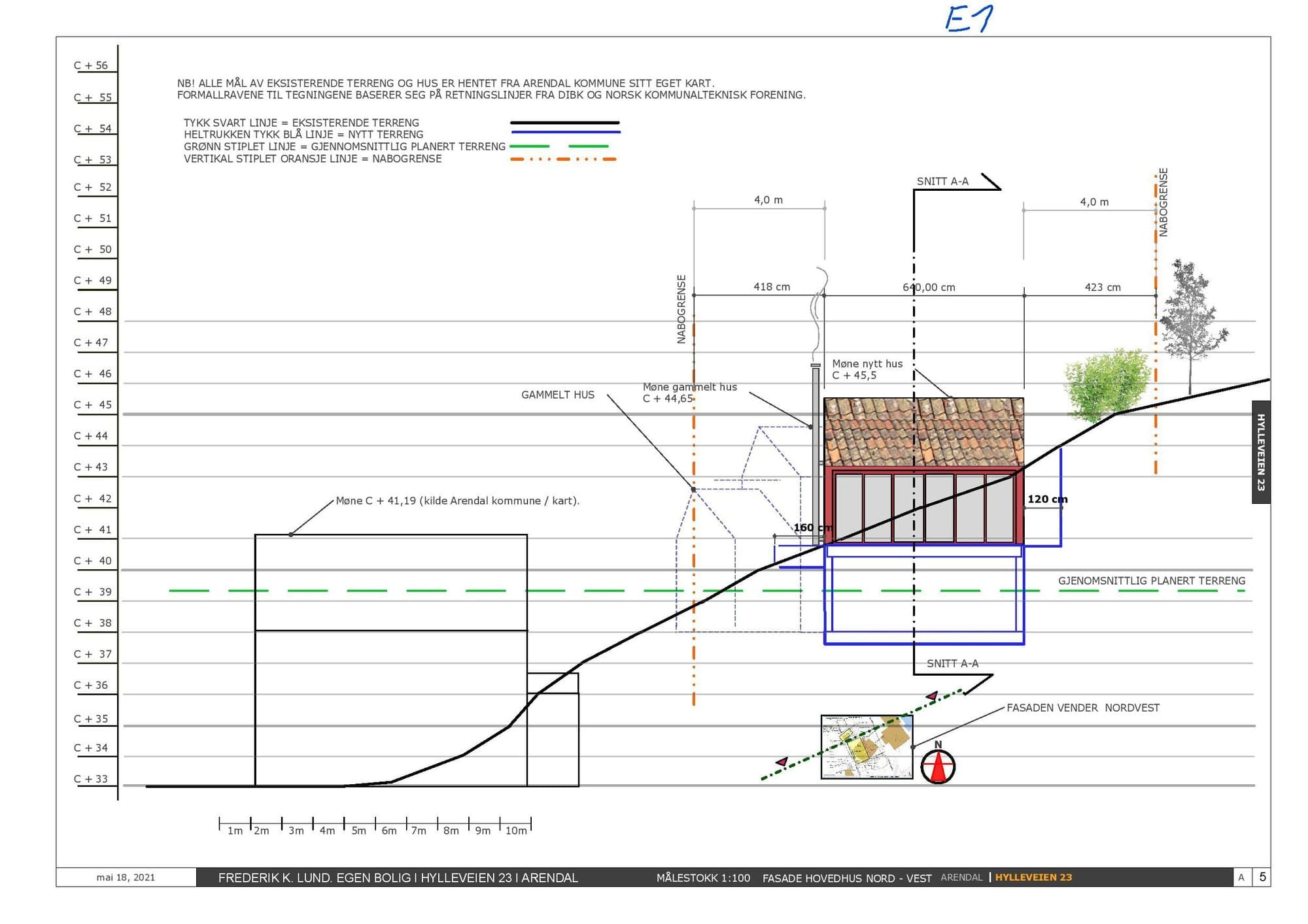 Visning avholdes 03.07.22. Eksisterende situasjon. Hylleveien 23 ligger sentralt, usjenert og vakkert til med storslagen utsikt over Arendal. På tomten står det i dag et kondemnabelt hus. Takstrapport fra 2013 (se vedlegg) beskriver dette huset og det mindre uthuset i bakkant som et rivningsobjekt Rammetillatelse. Arendal kommune har den 27.10.21 gitt tillatelse til en flott arkitekttegnet enebolig over to etasjer med utleiedel og anneks med et bruksareal på 117,6 m2. Den nye boligen er tegnet slik at hver etasje får en intim privatisert utesone og hagerael. I tillegg er det lagt til rette for et anneks på 15 m2 bebygd areal. Annekset ligger nærmest skjult inn i terrenget og er omgitt av en lun hage med nydelig utsikt. Boligen er tegnet med 3 soverom mens annekset har 1 soverom. Det er nydelig utsikt fra alle tre etasjer. I første etasje av av den prosjekterte boligen er det kjøkken, bad og oppholdsrom med direkte utgang til usjenert en hage uten mye innsyn. Denne etasjen er tegnet med peis. Denne utleiedelen er tegnet med eget inngangsparti via felles gang og kan derfor leies ut skattefritt om den som eier boligen bor i andre etasjen. Badet i første etasjen bør fint kunne benyttes av to personer. Ved hovedinngangen er det tilrettelagt for en egnet bodareal innfelt i terreng. Andre etasjen er boligens hovedetasje med fransk balkong fra soverommet og en arealeffektiv planløsning med et helt usjenert stue og kjøkkenareal. I soverommet er det tegnet inn peis. I tillegg er det i denne etasjen tilrettelagt for et mindre soverom. Annekset er tegnet med et soverom og et oppholdsrom med peis og utsikt fra trapp som er tegnet inn. Hage og utearealer av tegnet bolig. Hage og utearealer er tegnet slik at det muliggjør intime usjenerte rom på hver flate. I første etasjen er det tilrettelagt for et større hageareal mens det for annen etasje og annekset er muliggjort tilsvarende arealer. Kledning er tegnet med tradisjonelt tømmermannspanel og en taktekking av tradisjonell uglassert rød teglstein.