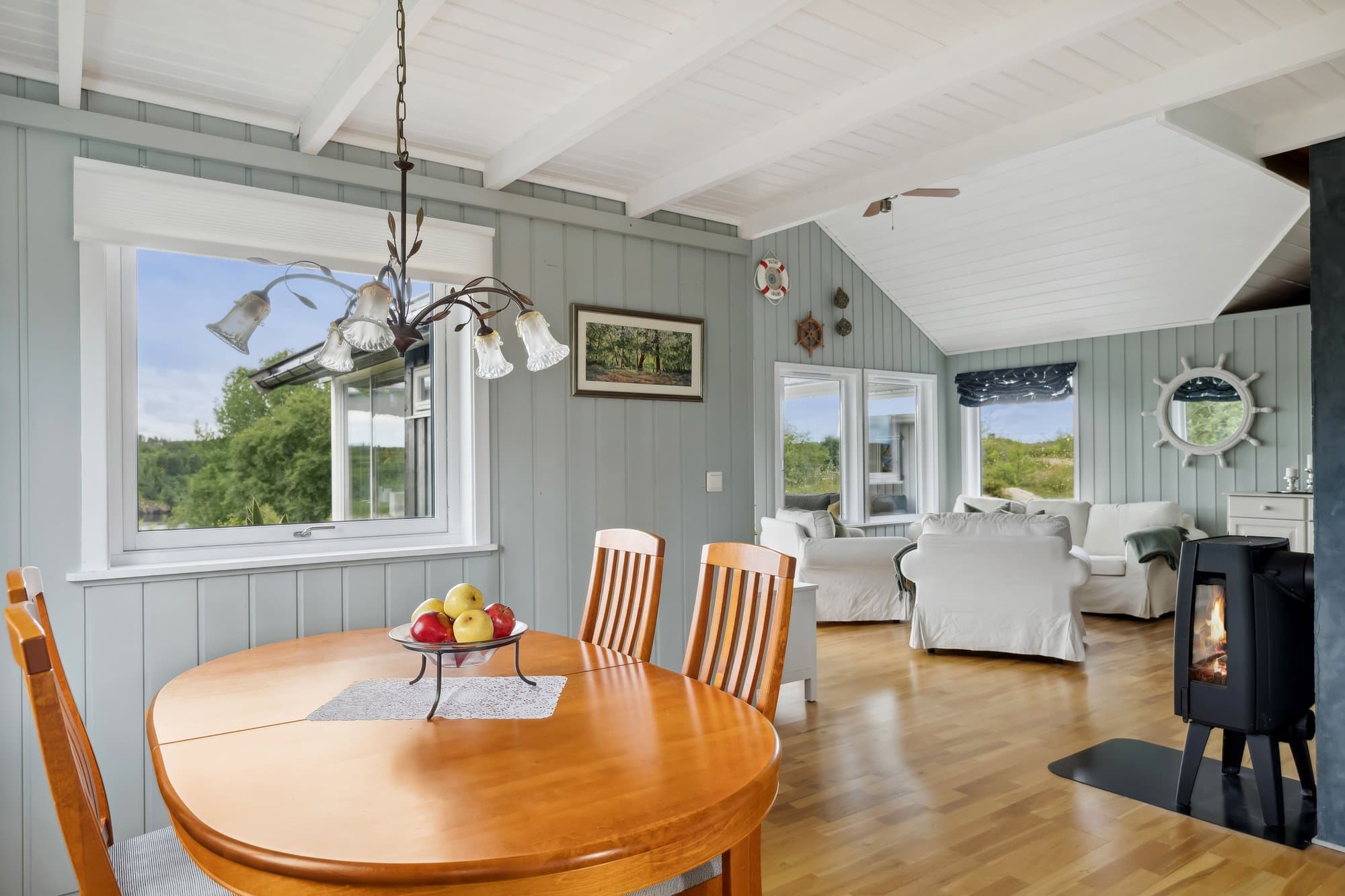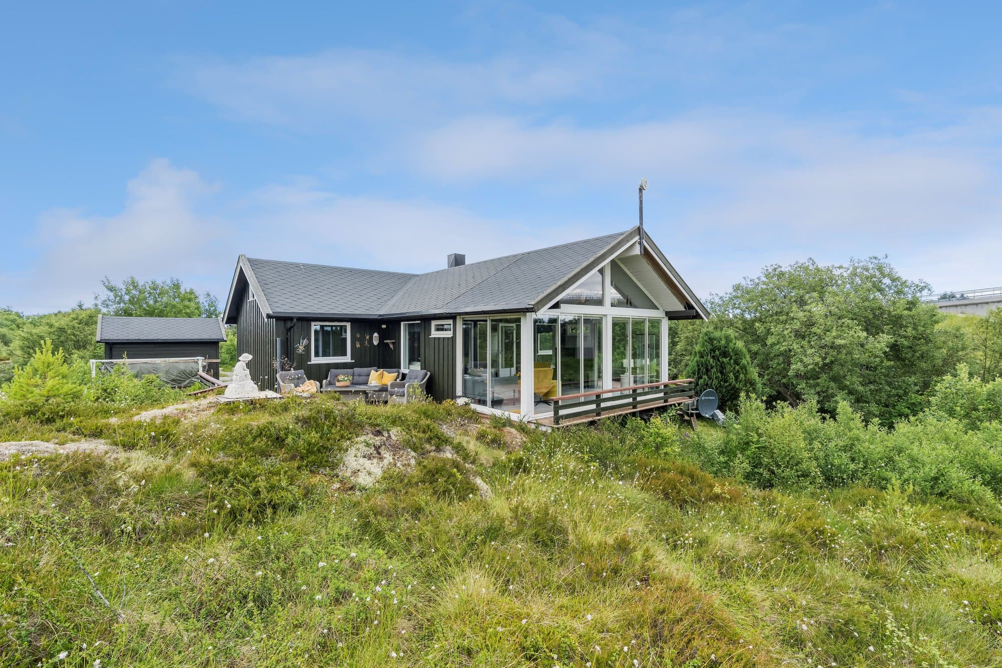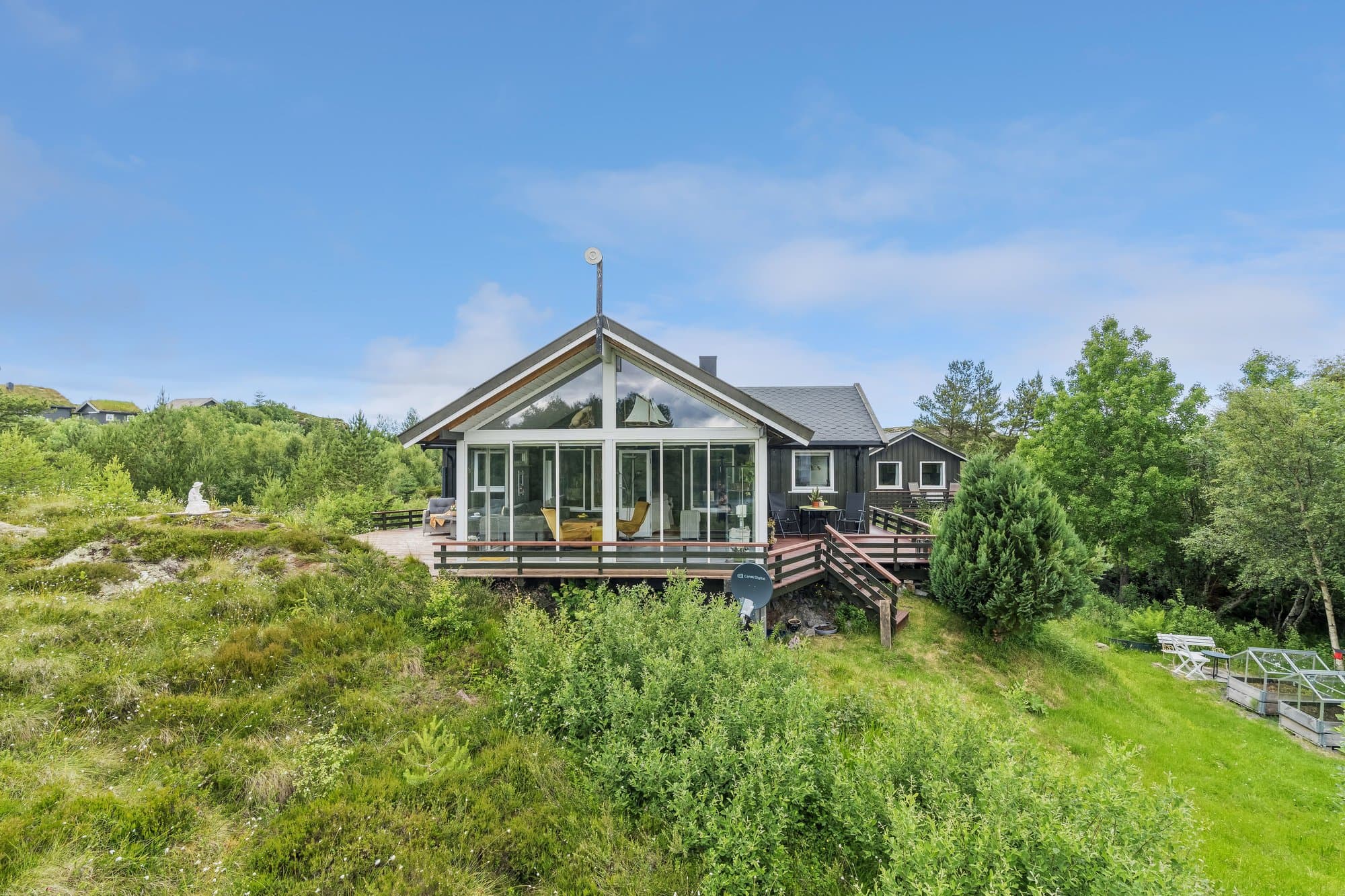 Hytta har WiFi, el-billader, mulighet for leie av båtplass. Hytta har 4-rom inklusive glasshuset. Glasshuset ble bygget i 2020 . Hytta ble malt opp i 2021, god standard, og består av: Vindfang med glass skyve garderobe, wc, bad/vaskerom 4,3 m2, entre, stue/kjøkken 36,2 m2 og 3 soverom. Hoved soverom har glass skyve garderobe. Originale gulv med parkett, vindfang, bad og toalett har vinyl. Det er malte panel.vegger i alle rom, unntatt bad, hvor vegger har malt glassfiberstrie og dusjhjørne har vinyl.. God takhøyde og delvis store vinduer. Det er terrasser rundt hele hytta. Glasshuset er 18 m2 og alle dører kan åpnes ut mot terrasser. Det er en hems over deler av hytta. Det er galleri ved hemsen. Hytta ligger i Dolmsundet hytte- og båtforening, et hyttefelt med hyggelig nabolag (kontigent kr 1.500/år). Denne hytta ligger usjenert, men har god nærhet til Dolmsundet. Det er kort vei til kollektivtransport, matbutikker, kafeer og annet. Det er en stor gårdsplass og plass til mange biler. Det er parabol og WiFi på hytta/anneks. Det er lagt inn 3-fas strøm og el-billader på hytta På tomta er en bod for ved, verktøy og annet som trengs oppbevaring. Det er et Anneks på 22 m2 som har vært utleid. Annekset inneholder bod, vindfang, bad/wc, soverom og kjøkken/stue. Det er 2 gode terrasser på annekset.
