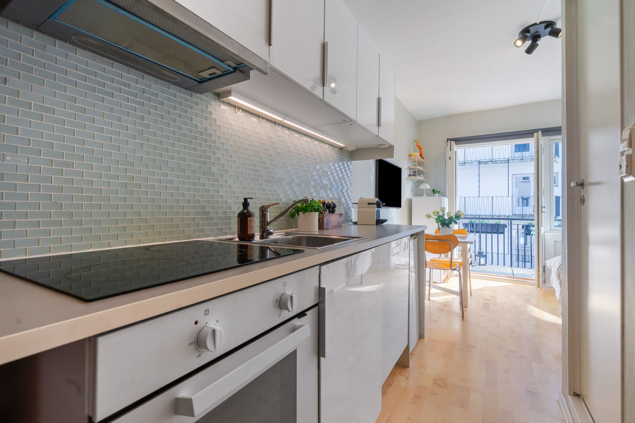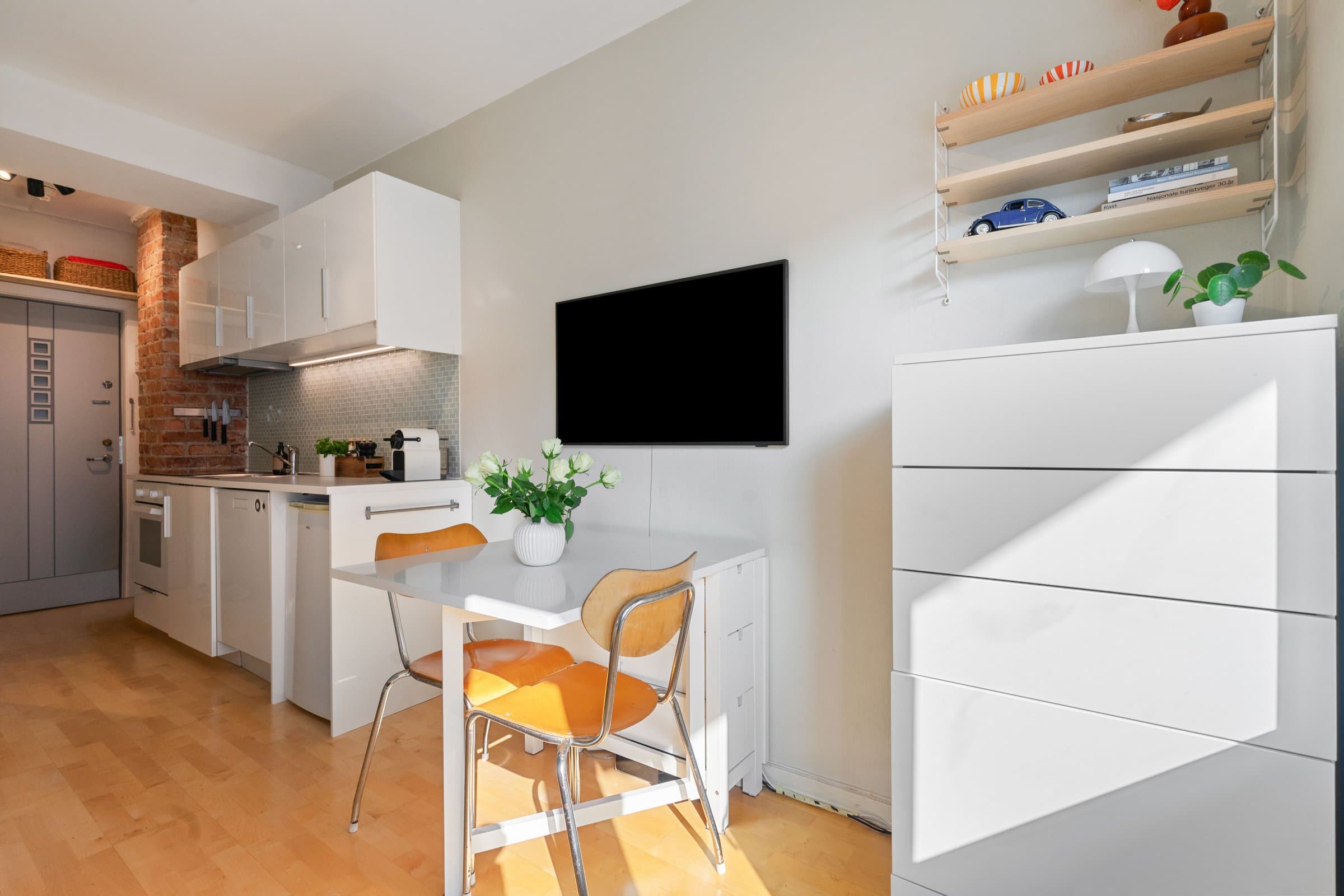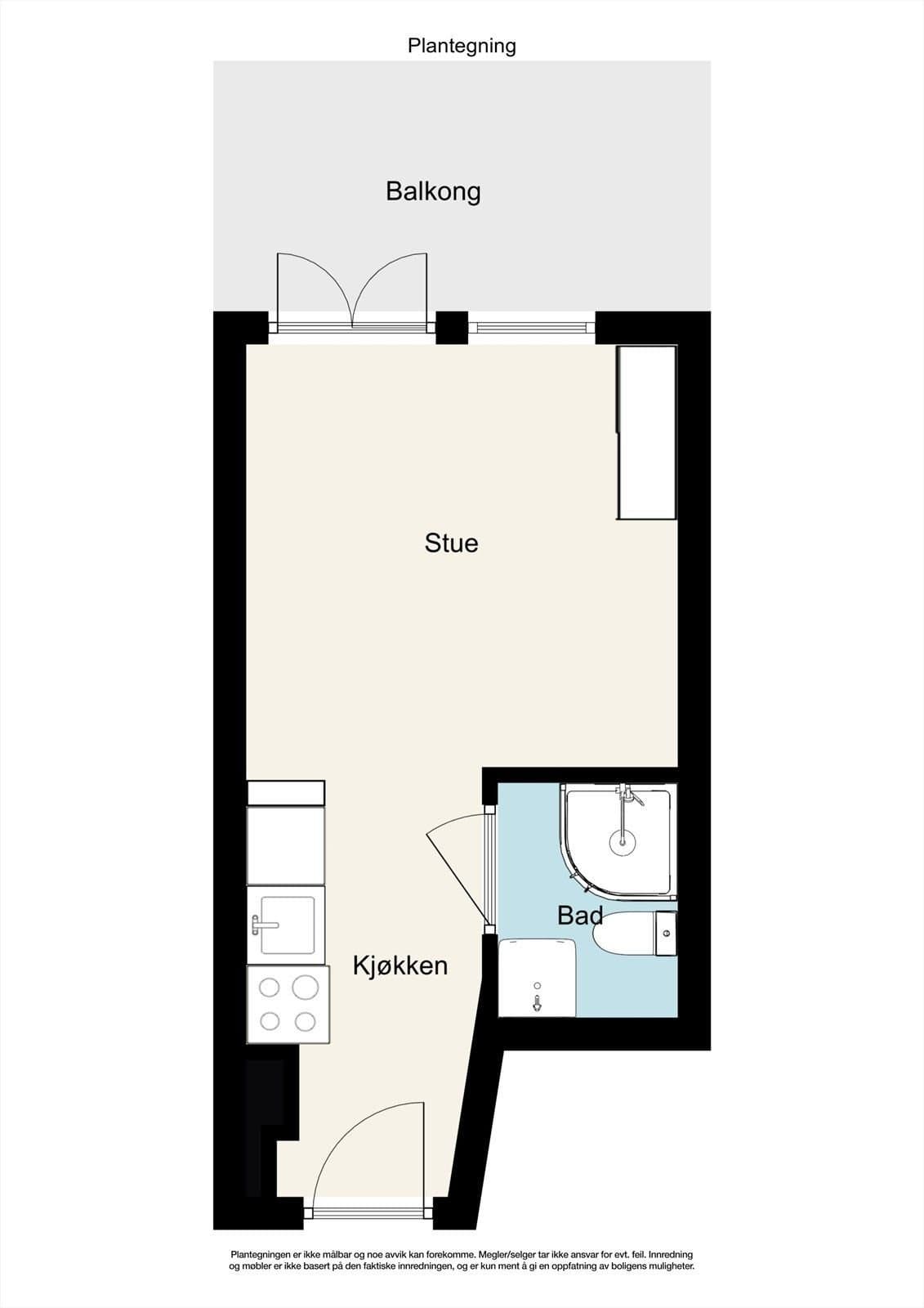 Innhold: Leiligheten ligger i 3.etasje og inneholder: Gang, bad/wc og kjøkken/stue med utgang til balkong. Balkong på 3,6m². Leiligheten disponerer 2 kjellerboder på 3,5m² og 5,5m². Entre | Velkommen inn Leiligheten har inngangsdør fra felles oppgang. Entreen gir et godt førsteinntrykk med malte flater, teglsteinsvegg og oppheng til yttertøy. Dørcalling. Stue | Her har du plass til seng/sovesofa, tv-møblement mm. Stuen oppleves som lys og luftig med naturlig lys fra stort vindu og god takhøyde (målt til 2,57m). Fra stuen er det direkte utgang til en balkong på 3,6m² som kan benyttes som en forlengelse av rommet på sommerstid. Det er sol på balkongen fra ca kl.09-20 om sommeren. Kjøkken | Nytt i 2015 Åpen kjøkkenløsning. Pent og praktisk kjøkken med god oppbevaringsplass i over- og underskap. Kjøkkenet er nytt fra 2015 og innredet med hvite høyglansede fronter, glassmosaikk mellom kjøkkenbenken og overskap. Belysning under overskap. Hvitevarene består av keramisk koketopp, stekeovn, kjøleskap og oppvaskmaskin. Ventilator over kokesone. Bad | Flislagt baderom med varmekabler og belysning. Badet anslås å være fra år 2000. Badet er innredet med toalett, servant, overskap med speilfronter og belysning/speil med overlys. Det ble i 2020 byttet dusjgarnityr og satt inn nytt baderomsskap. Bod | Ekstra oppbevaring Leiligheten disponerer to kjellerboder på ca. 3,5 m² og 5,5 m². Overflater på innvendig gulv: Parkett (2015). Fliser på baderom. Overflater på innvendige vegger: Malte flater (2020). Fliser på baderom. Overflater på innvendig himling: Sparklet og malt betong/mur (2020). Oppvarming: varmekabler på bad/wc. Luftbehandling: Ventilasjon med naturlig avtrekk. Naturlig ventilasjon på bad.
