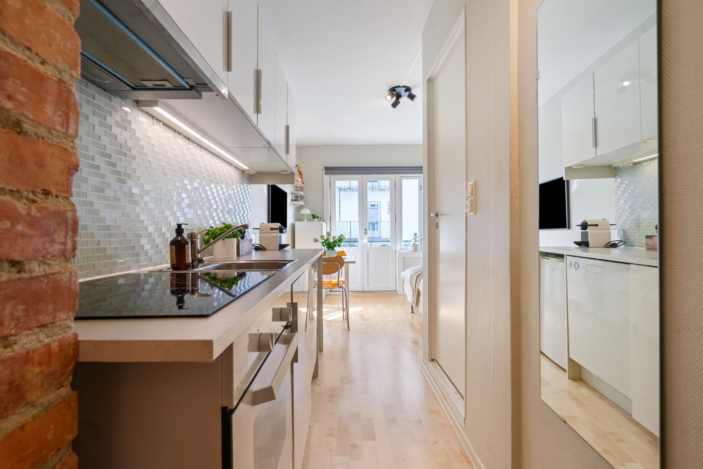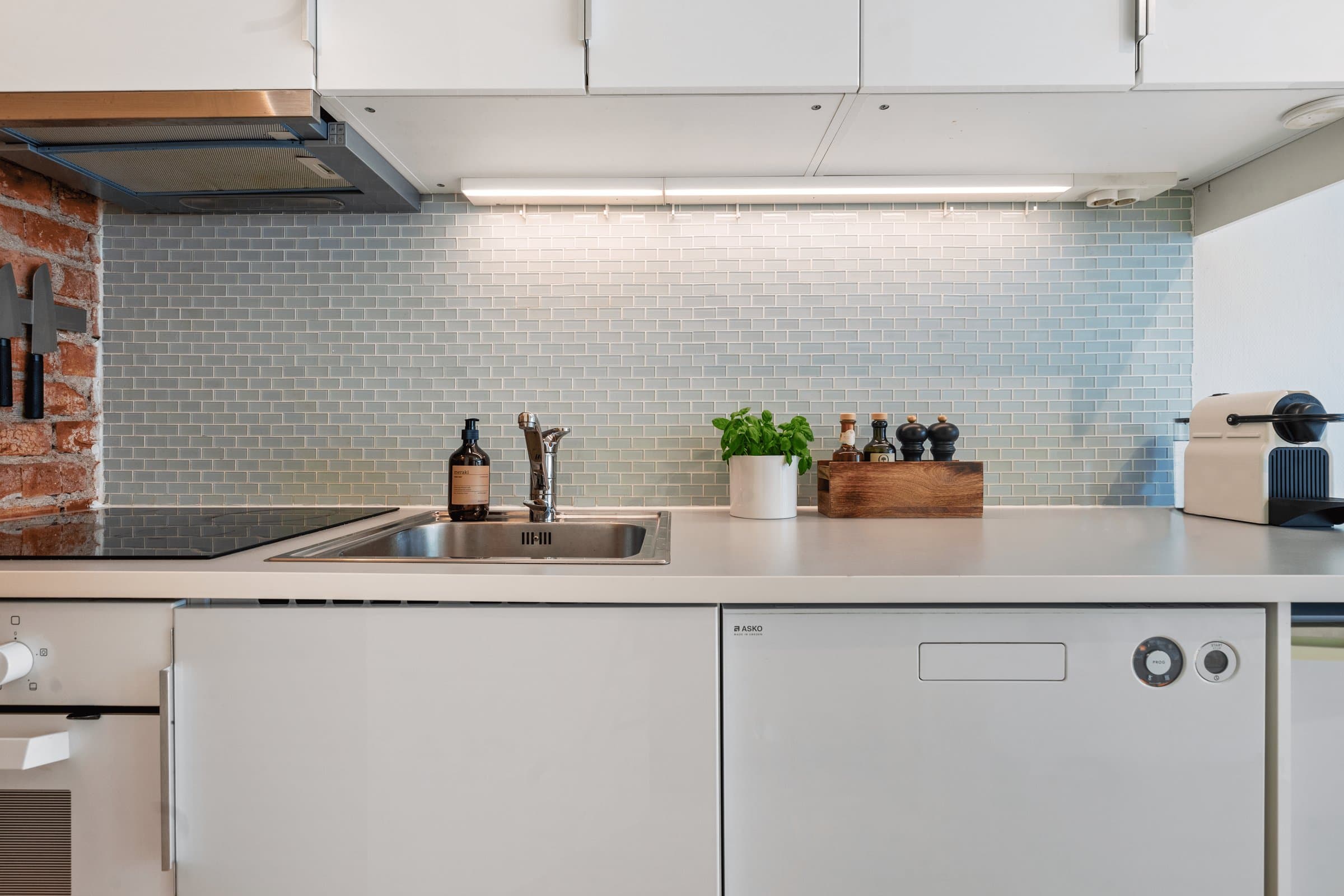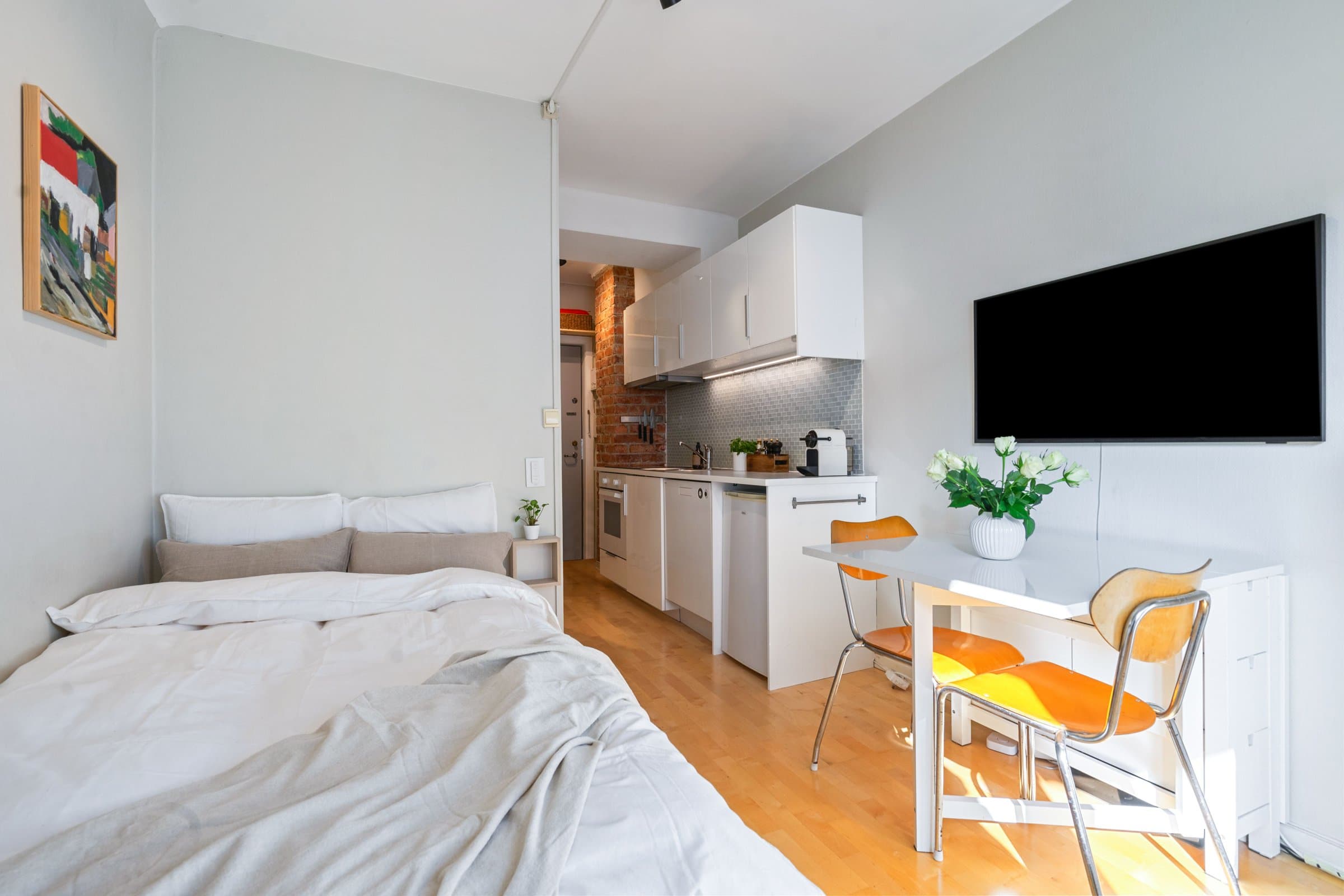 Innhold: Leiligheten ligger i 3.etasje og inneholder: Gang, bad/wc og kjøkken/stue med utgang til balkong. Balkong på 3,6m². Leiligheten disponerer 2 kjellerboder på 3,5m² og 5,5m². Entre | Velkommen inn Leiligheten har inngangsdør fra felles oppgang. Entreen gir et godt førsteinntrykk med malte flater, teglsteinsvegg og oppheng til yttertøy. Dørcalling. Stue | Her har du plass til seng/sovesofa, tv-møblement mm. Stuen oppleves som lys og luftig med naturlig lys fra stort vindu og god takhøyde (målt til 2,57m). Fra stuen er det direkte utgang til en balkong på 3,6m² som kan benyttes som en forlengelse av rommet på sommerstid. Det er sol på balkongen fra ca kl.09-20 om sommeren. Kjøkken | Nytt i 2015 Åpen kjøkkenløsning. Pent og praktisk kjøkken med god oppbevaringsplass i over- og underskap. Kjøkkenet er nytt fra 2015 og innredet med hvite høyglansede fronter, glassmosaikk mellom kjøkkenbenken og overskap. Belysning under overskap. Hvitevarene består av keramisk koketopp, stekeovn, kjøleskap og oppvaskmaskin. Ventilator over kokesone. Bad | Flislagt baderom med varmekabler og belysning. Badet anslås å være fra år 2000. Badet er innredet med toalett, servant, overskap med speilfronter og belysning/speil med overlys. Det ble i 2020 byttet dusjgarnityr og satt inn nytt baderomsskap. Bod | Ekstra oppbevaring Leiligheten disponerer to kjellerboder på ca. 3,5 m² og 5,5 m². Overflater på innvendig gulv: Parkett (2015). Fliser på baderom. Overflater på innvendige vegger: Malte flater (2020). Fliser på baderom. Overflater på innvendig himling: Sparklet og malt betong/mur (2020). Oppvarming: varmekabler på bad/wc. Luftbehandling: Ventilasjon med naturlig avtrekk. Naturlig ventilasjon på bad.