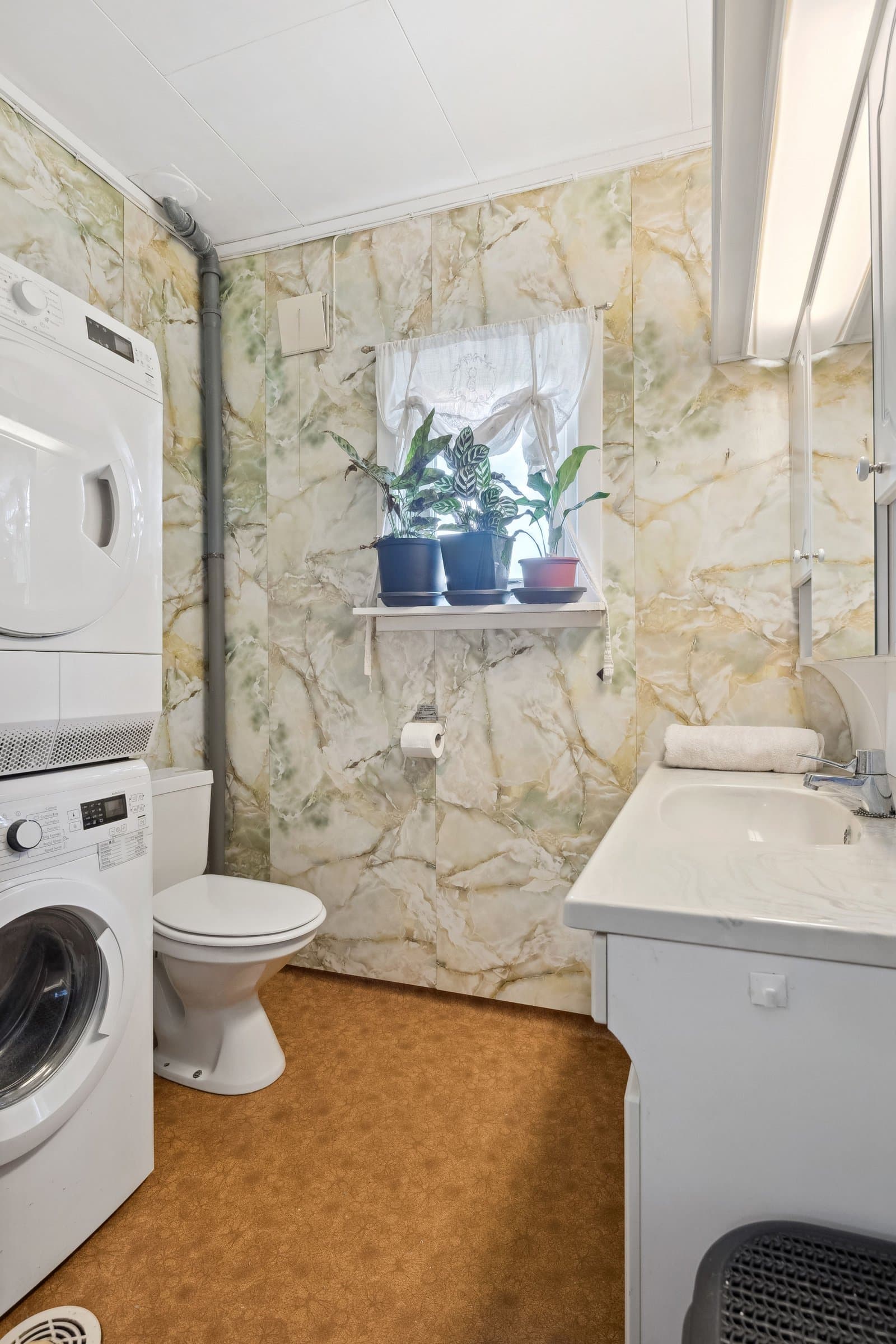 Henviser til plantegning og bilde at det er et lite bad med dusjkabinett, toalett , vask med god benkeplass og godt med skap , samt speilskap . Plass til vaskemaskin