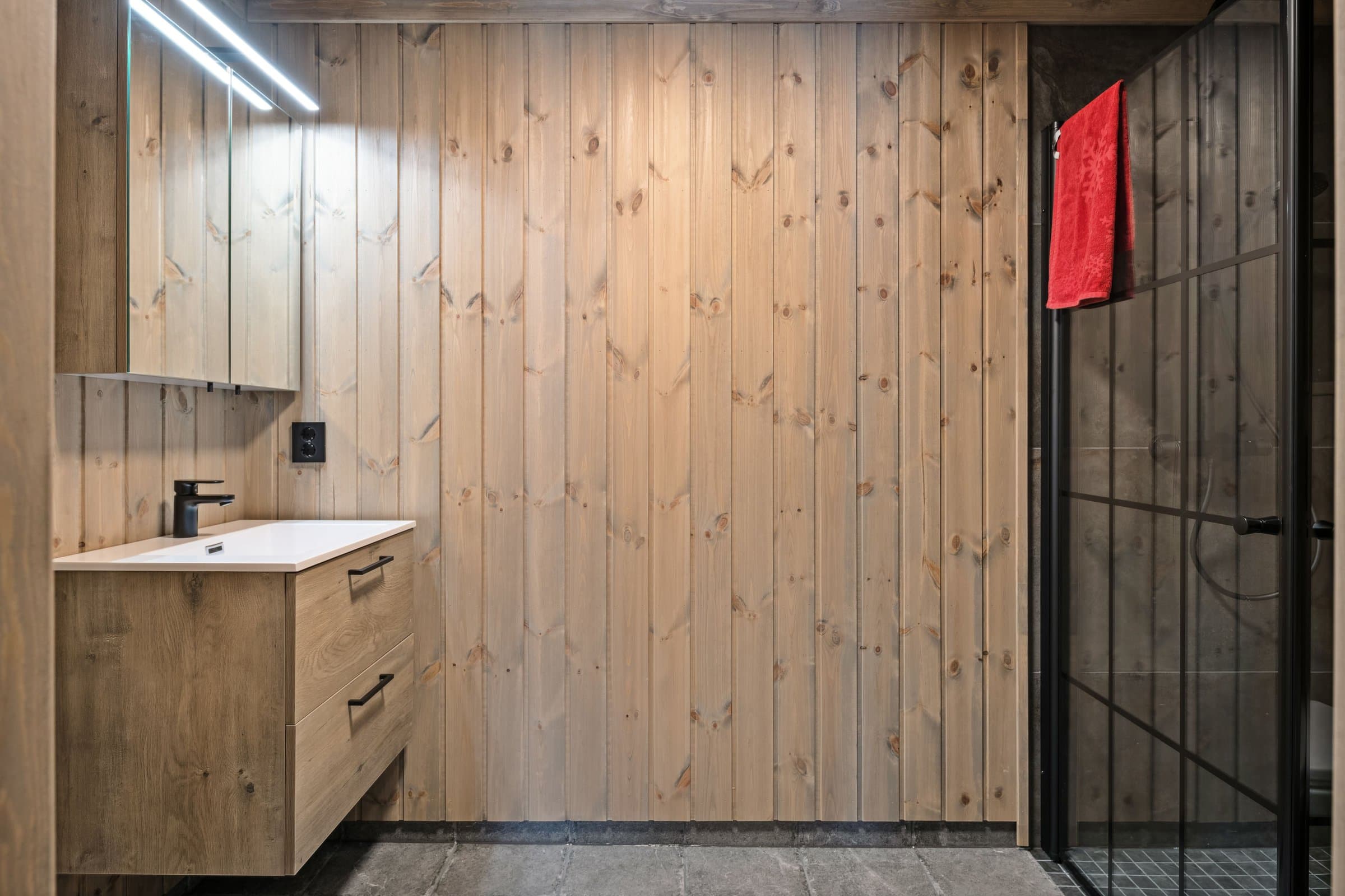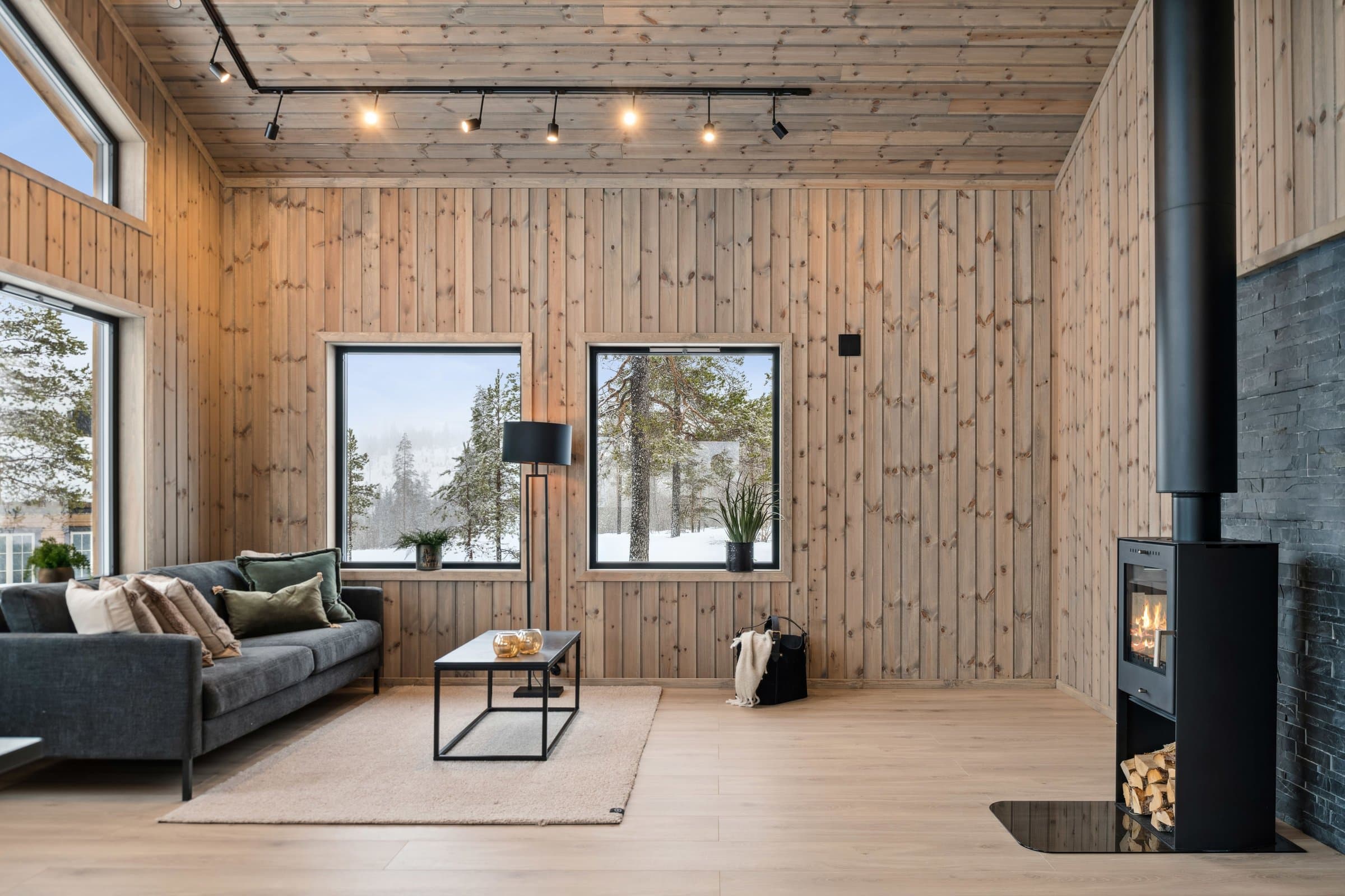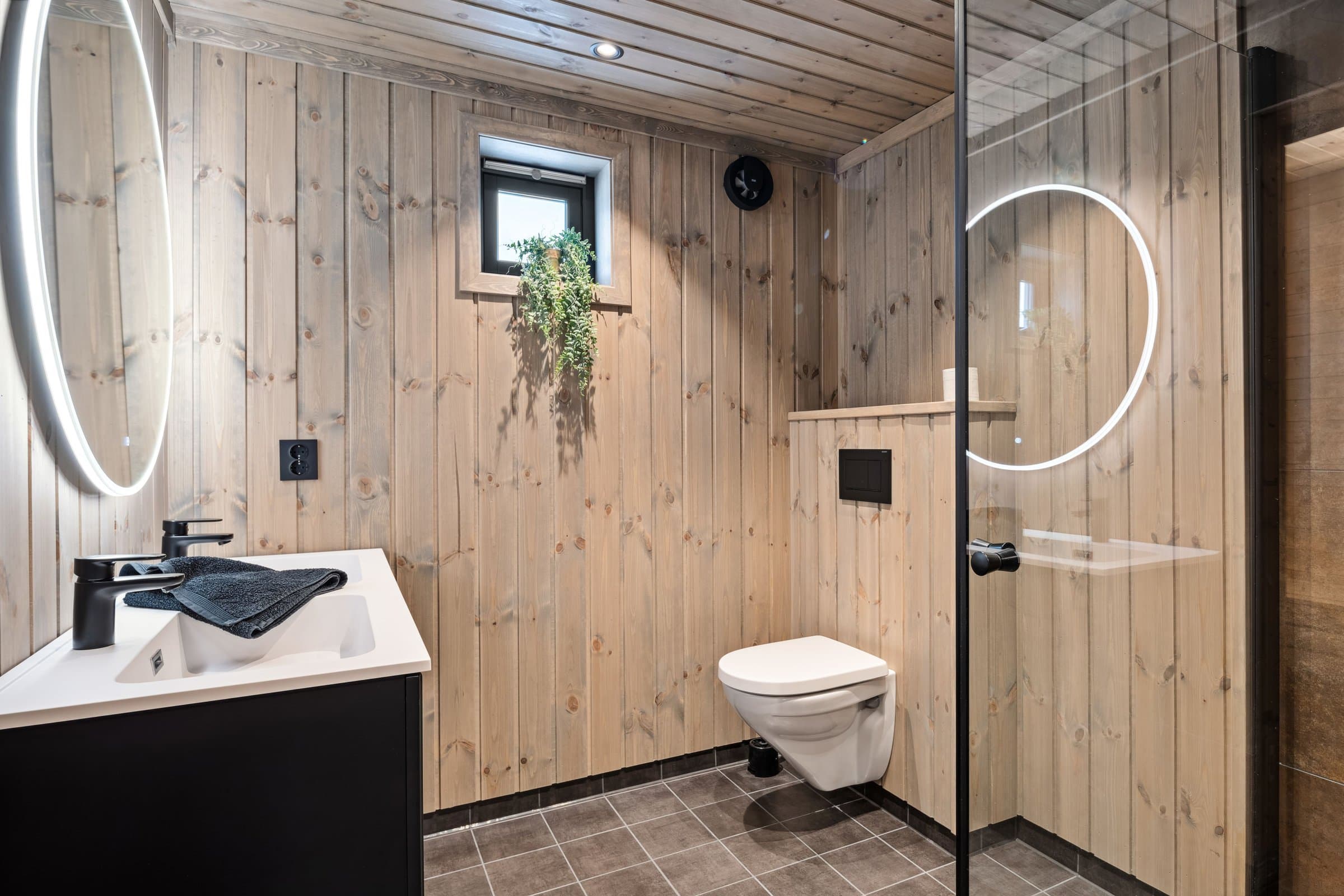 Her kommer man inn i en entré med grå store fliser på gulvet og panel på veggene. Her er det god plass til å sette fra seg skoene og henge fra seg yttertøyet, avsatt plass til skrivegarderobe. Trappen opp til hemsen er plassert i entreen. Stuen med åpen løsning har beiset panel på veggene og himling, og laminat på gulvet. Stuen er romslig med store vinduer som slipper dagslyset flott inn i rommet, samtidig som du får flott utsikt ut i naturen. Det er montert varmepumpe (luft-luft) med WIFI-tilkobling og peisovn som varmekilder i stuen. Terrassedøren gir deg adkomst ut til terrassen hvor man kan nyte vakre påskedager og sommerdager. Det er åpen løsning mellom stue, spisestue og kjøkken, noe som gir rommet en mer åpen og lys følelse. Det er god plass til å etablere en sofagruppe hvor man kan slenge beina opp etter en lang dag ute, og en spisestue hvor man kan samles til hyggelige måltider, brettspill og annet. Kjøkkeninnredningen har grå profilerte fronter i en L-formasjon med benkeplate i laminat. Innredningen består av overskap, underskap og skuffer. Nye integrerte hvitevarer som induksjonstopp, oppvaskmaskin, innbyggingsovn og kjøl- / fryseskap er montert i innredningen. Det er også ventilator med avkast ut montert over induksjonstoppen. Her kan man lage de beste måltidene sammen, og har god plass til lagring av kjøkkenutstyr. Det er tre soverom i 1. etasje i hytten. Alle soverommene har beiset trepanel på veggene, laminat på gulvet og panelovner som varmekilde. Det er to baderom i fritidsboligen. Det største baderommet har fliser på gulvet og veggene i dusjsonen, ellers er det beiset trepanel på veggene og i himlingen. Baderommet er innredet med dobbeltservant i mørk skuffeinnredning, speil med lys, vegghengt toalett og dusjhjørne med glassdører og armatur montert på vegg. Det er varmekabler i gulvet som varmekilde, veggmontert vifte, og luftespalte under døren. Det er også badstue med adkomst fra baderommet. Varmtvannstanken er plassert i badstuen under benken. Det andre baderommet i tilknytning til det største soverommet har fliser på gulvet og veggene i dusjsonen, ellers er det beiset trepanel på veggene og i himlingen. Badet er innredet med servant med skuffeinnredning, speilskap, dusjhjørne og vegghengt toalett. Her er det også plass til vaskemaskin og tørketrommel. Hemsen har lys laminat på gulvet, beiset trepanel på veggene og i himlingen. Hemsen inneholder to rom (ikke delt med dør). Den største delen av hemsen har to innvendige vinduer mot stuen og kjøkkenet med åpen ned løsning, og den andre delen har et vindu i ytterveggen som sørger for dagslys. Hemsen rommer ca. 32 kvm ikke målbart areal. Det er skråhimling som gir hemsen/loftet lavere takhøyde, og gjør at rommet ikke er godkjent for varig opphold. For ytterligere opplysninger om standard se selgers egenerklæringsskjema. Opplistingen over er ikke uttømmende og du oppfordres til å lese og sette deg grundig inn i alt salgsmateriell