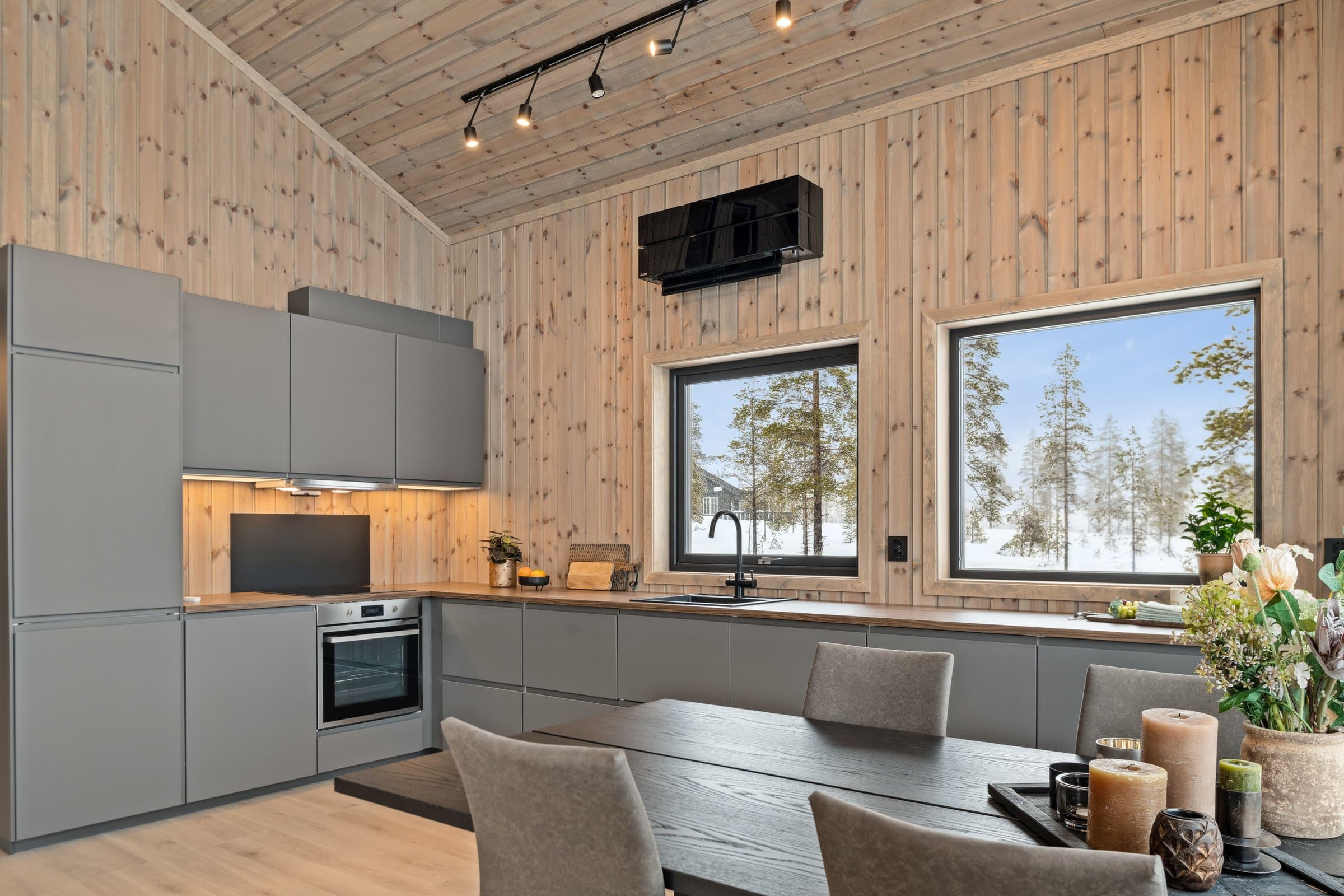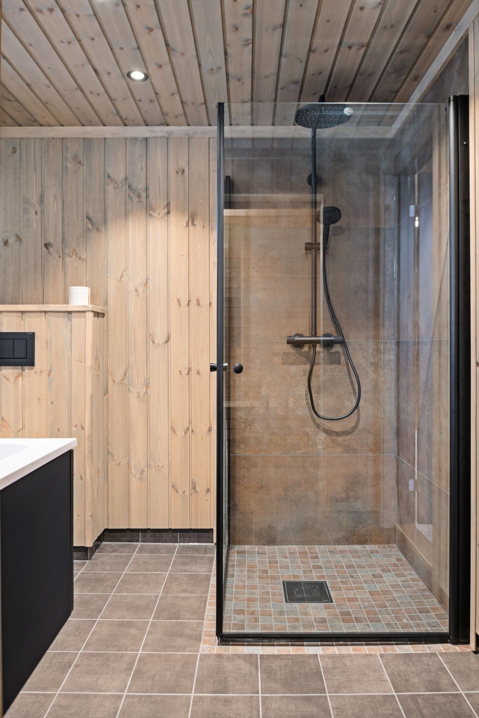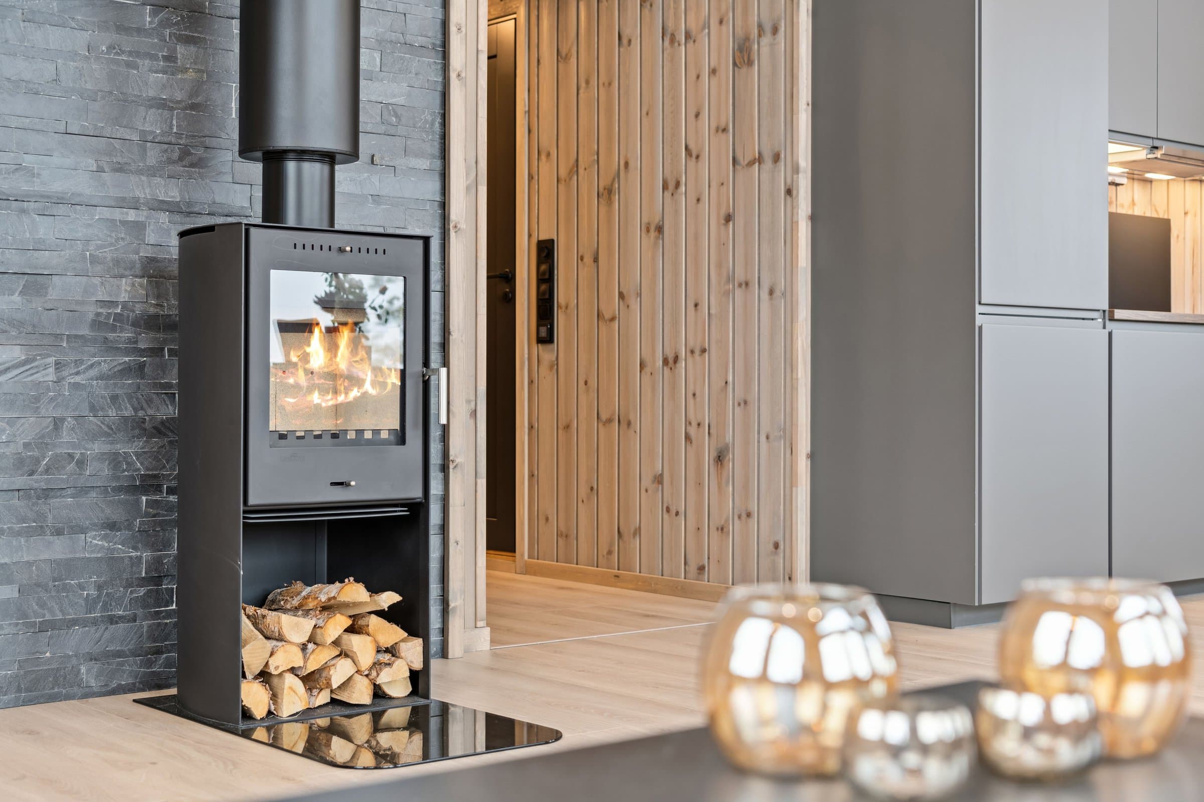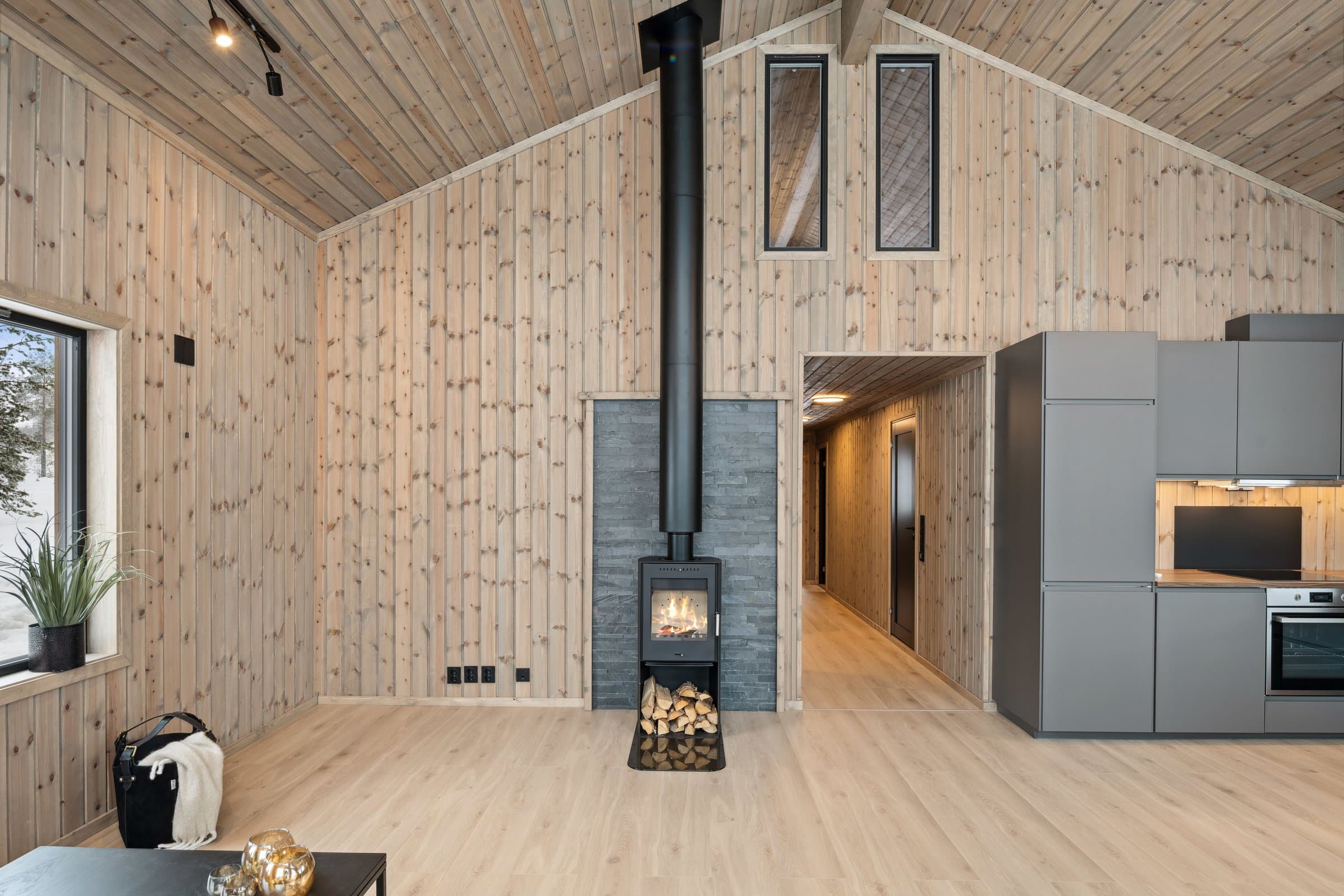 Her kommer man inn i en entré med grå store fliser på gulvet og panel på veggene. Her er det god plass til å sette fra seg skoene og henge fra seg yttertøyet, avsatt plass til skrivegarderobe. Trappen opp til hemsen er plassert i entreen. Stuen med åpen løsning har beiset panel på veggene og himling, og laminat på gulvet. Stuen er romslig med store vinduer som slipper dagslyset flott inn i rommet, samtidig som du får flott utsikt ut i naturen. Det er montert varmepumpe (luft-luft) med WIFI-tilkobling og peisovn som varmekilder i stuen. Terrassedøren gir deg adkomst ut til terrassen hvor man kan nyte vakre påskedager og sommerdager. Det er åpen løsning mellom stue, spisestue og kjøkken, noe som gir rommet en mer åpen og lys følelse. Det er god plass til å etablere en sofagruppe hvor man kan slenge beina opp etter en lang dag ute, og en spisestue hvor man kan samles til hyggelige måltider, brettspill og annet. Kjøkkeninnredningen har grå profilerte fronter i en L-formasjon med benkeplate i laminat. Innredningen består av overskap, underskap og skuffer. Nye integrerte hvitevarer som induksjonstopp, oppvaskmaskin, innbyggingsovn og kjøl- / fryseskap er montert i innredningen. Det er også ventilator med avkast ut montert over induksjonstoppen. Her kan man lage de beste måltidene sammen, og har god plass til lagring av kjøkkenutstyr. Det er tre soverom i 1. etasje i hytten. Alle soverommene har beiset trepanel på veggene, laminat på gulvet og panelovner som varmekilde. Det er to baderom i fritidsboligen. Det største baderommet har fliser på gulvet og veggene i dusjsonen, ellers er det beiset trepanel på veggene og i himlingen. Baderommet er innredet med dobbeltservant i mørk skuffeinnredning, speil med lys, vegghengt toalett og dusjhjørne med glassdører og armatur montert på vegg. Det er varmekabler i gulvet som varmekilde, veggmontert vifte, og luftespalte under døren. Det er også badstue med adkomst fra baderommet. Varmtvannstanken er plassert i badstuen under benken. Det andre baderommet i tilknytning til det største soverommet har fliser på gulvet og veggene i dusjsonen, ellers er det beiset trepanel på veggene og i himlingen. Badet er innredet med servant med skuffeinnredning, speilskap, dusjhjørne og vegghengt toalett. Her er det også plass til vaskemaskin og tørketrommel. Hemsen har lys laminat på gulvet, beiset trepanel på veggene og i himlingen. Hemsen inneholder to rom (ikke delt med dør). Den største delen av hemsen har to innvendige vinduer mot stuen og kjøkkenet med åpen ned løsning, og den andre delen har et vindu i ytterveggen som sørger for dagslys. Hemsen rommer ca. 32 kvm ikke målbart areal. Det er skråhimling som gir hemsen/loftet lavere takhøyde, og gjør at rommet ikke er godkjent for varig opphold. For ytterligere opplysninger om standard se selgers egenerklæringsskjema. Opplistingen over er ikke uttømmende og du oppfordres til å lese og sette deg grundig inn i alt salgsmateriell