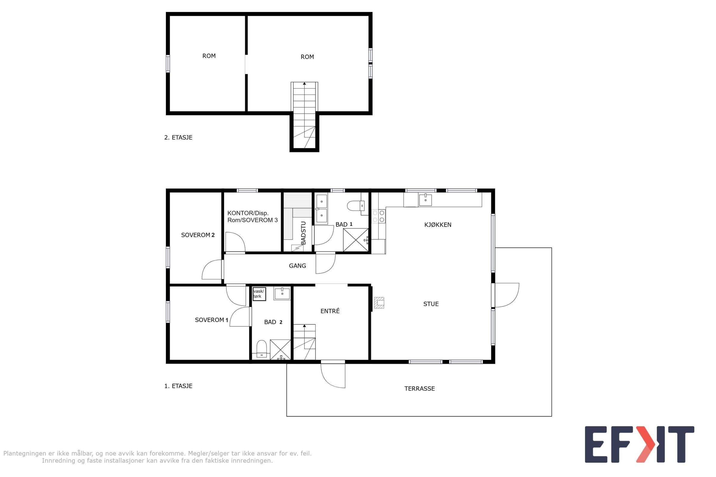 Arealer og fordeling per etasje: 1 etasje: ca.89 kvm (3 soverom, 2 bad, stue med kjøkken, gang og entre) byggets BRA. 2 etasje: Hemsen/loft rommer ca. 32 kvm ikke målbart areal. (her er det plass til et soveområdet og romslig stue). Loft/hems er under 189,5 cm og regnes ikke som målbart areal. Terrasse: ca. 30 kvm sørøstvendt terrasse med sol store deler av dagen. Hva som defineres som primærrom (P-ROM) eller sekundærrom (S-ROM) tar utgangspunkt i hvordan rommet er i bruk når eiendommen selges, selv om enkelte rom ikke er byggemeldt og godkjent til dagens bruk.