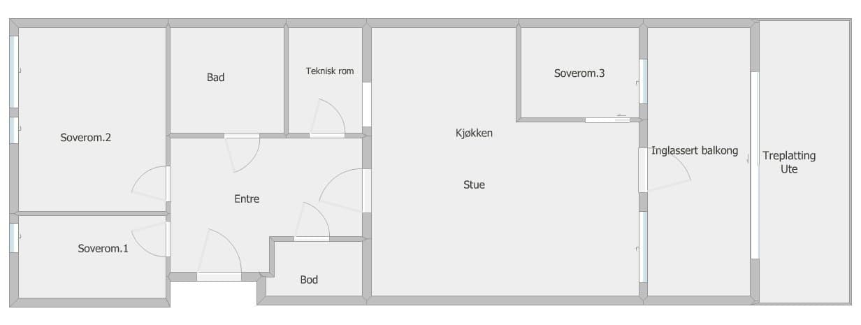 Leiligheten ligger i 1. etasje og inneholder: gang, 3 soverom, bad, teknisk rom, bod, åpen stue/kjøkkenløsning samt innglasset terrasse med utgang til markterrasse. I tillegg medfølger en kjellerbod på ca. 5 m².