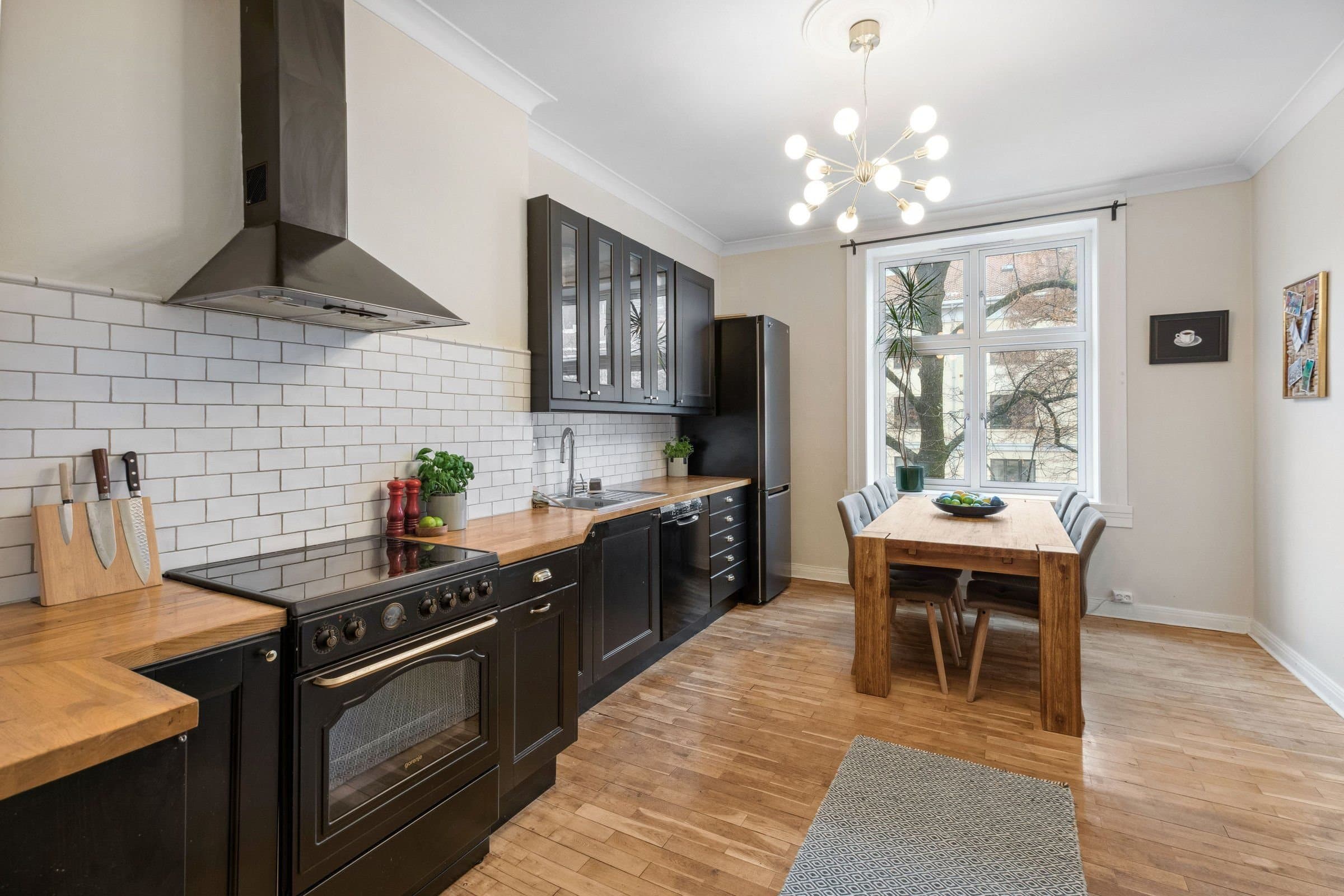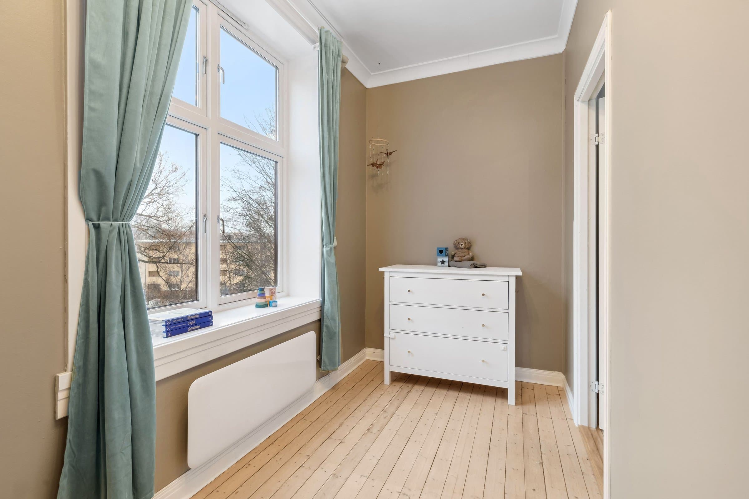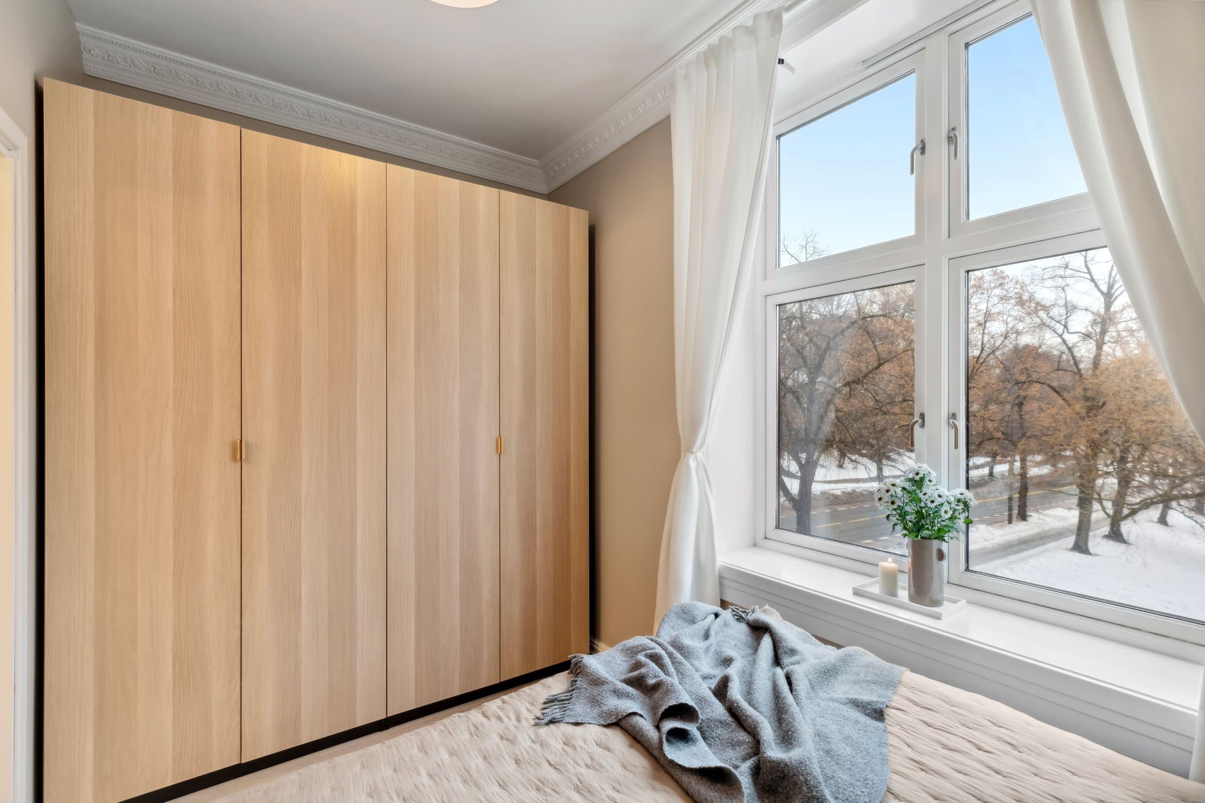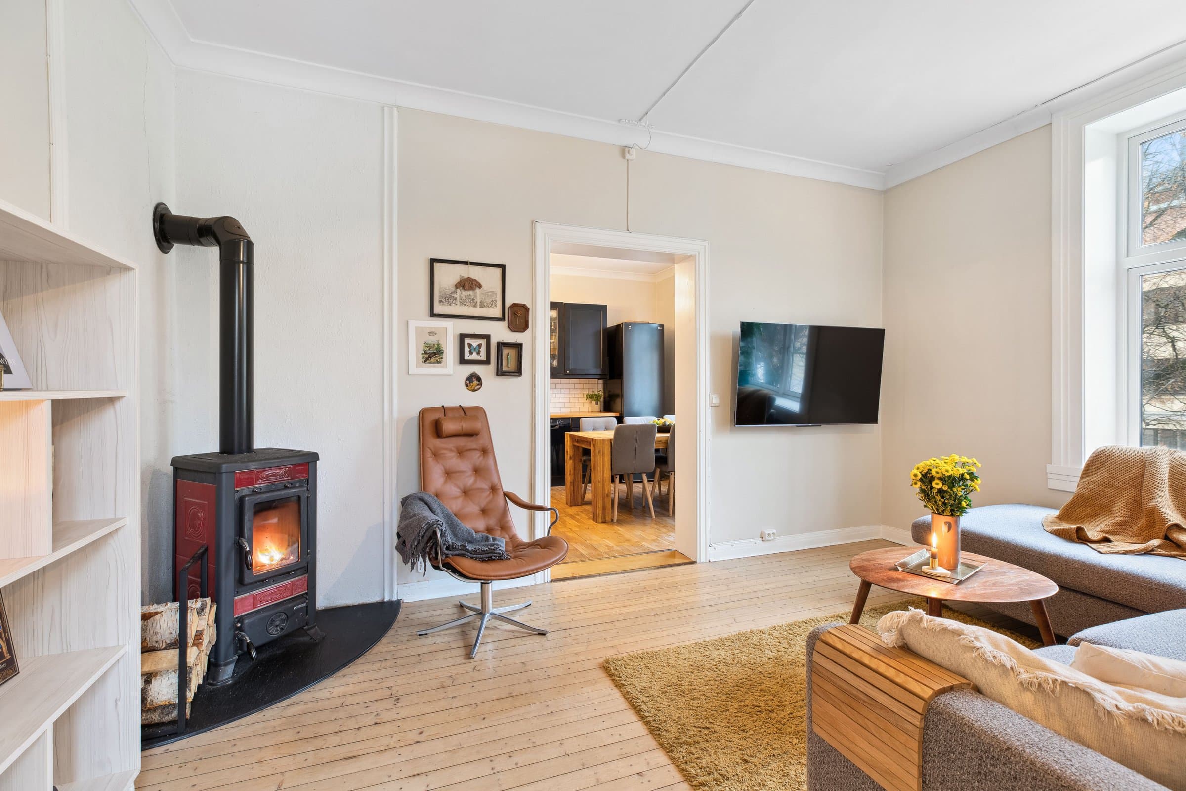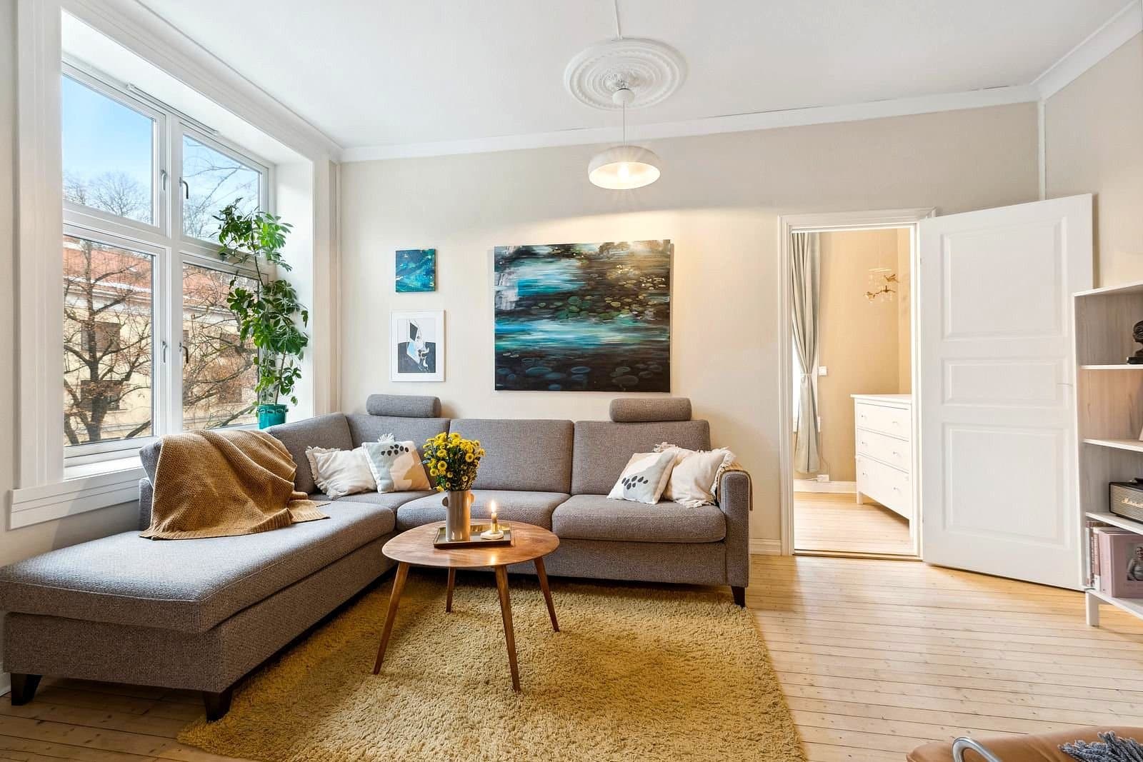 STANDARD PÅ LEILIGHET Leilighetens planløsning fordeler seg slik: ENTRÈ: Romslig inngangsparti med god takhøyde, rosett og stukkatur. Håndmalte vegger i klassisk "fresco" stil. Lyst laminatgulv lagt i 2022 (originalt tregulv under). Det er god plass til oppbevaring av yttertøy og sko i innbygd garderobeskap. Sikringsskap på vegg, rehabilitert i 2024. KJØKKEN: Stort, elegant kjøkken med mye skap- og benkplass. Kjøkkenet er det naturlige samlingspunktet i leiligheten hvor det er god plass til stort spisebord. Kjøkkeninnredning med heltre eik benkeplate og nedfelt oppvaskkum. Håndlagde, italienske fliser over kjøkkenbenk. Ventilatorhette. Kjøkkenet ble montert i 2004. Nye fronter, ny benkeplate. Vegger malt i 2023. Stort vindu med godt lys, og enkel rosett i taket. Tregulv. STUE: Hyggelig stue med plass til stor sofa. Stort vindu med godt lys, uten innsyn. Originalt tregulv, og pen, effektiv peis. Pen rosett i taket. Vegger malt i 2022. SOVEROM 1: Soverom med plass til stor dobbeltseng. Monterte nattbord. Stort vindu uten innsyn. God plass til garderobeløsning. Nytt, lyst laminat lagt i 2022 (originalt tregulv under). SOVEROM 2: Soverom med plass til stor dobbeltseng. Stort vindu uten innsyn. God plass til garderobeløsning. Originale tregulv. GARDEROBEROM: Rom mellom entrè og soverom 1, nå brukt som garderobe- og stellerom. Kan brukes til f.eks kontor. God plass til garderobeløsning. Nytt, lyst laminat lagt i 2022 (originalt tregulv under). BAD: Bad pusset opp i 2021, med varmtonet grå mikrosement lagt over flis. Vegghengt servantskap med gull armatur. Gullarmatur i dusj, og løvefotet badekar. Takhengt opplegg til dusjforheng. Vegghengt speilskap med mye oppbevaring. Plassbygd skap med varmtvannstank samt plass til vaskemaskin og oppbevaring. Varmekabler i gulv. WC: Separat toalett. Pusset opp i 2021, med varmtonet grå mikrosement lagt over flis. Vegghengt toalett. Benk med servant. Vegghengt speilskap med god oppbevaring.