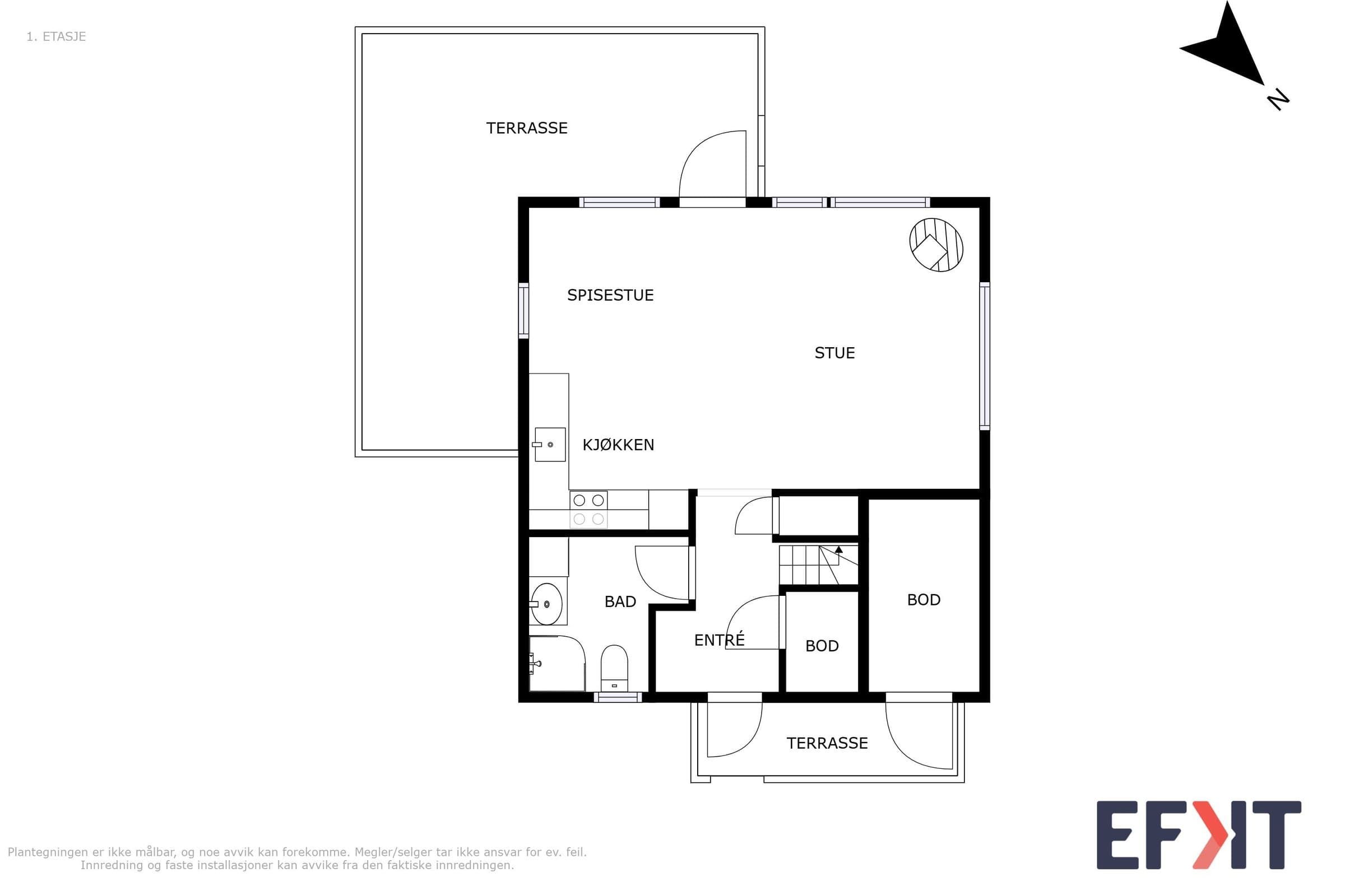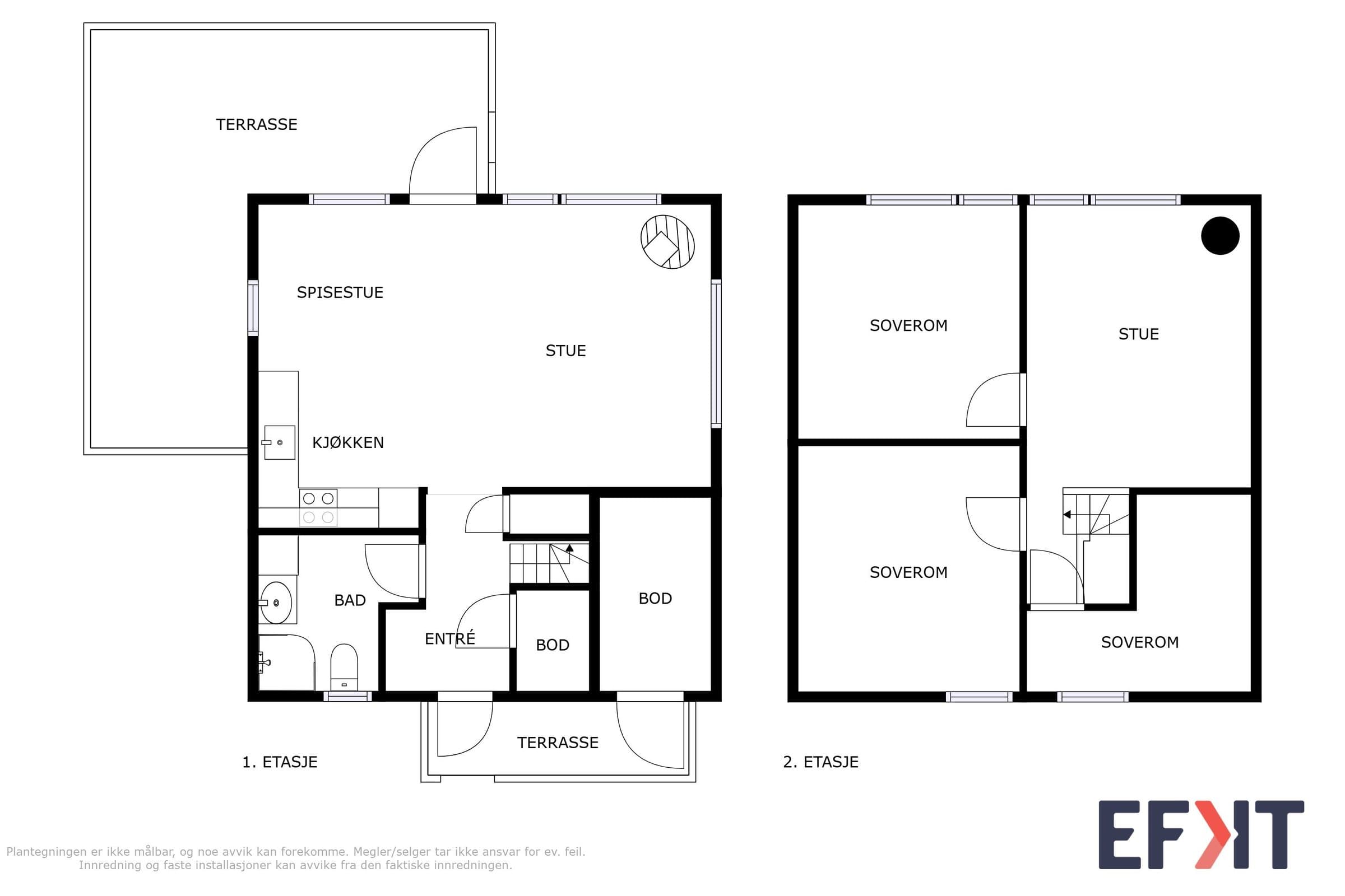 1. etg Baderom, entre/garderobe, Stue, Spisetue, Kjøkken, innebod, utebod ved siden av inngangsdør. 2. etg Loftstue, 3 soverom. Egen parkeringsplass ved siden av hytta med elbil-lader og plass til minst 2 biler.