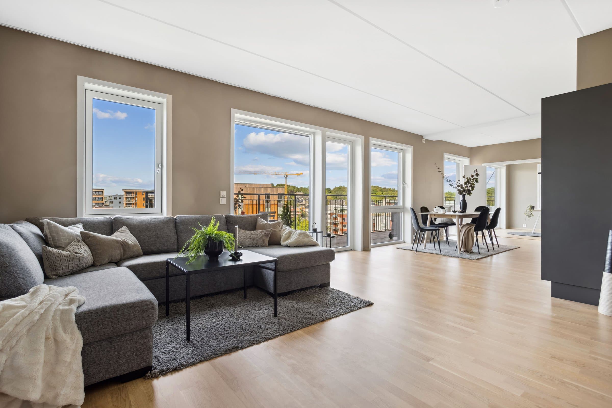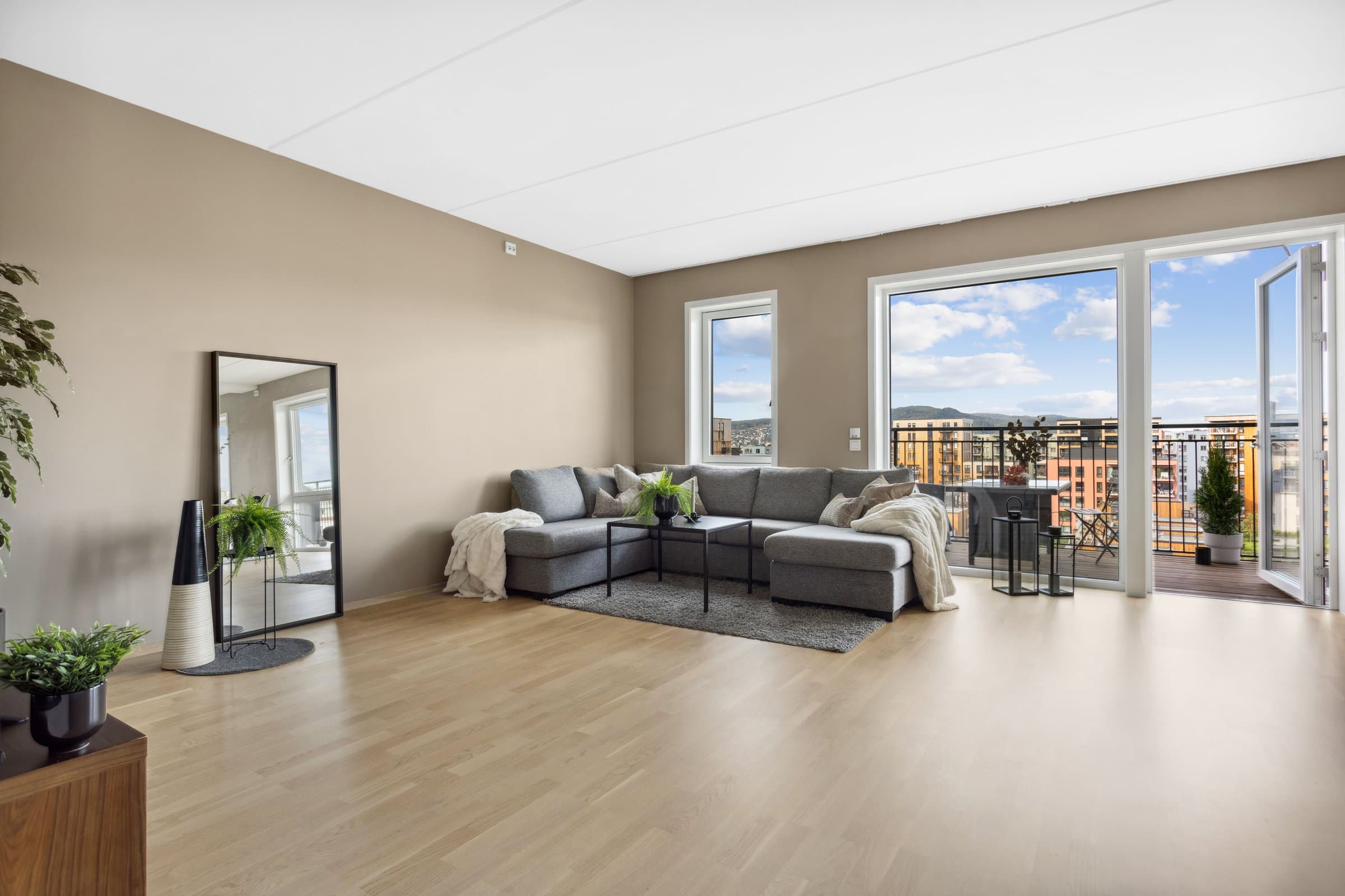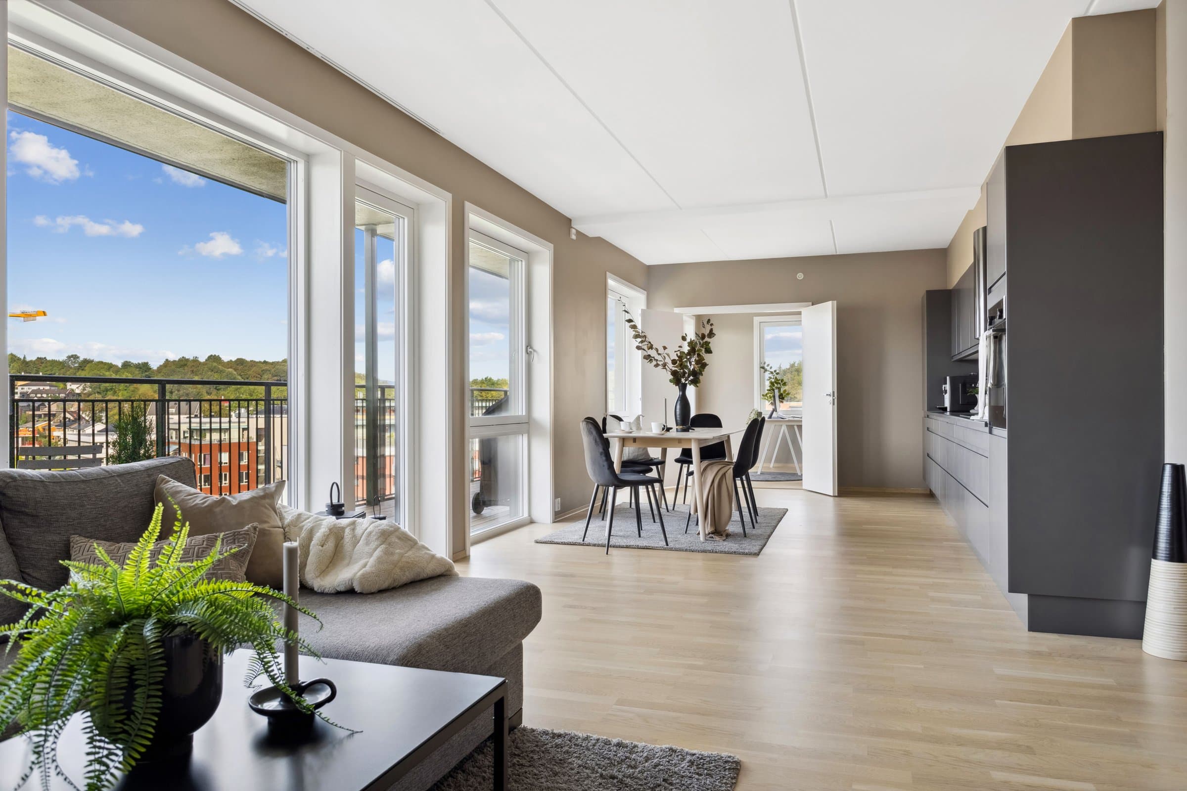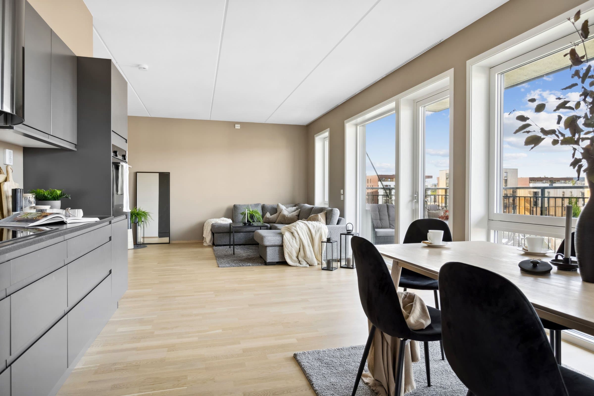 Leiligheten sto ferdig i 2021 og holder pen standard med blant annet hvit lasert eike parkett, elegant kjøkken fra Sigdal av type "Horisont" med integrerte hvitevarer fra Siemens og to lekre flislagte bad. Det er naturligvis moderne fasiliteter som balansert ventilasjon, heis og fjernvarme. Planløsningen har god flyt hvor man møtes av en romslig entré med god plass til garderobe løsning og ferdsel inn og ut av leiligheten. Det er også en bod på ca. 4 m² i tilknytning til entréen. Videre har man to av soverommene plassert mot svale omgivelser i nord av bygget, de er på hhv. 14,5 og 12,4 m² og har god plass til soveroms innredning. Det tredje soverommet er på 9,5 m² og vender mot nord/ vest og har store vindusflater mot utsikten mot området. Rommet har dobbeltdører inn fra kjøkkenet og kan brukes som enten soverom, kontor, ekstra stue eller lignende. Det er to bad i leiligheten og begge holder moderne standard og fremstår som pene. Det ene badet har inngang fra hoved soverommet på 14,5 m², badet her er 4,2 m² og har toalett, dusj hjørne og servant med underskap. Det andre badet er på 5,5 m² og har toalett, dusj hjørne, servant med underskap og ekstra benkeplass. Her er det også opplegg for vaskemaskin. Hjertet av leiligheten er den åpne stue og kjøkkenløsningen som totalt er på 44 m². Kjøkkenet er levert fra Sigdal og har Siemens hvitevarer av god kvalitet. Det er rikelig med plass til spisestue hvor man kan nyte godt lag vendt mot flott utsikt. Stuen nyter godt av store vindusflater og moderne fargevalg som gir en luftig og fin romfølelse. Ut fra stue og kjøkkenløsningen er det veranda vendt mot vest på 23 m².