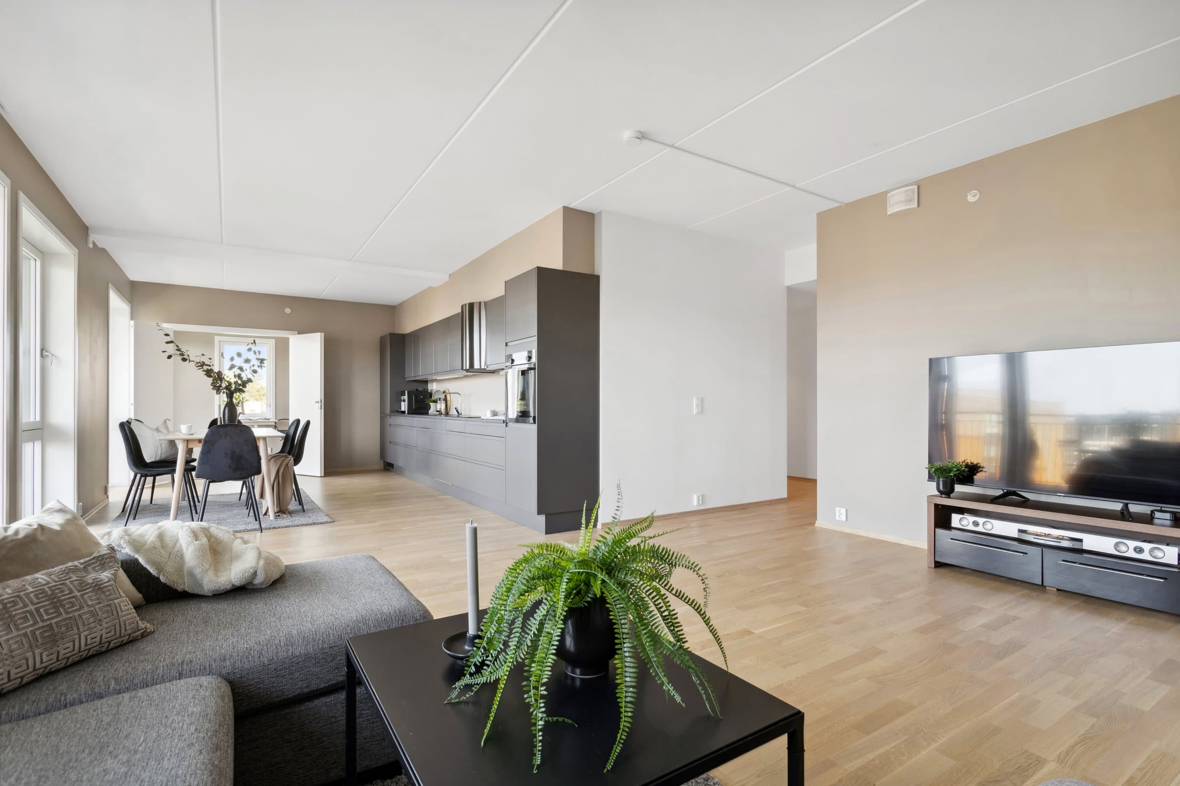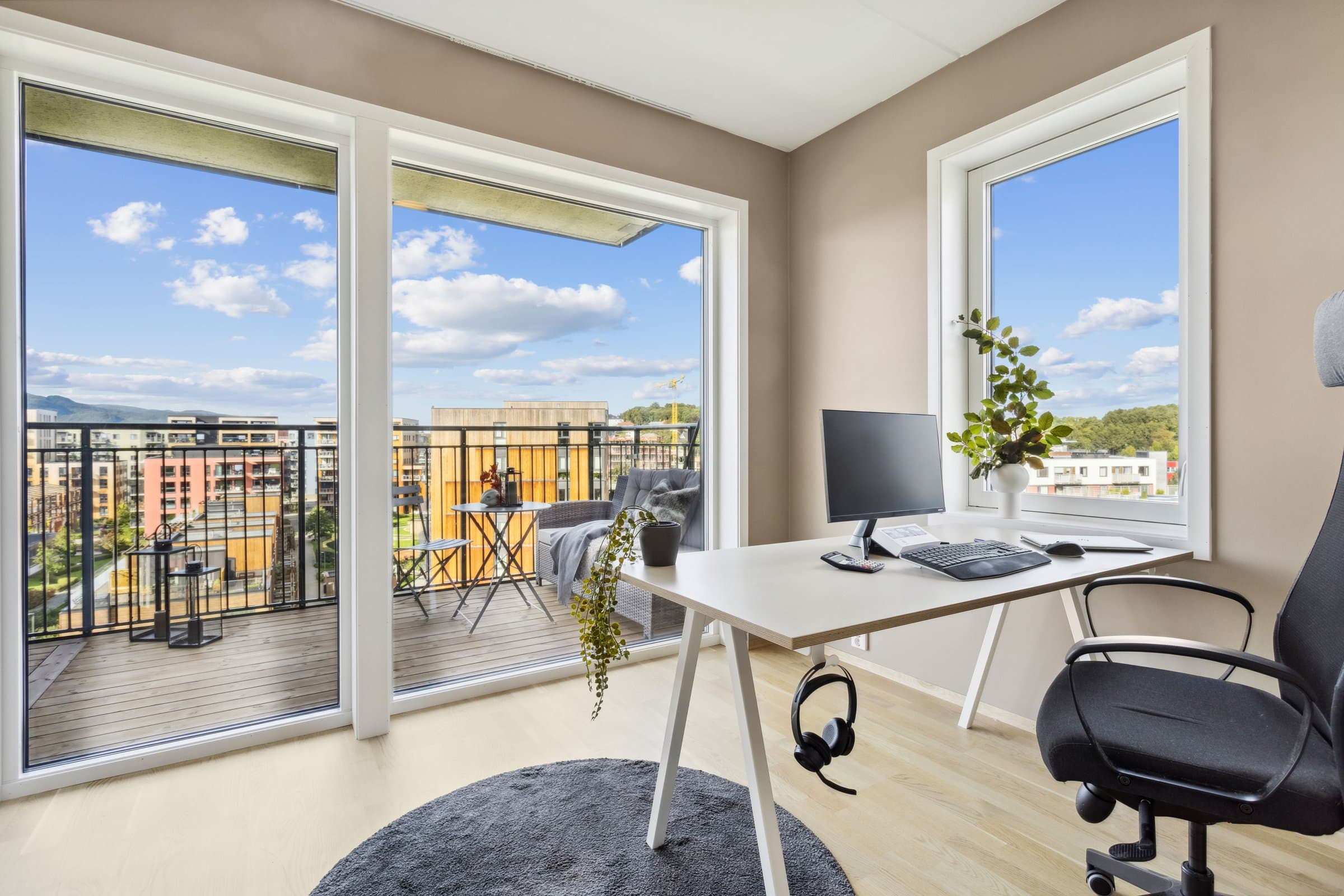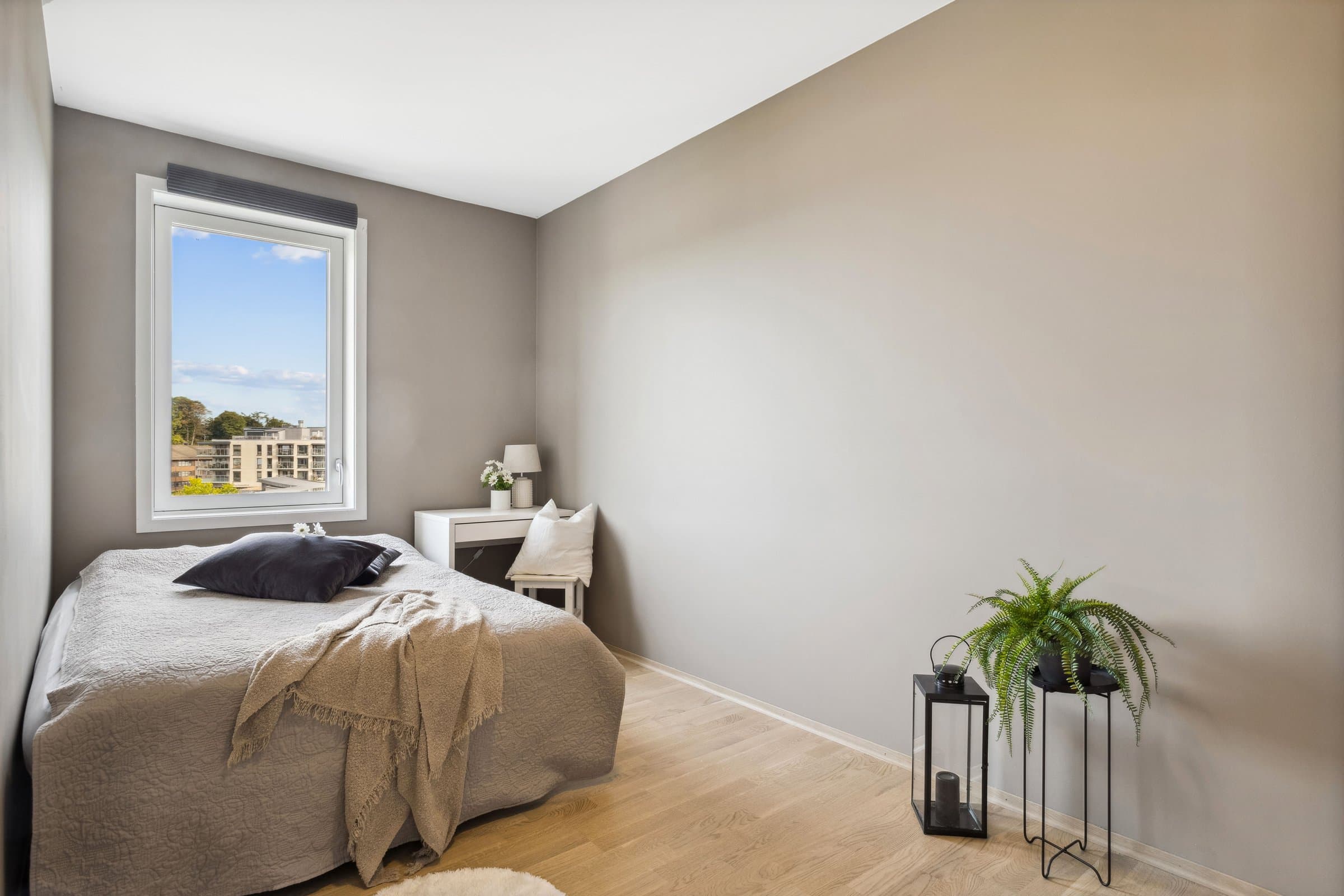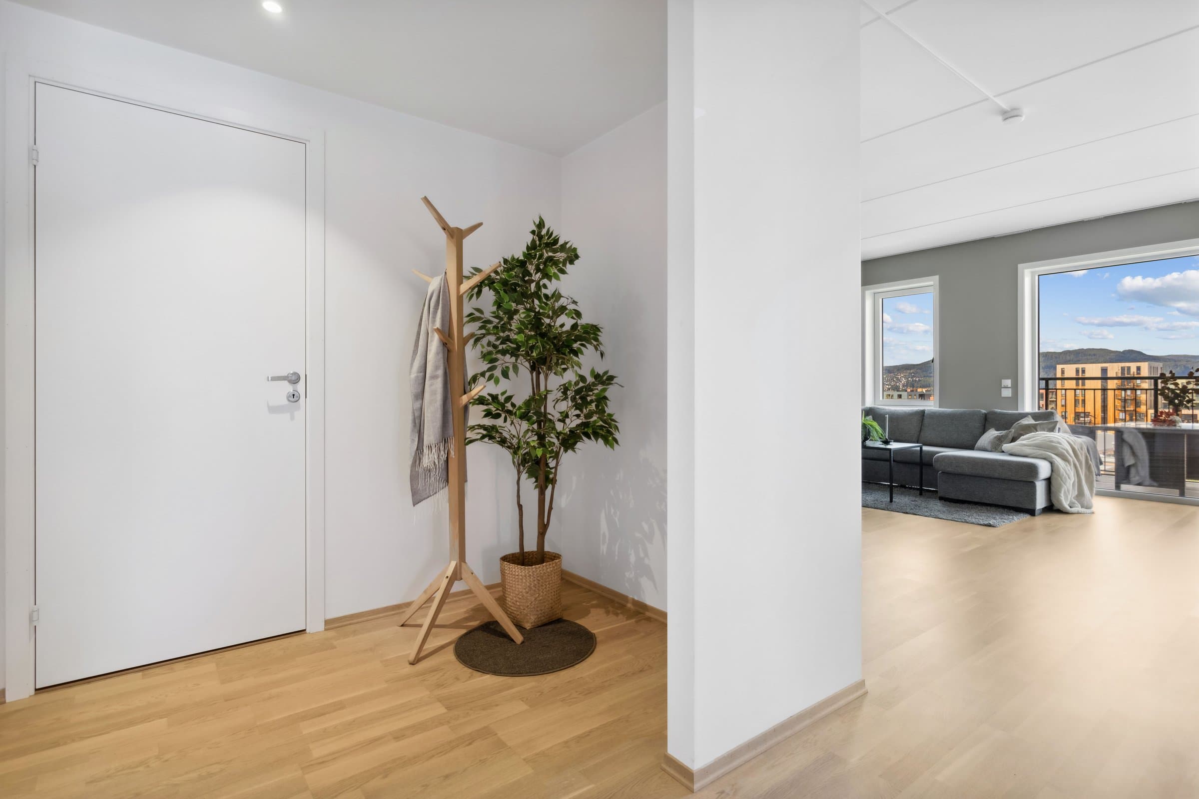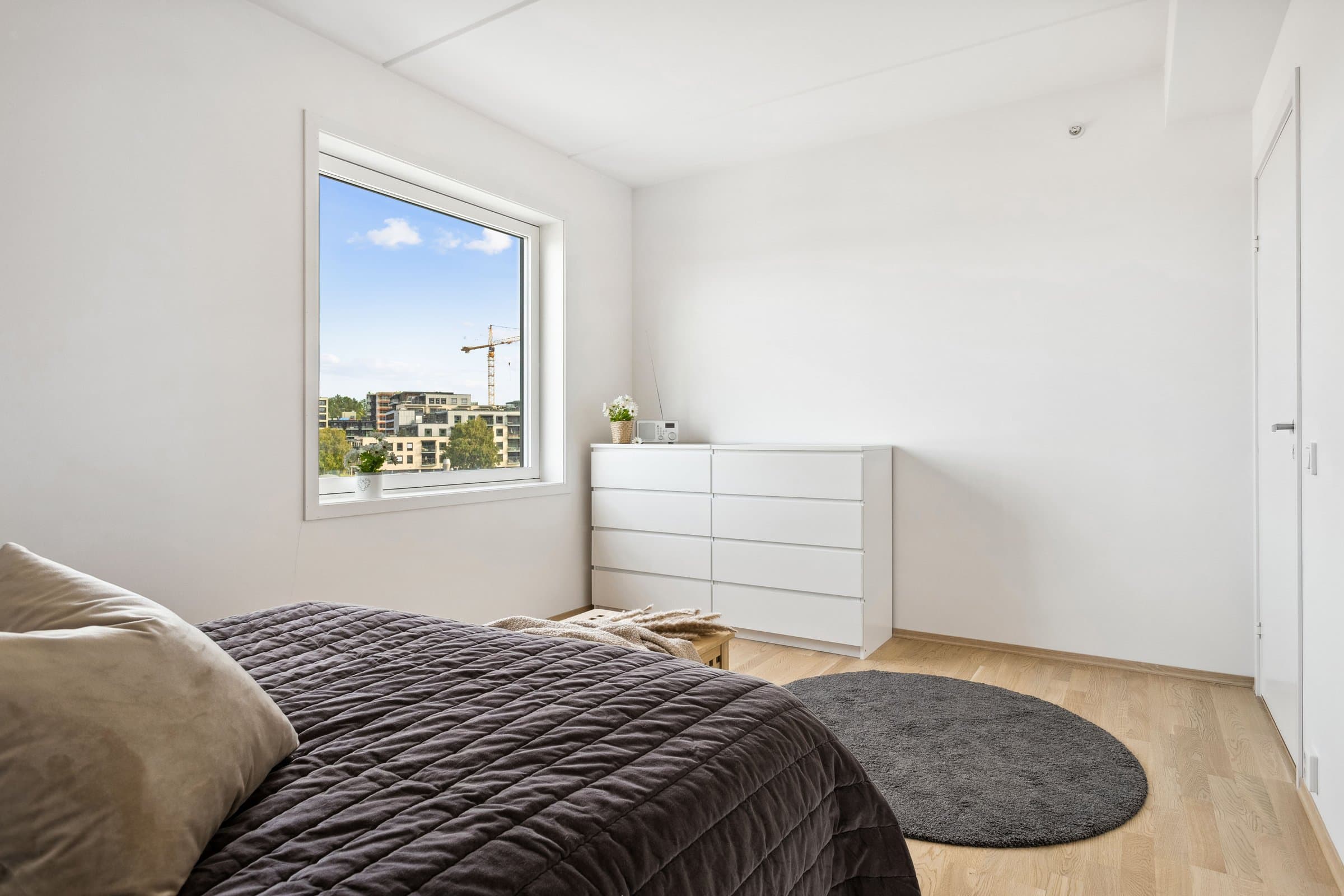 Leiligheten sto ferdig i 2021 og holder pen standard med blant annet hvit lasert eike parkett, elegant kjøkken fra Sigdal av type "Horisont" med integrerte hvitevarer fra Siemens og to lekre flislagte bad. Det er naturligvis moderne fasiliteter som balansert ventilasjon, heis og fjernvarme. Planløsningen har god flyt hvor man møtes av en romslig entré med god plass til garderobe løsning og ferdsel inn og ut av leiligheten. Det er også en bod på ca. 4 m² i tilknytning til entréen. Videre har man to av soverommene plassert mot svale omgivelser i nord av bygget, de er på hhv. 14,5 og 12,4 m² og har god plass til soveroms innredning. Det tredje soverommet er på 9,5 m² og vender mot nord/ vest og har store vindusflater mot utsikten mot området. Rommet har dobbeltdører inn fra kjøkkenet og kan brukes som enten soverom, kontor, ekstra stue eller lignende. Det er to bad i leiligheten og begge holder moderne standard og fremstår som pene. Det ene badet har inngang fra hoved soverommet på 14,5 m², badet her er 4,2 m² og har toalett, dusj hjørne og servant med underskap. Det andre badet er på 5,5 m² og har toalett, dusj hjørne, servant med underskap og ekstra benkeplass. Her er det også opplegg for vaskemaskin. Hjertet av leiligheten er den åpne stue og kjøkkenløsningen som totalt er på 44 m². Kjøkkenet er levert fra Sigdal og har Siemens hvitevarer av god kvalitet. Det er rikelig med plass til spisestue hvor man kan nyte godt lag vendt mot flott utsikt. Stuen nyter godt av store vindusflater og moderne fargevalg som gir en luftig og fin romfølelse. Ut fra stue og kjøkkenløsningen er det veranda vendt mot vest på 23 m².