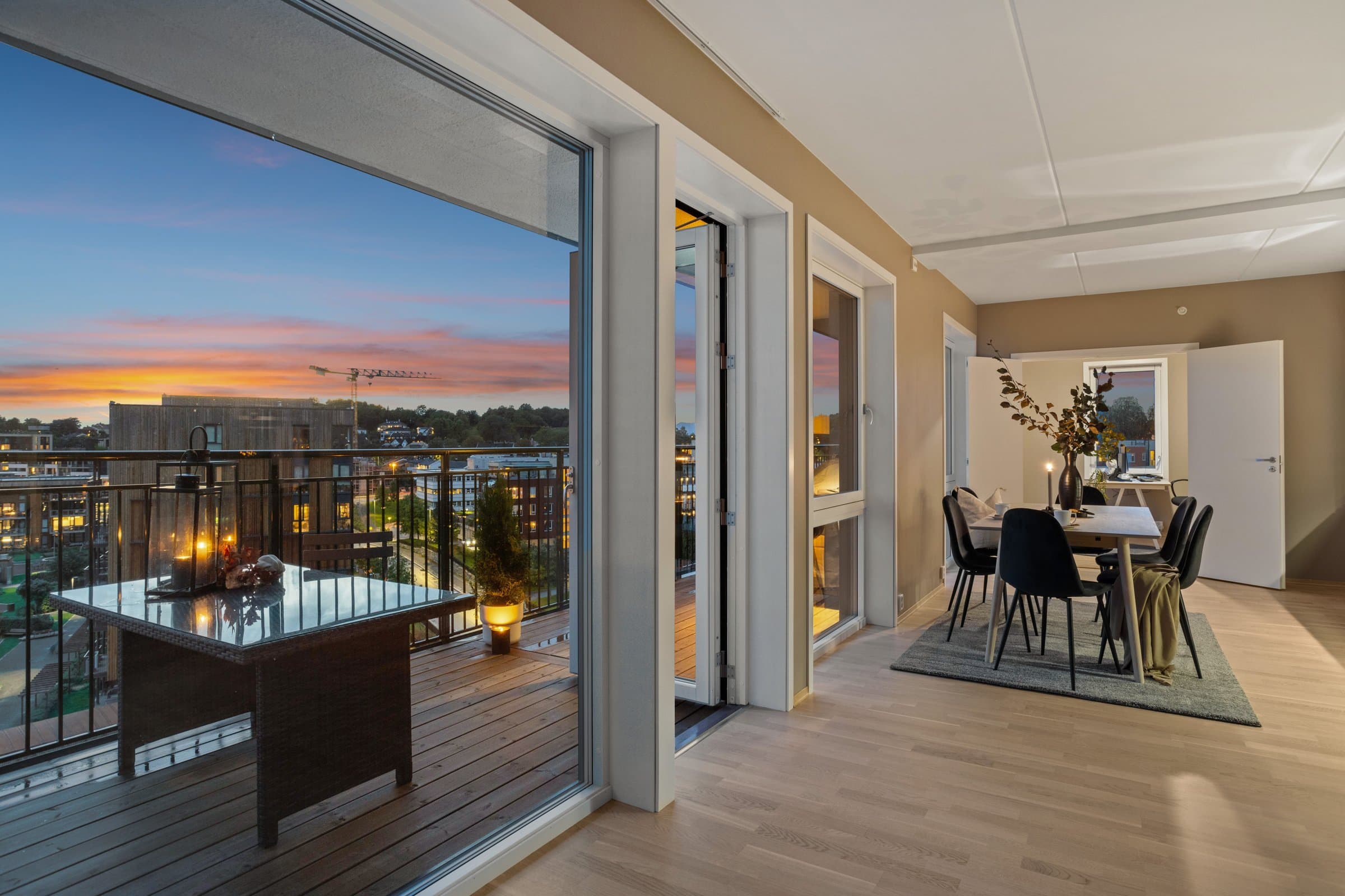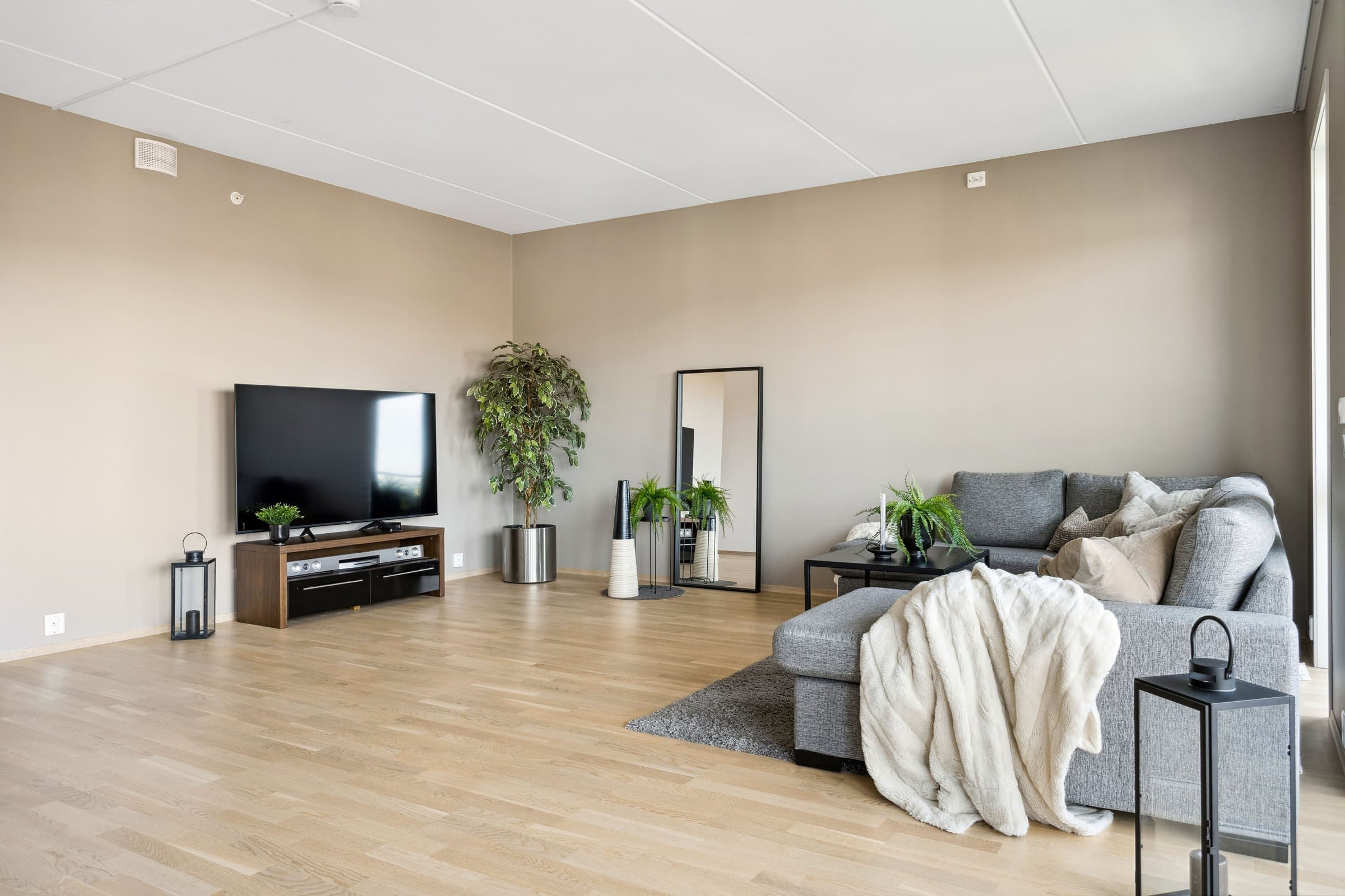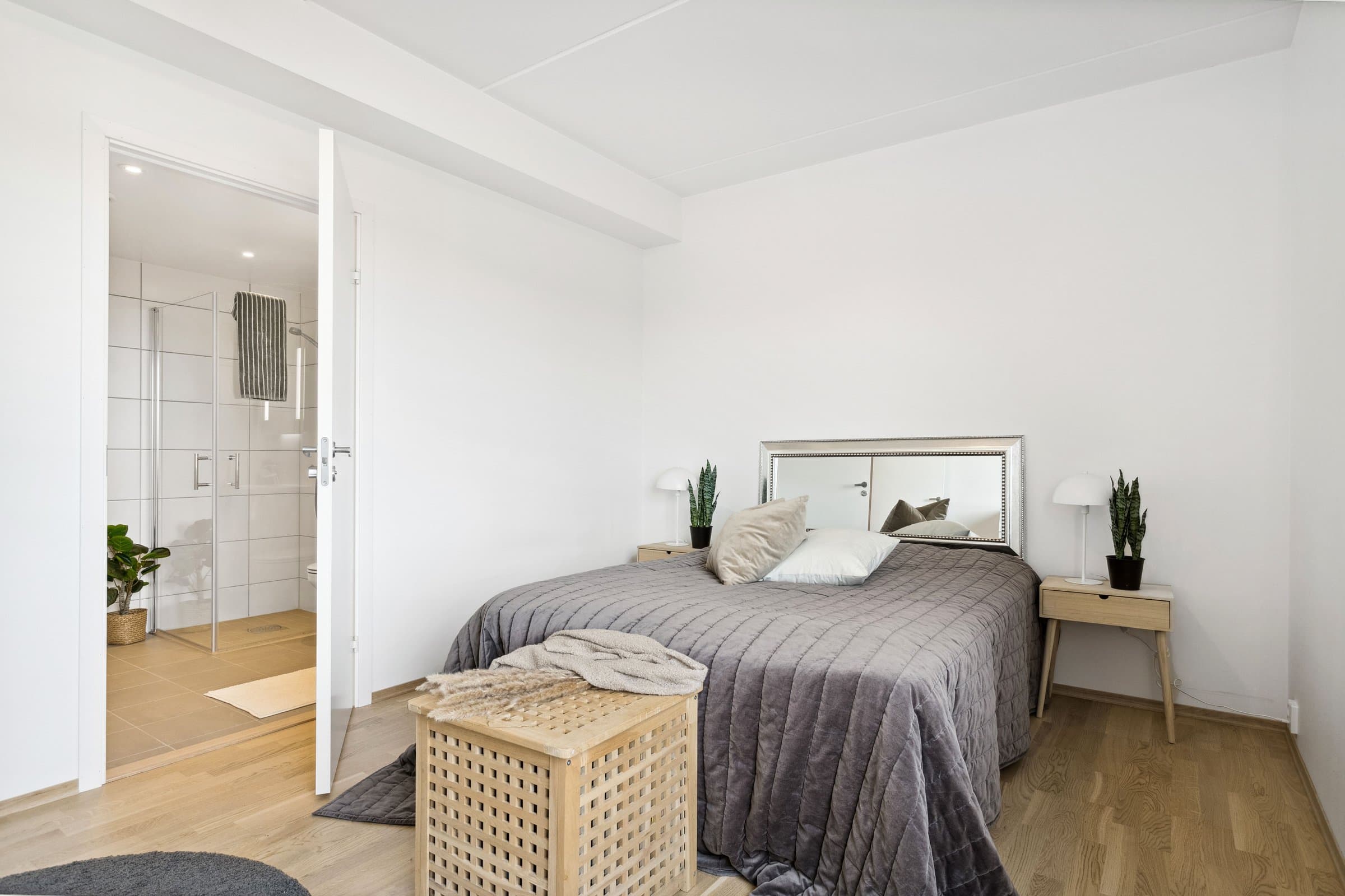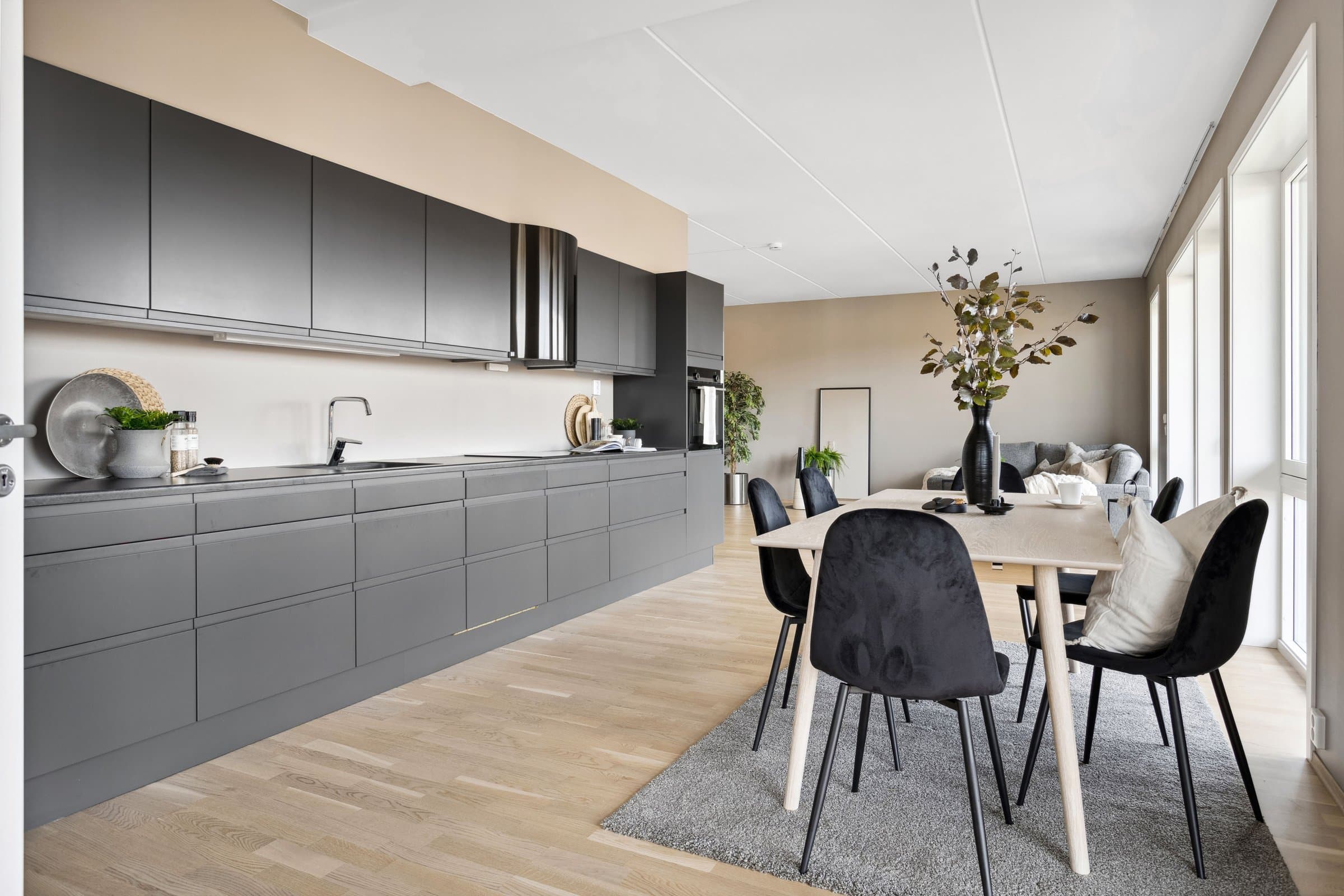 Leiligheten sto ferdig i 2021 og holder pen standard med blant annet hvit lasert eike parkett, elegant kjøkken fra Sigdal av type "Horisont" med integrerte hvitevarer fra Siemens og to lekre flislagte bad. Det er naturligvis moderne fasiliteter som balansert ventilasjon, heis og fjernvarme. Planløsningen har god flyt hvor man møtes av en romslig entré med god plass til garderobe løsning og ferdsel inn og ut av leiligheten. Det er også en bod på ca. 4 m² i tilknytning til entréen. Videre har man to av soverommene plassert mot svale omgivelser i nord av bygget, de er på hhv. 14,5 og 12,4 m² og har god plass til soveroms innredning. Det tredje soverommet er på 9,5 m² og vender mot nord/ vest og har store vindusflater mot utsikten mot området. Rommet har dobbeltdører inn fra kjøkkenet og kan brukes som enten soverom, kontor, ekstra stue eller lignende. Det er to bad i leiligheten og begge holder moderne standard og fremstår som pene. Det ene badet har inngang fra hoved soverommet på 14,5 m², badet her er 4,2 m² og har toalett, dusj hjørne og servant med underskap. Det andre badet er på 5,5 m² og har toalett, dusj hjørne, servant med underskap og ekstra benkeplass. Her er det også opplegg for vaskemaskin. Hjertet av leiligheten er den åpne stue og kjøkkenløsningen som totalt er på 44 m². Kjøkkenet er levert fra Sigdal og har Siemens hvitevarer av god kvalitet. Det er rikelig med plass til spisestue hvor man kan nyte godt lag vendt mot flott utsikt. Stuen nyter godt av store vindusflater og moderne fargevalg som gir en luftig og fin romfølelse. Ut fra stue og kjøkkenløsningen er det veranda vendt mot vest på 23 m².