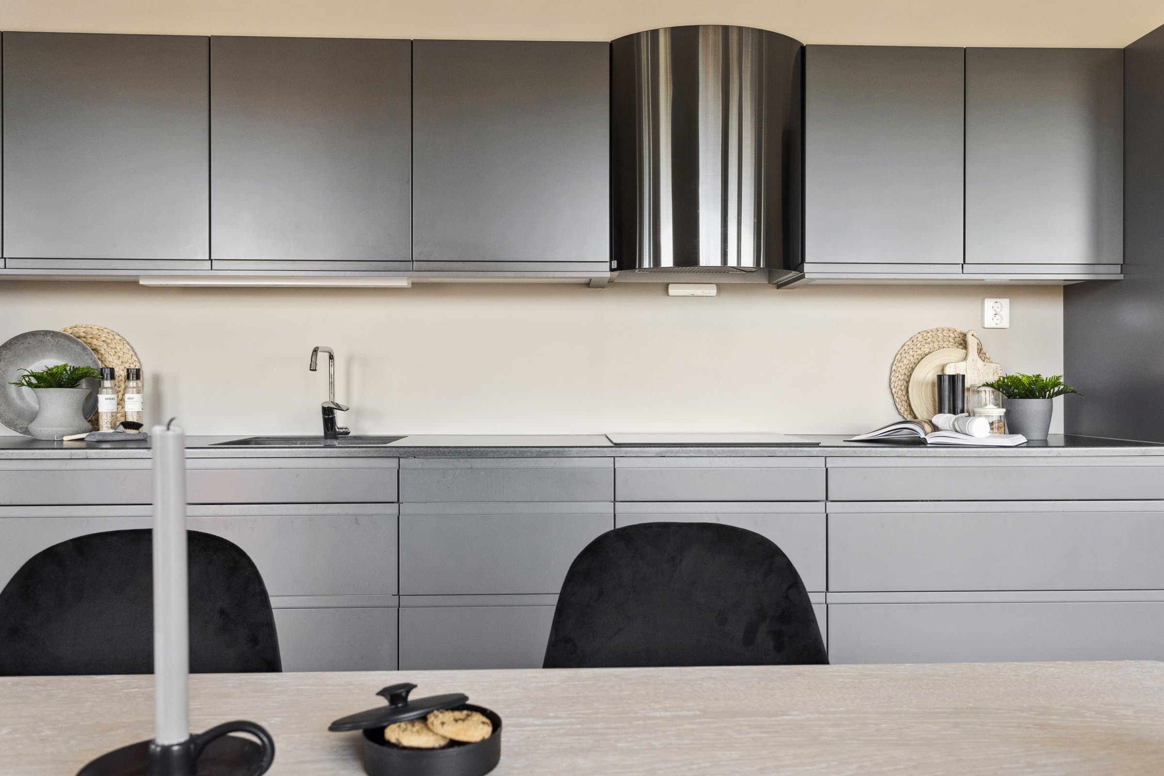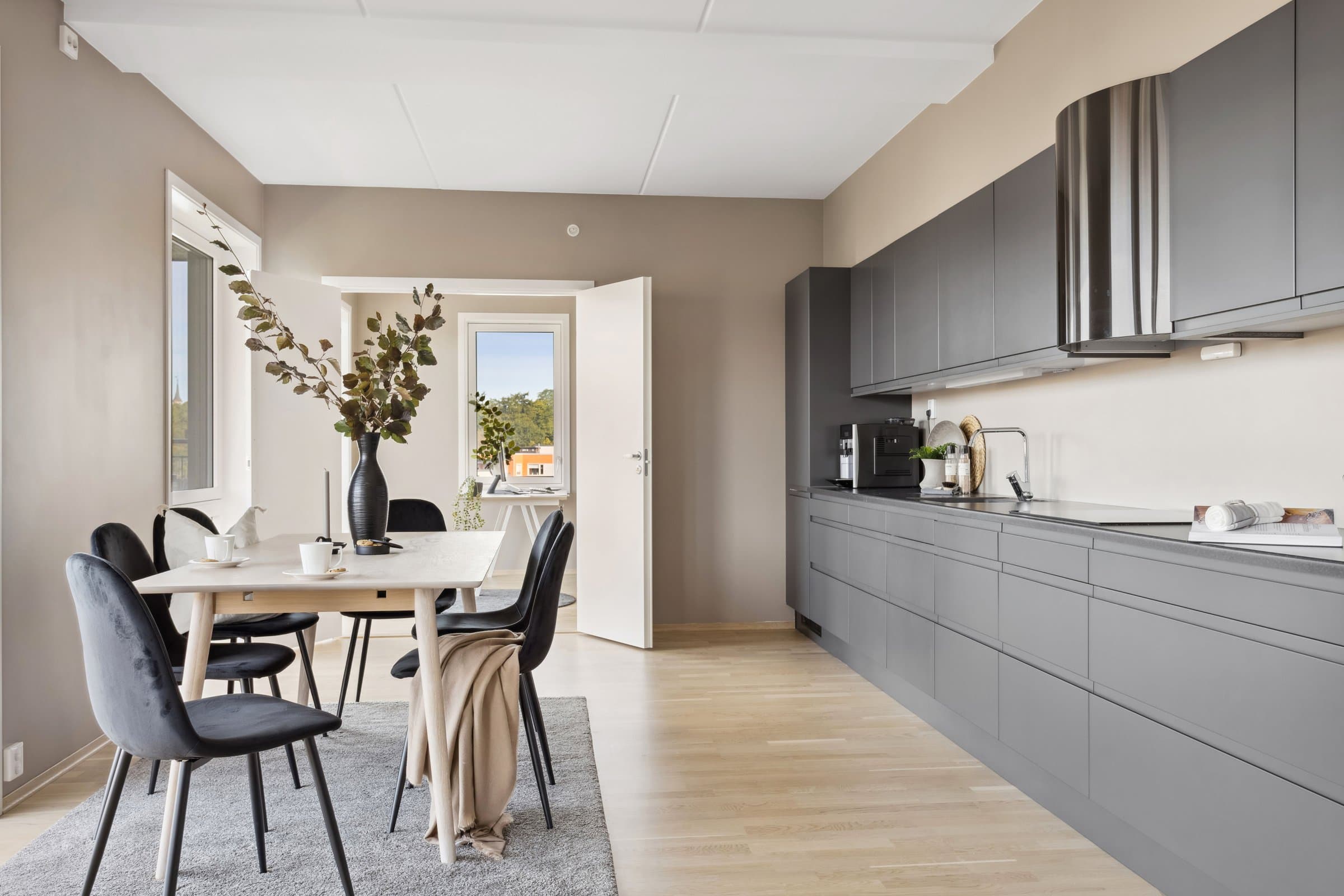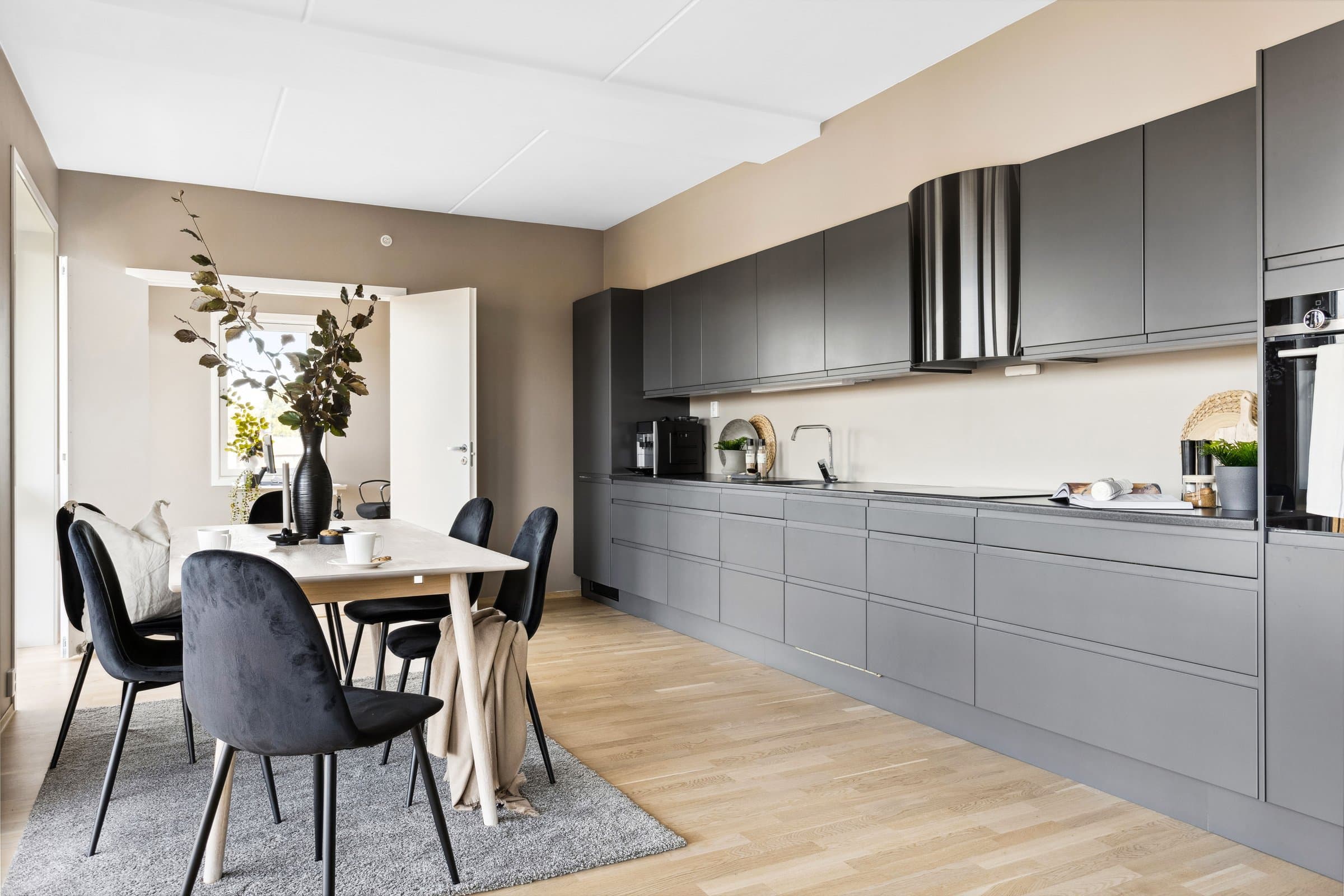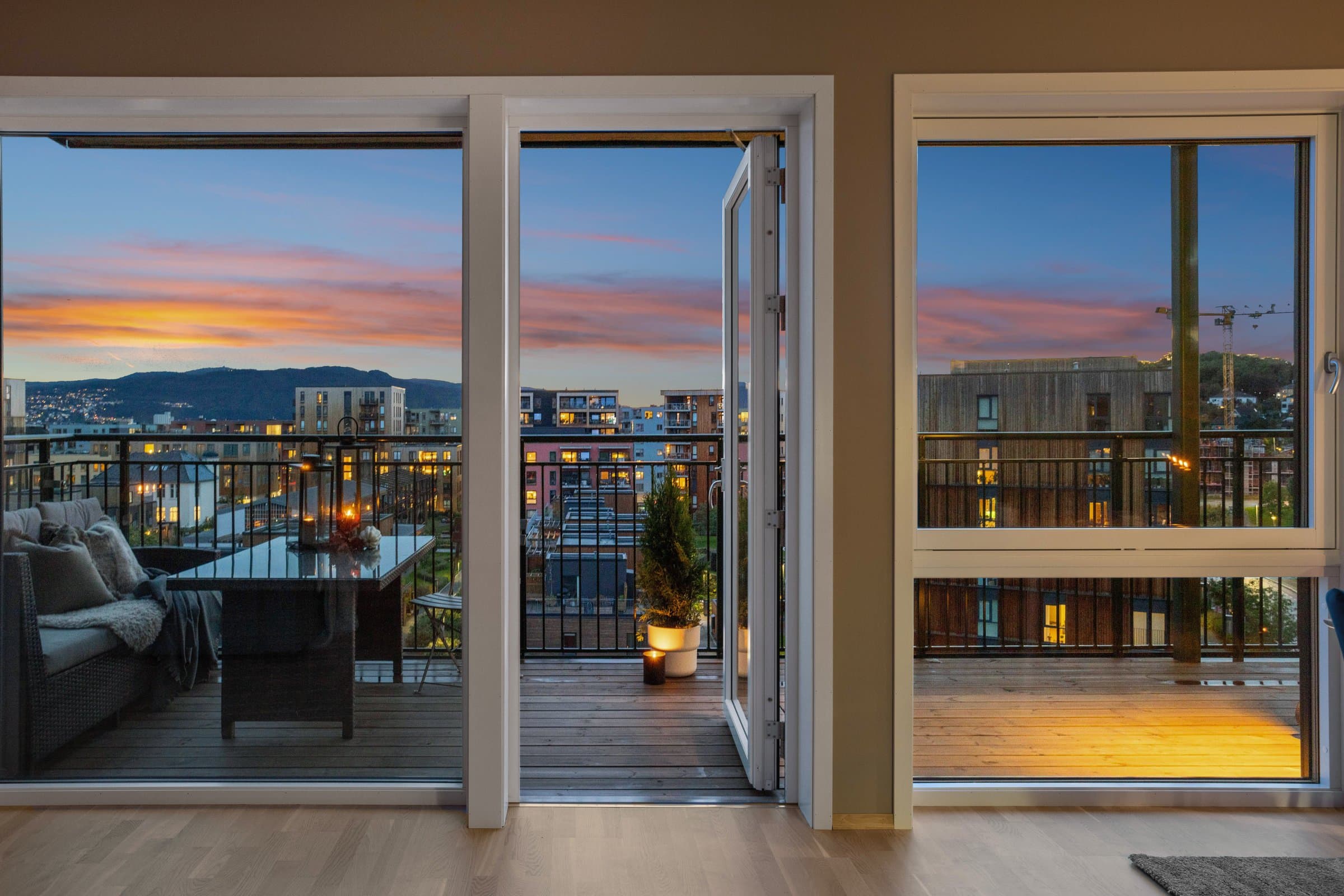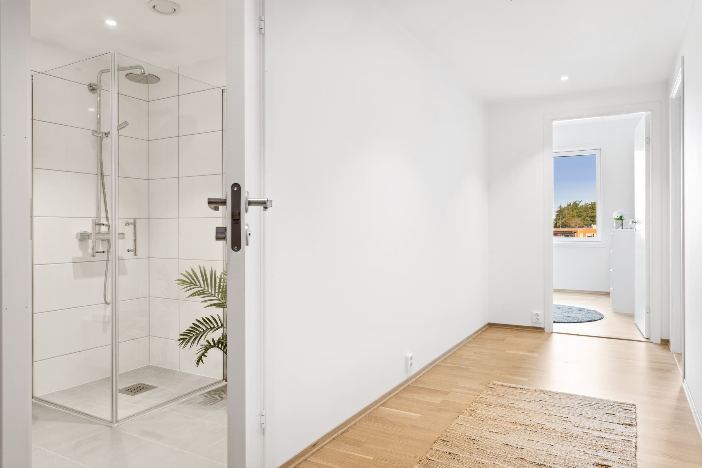 Leiligheten sto ferdig i 2021 og holder pen standard med blant annet hvit lasert eike parkett, elegant kjøkken fra Sigdal av type "Horisont" med integrerte hvitevarer fra Siemens og to lekre flislagte bad. Det er naturligvis moderne fasiliteter som balansert ventilasjon, heis og fjernvarme. Planløsningen har god flyt hvor man møtes av en romslig entré med god plass til garderobe løsning og ferdsel inn og ut av leiligheten. Det er også en bod på ca. 4 m² i tilknytning til entréen. Videre har man to av soverommene plassert mot svale omgivelser i nord av bygget, de er på hhv. 14,5 og 12,4 m² og har god plass til soveroms innredning. Det tredje soverommet er på 9,5 m² og vender mot nord/ vest og har store vindusflater mot utsikten mot området. Rommet har dobbeltdører inn fra kjøkkenet og kan brukes som enten soverom, kontor, ekstra stue eller lignende. Det er to bad i leiligheten og begge holder moderne standard og fremstår som pene. Det ene badet har inngang fra hoved soverommet på 14,5 m², badet her er 4,2 m² og har toalett, dusj hjørne og servant med underskap. Det andre badet er på 5,5 m² og har toalett, dusj hjørne, servant med underskap og ekstra benkeplass. Her er det også opplegg for vaskemaskin. Hjertet av leiligheten er den åpne stue og kjøkkenløsningen som totalt er på 44 m². Kjøkkenet er levert fra Sigdal og har Siemens hvitevarer av god kvalitet. Det er rikelig med plass til spisestue hvor man kan nyte godt lag vendt mot flott utsikt. Stuen nyter godt av store vindusflater og moderne fargevalg som gir en luftig og fin romfølelse. Ut fra stue og kjøkkenløsningen er det veranda vendt mot vest på 23 m².