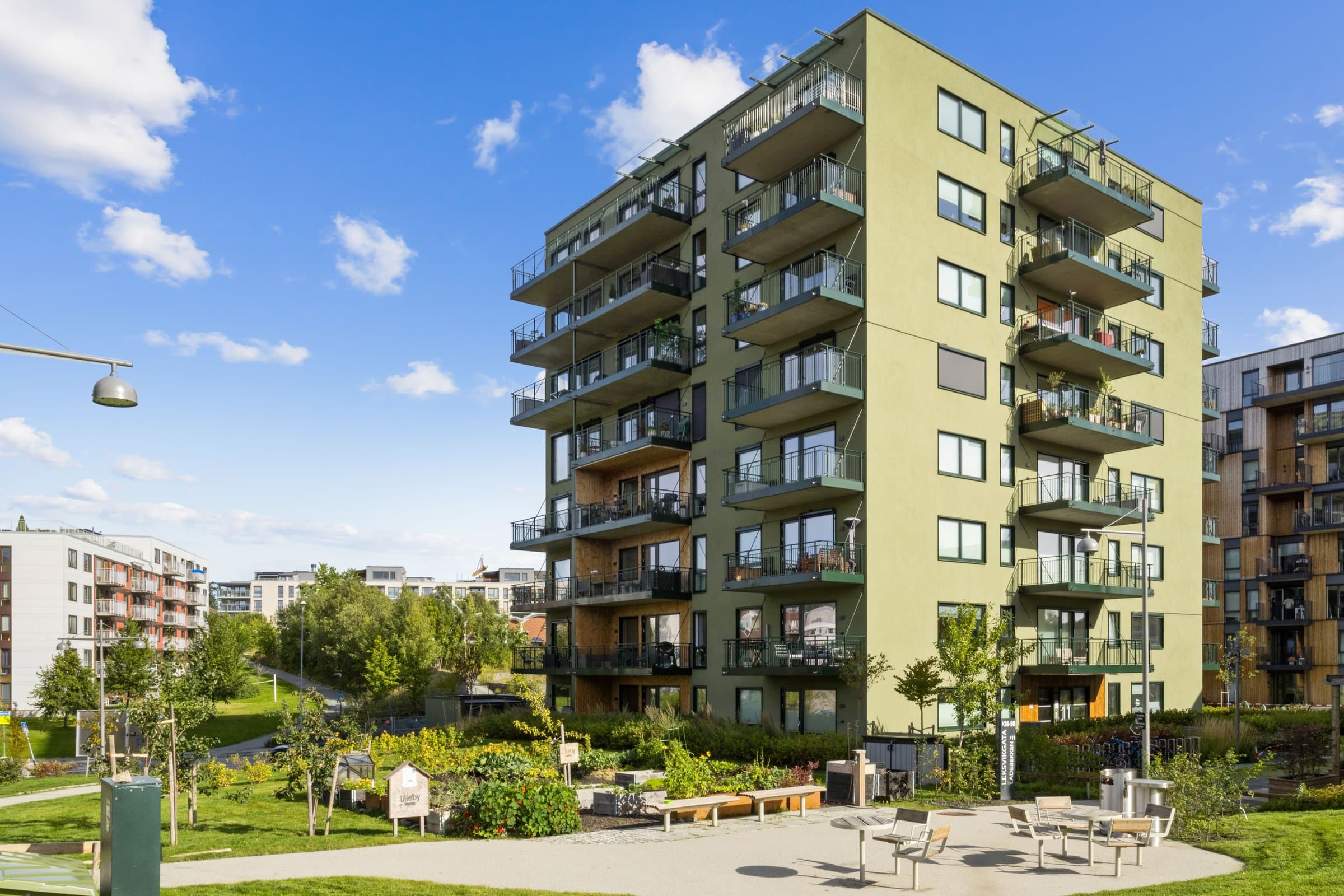 Tomtebeskrivelse Felles eiet tomt for sameiet. Tomteareal i følge Trondheim kommune. Regulerings og arealplaner Eiendommen ligger i et område som er omfattet av reguleringsplan for Lillebyområdet, planid r20030017, vedtatt 20.09.2013 . Området er regulert til boligformål og omhandler bl.a. (blokkbebyggelse og konsentrert småhusbebyggelse). Reguleringsplanen inneholder rekkefølgebestemmelser og krav til innhold i rammesøknad. Det er inngått utbyggingsavtale med kommune. Ferdigattest/ brukstillatelse Det foreligger midlertidig brukstillatelse for Ladebekken 11/ Verkstedgården 1 datert 02.06.2021. Midlertidig brukstillatelse er en tillatelse fra bygningsmyndighetene til å ta å ta hele eller deler av byggverket midlertidig i bruk før søknads pliktig tiltak er ferdigstilt og utførelsen er endelig avsluttet. At midlertidig brukstillatelse eksisterer gir ingen garanti for at det ikke er utført arbeid på boligen som ikke er bygge meldt eller godkjent. Det foreligger ikke ferdigattest for boligen. Arbeid som som gjenstår fram mot ferdigattest: . Ladebekken 13 "Verkstedgården 2" med tilhørende parkerings kjeller og uteområde . Rekkefølge krav i gjeldende reguleringsplan