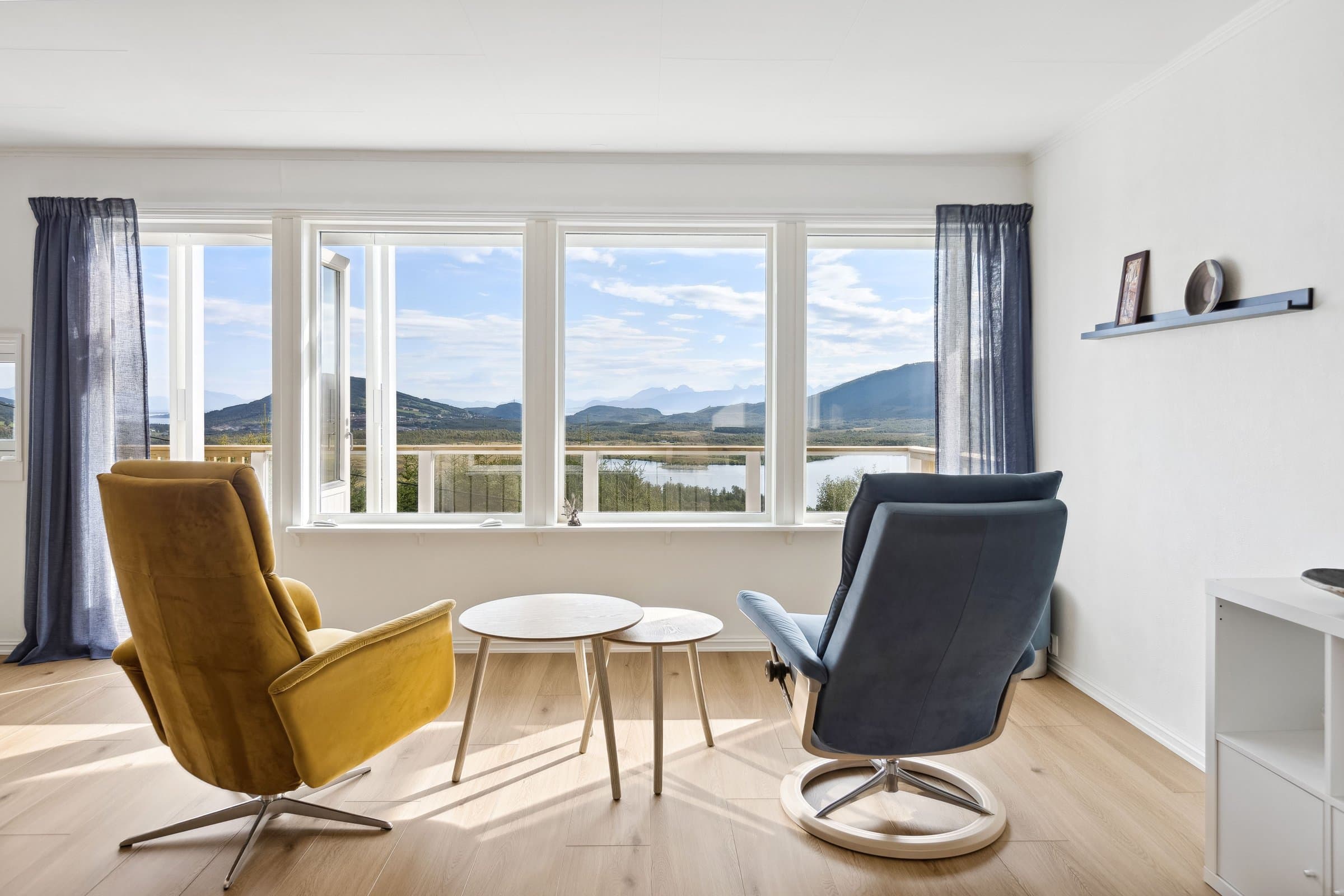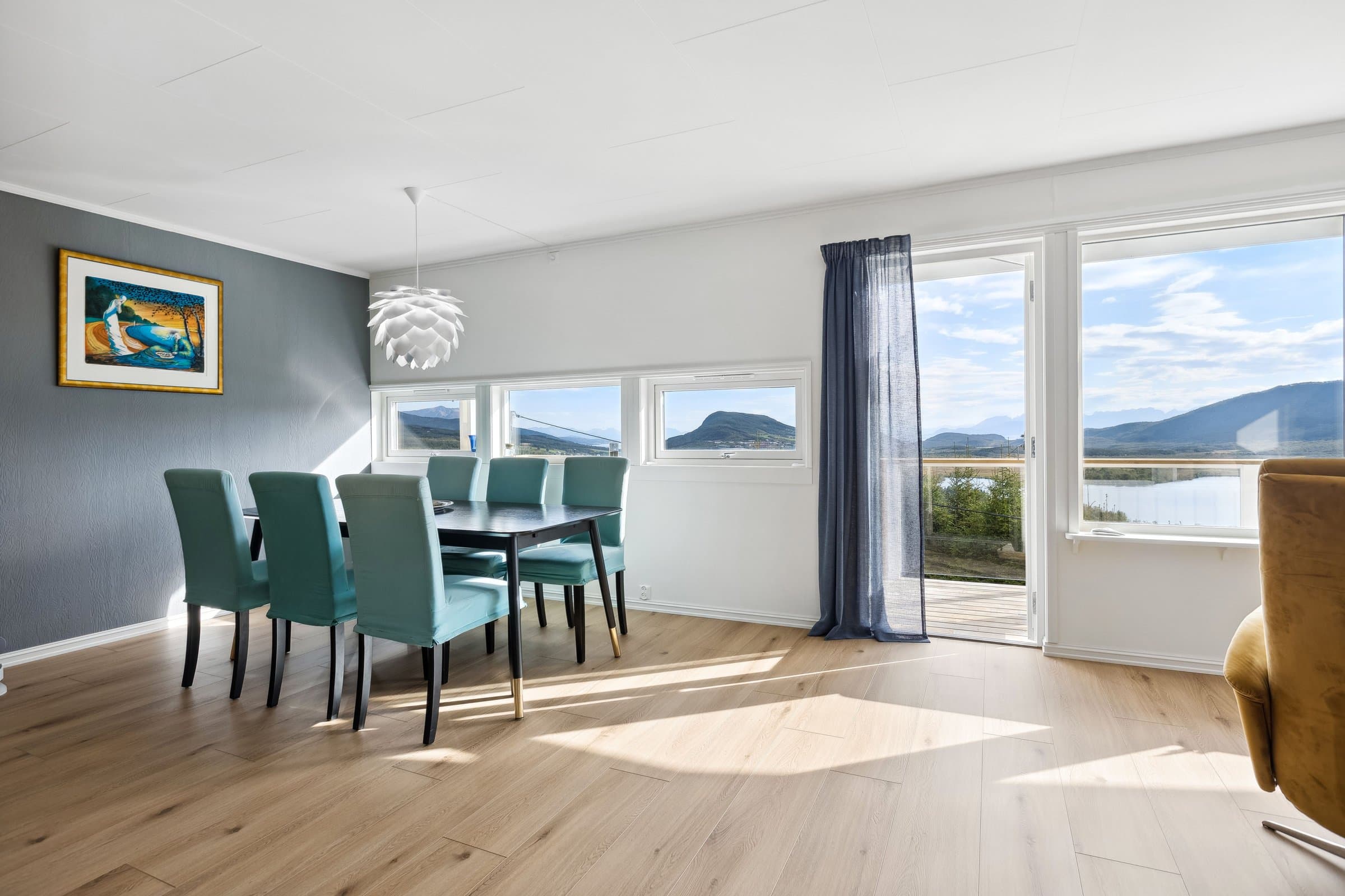 Eiendommen ligger i landlige og idylliske omgivelser, bare 13 km fra Harstad sentrum. Trivelig og rolig nabolag. Området har flotte tur- og friluftsområder, som kan benyttes hele året.