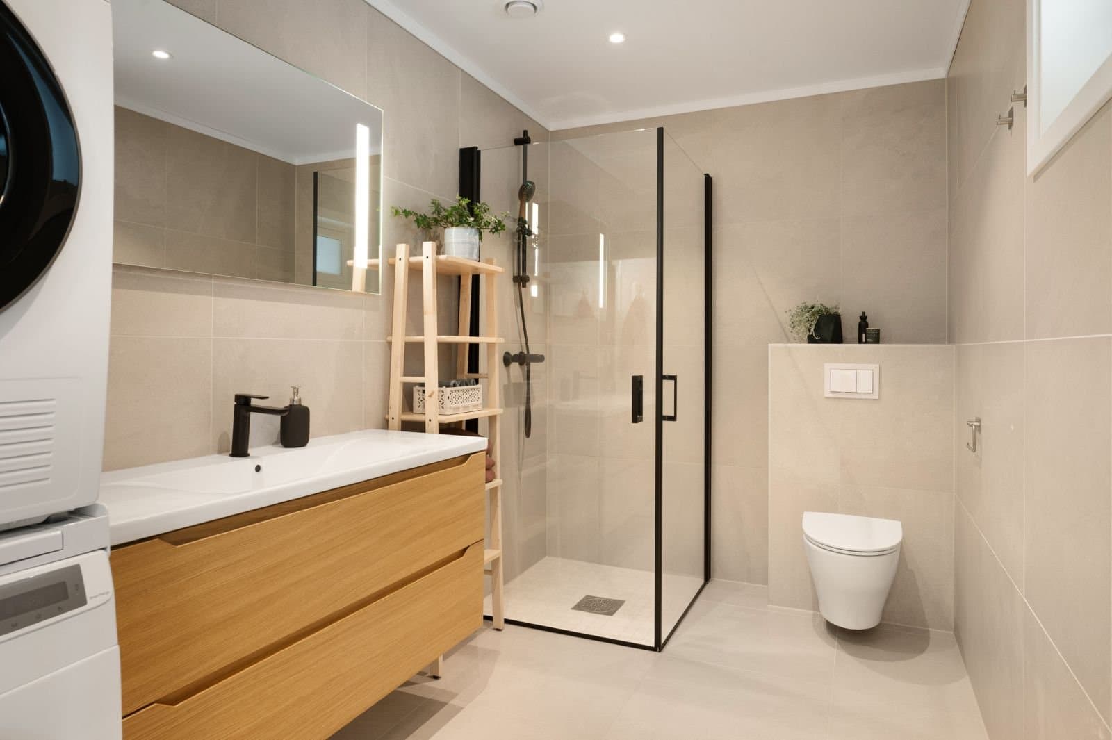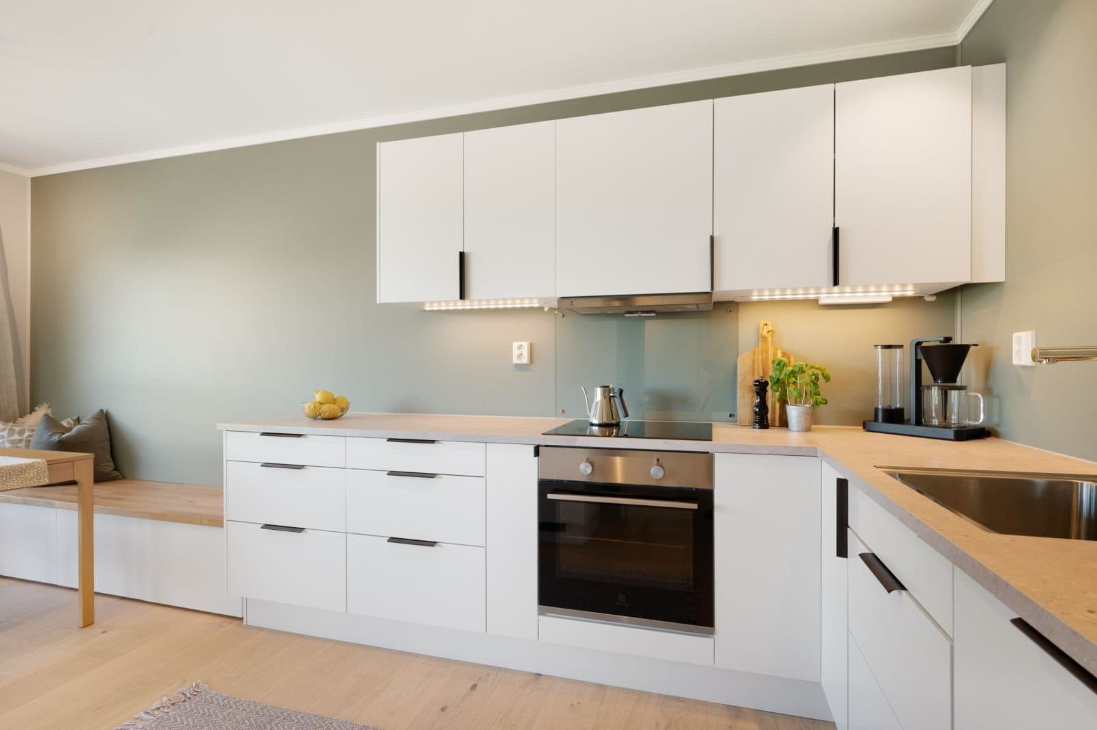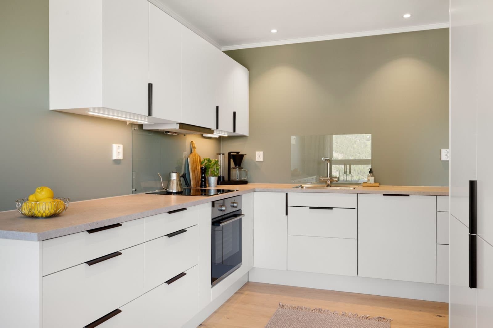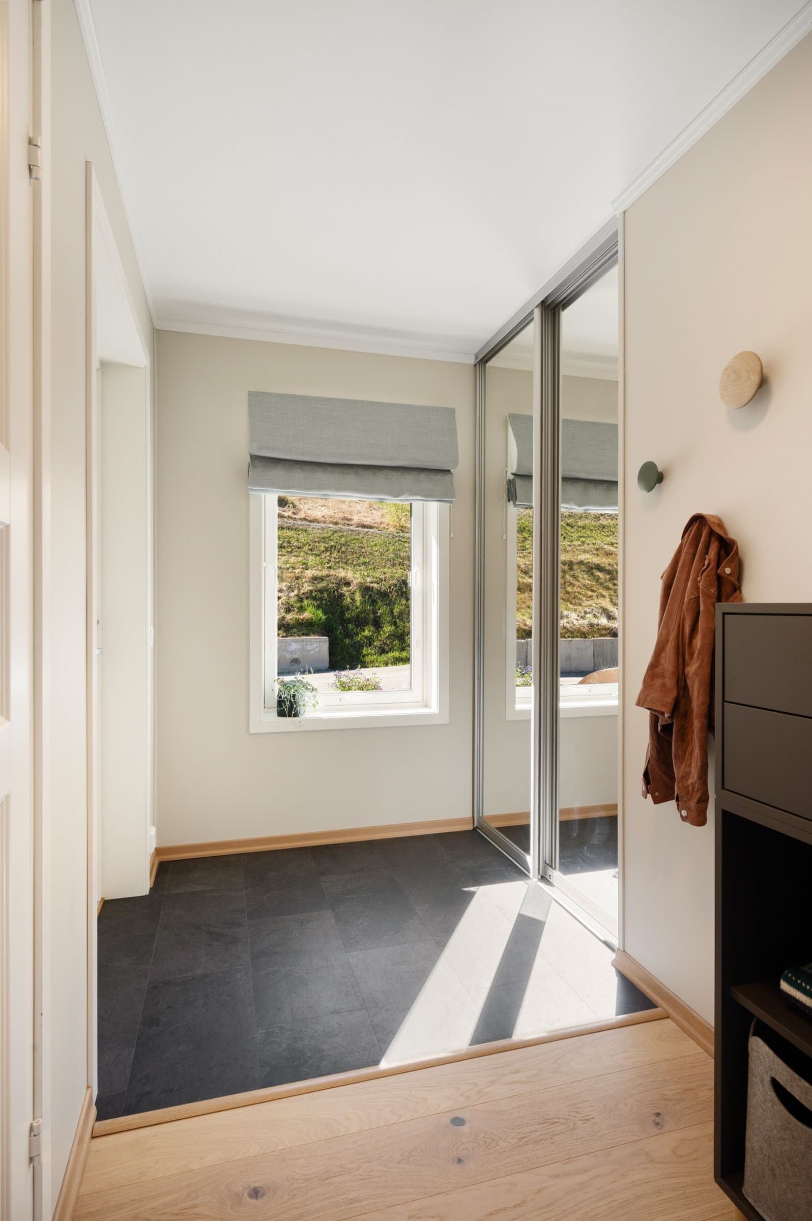 * Einstavs eikeparkett i stue, kjøkken og soverom. Vinylbelegg i entré og fliser på bad og teknisk rom. * Oppgradert baderomsinnreiing med ekstra stor servant og tilhørende praktiske skuffer * Moderne dusjdører og dusjarmatur * Kjøkken oppgradert med ekstra seksjon, praktiske kjøkkenskuffer, laminat benkeplate og glassplate bak platetopp og vask * Ekstra dimbare spotter i tak på kjøkken og bad + oppgraderte taklamper i alle rom * Oppgradert til røykvarslar i alle rom * To IKEA garderobeskap på hovudsoverom og spesialbestilt skyvedørsgarderobe med speil i entrè * Isolert og kledd bod * Elbil-lader * Screen montert på vindu i stue sumaren 2022 Leiligheita framstår ny med moderne og oppgraderte tilvalg og overflater. Ingen feil eller mangler, og fortsatt att fleire år på garantien for nybygg (ferdigstilt desember 2021).