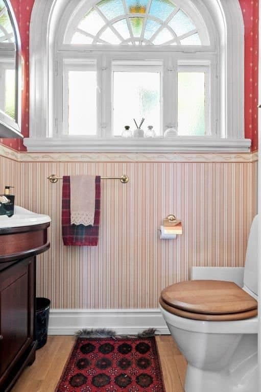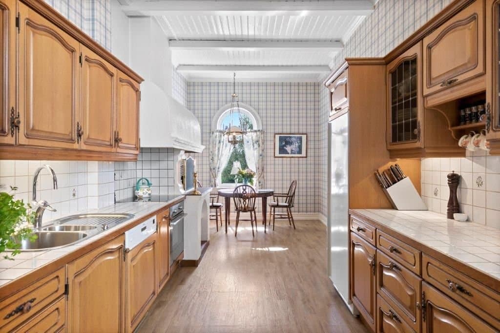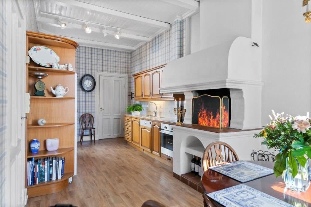 Eiendommen holder en gjennomgående god standard tross sin høye alder og er godt vedlikeholdt. Nåværende eiere har påkostet eiendommen gjennom flere år, dog slik at det meste av det originale er beholdt. Det er blant annet lagt inn vannbåren varme i gulvene, og det er lydhimling mot hyblene i underetasje. Entré Flott hall med mange originale detaljer. Nydelig listverk, buer, kullpeis og takrosett. Fra hallen er det direkte adkomst til alle rommene i etasjen, original trapp opp til 2.etg og adkomst til u.etg. Stue Det er 3 stuer i første etasje med plass-støpte rosetter. Spisestuen med vakkert brystpanel ligger nærmest kjøkkenet og de to rommene bindes sammen av en mellomgang med anretning. Fra spisestuen er det også utgang til hagen via en overbygget altan. En stor skyvedør åpner opp inn til salongen med store vinduer på to sider og en kakkelovn med vakre detaljer. Tv-stuen/biblioteket har plassbygde bokhyller og er koselig og mer intim, et deilig sted å trekke seg litt tilbake. Kjøkken Kjøkkenet har eikeinnredning fra 1990 tallet, med integrert platetopp, stekeovn og oppvaskmaskin. Nydelig peis/grue og koselig spiseplass. Bak kjøkkenet er det spiskammer/bod og "tjenesteinngang". Bad Hovedbadet som ligger i 2.etg ble pusset opp i starten av 1990-tallet. Det er et stort familiebad med badekar, dusjkabinett, wc, bide og to servanter. Badet er automatisk gitt TG 3 pga alder og må brukes med lukket system slik det gjøres i dag, dvs at det ikke dusjes rett på flis. Utenfor badet er det eget garderoberom. Gjeste-toalett ved hallen i 1.etg.