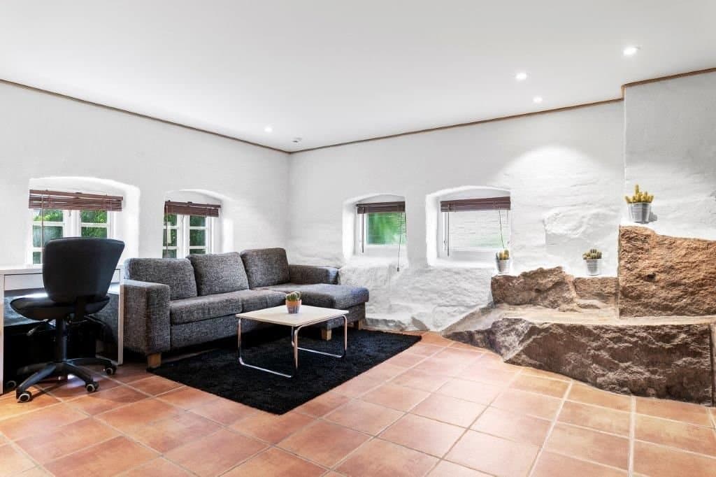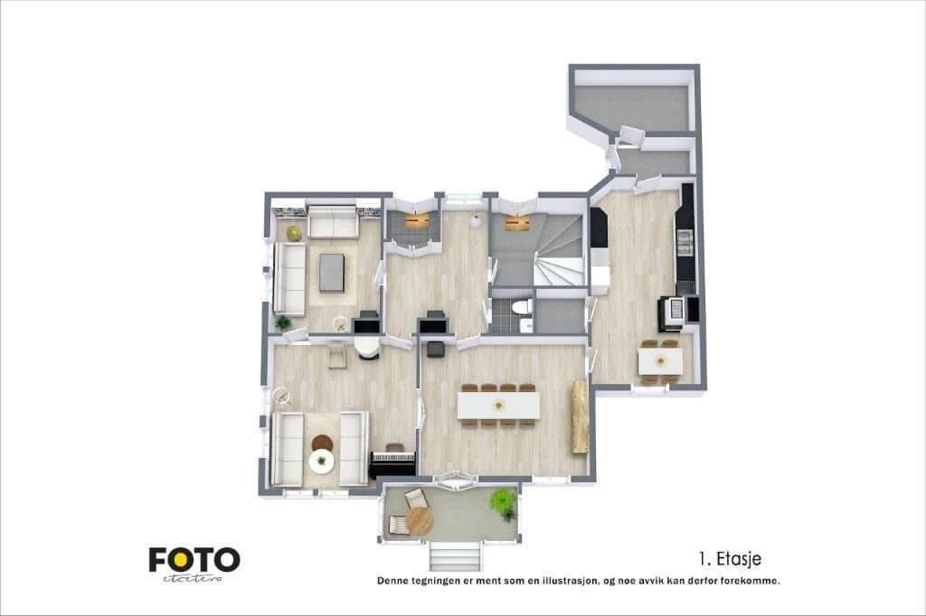 1.etg.: Entré, hall, wc, kjøkken, anretning, tv-stue/bibliotek, to stuer, overbygd veranda og bod. 2.etg.: Hall, bad, garderoberom, balkong til knyttet masterbedroom, 3 soverom, 1 stue/soverom og bod. U.etg.: Gang, vaskerom, boder og 2 soverom med hvert sitt bad/kjøkken.