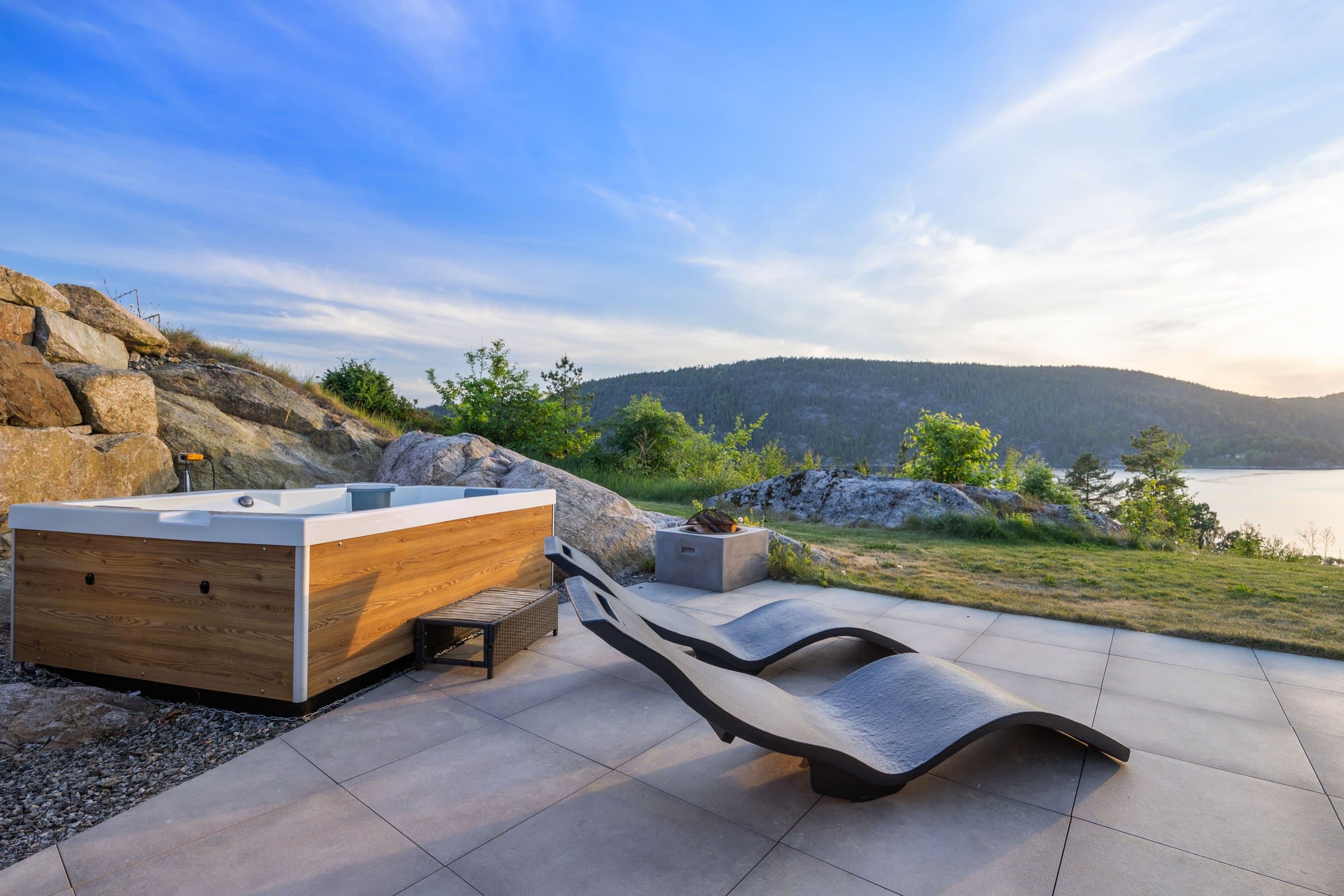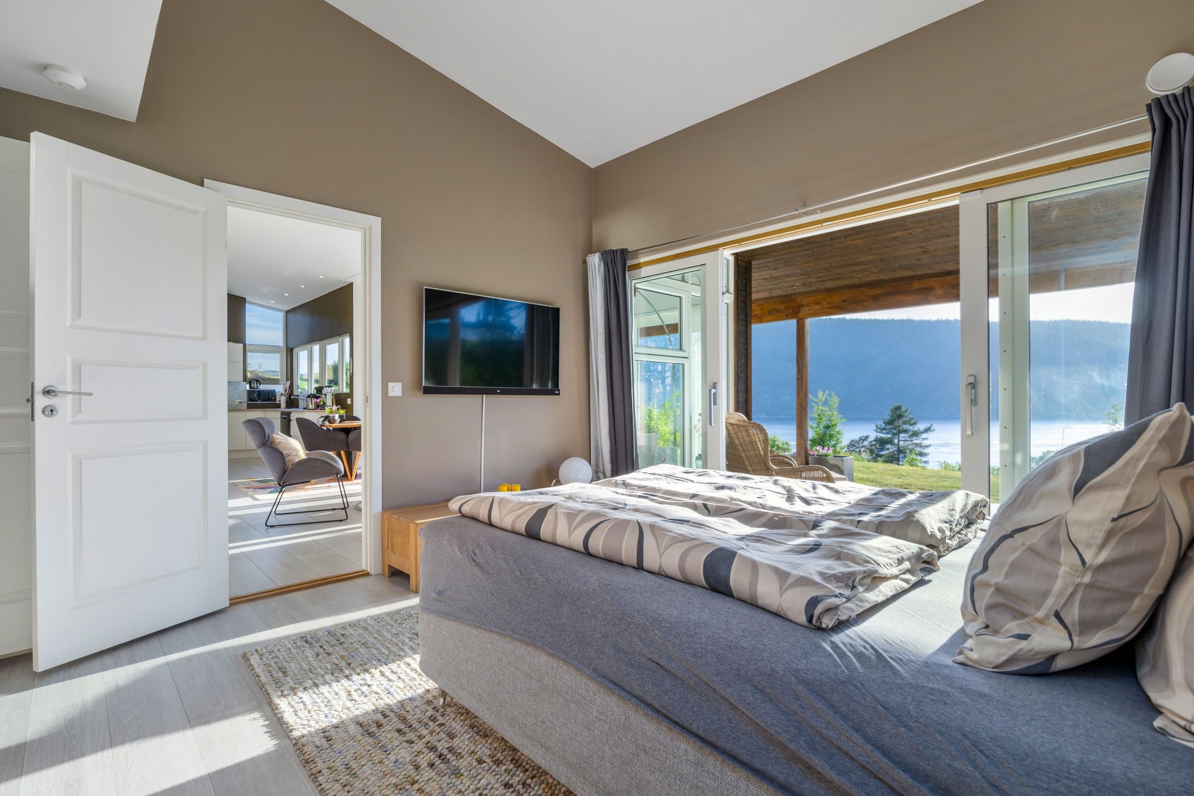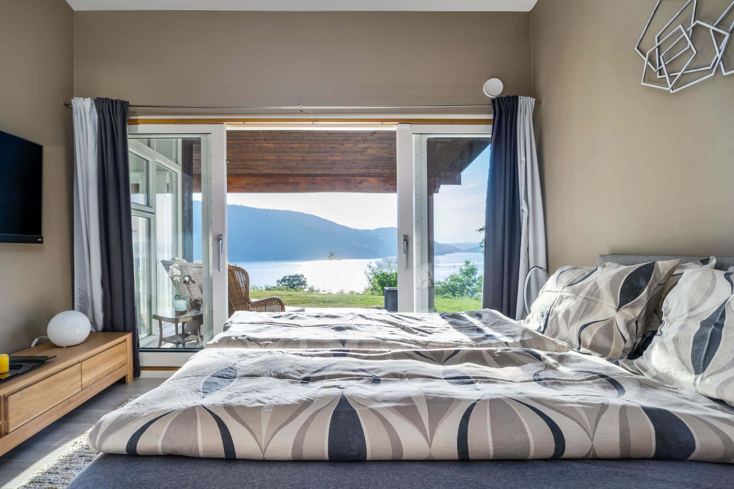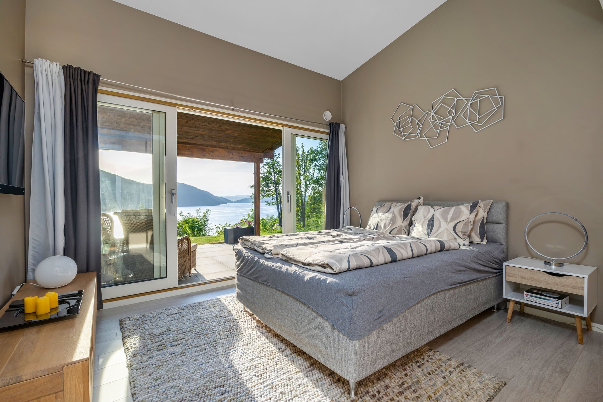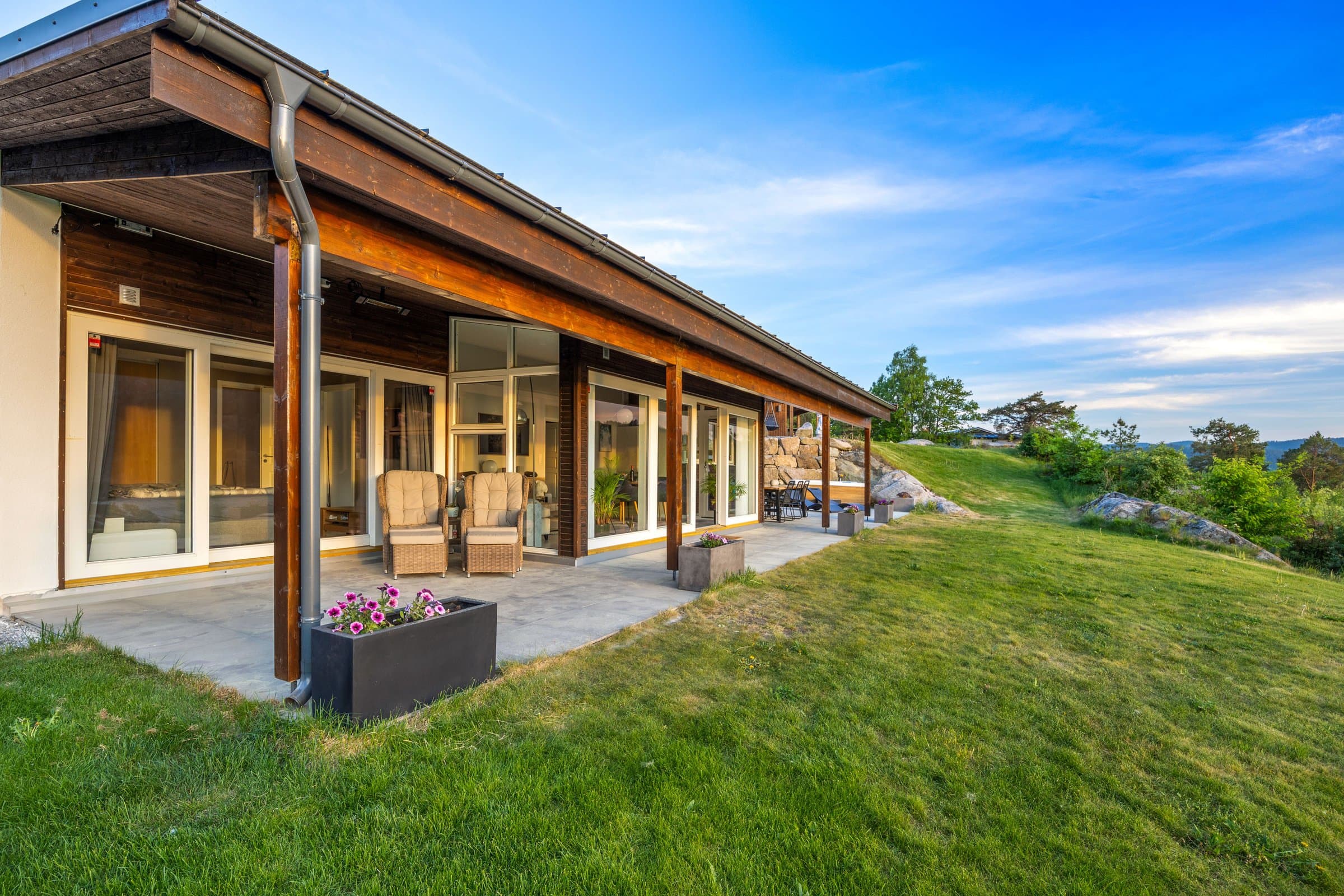 Funkishytte fra 2020 | Panoramautsikt | 14 sengeplasser | Gulvareal på ca. 120 m² | Båtplass | Inkl. møbler
