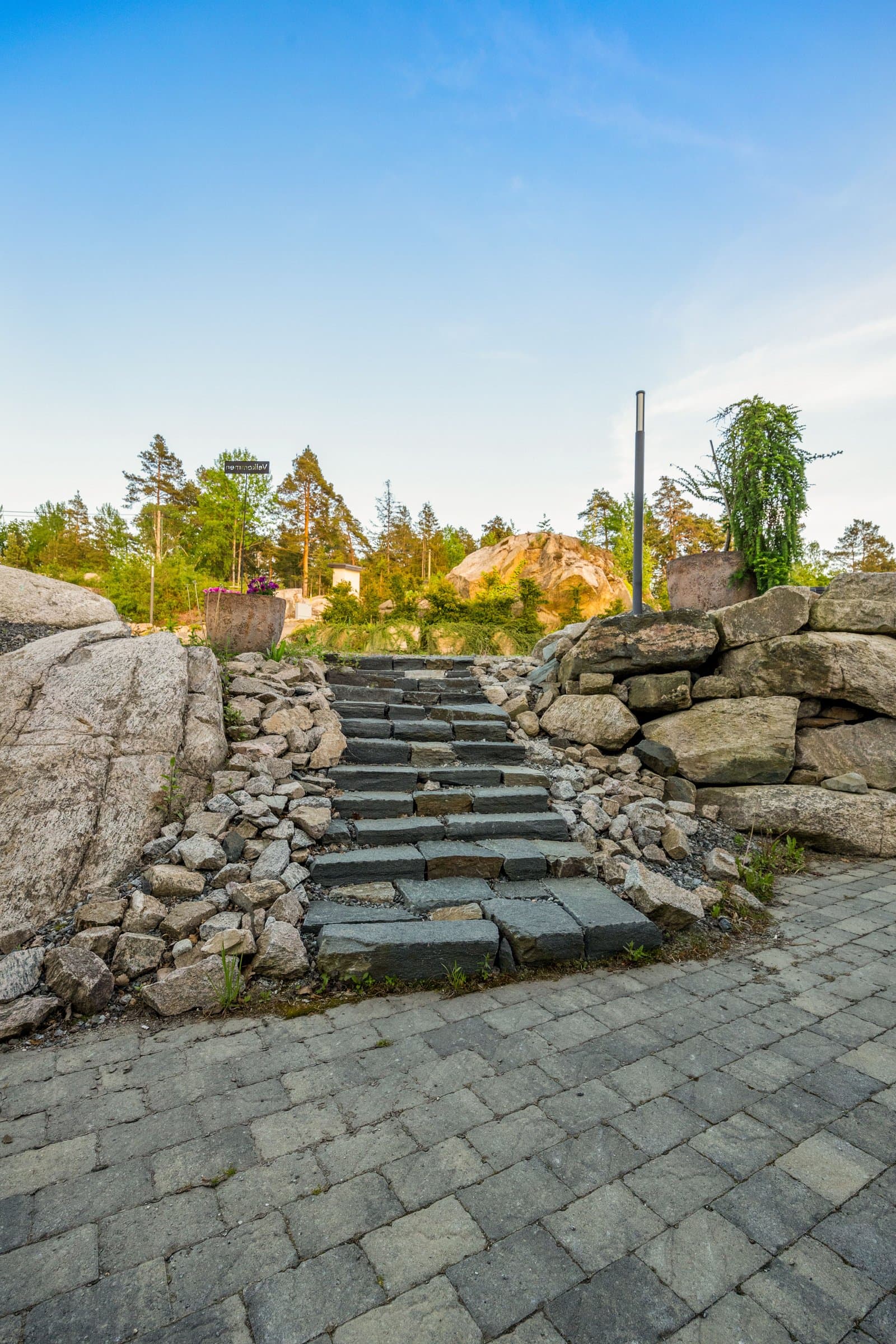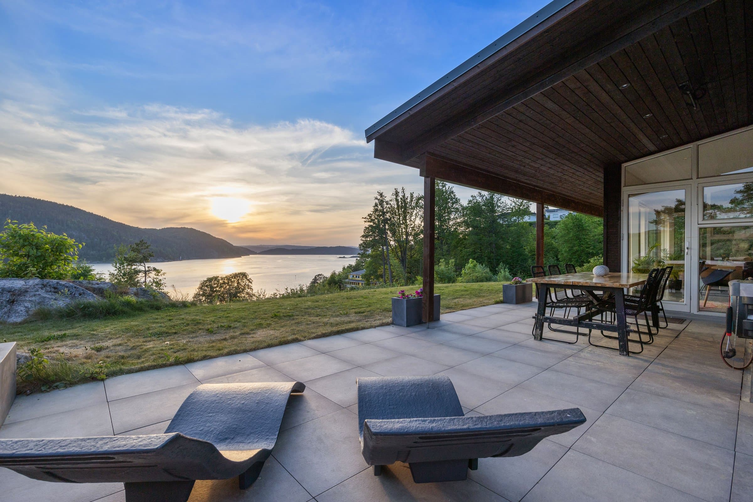 Eiendommen ligger høyt og vestvendt til med en nær og flott fjordutsikt til Oslofjorden. Tomten er på ca. 1 868 kvm og flott opparbeidet med steinmur, støpt og flislagt platting på markterrassen, plenområder med ferdiglagt gressplen, samt diverse beplantning. Skjermet og fin hage med god plass til flere møbleringsmuligheter.