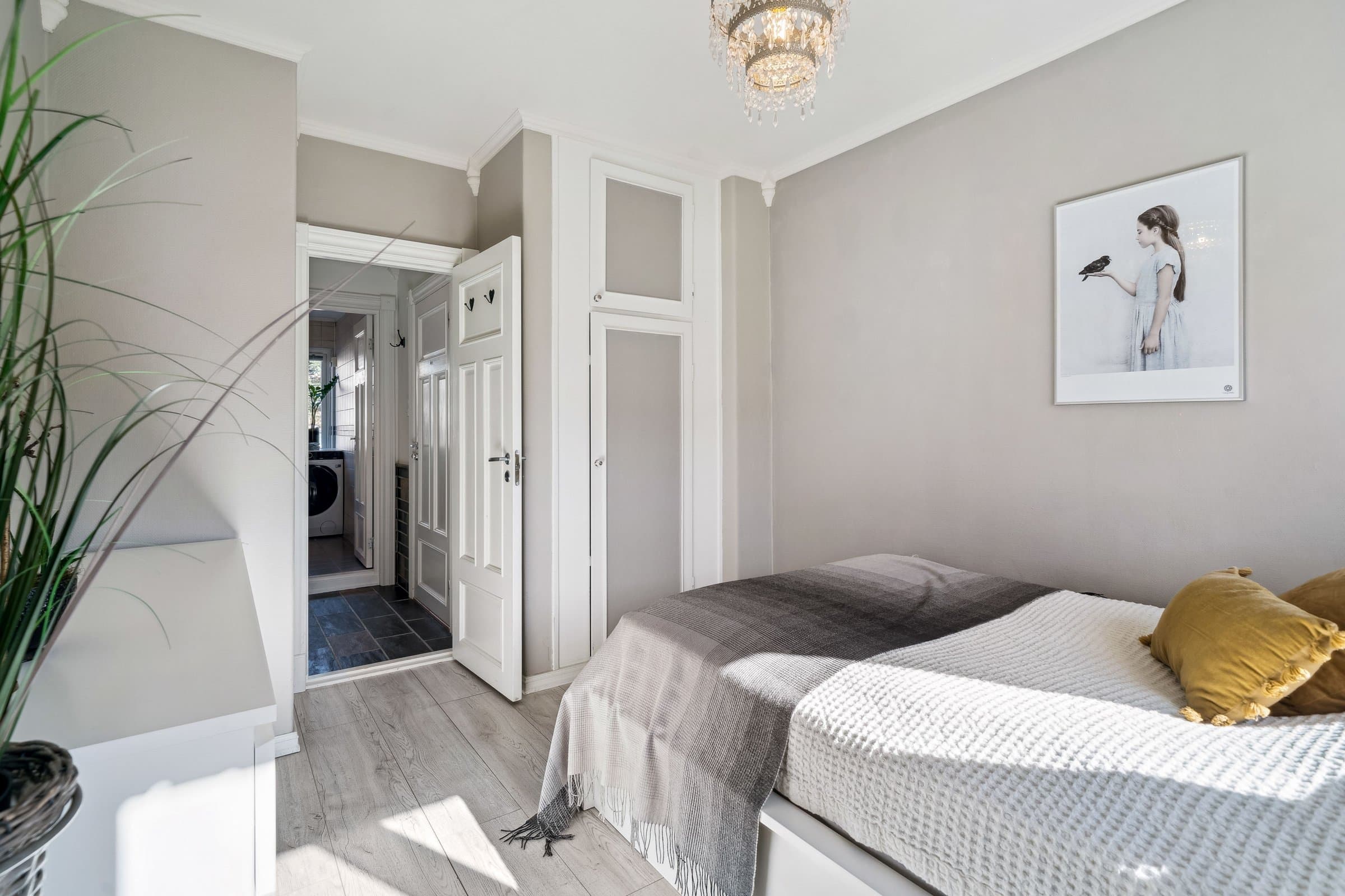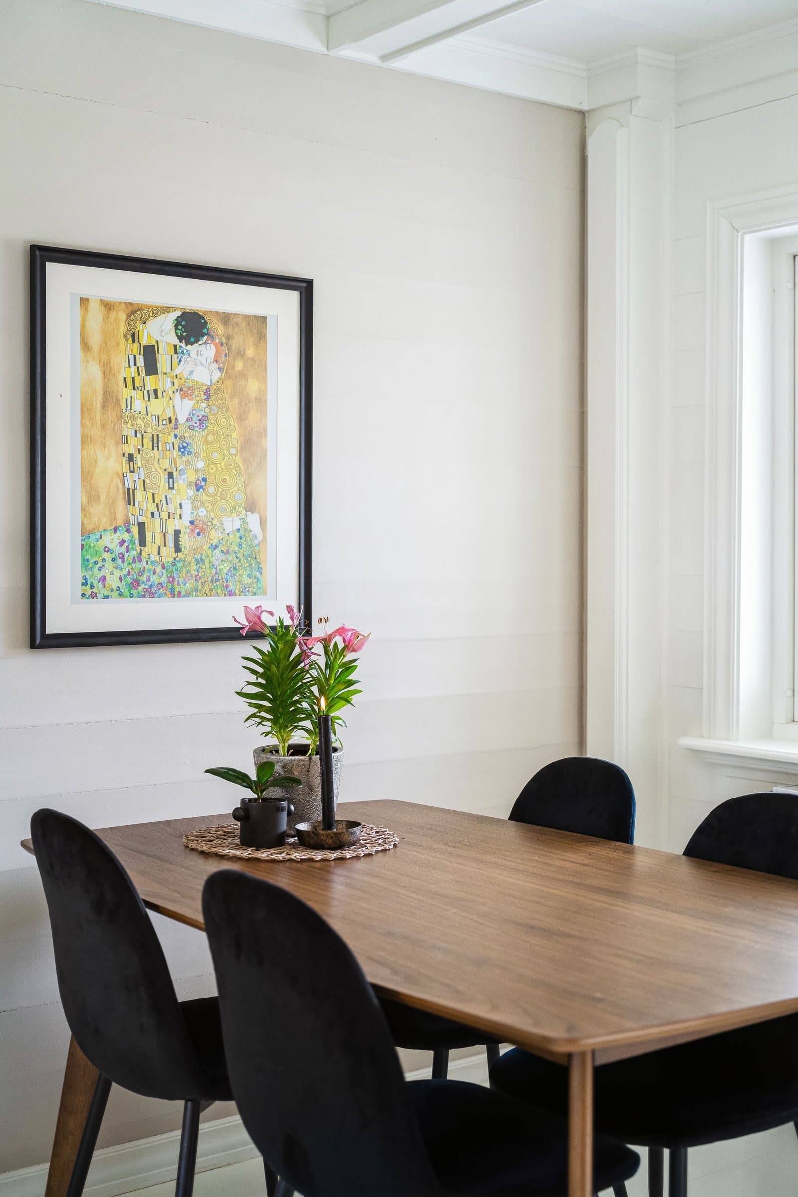Bad- Pent bad med behagelig varme i gulv og flislagte overflater på gulv og vegger. Gulvfestet toalett, speil med overliggende belysning, heldekkende servant med to store skuffer for oppbevaring. Dusjhjørne med leddede dører, downlights i himling og opplegg for vaskemaskin. På endeveggen er det vindu for ekstra lys og lufting. Varmekabler, fliser, slukrister, termostat og dusjdører fra 2018. Soverom- Leiligheten har to luftige, gode soverom som ligger i hver sin ende. Rommene er malt i delikate farger og har laminatgulv. På hovedsoverommet er det en hel vegg med oppbevaring bak forheng, god plass til dobbeltseng og nattbord. Det mindre soverommet er også av god størrelse og har et praktisk plassbygd skap til ekstra oppbevaring. Begge rommene vender ut mot fine fellesområder. Det ene mot en rolig felles hage. Bod- Leiligheten disponerer en stor kjellebod på 11 kvm. og en loftsbod på 5 kvm.med et gulvareal på 12 kvm. (pga. skråvegger). I kjellerboden er det montert stikk, hyller og skap til oppbevaring av klær. Overflater på innvendig gulv - Skiferfliser i entrè og keramiske fliser på bad. Laminatgulv i det minste soverommet og hvitmalt laminatgulv i de øvrige rom. Overflater på innvendige vegger - Keramiske fliser på bad og dels skiferfliser i entrè. Malt trepanel i spisestue, ellers malt glassfiberstrie i øvrige rom. Overflater på innvendig himling - Trepanel i entrè og spisestue, ellers malte flater i øvrige rom. Downlights på bad og i spisestue. Downlightskasser i stue og falske bjelker i spisestue. Leiligheten preges av møbelsnekkrede løsninger som gir et spesielt sjarmerende inntrykk. Overtakelse etter nærmere avtale. Det gjøres oppmerksomt på at det kreves styrets godkjennelse av kjøper. Eiendommen kan ikke overtas før styregodkjenning foreligger. Velkommen til hyggelig visning!
