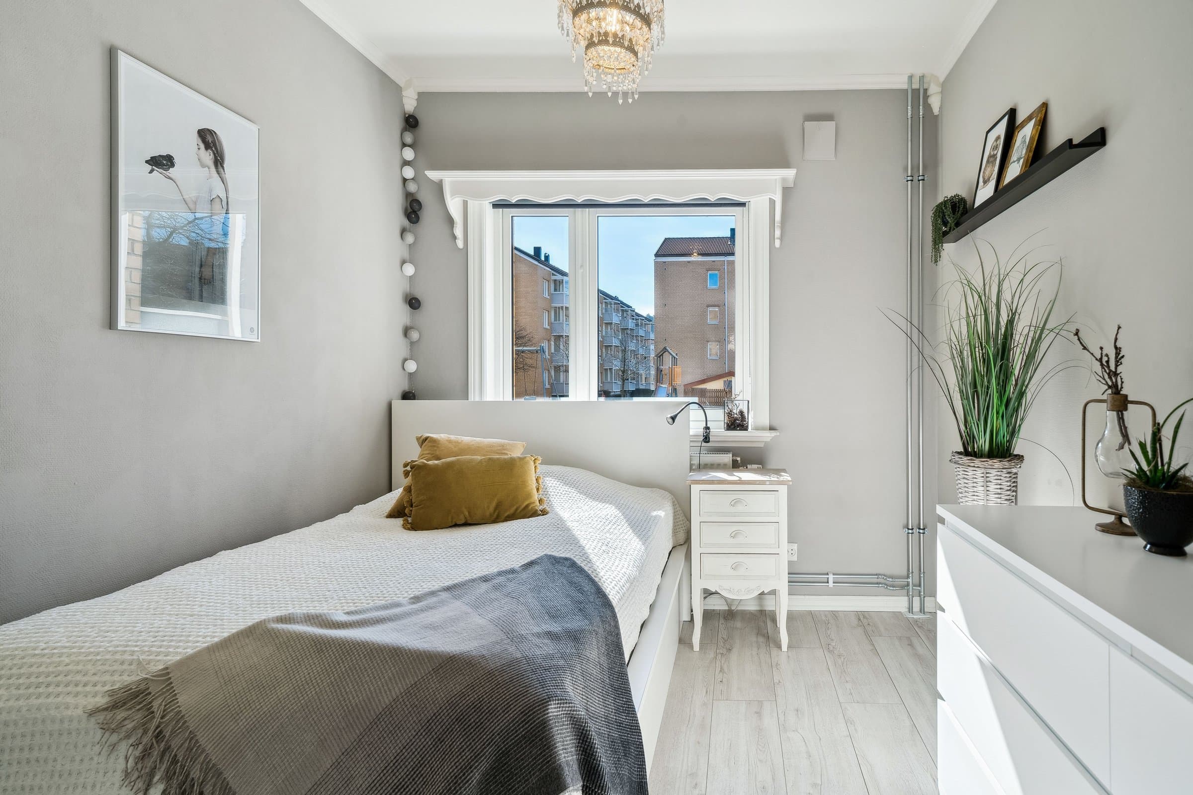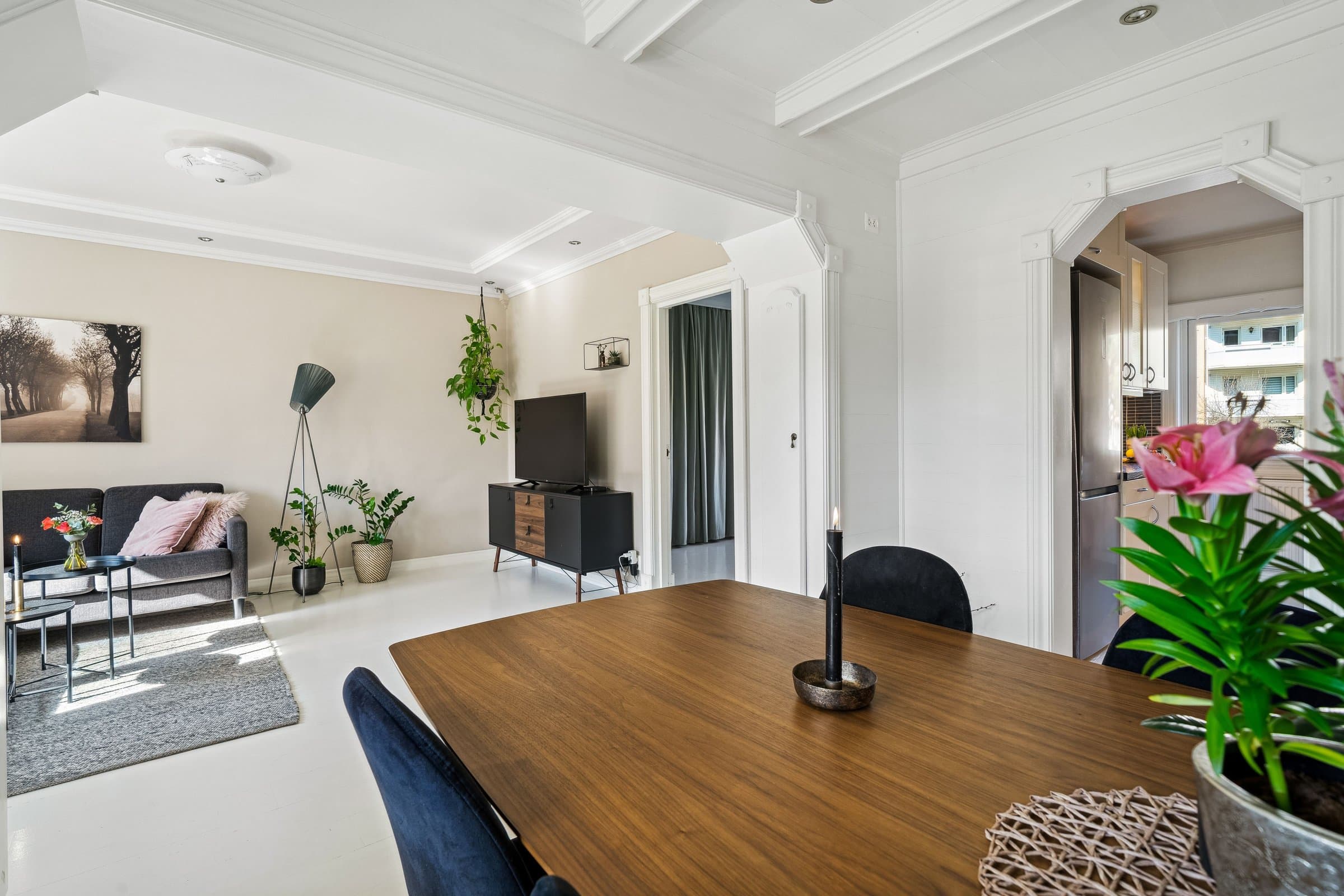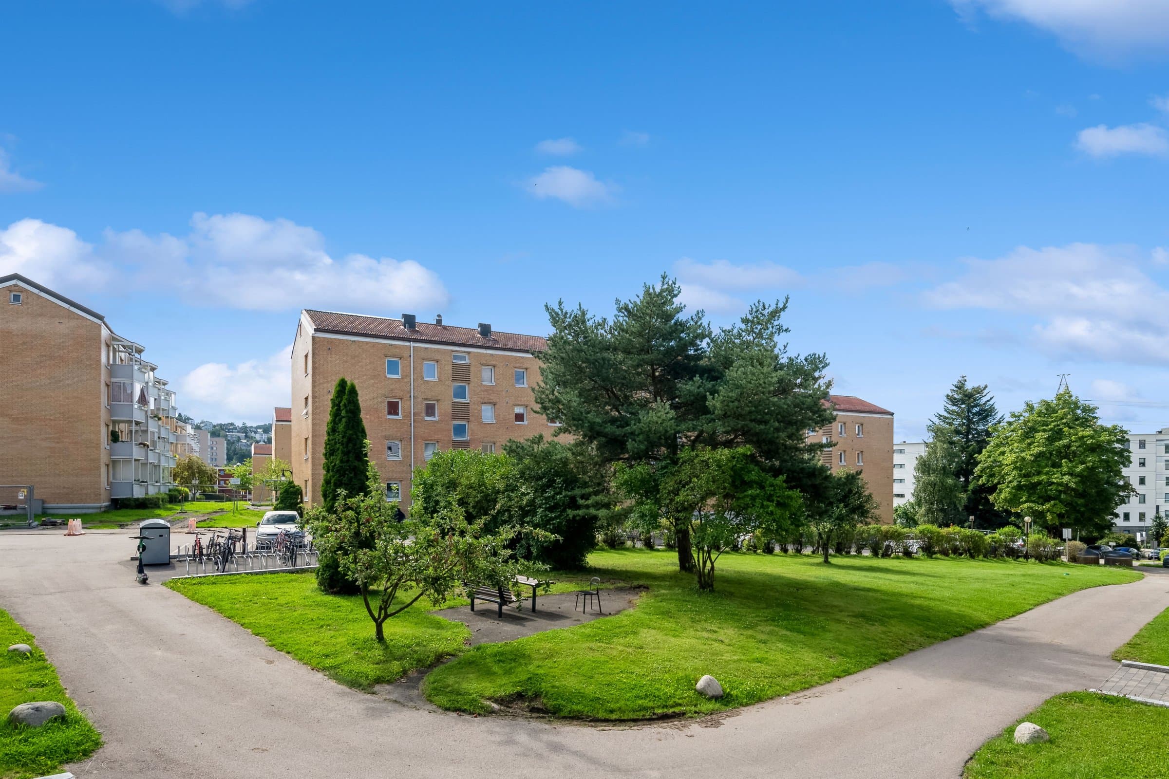 Entrè- Velkommen inn i ditt nye hjem. Leiligheten ligger i høy 1.etasje med adkomst via felles trappeoppgang. Inngangspartiet foran blokken ble pusset opp i 2020 med ny brostein og sykkelstativ. Vel innenfor dørkarmen er det skiferfliser på gulv med gulvvarme og lysmalte vegger. Det er plass til sko og henge fra seg yttertøy. Her er det også lagringsplass i et plassbygget skap. Stue- Nymalte flater i lune farger og utgang til balkong med fint utsyn. En innbydende og koselig stue med lysmalte laminatgulv og downlightskasser langs takene. Den gode utformingen på rommet gir fine soner for møblering og det er plass til både sofagruppe, tv-møblement i tillegg til egen sone for spisestue. I spisestuen er det nedsenket himling med downlights. Stuen legger til rette for avslapping og familiehygge. De store vindusflatene slipper inn godt med lys og den gode takhøyden på 250 cm skaper en luftig atmosfære. Balkong- Solrik balkong på 9 kvm som vender mor sørøst. Balkongens størrelse gir mulighet for sitte- og spisegruppe. Balkongen er lunt inntrukket, har overbygg og dekke på gulv. På den måten er balkongen en fin forlengelse av stuen på sommerstid, i tillegg gir den deg mulighet for å ha utemøblene stående hele året. Kjøkken- Pen innredning i adskilt løsning med god skap- og benkeplass. Kjøkkeninnredning med lyse klassiske fronter og benkeplater i laminat med nedfelt oppvaskkum merke Franke i silgranitt (2018) med 1-greps blandebatteri. Over benken er det benkebelysning og fliseimitert respatexplater som står i stil med rommet. På en side er det et overskap med glass dører og downlights. Hvitevarer som komfyr (2022), oppvaskmaskin (2022) og kjøl/fryseskap (2025) medfølger boligen ved salg. Over kokesonen er det ventilator med kullfilter (2022) og på endeveggen er det et vindu som slipper inn rikelig med dagslys. På kjøkkenet er det porttelefon med kamera med ekstra stor skjerm.