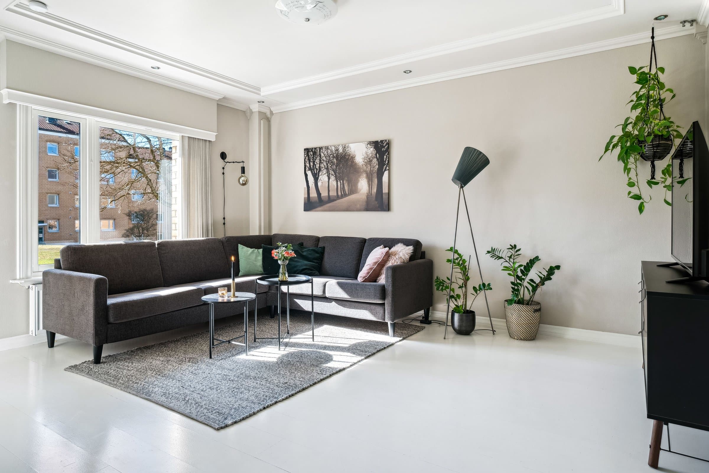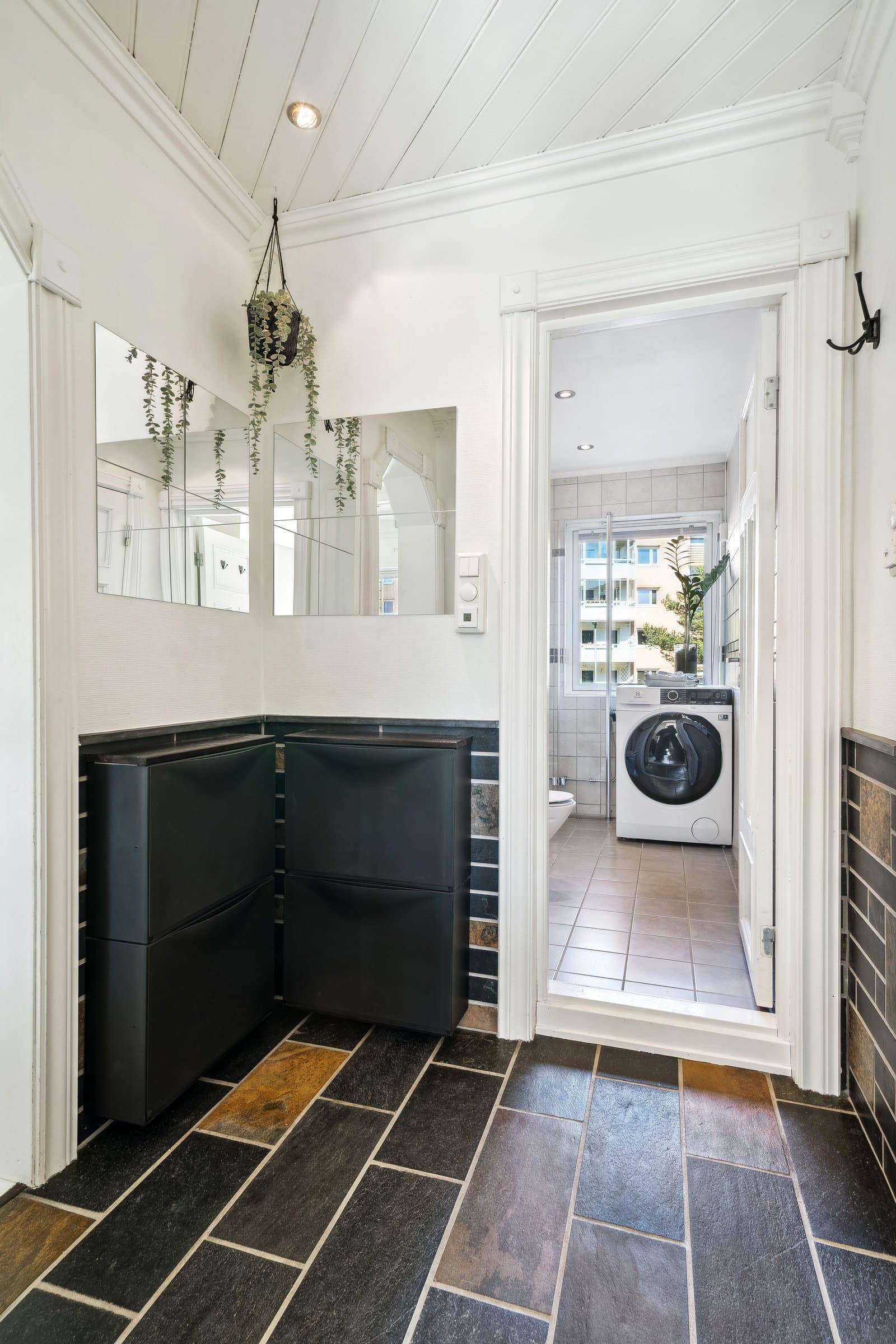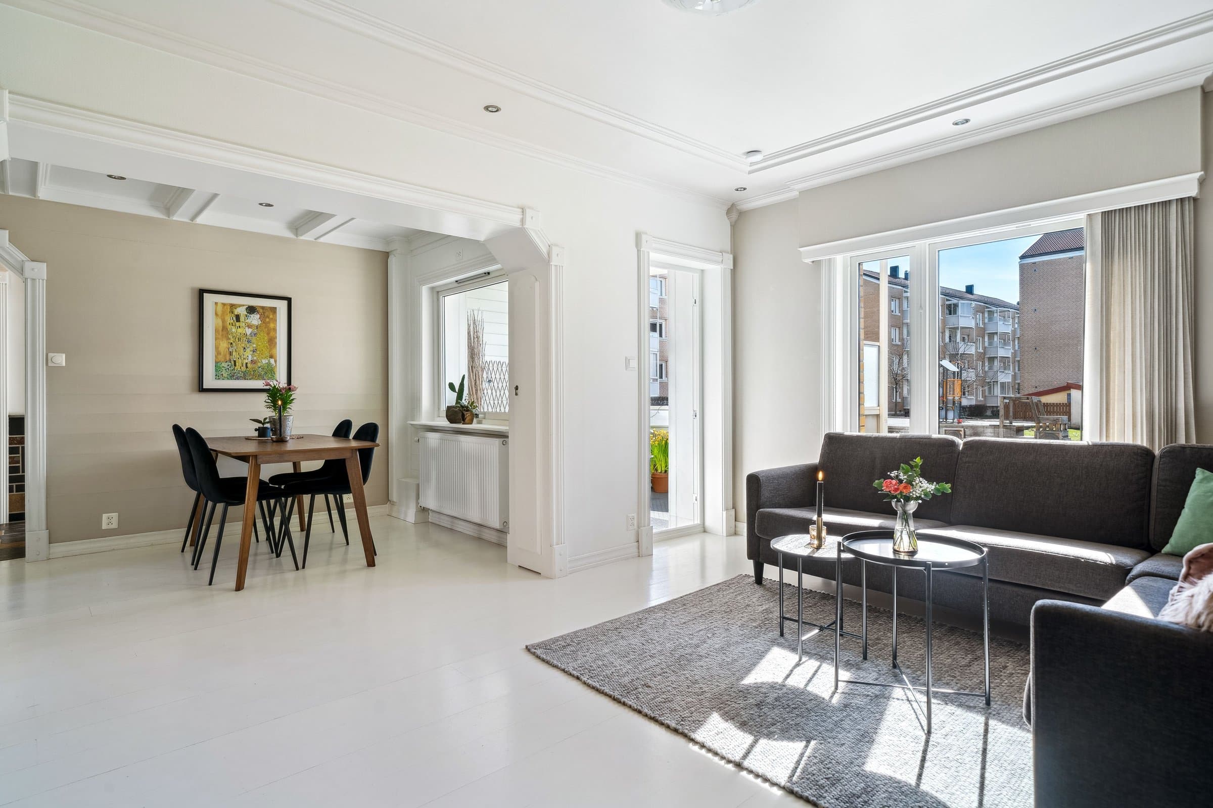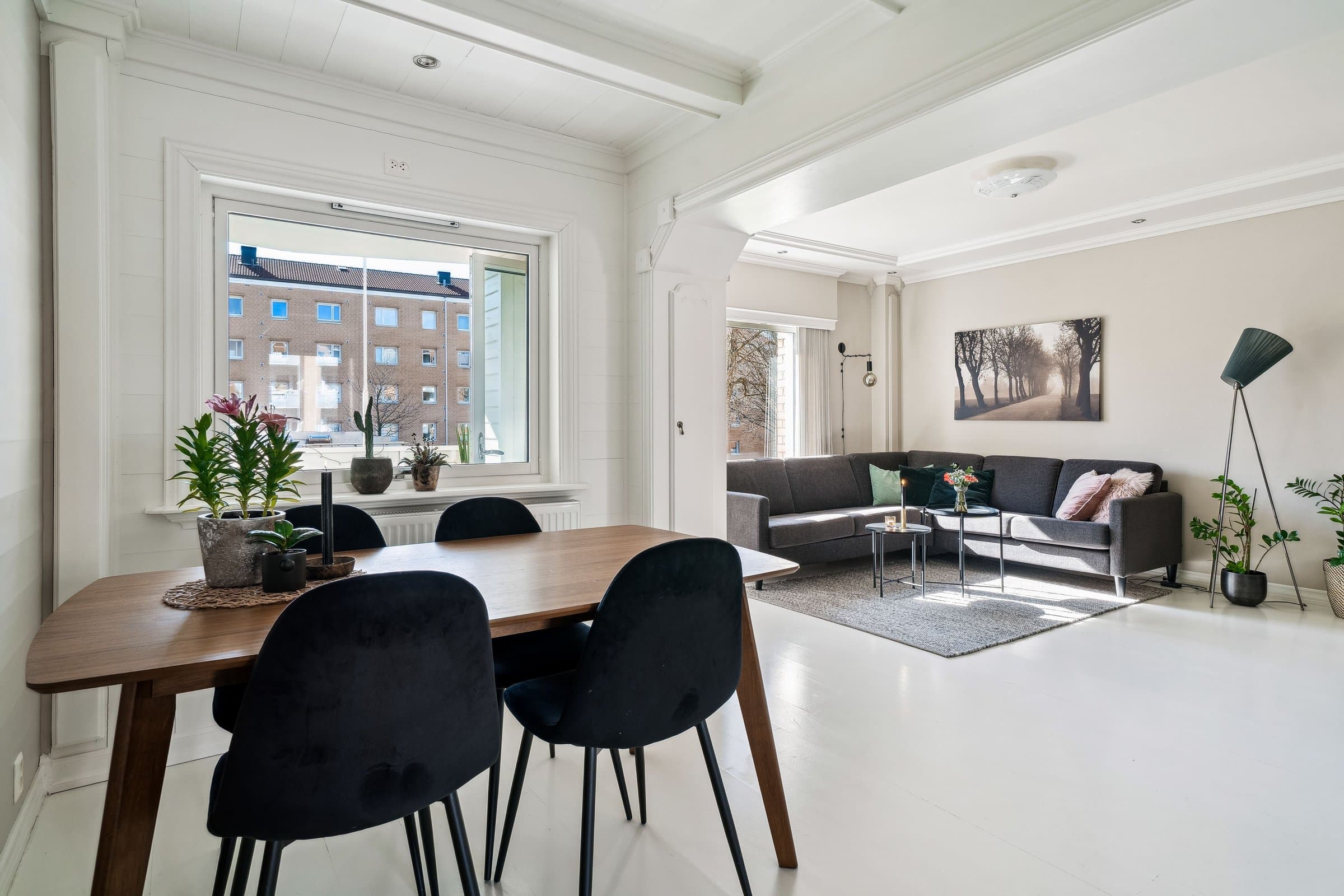 Entrè- Velkommen inn i ditt nye hjem. Leiligheten ligger i høy 1.etasje med adkomst via felles trappeoppgang. Inngangspartiet foran blokken ble pusset opp i 2020 med ny brostein og sykkelstativ. Vel innenfor dørkarmen er det skiferfliser på gulv med gulvvarme og lysmalte vegger. Det er plass til sko og henge fra seg yttertøy. Her er det også lagringsplass i et plassbygget skap. Stue- Nymalte flater i lune farger og utgang til balkong med fint utsyn. En innbydende og koselig stue med lysmalte laminatgulv og downlightskasser langs takene. Den gode utformingen på rommet gir fine soner for møblering og det er plass til både sofagruppe, tv-møblement i tillegg til egen sone for spisestue. I spisestuen er det nedsenket himling med downlights. Stuen legger til rette for avslapping og familiehygge. De store vindusflatene slipper inn godt med lys og den gode takhøyden på 250 cm skaper en luftig atmosfære. Balkong- Solrik balkong på 9 kvm som vender mor sørøst. Balkongens størrelse gir mulighet for sitte- og spisegruppe. Balkongen er lunt inntrukket, har overbygg og dekke på gulv. På den måten er balkongen en fin forlengelse av stuen på sommerstid, i tillegg gir den deg mulighet for å ha utemøblene stående hele året. Kjøkken- Pen innredning i adskilt løsning med god skap- og benkeplass. Kjøkkeninnredning med lyse klassiske fronter og benkeplater i laminat med nedfelt oppvaskkum merke Franke i silgranitt (2018) med 1-greps blandebatteri. Over benken er det benkebelysning og fliseimitert respatexplater som står i stil med rommet. På en side er det et overskap med glass dører og downlights. Hvitevarer som komfyr (2022), oppvaskmaskin (2022) og kjøl/fryseskap (2025) medfølger boligen ved salg. Over kokesonen er det ventilator med kullfilter (2022) og på endeveggen er det et vindu som slipper inn rikelig med dagslys. På kjøkkenet er det porttelefon med kamera med ekstra stor skjerm.