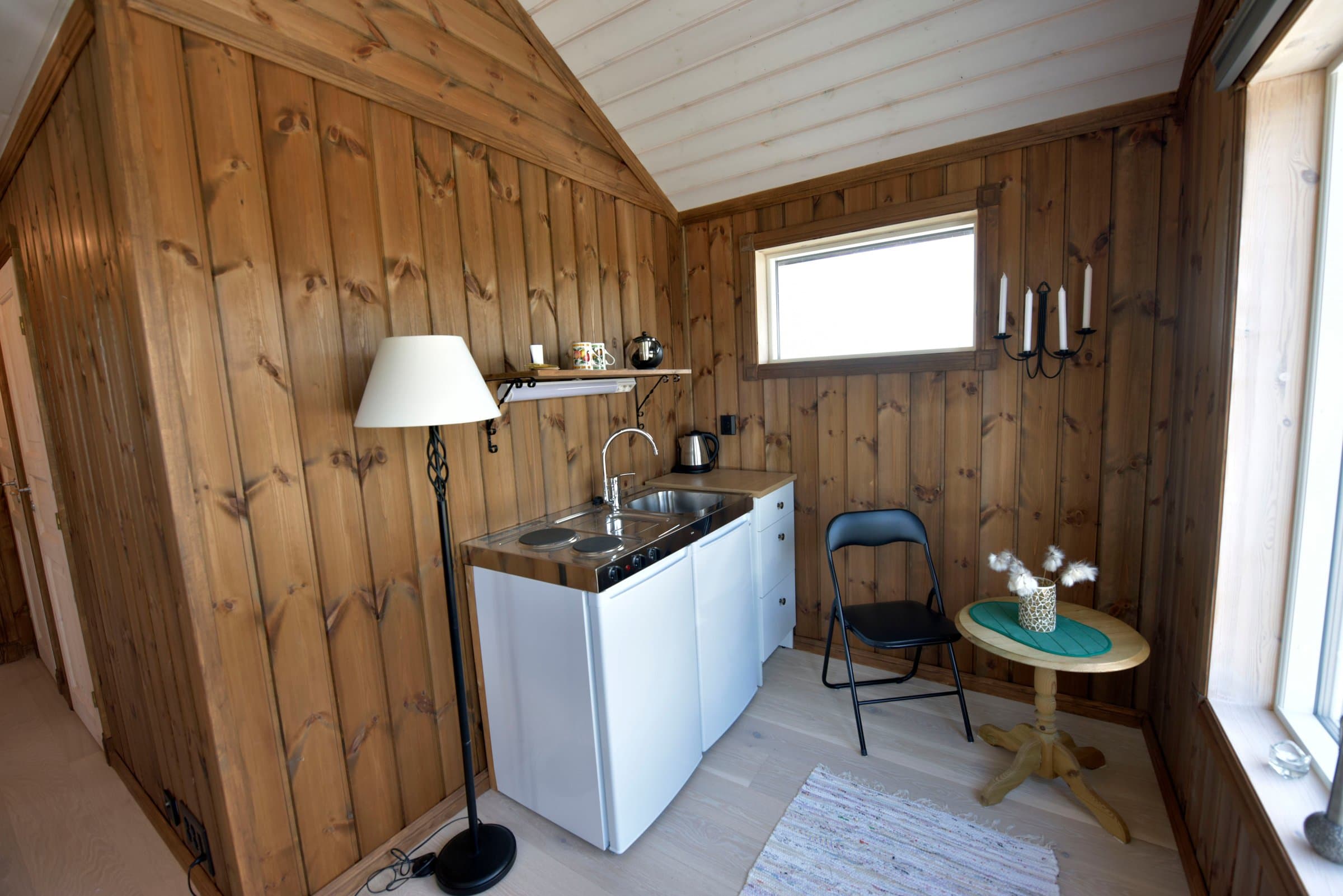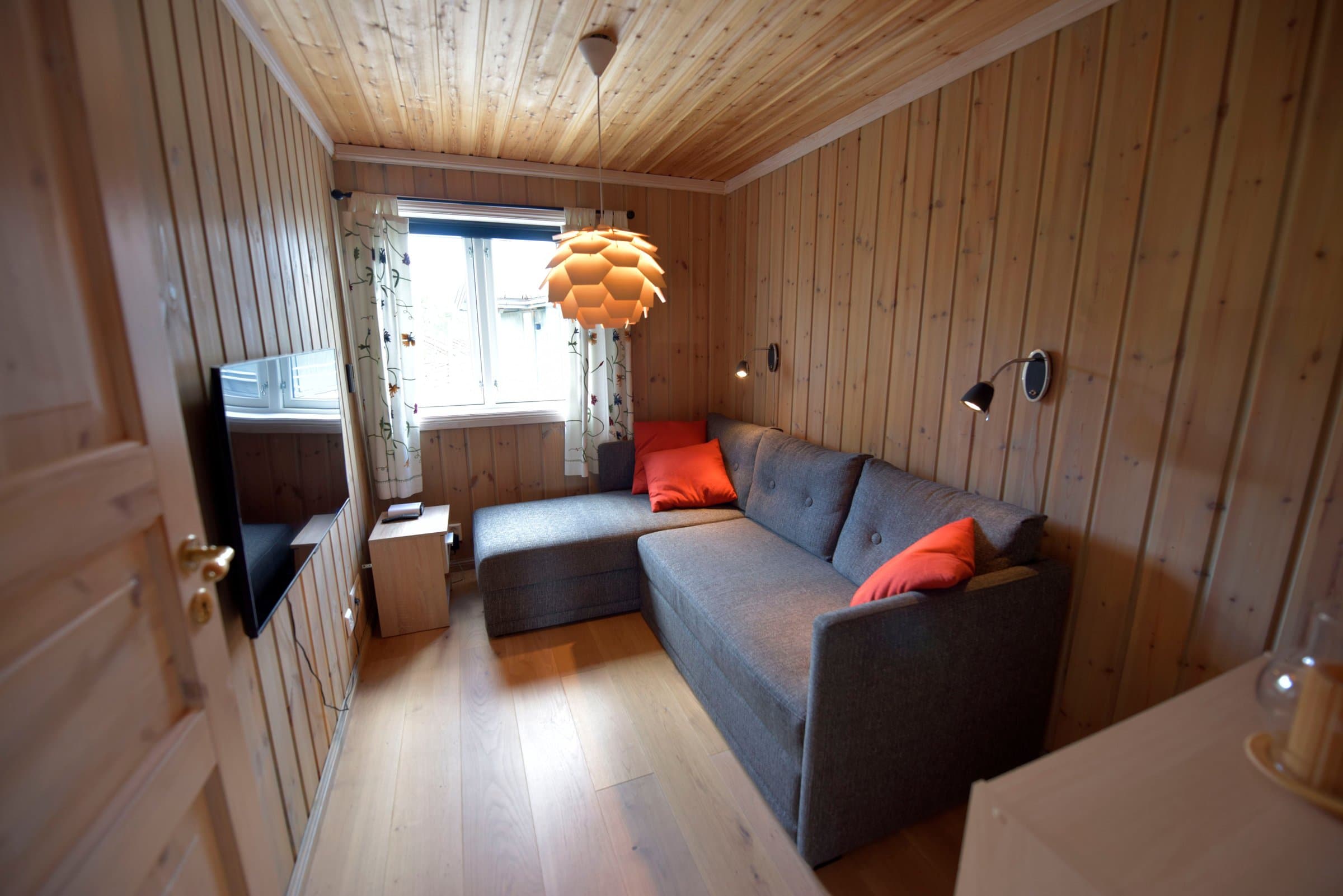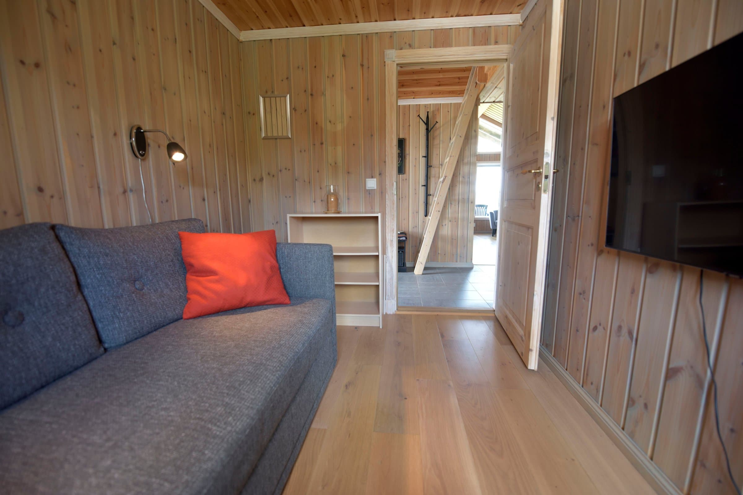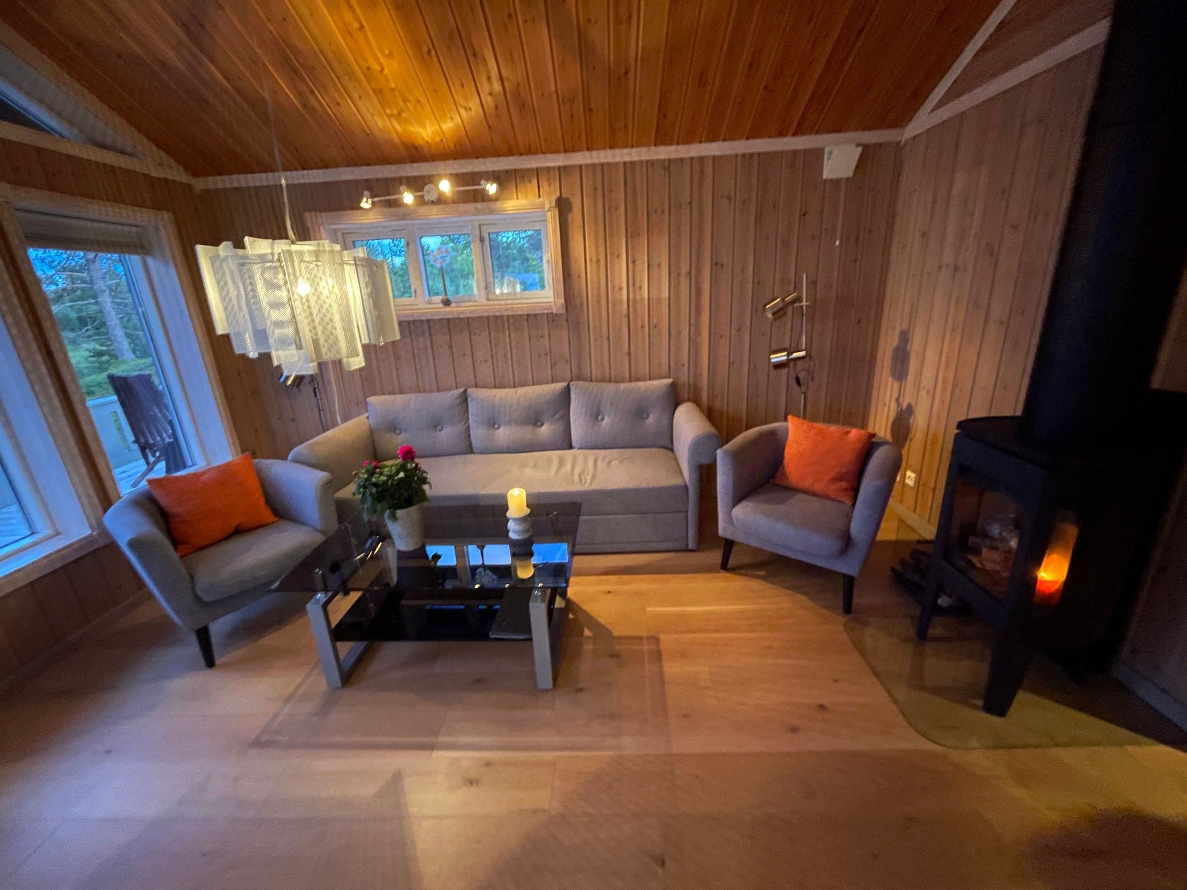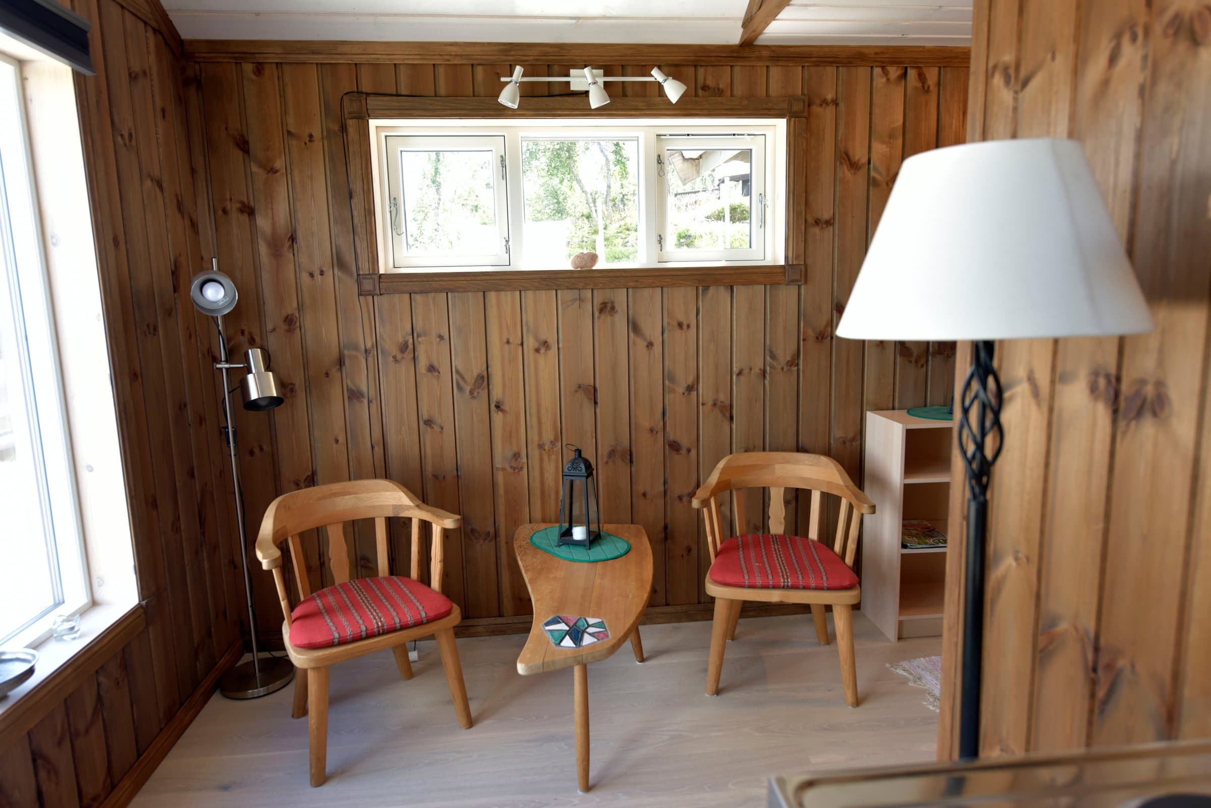 Kubbestolene og salongbord på minste hytte holdes utenfor salg. Pyntegjenstander vist på bildet følger ikke salget. Det samme gjelder bålpanne og skinnfellene (vist på bildet). Alle møbler ellers på bildene følger salget. Hvitevarene som er tilstede på visningen medfølger. Eventuelle hvitevarer leveres uten noen form for garantier.