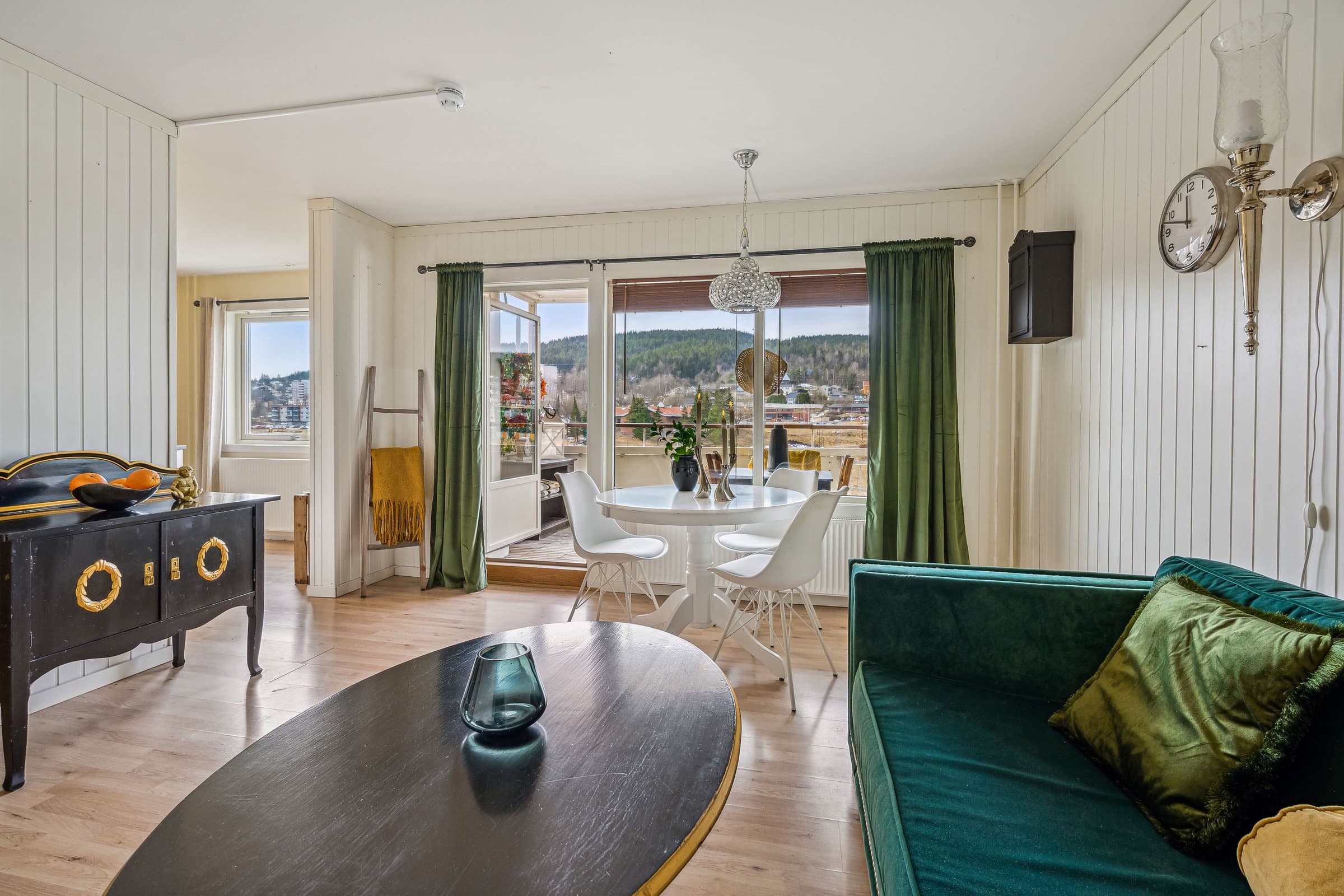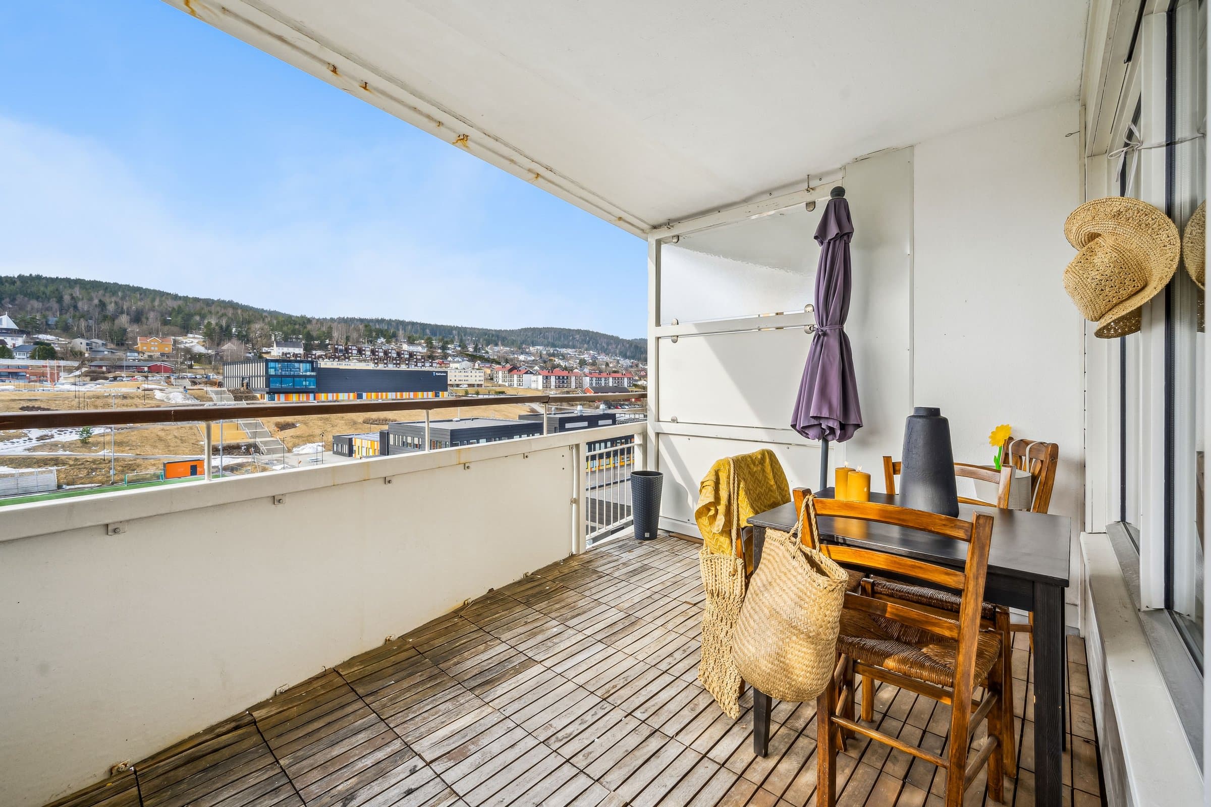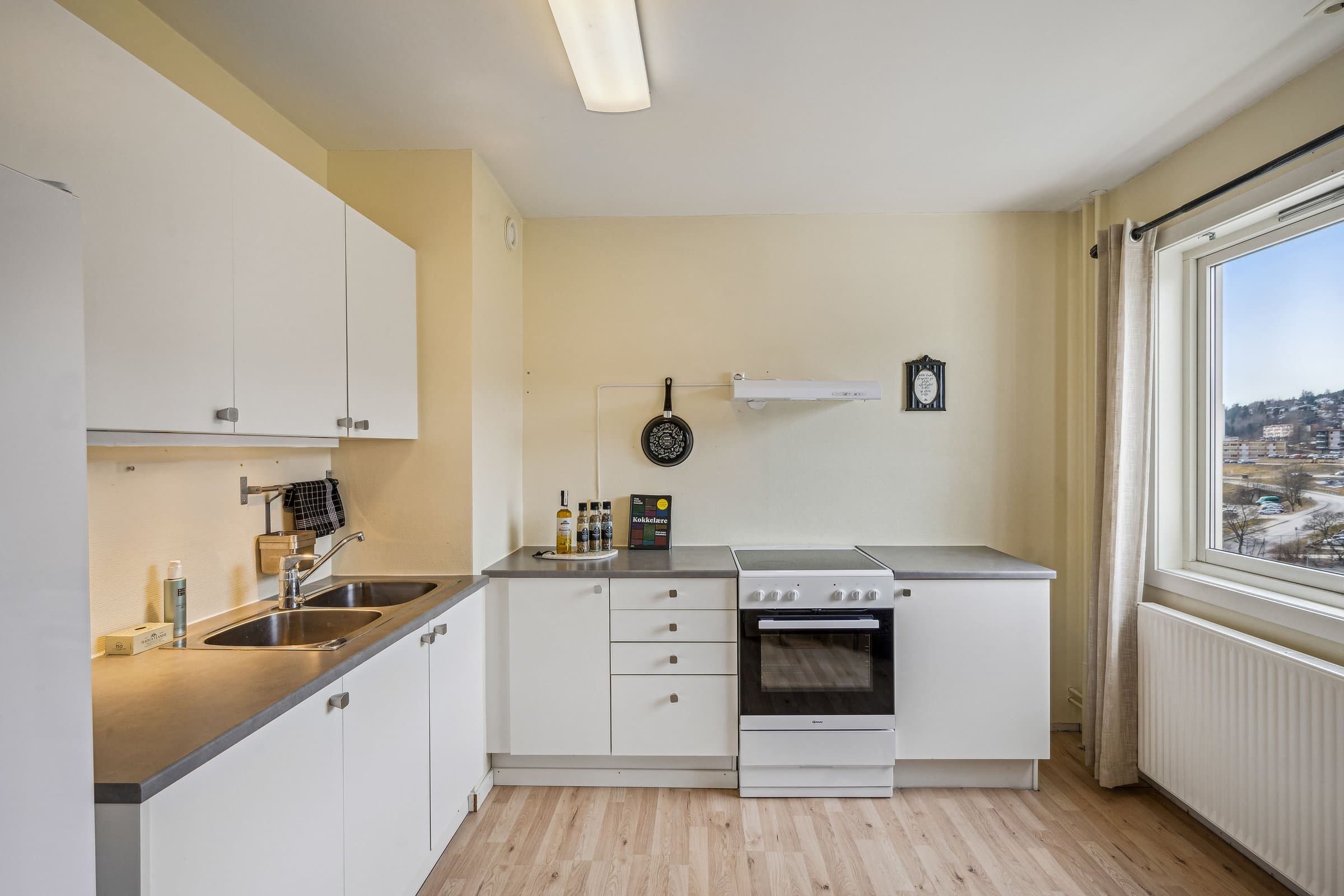 Velkommen til denne sjarmerende og praktiske leiligheten i åttende etasje, perfekt for deg som ønsker en lys og lettstelt bolig med praktiske løsninger. Her får du en romslig entre med god plass til garderobeskap og oppbevaring. Kjøkkenet er stilrent med hvite profilerte fronter, rikelig med skapplass, og benkeplate som gir perfekte arbeidsforhold for matlaging. Den åpne løsningen mot stuen skaper en luftig atmosfære, mens store vinduer slipper inn godt med naturlig lys. Fra stuen har du utgang til en solrik balkong på 9 kvm, hvor du kan nyte varme dager og utsikten over området. Leiligheten har også et lyst og funksjonelt bad fra 2014 med gulvvarme, samt et luftig soverom med plass til dobbeltseng og garderobeskap – ideelt for en god natts søvn. Fyring og varmtvann er inkludert i felleskostnadene, og bygget har nylig fått oppgradert heis, inngangsparti og nye inngangsdører.
