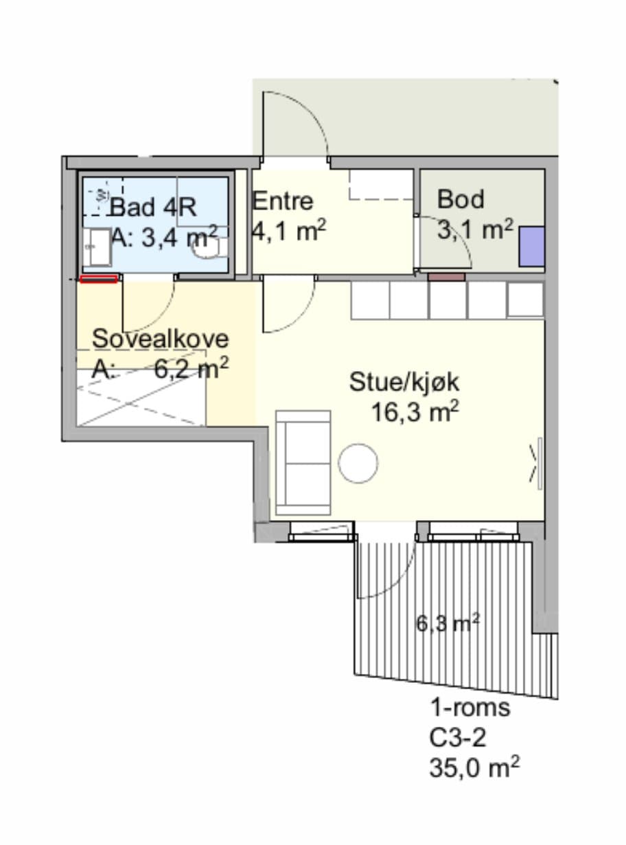 Bruksareal: 35 m² P-rom: 31 m² I salgsoppgaven og annet markedsført materiell oppgis i bruksareal (BRA) som er angitt av areal beregnet av takstmann. Bruksareal angår leilighetens areal innenfor vegger, inkludert innvendig bod.
