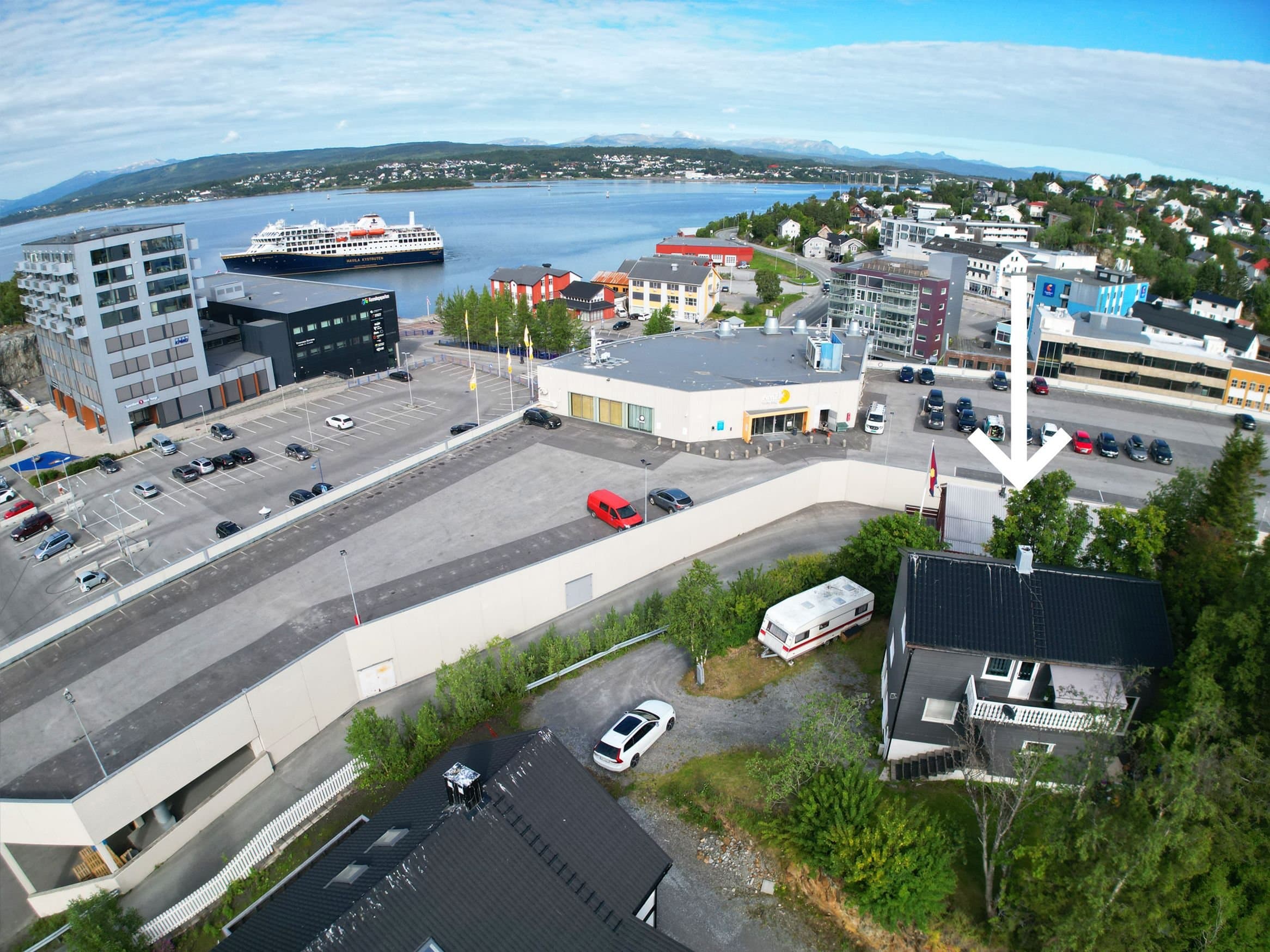 Eiendommen er en av de mest sentrale privateide boligtomtene i Finnsnes sentrum og ligger på hjørnet av Finnsneshaugen – med havutsikt i flere retninger. 2 minutters gange til dagligvarebutikk, kjøpesenter, apotek, vinmonopol m.m. Like i nærheten ligger også en flott liten bystrand, Henrikstøa. Nært barnehager og skoler, studiesenter, bibliotek og byens øvrige fasiliteter som lekepark, kafeer, restauranter, uteliv, bensinstasjoner, bowling, fotballbane og andre fritidstilbud. Eiendommen ligger i et område regulert til boligbebyggelse (Finnsneshaugen). Eiendommen er tilknyttet offentlig vannforsyning via private stikkledninger og offentlig avløpsnett via private stikkledninger. Eiendommen ligger i relativt skrånende terreng. Tomten er opparbeidet med plen. Privat innkjørsel fra veien som går til Amfi parkeringstak. Parkeringsplass for 3 biler på tomten.