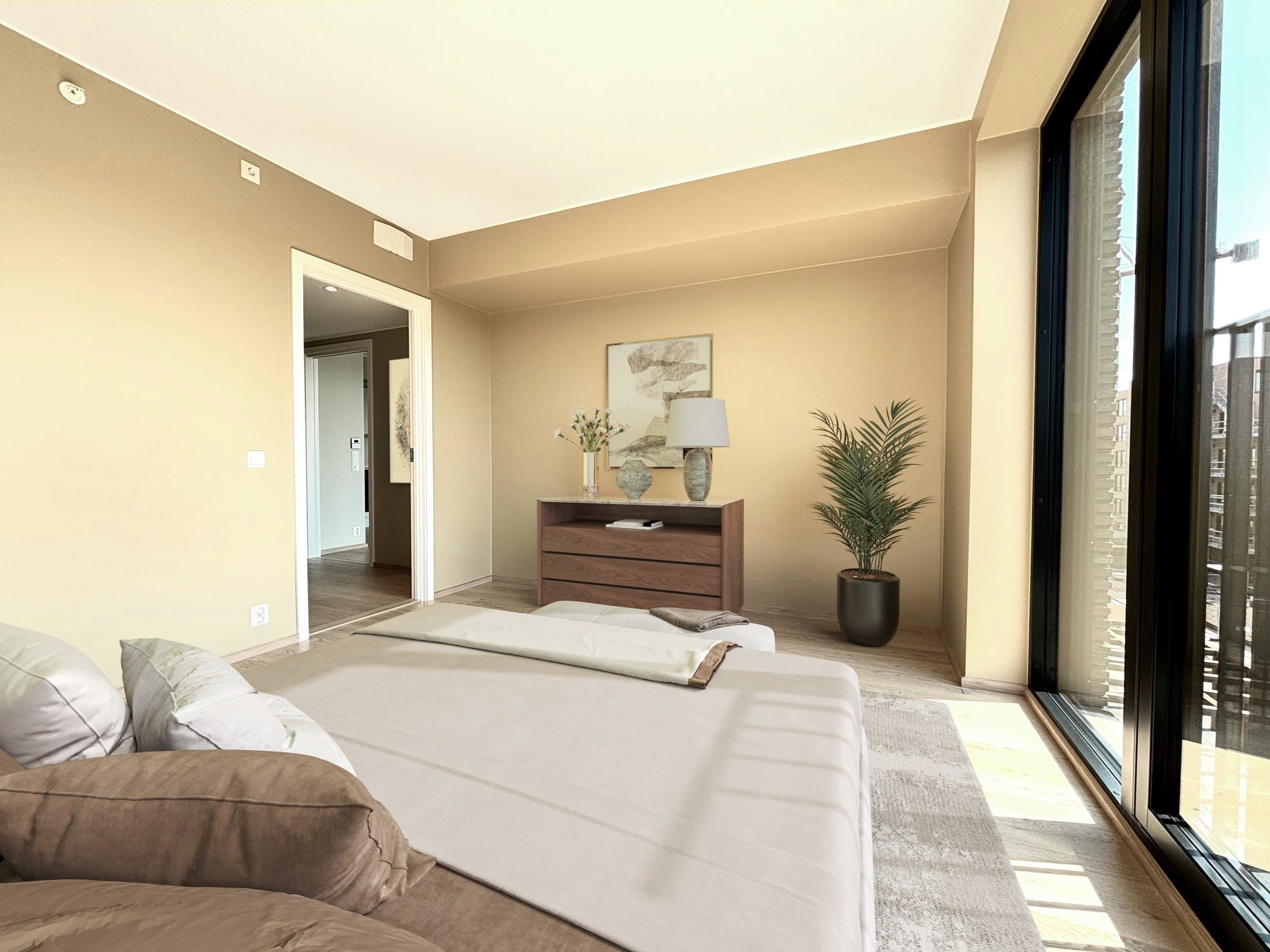 Arealeffektiv 2-roms selveierleilighet i 6. etasje i Byhaven Vertikal – det nyeste tilskuddet til Fredrikstads dynamiske bydel Værste. Leiligheten er ny fra august 2024, og har en gjennomgående høy standard. Den består av følgende rom: - Entré med garderobeplass - Bad med opplegg for vaskemaskin og tørketrommel - Soverom med god plass til garderobeløsning - Stue og kjøkken i åpen løsning med skyvedører ut til balkong - Bod med tekniske installasjoner og lagringsplass - Romslig sørvestvendt balkong - Sportsbod i kjeller Det er utelukkende valgt hvitevarer, fast innredning og tekniske løsninger av høy kvalitet, som for eksempel Sigdal kjøkkeninnredning, Miele hvitevarer og Grohe kjøkken- og baderomsprodukter. Alle rom, med unntak av badet, har én-stavs eikeparkett, eikelister og slette, malte vegger. Badet har flislagte vegger og gulv. Bildene av stue og soverom er virtuelt møblert. Leiligheten har vannbåren gulvvarme, balansert ventilasjon og store vindusflater som gir et lyst og trivelig innemiljø med behagelig inneklima. Energimerke A (mørkegrønn) legger til rette for lave strømregninger og gunstig grønt boliglån. Fra den romslige, solrike sørvestvendte balkongen har du utsikt over nærområdet, med fri sikt mot åsene på Kråkerøy, den hyggelige felles takhagen, og et glimt av Vesterelva ved Gressvik. ------