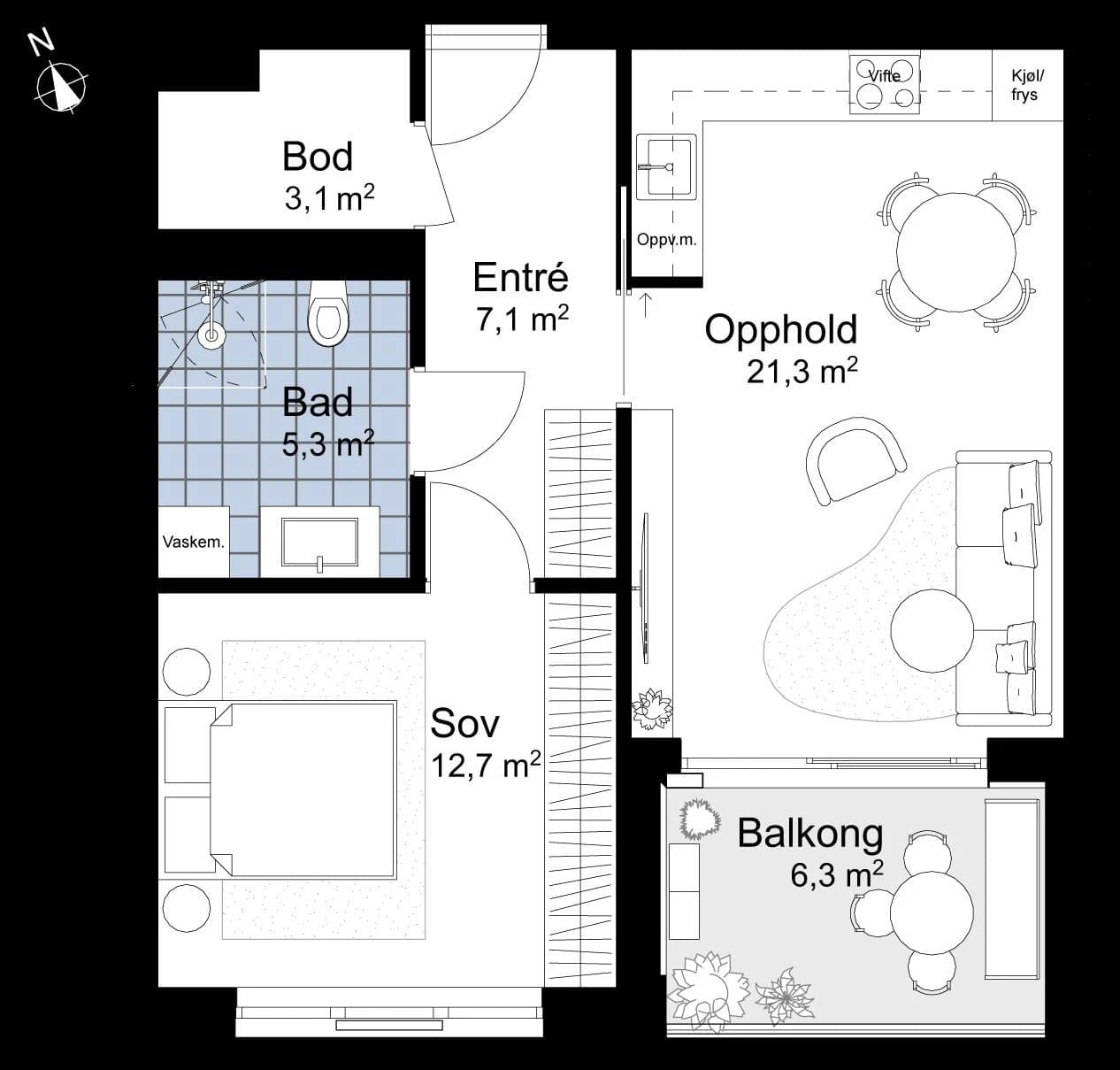 Internt bruksareal: 49,5 kvm Balkong: 6,3 kvm Bod i kjeller: 5,0 kvm Totalt areal: 60,8 kvm ------
