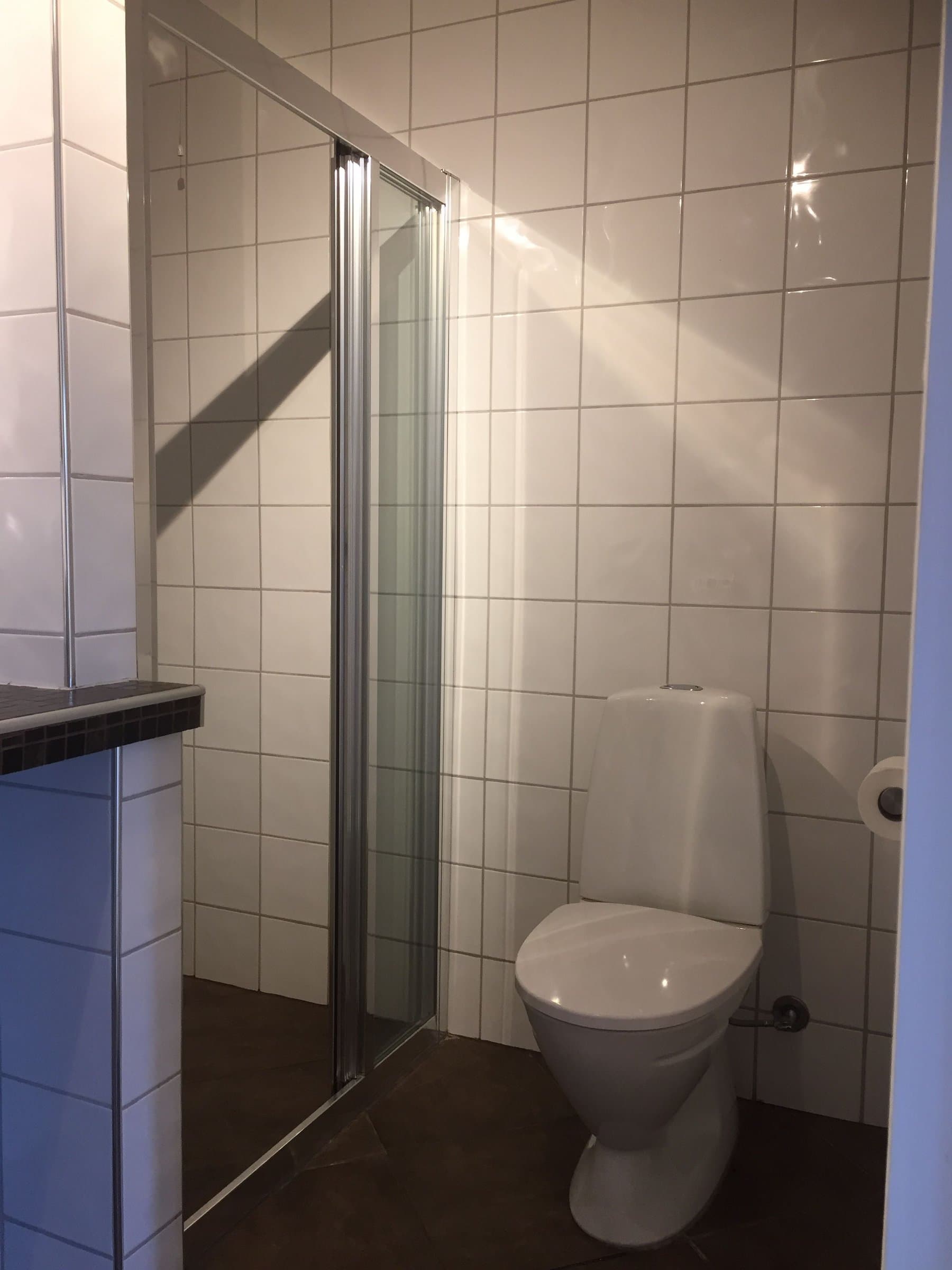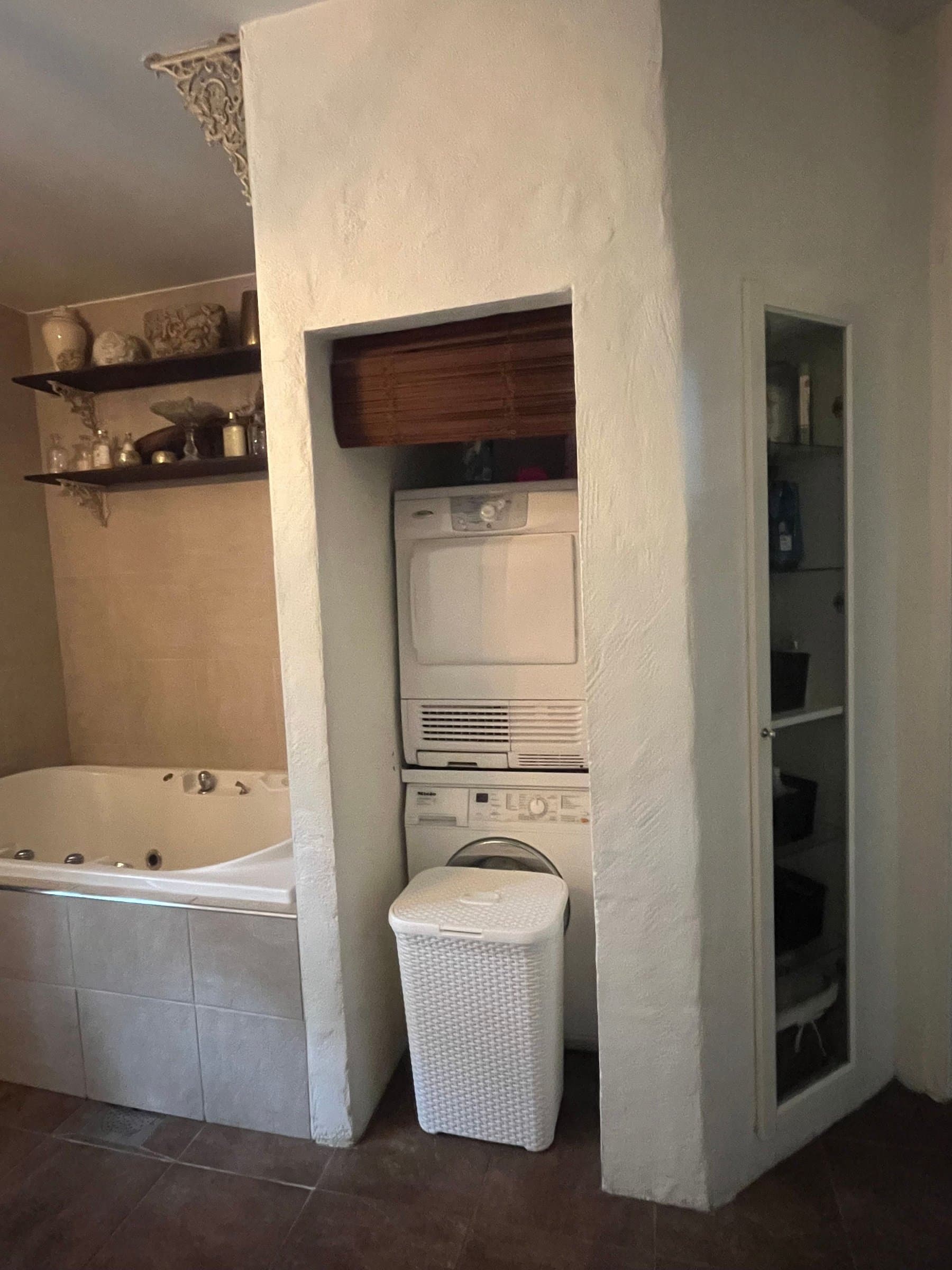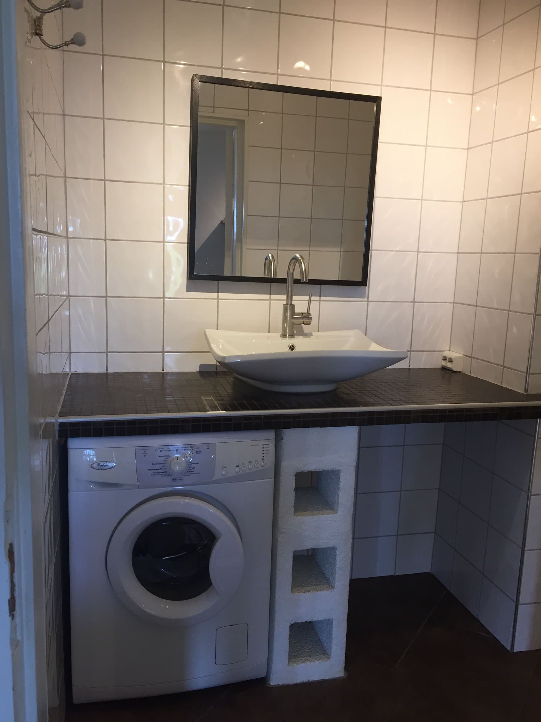 Mellom kjøkken og stue fører en tofløyet dør oss inn til det aller helligste; nemlig et flott og stort baderom. Her finnes både et deilig badekar med bobler og plass til to, en stor flislagt dusjnisje, en servant med underskap i robust stil, toalett og en egen nisje til vaskemaskin og tørketrommel i søyle. Et lite glasskap er også murt inn i veggen for både god plassutnyttelse og praktisk oppbevaring, og gir det lille ekstra. Alt i alt er dette et nydelig rom for virkelig velvære, og derav er også dette rommet døpt til «Velværelse».