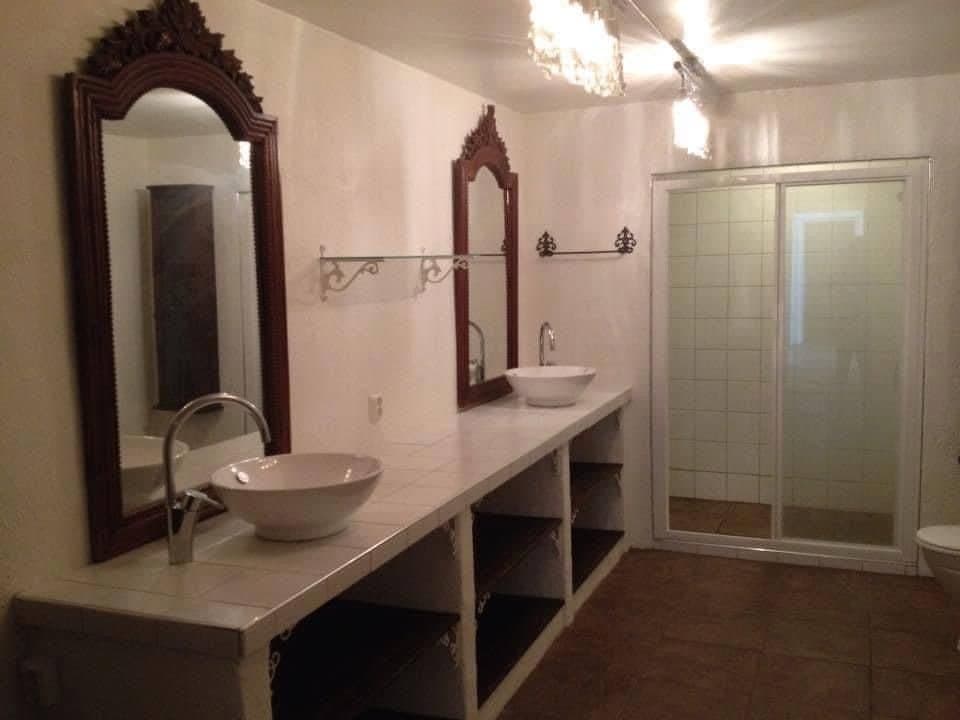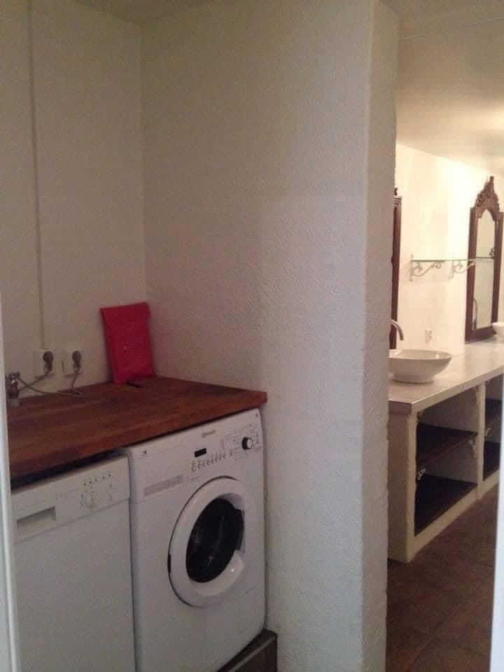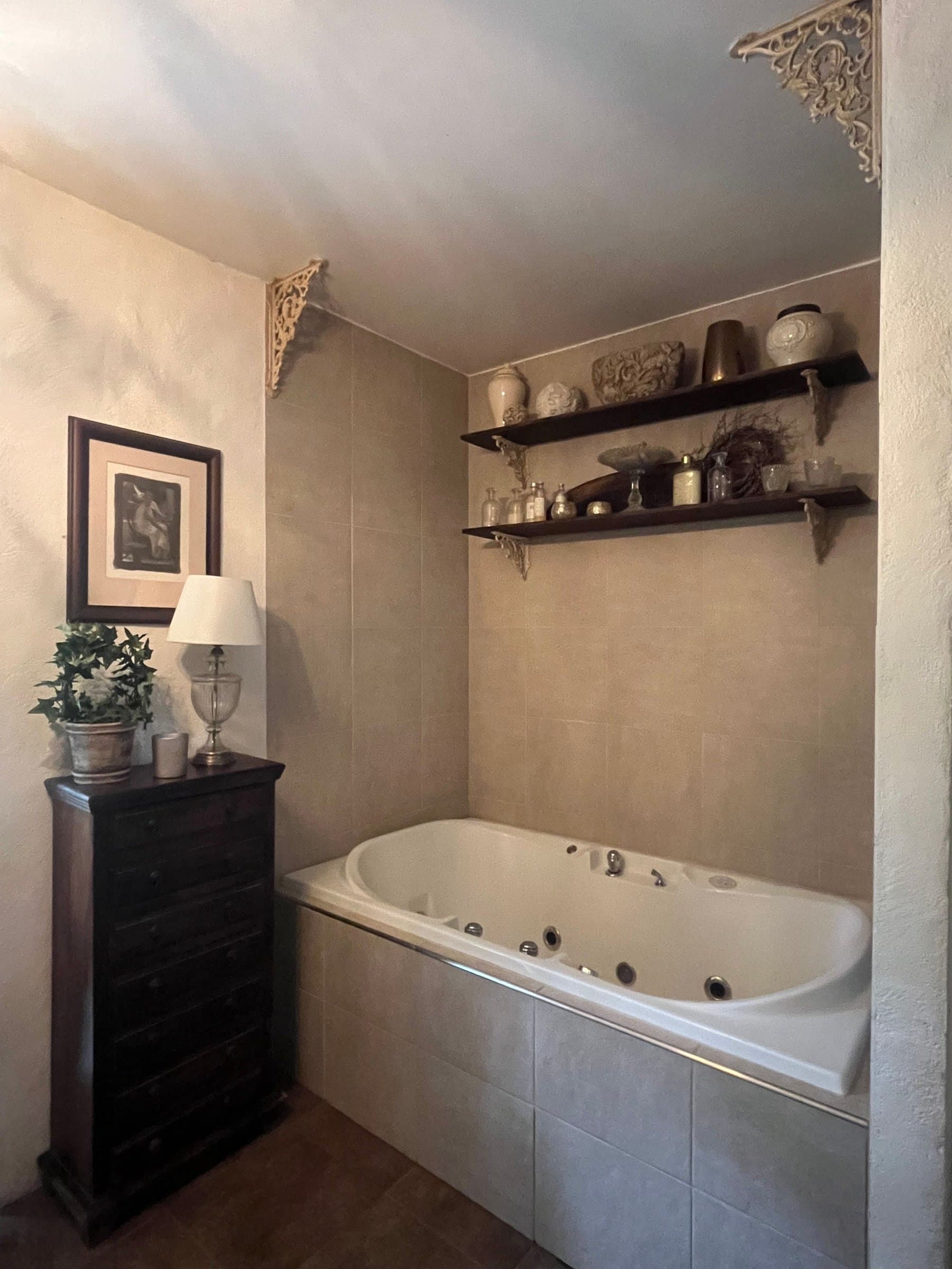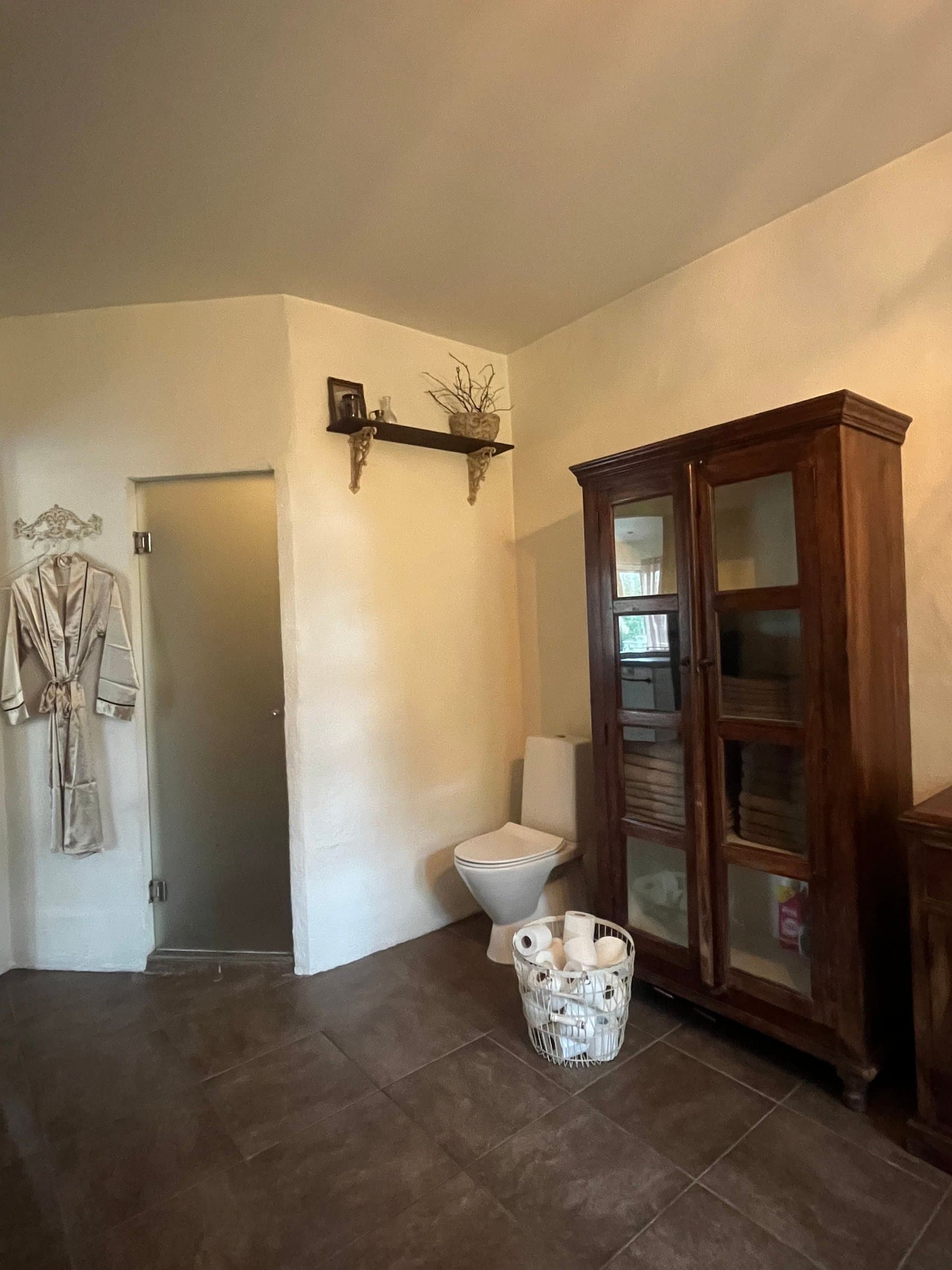 Mellom kjøkken og stue fører en tofløyet dør oss inn til det aller helligste; nemlig et flott og stort baderom. Her finnes både et deilig badekar med bobler og plass til to, en stor flislagt dusjnisje, en servant med underskap i robust stil, toalett og en egen nisje til vaskemaskin og tørketrommel i søyle. Et lite glasskap er også murt inn i veggen for både god plassutnyttelse og praktisk oppbevaring, og gir det lille ekstra. Alt i alt er dette et nydelig rom for virkelig velvære, og derav er også dette rommet døpt til «Velværelse».